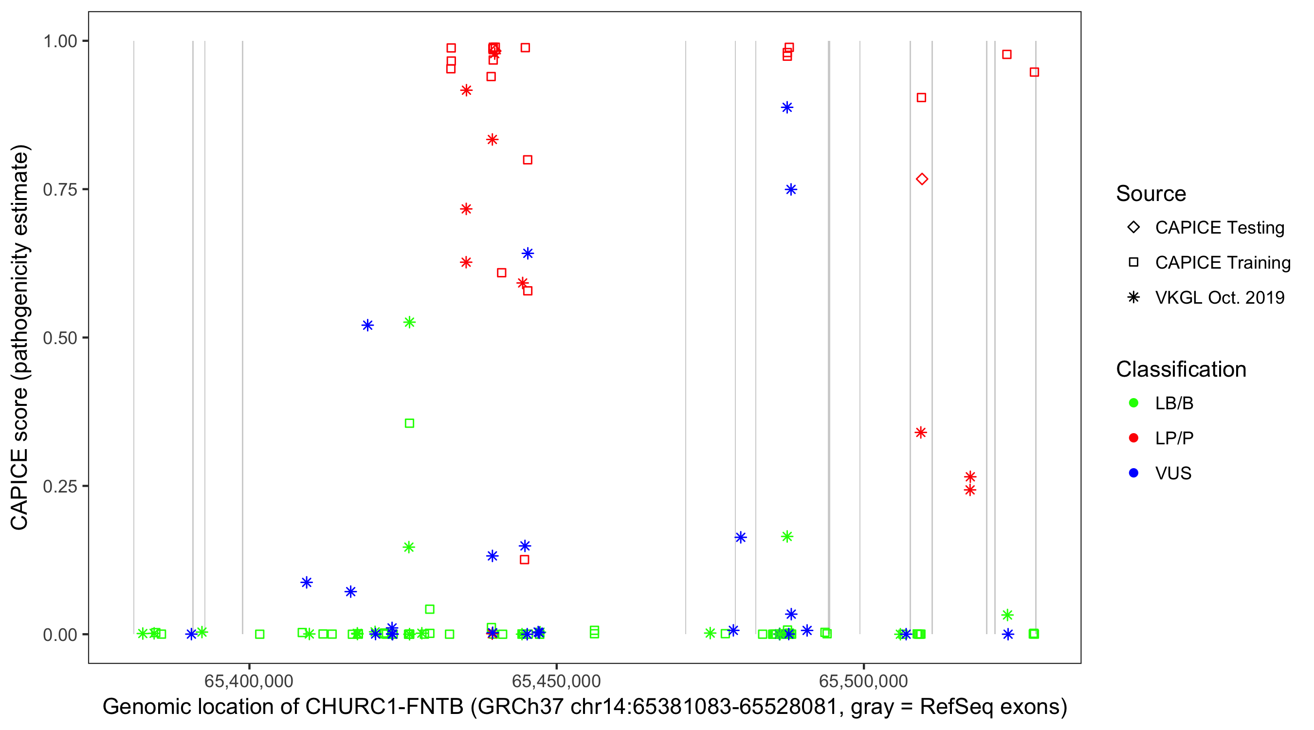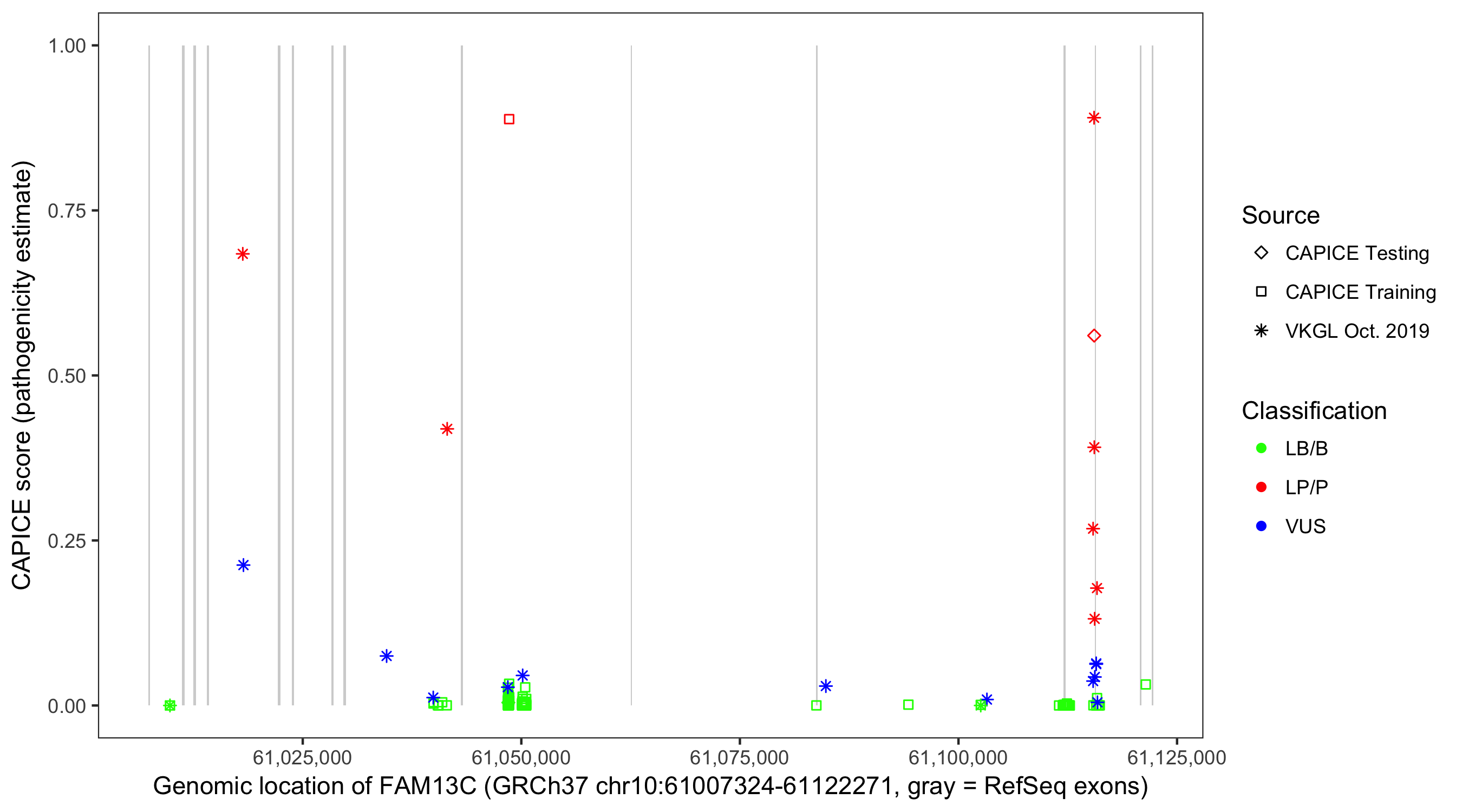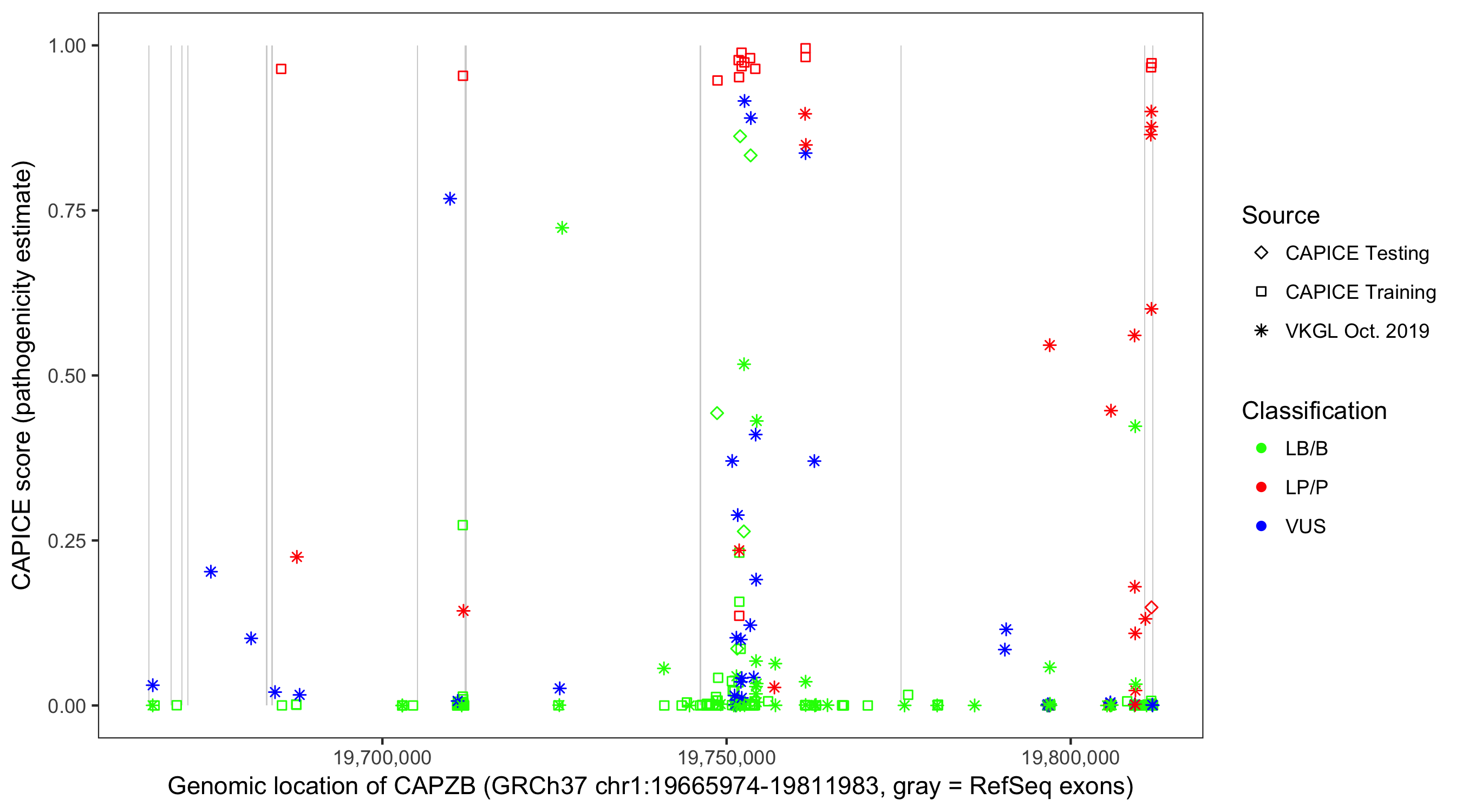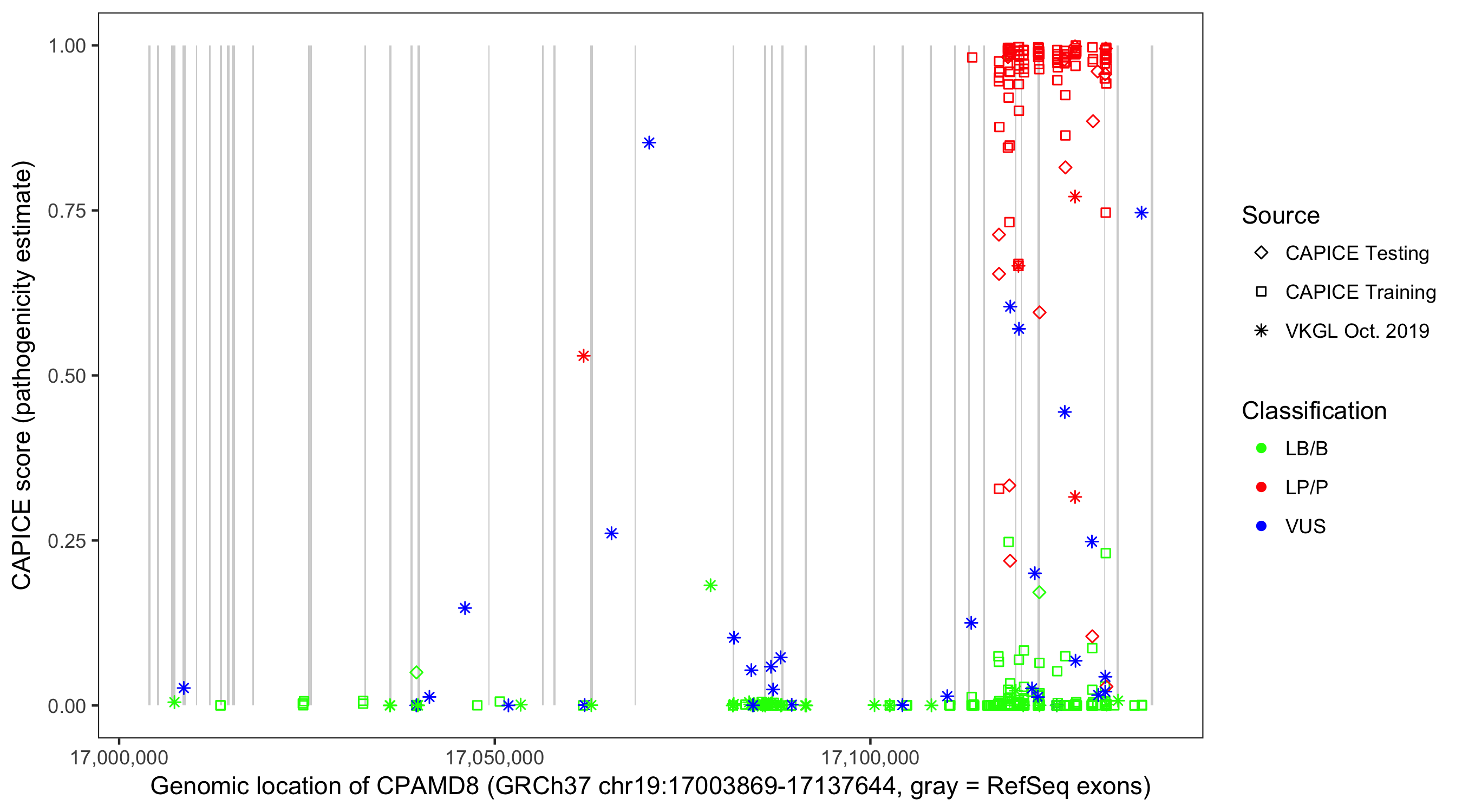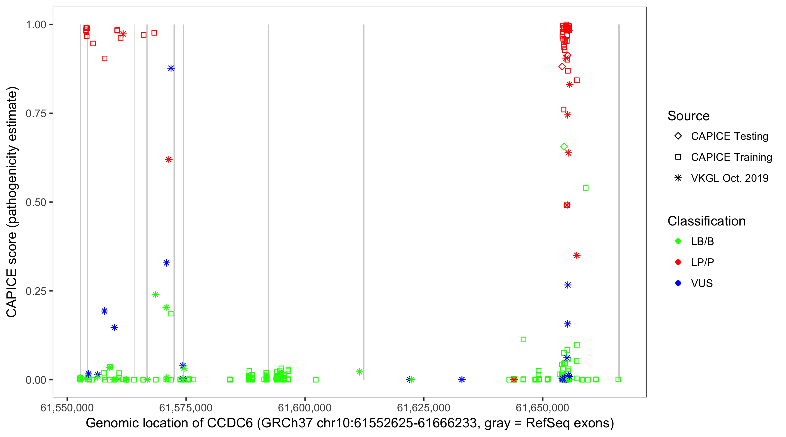Shown are CAPICE train/test variants plus VKGL Oct 2019.