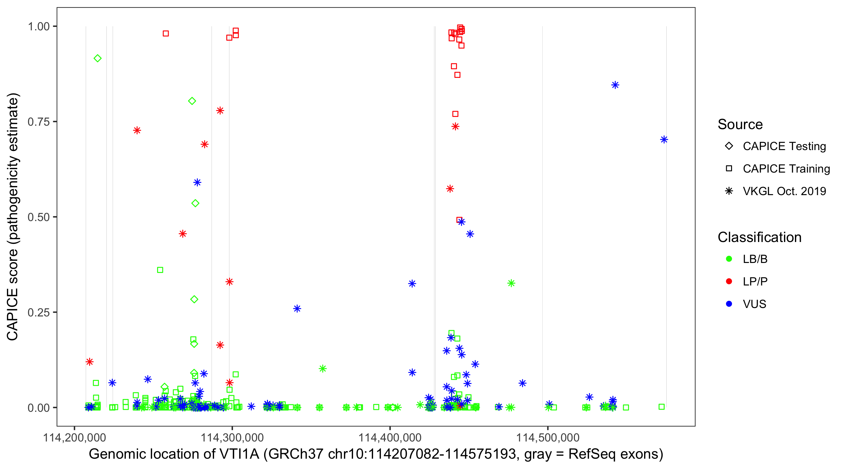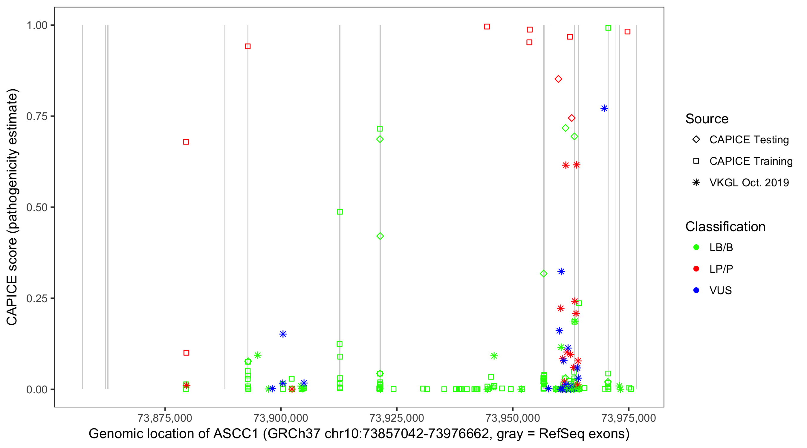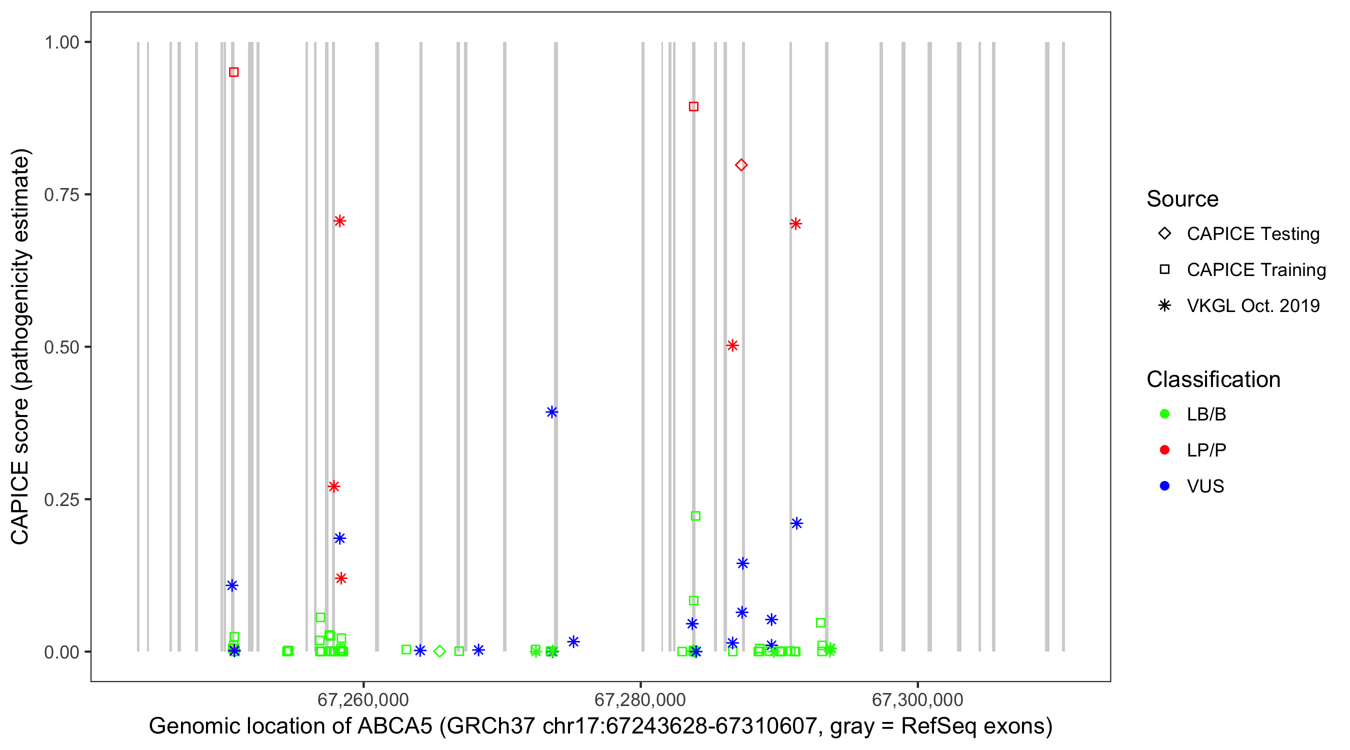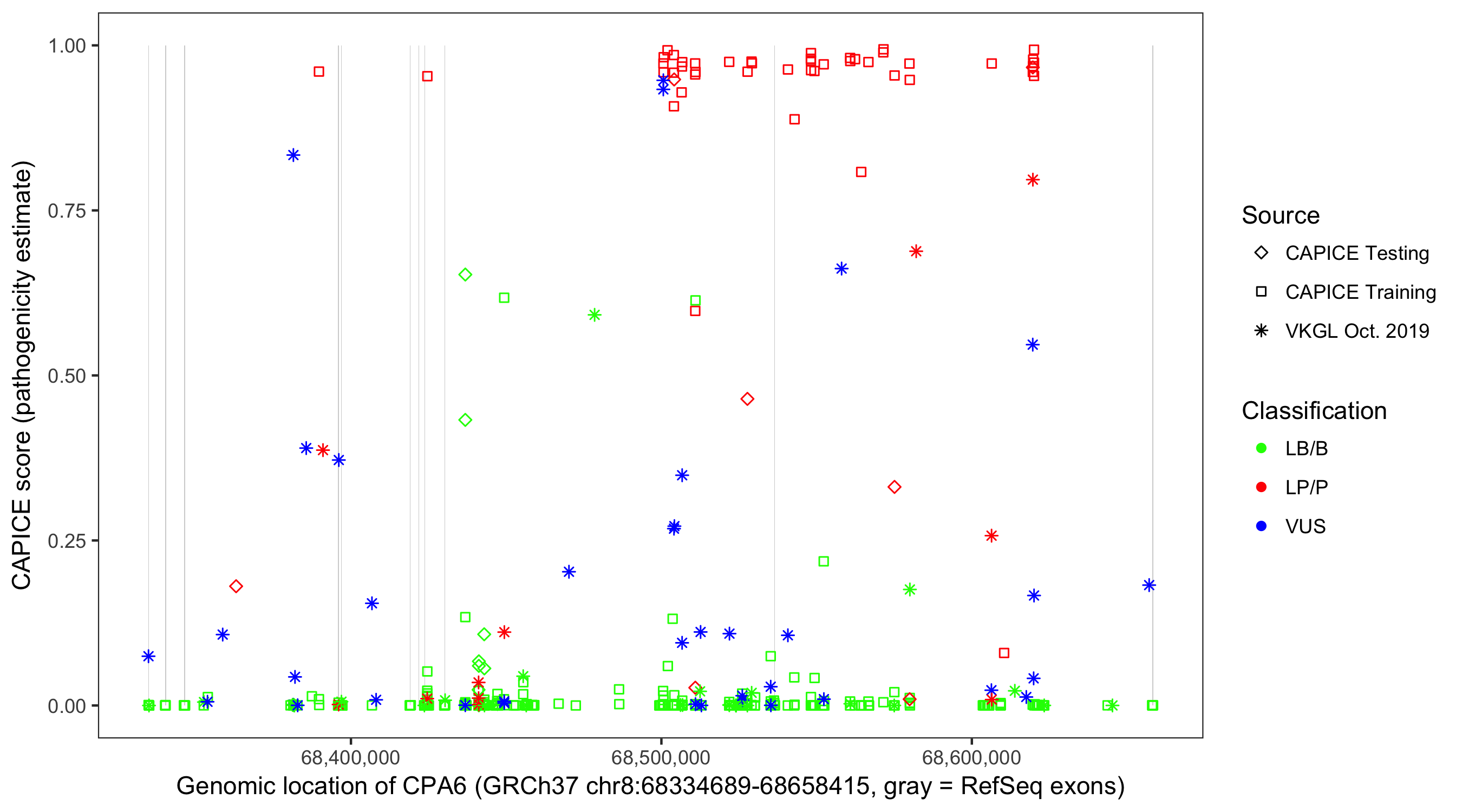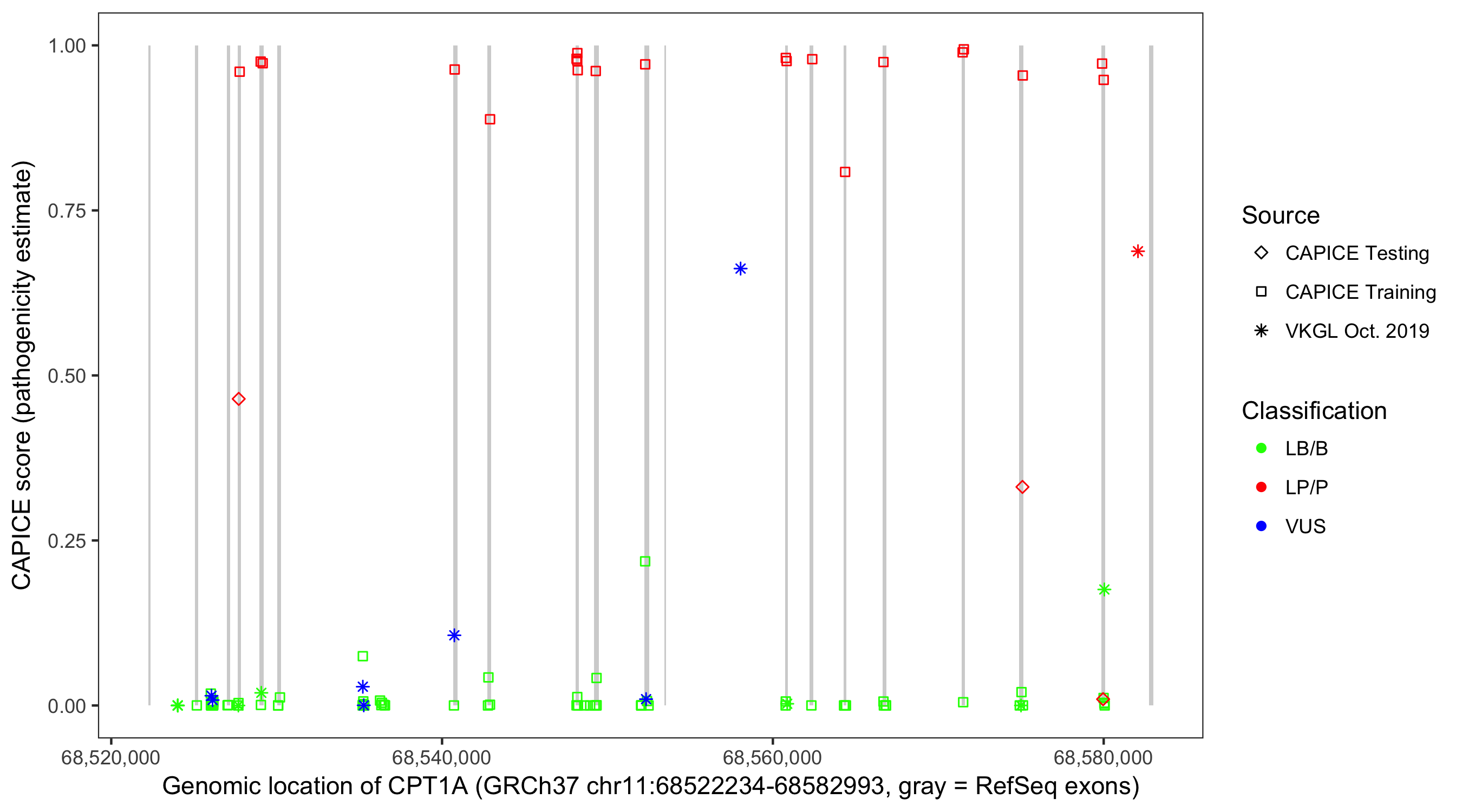Shown are CAPICE train/test variants plus VKGL Oct 2019.