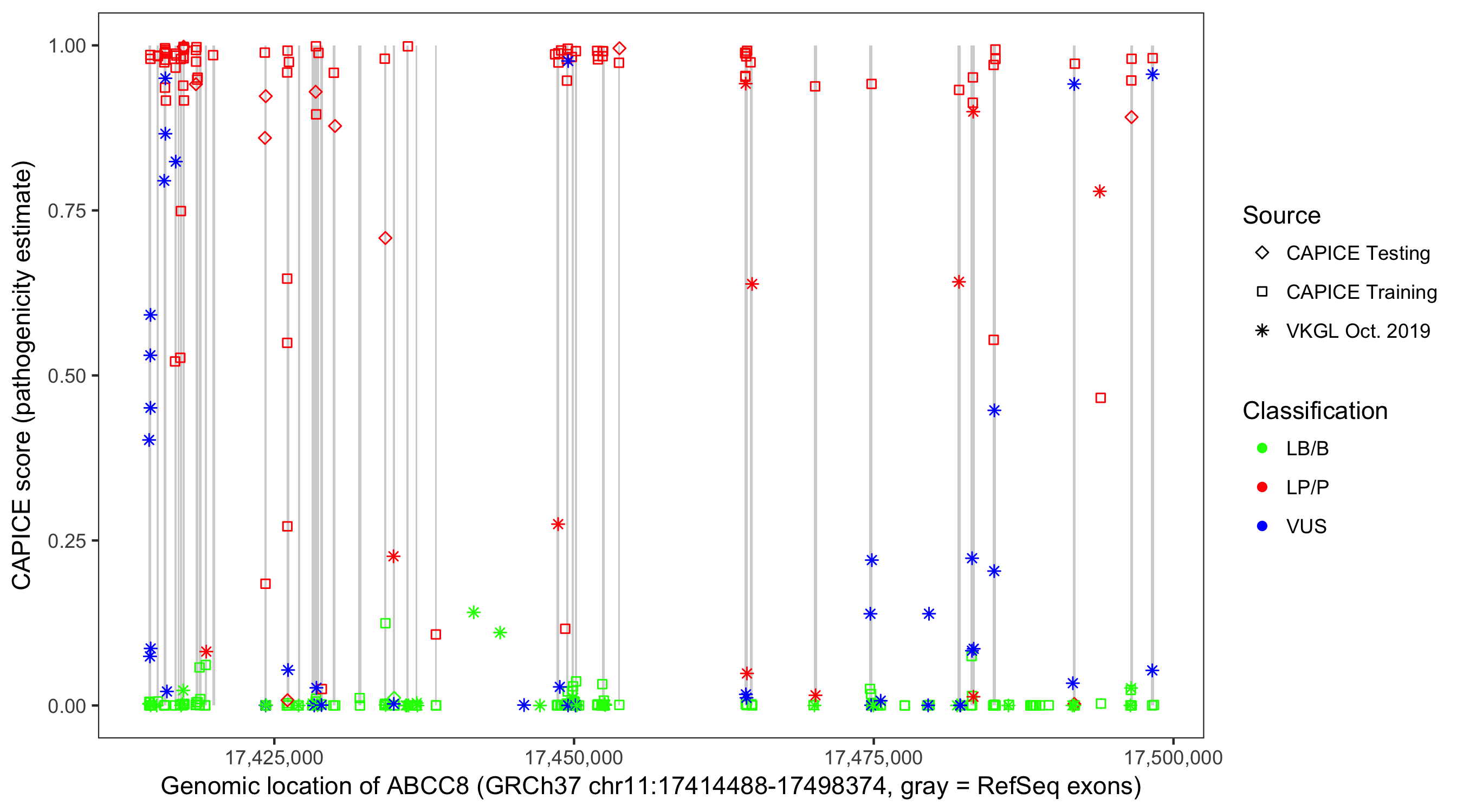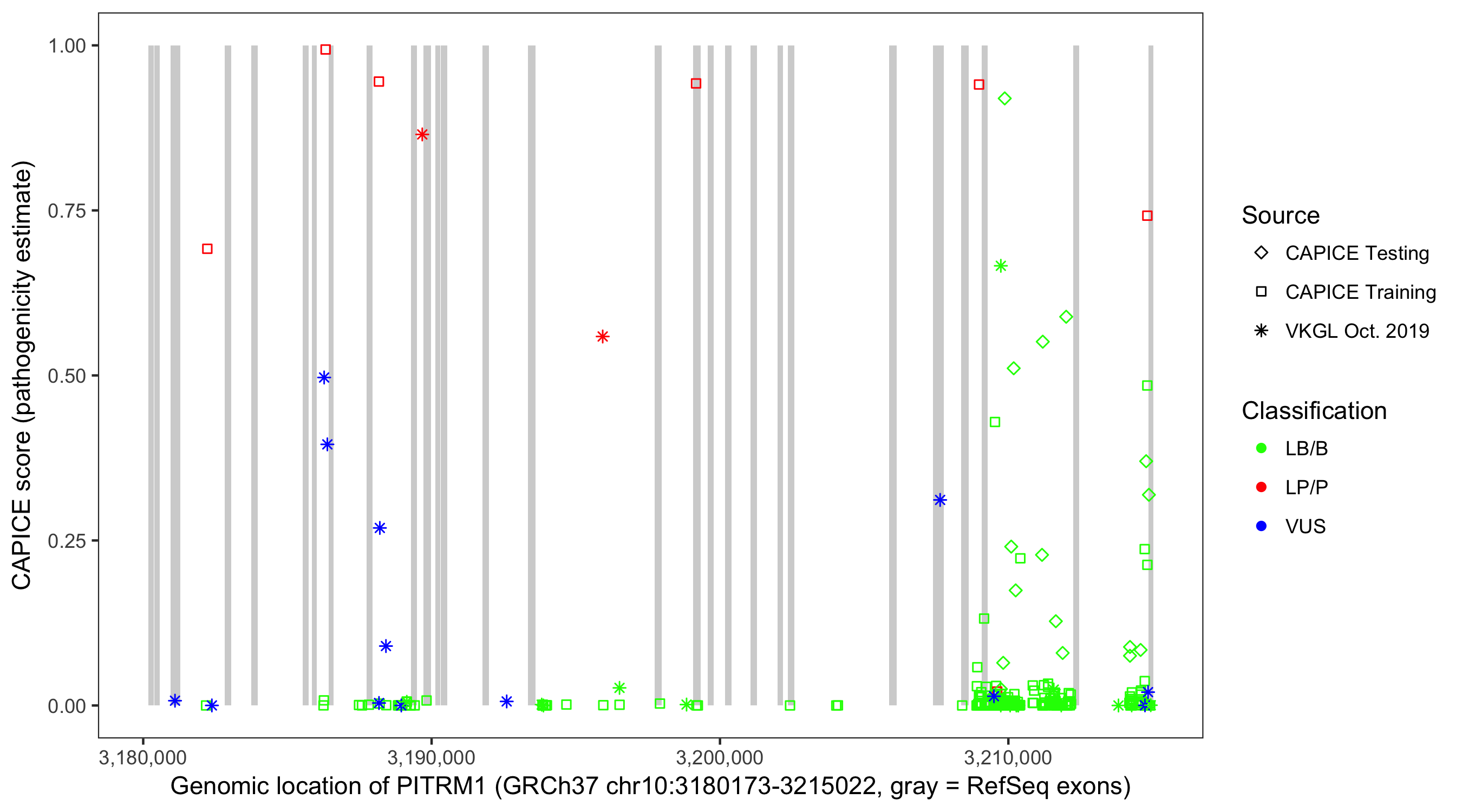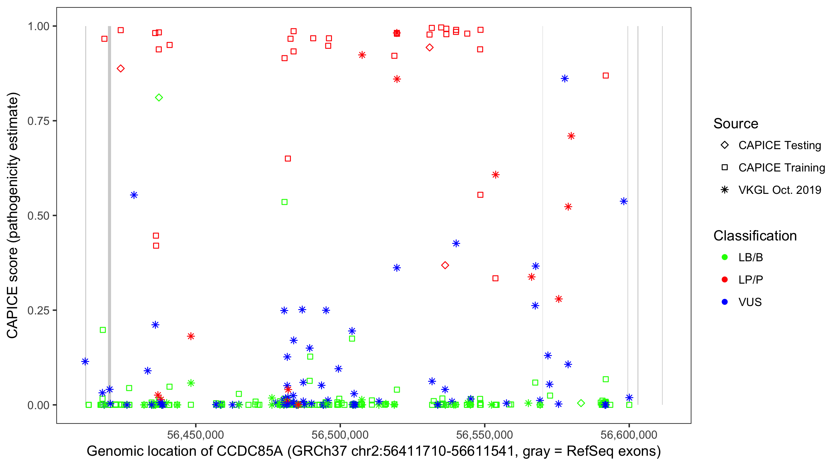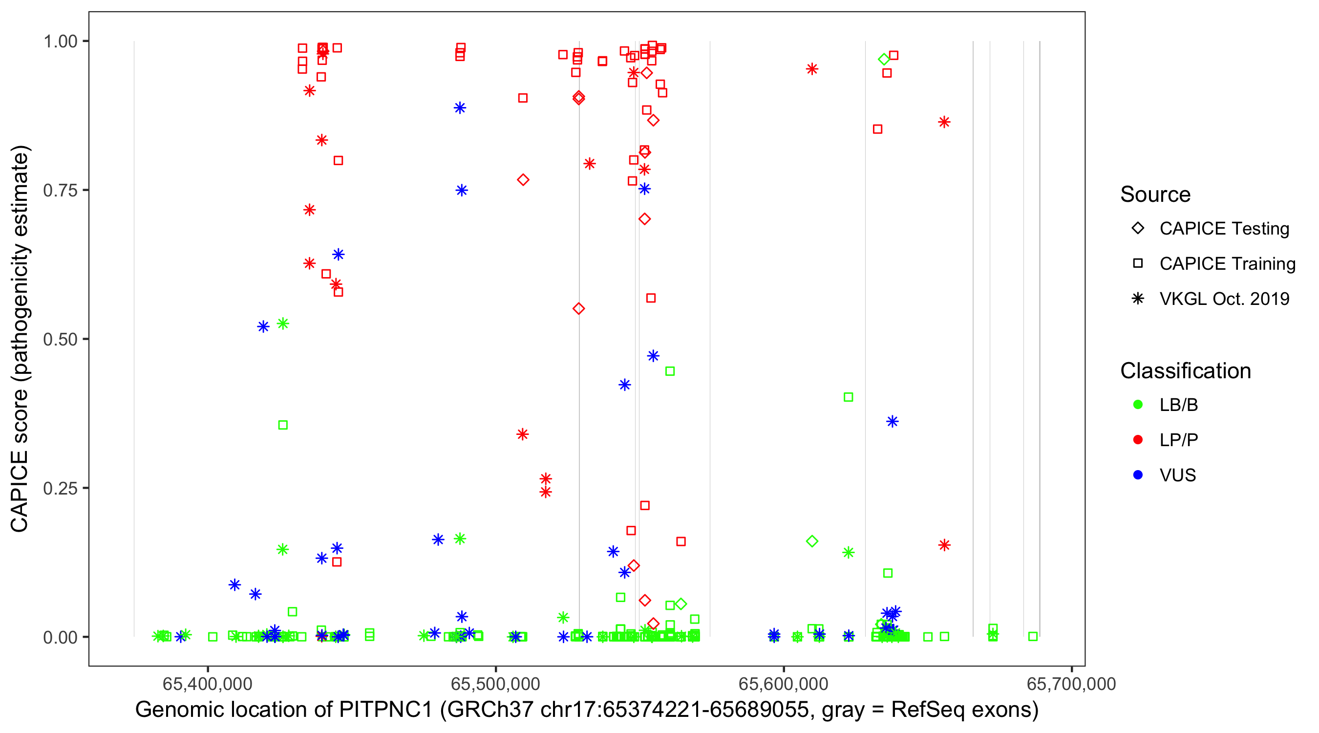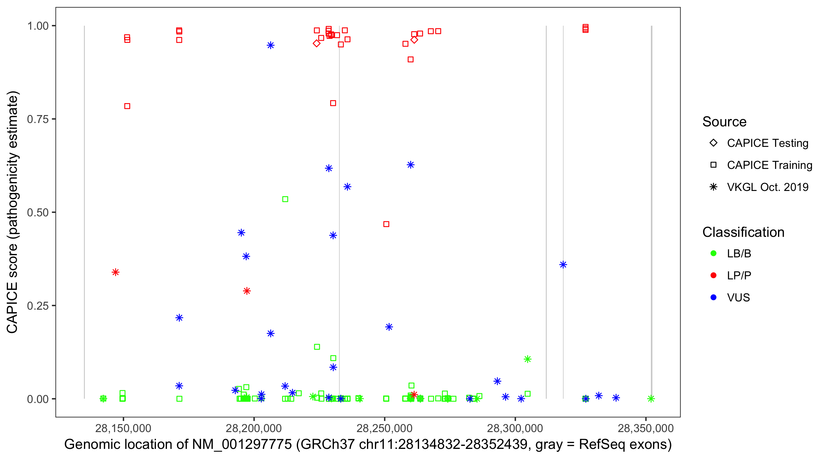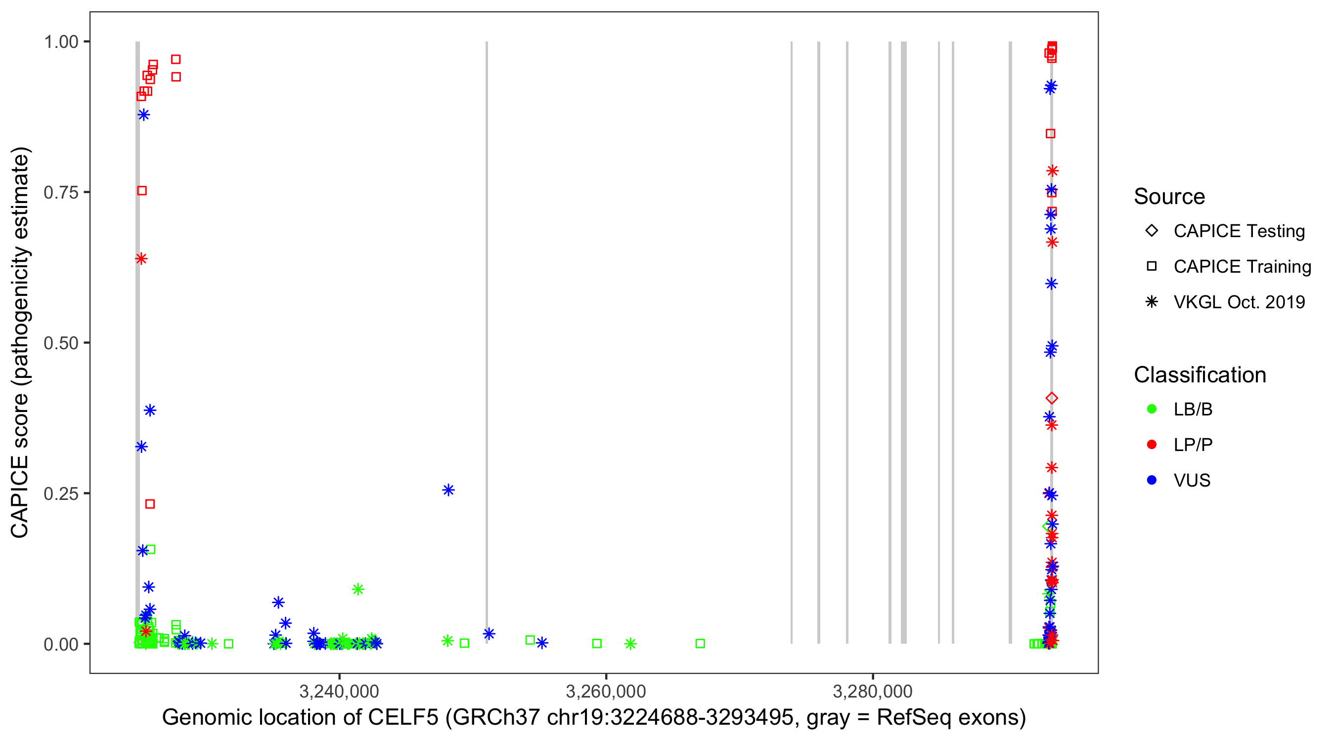 Shown are CAPICE train/test variants plus VKGL Oct 2019.