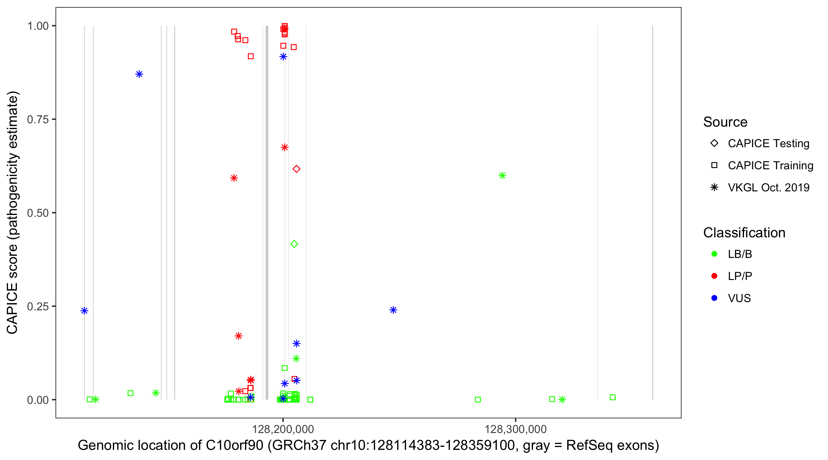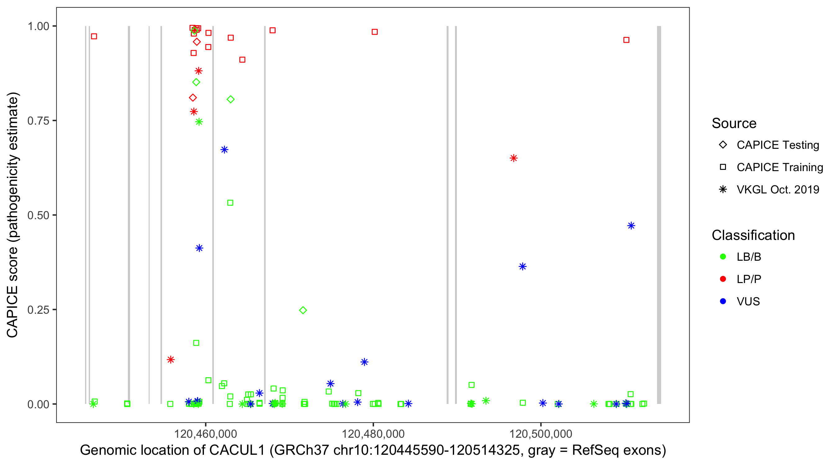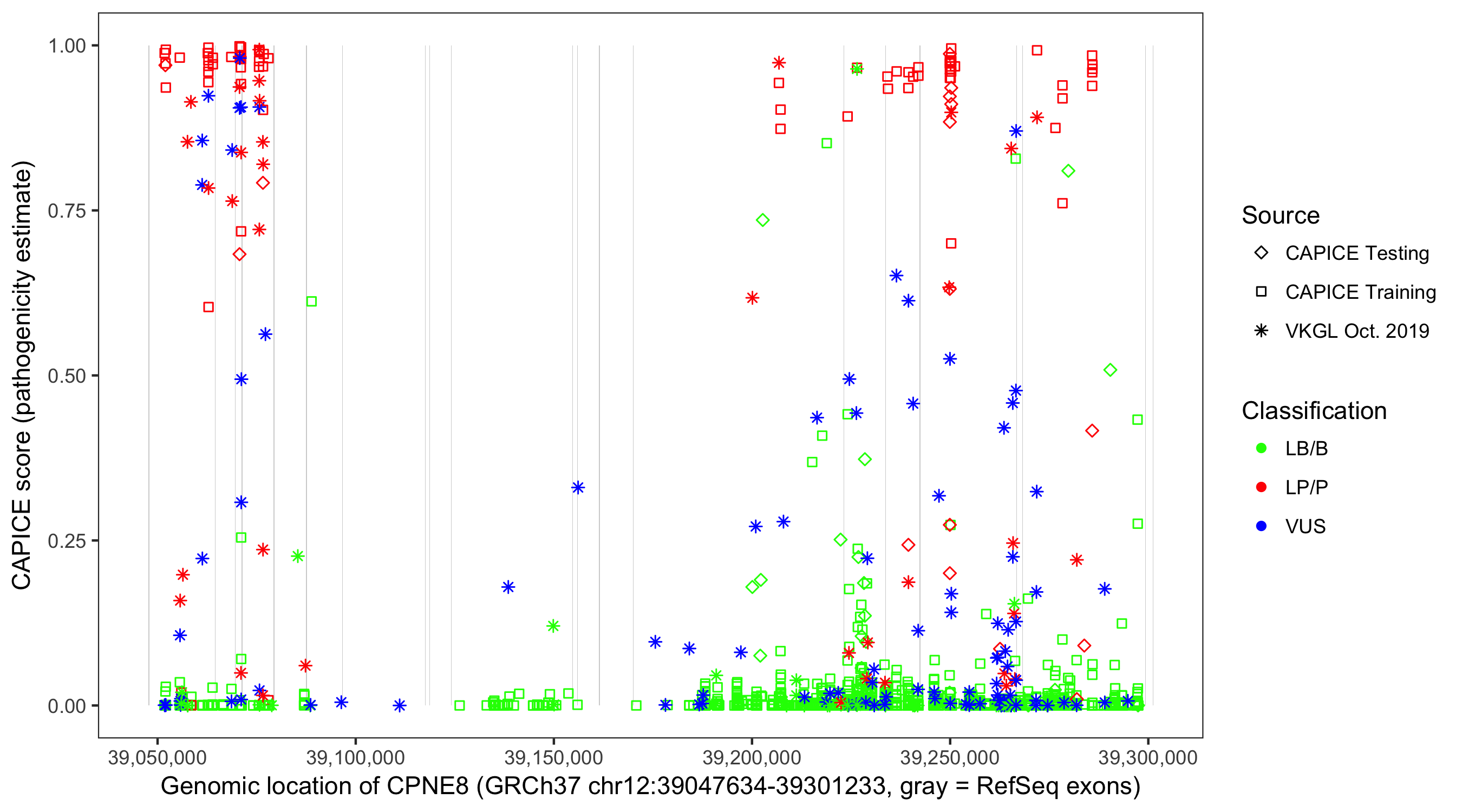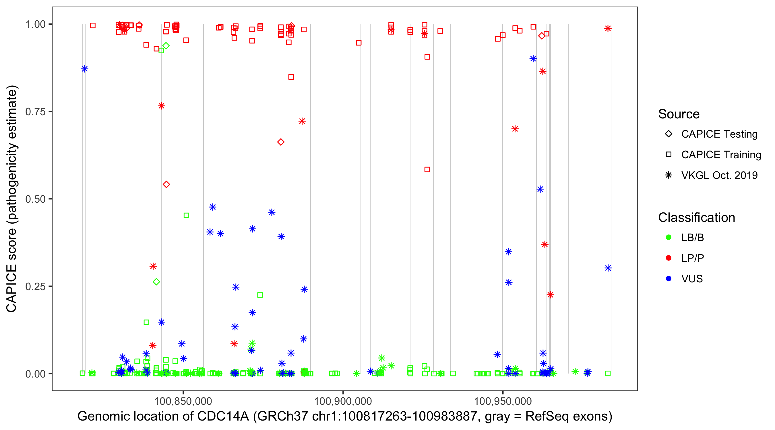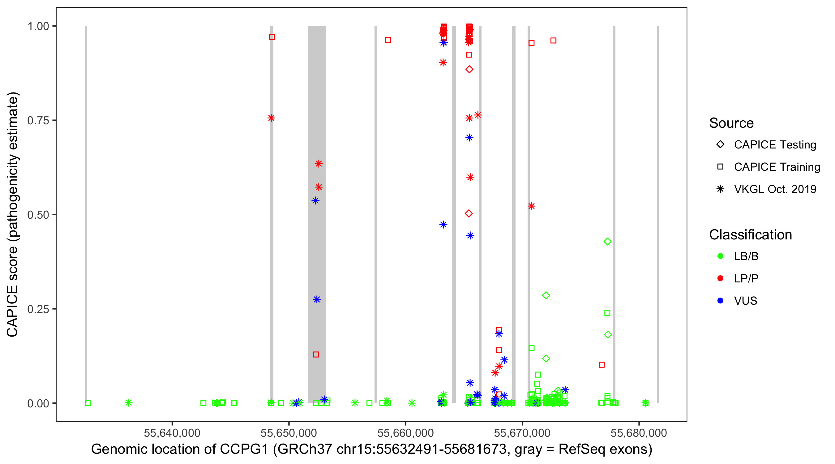 Shown are CAPICE train/test variants plus VKGL Oct 2019.