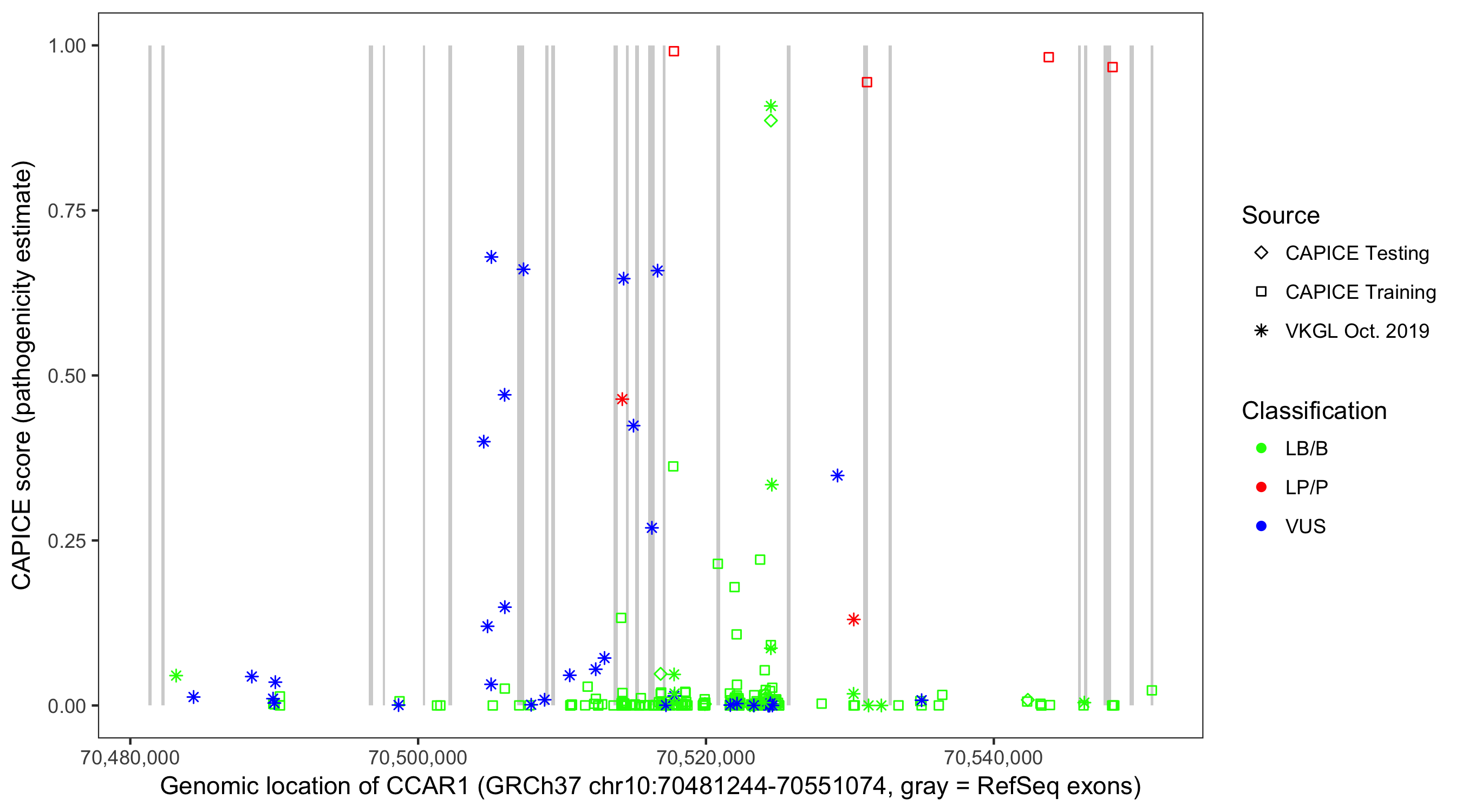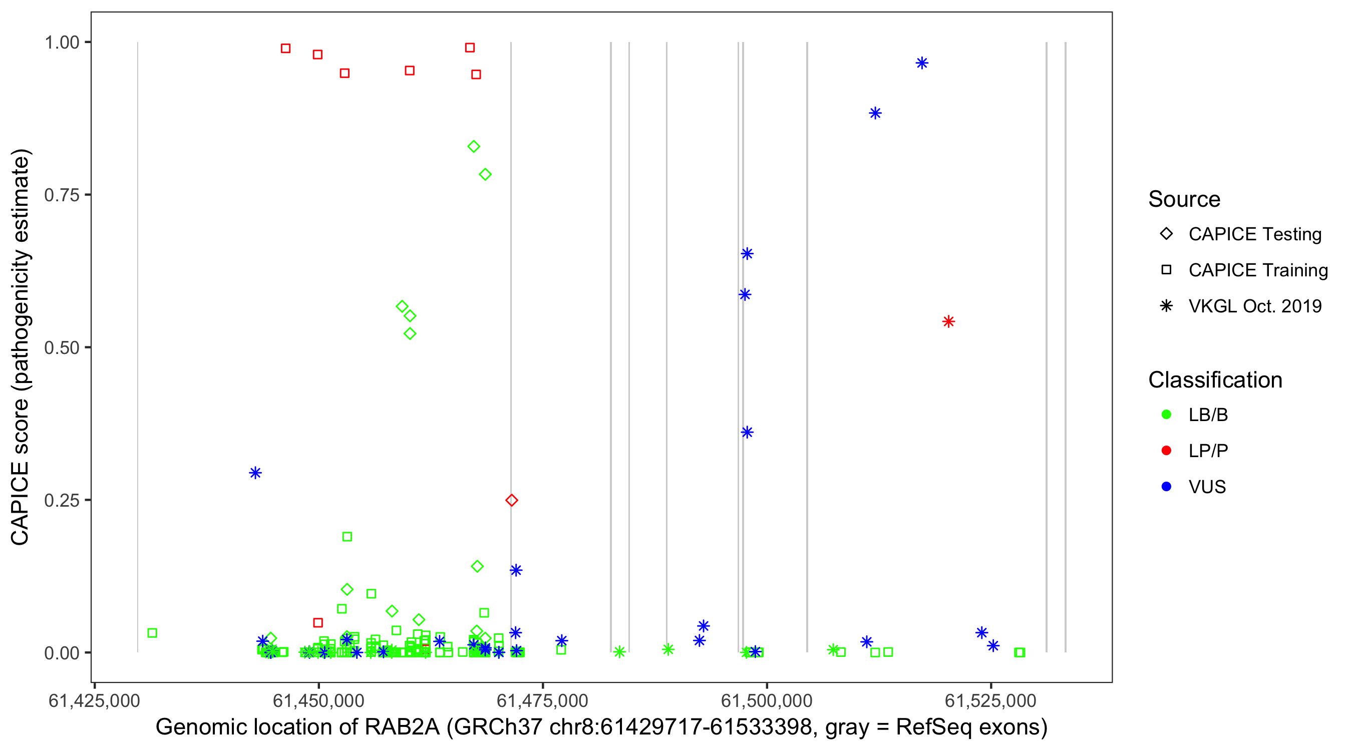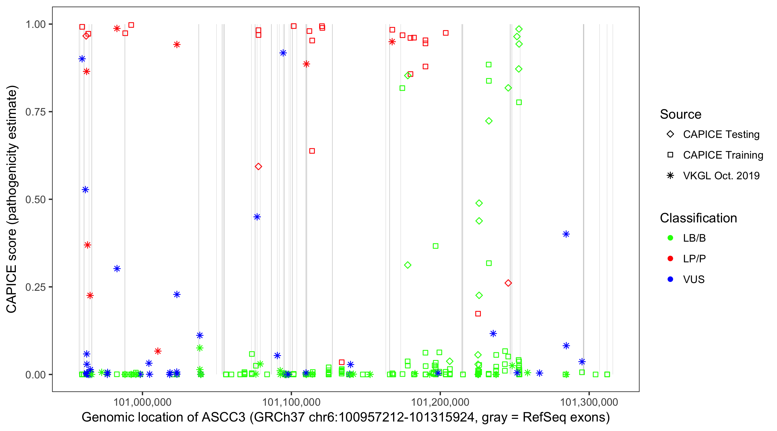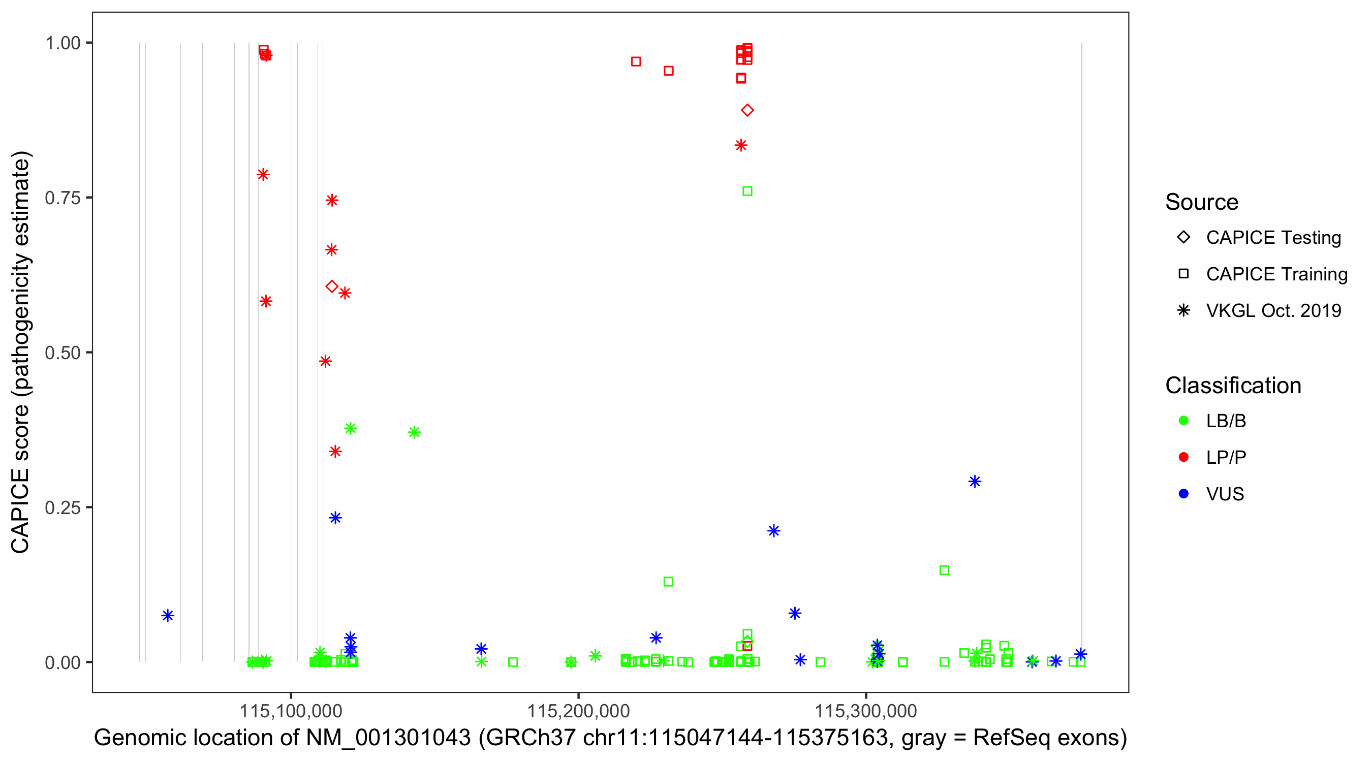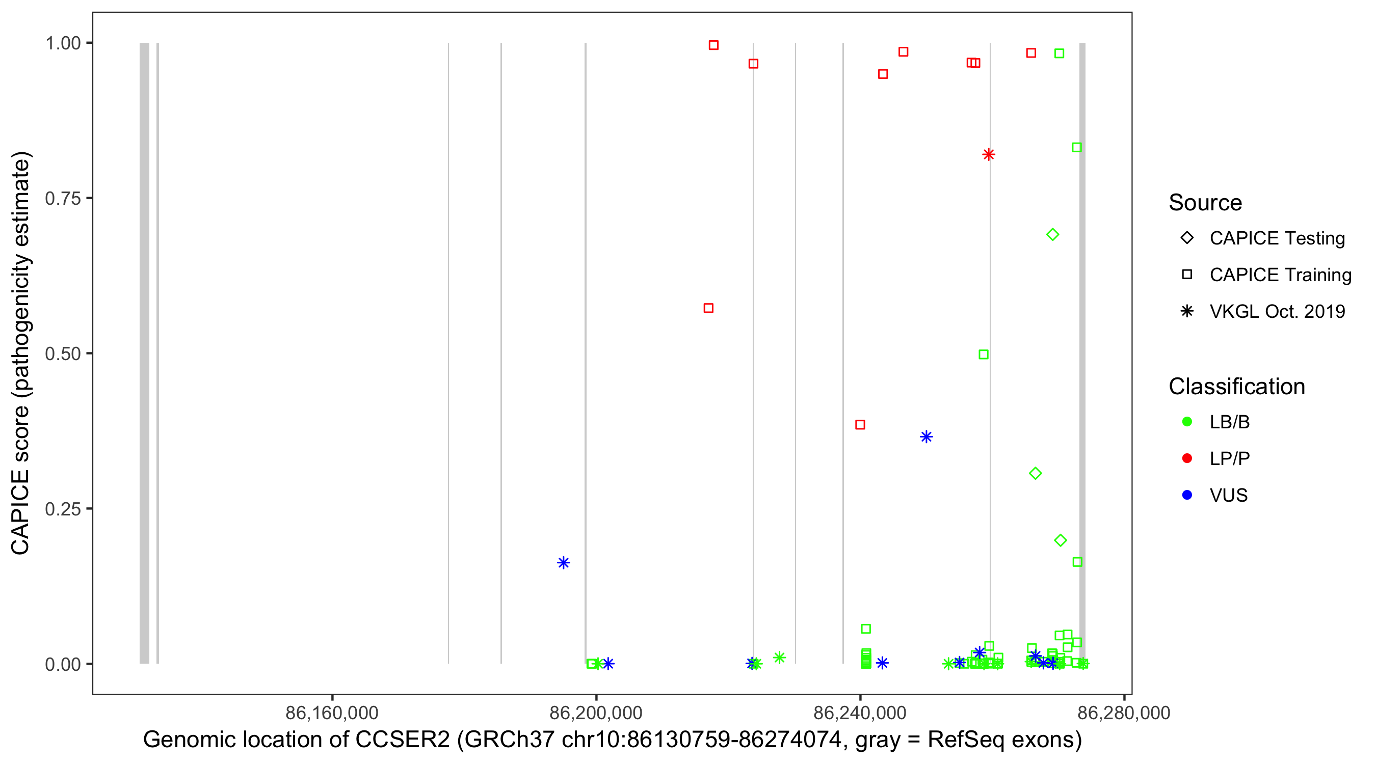 Shown are CAPICE train/test variants plus VKGL Oct 2019.