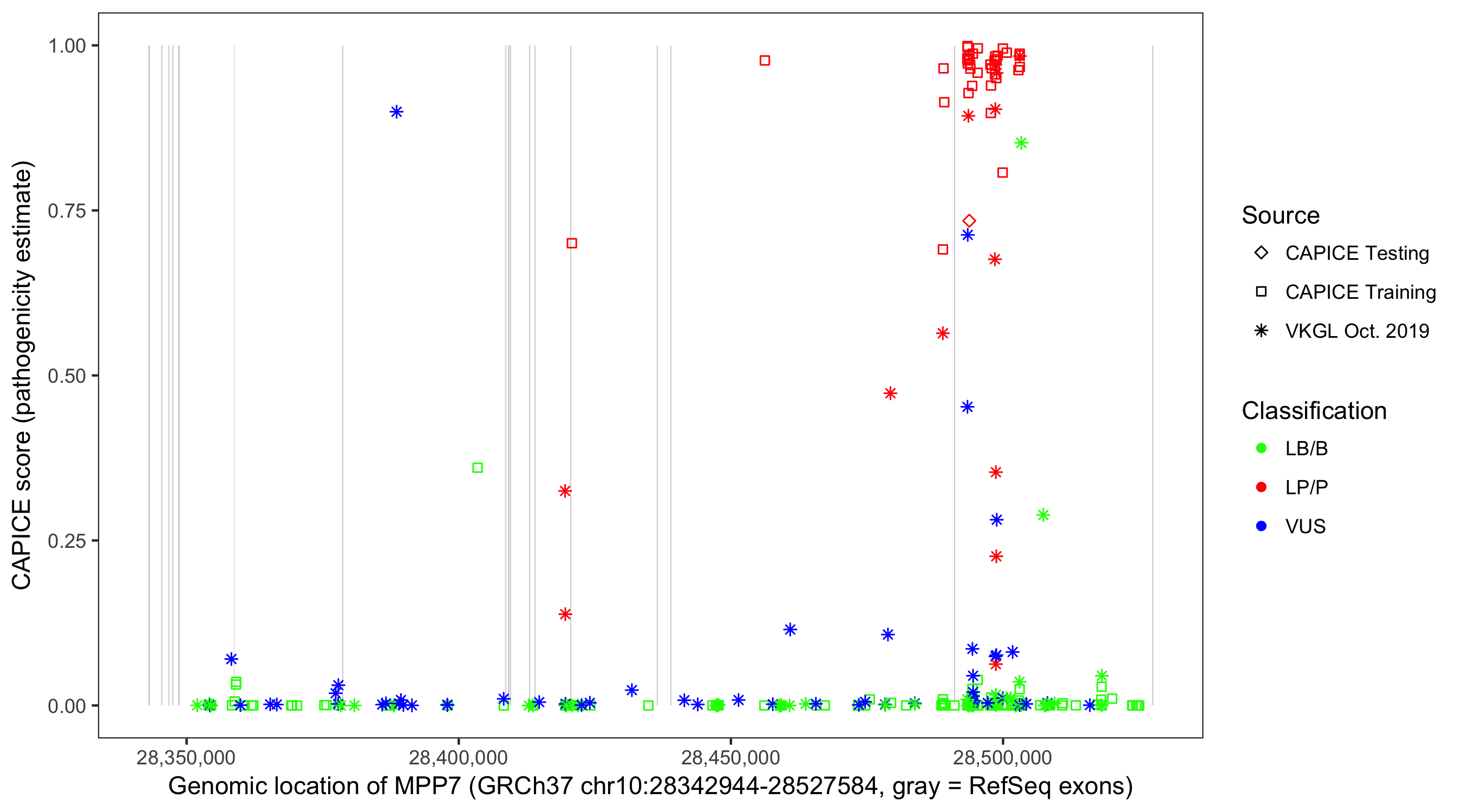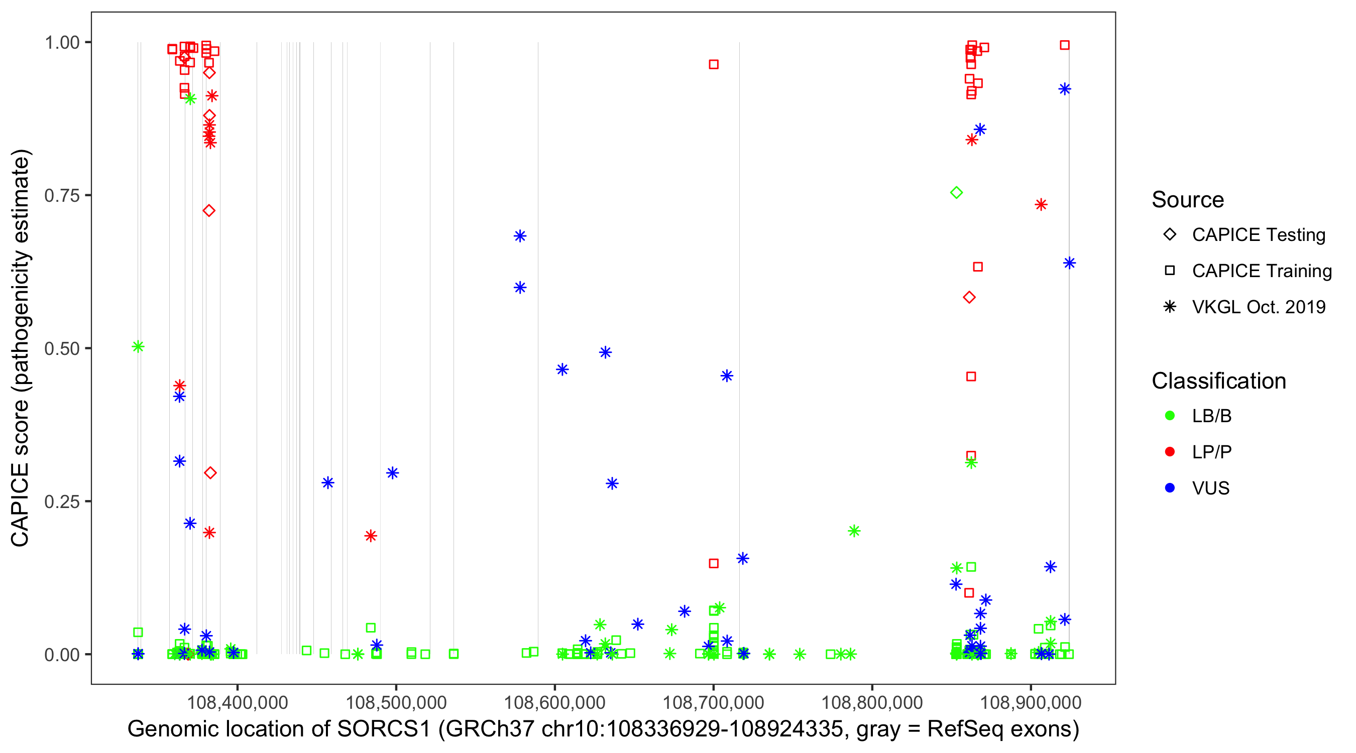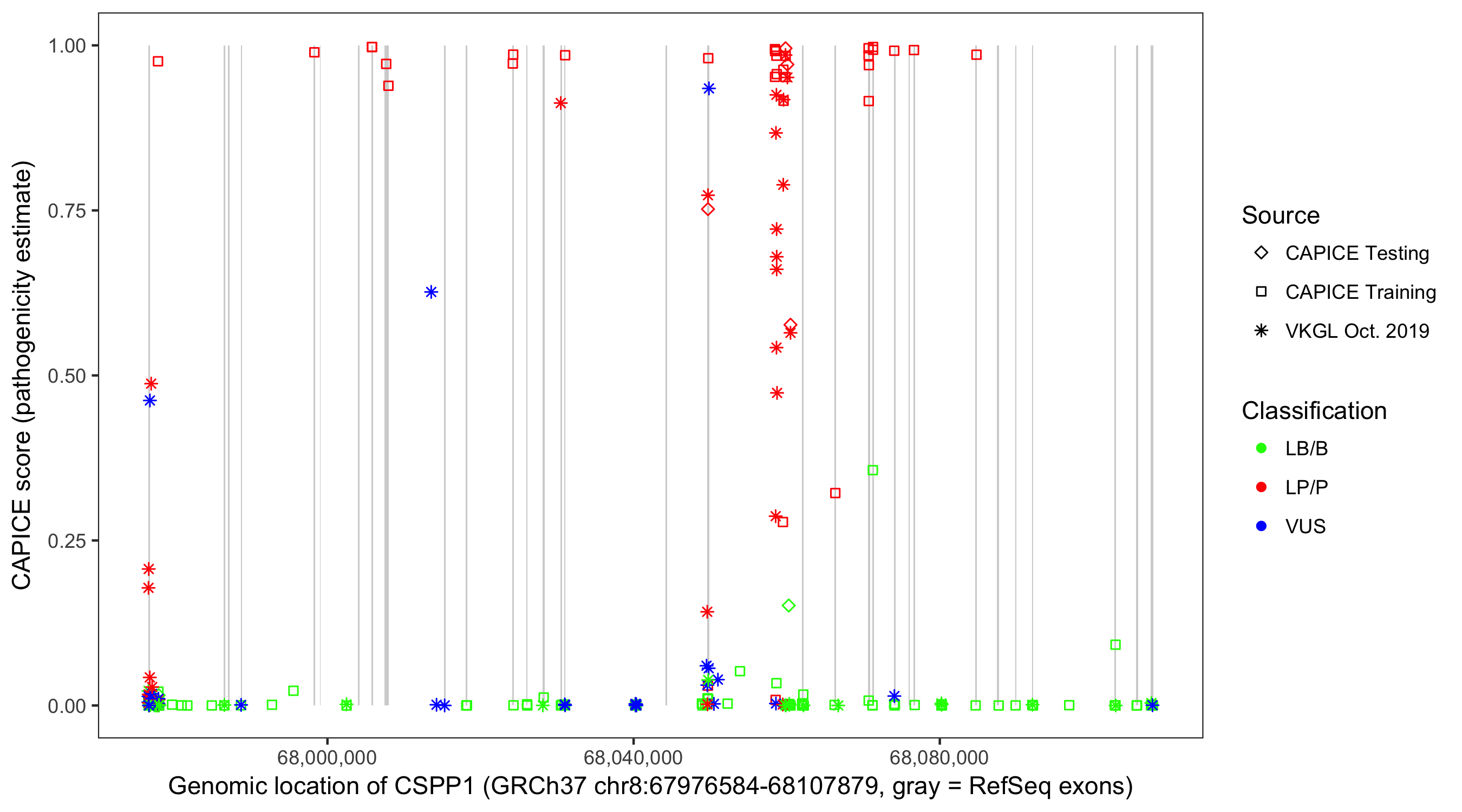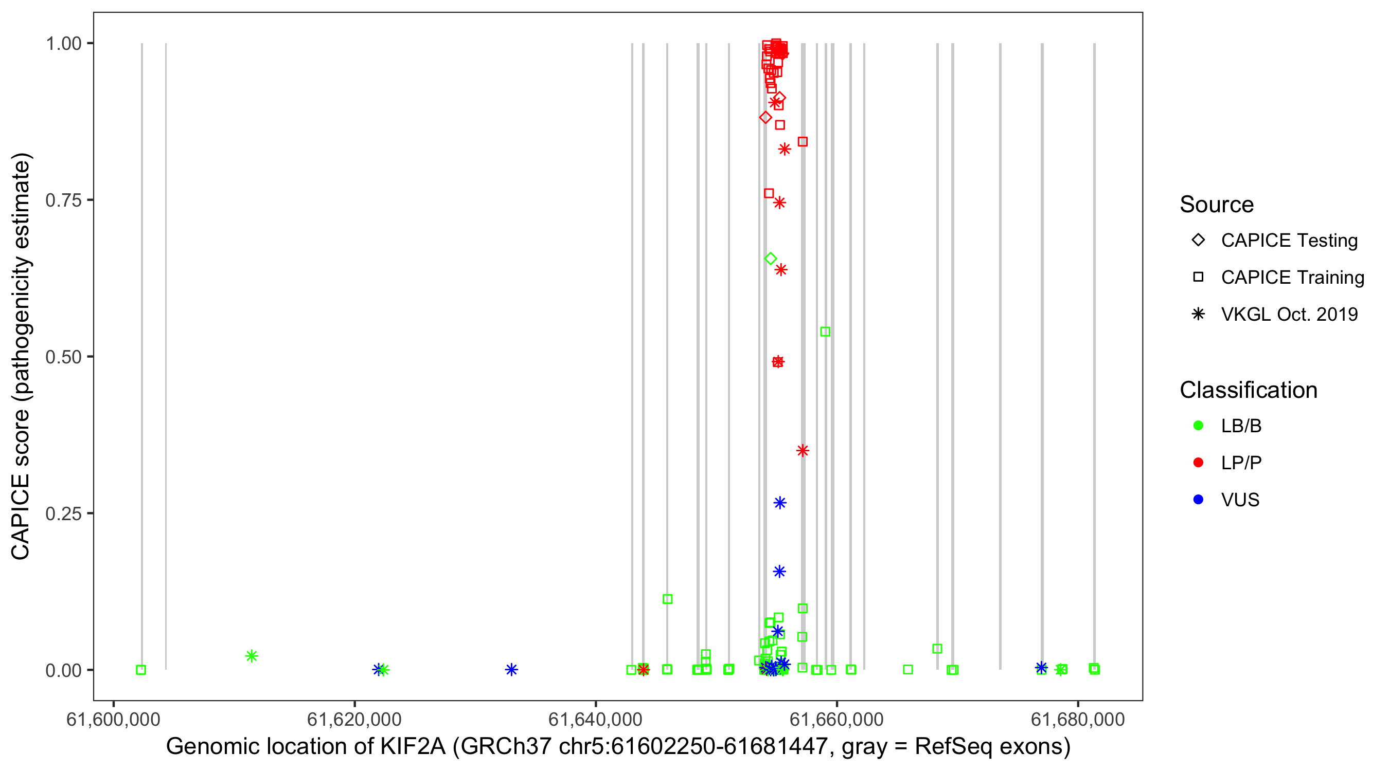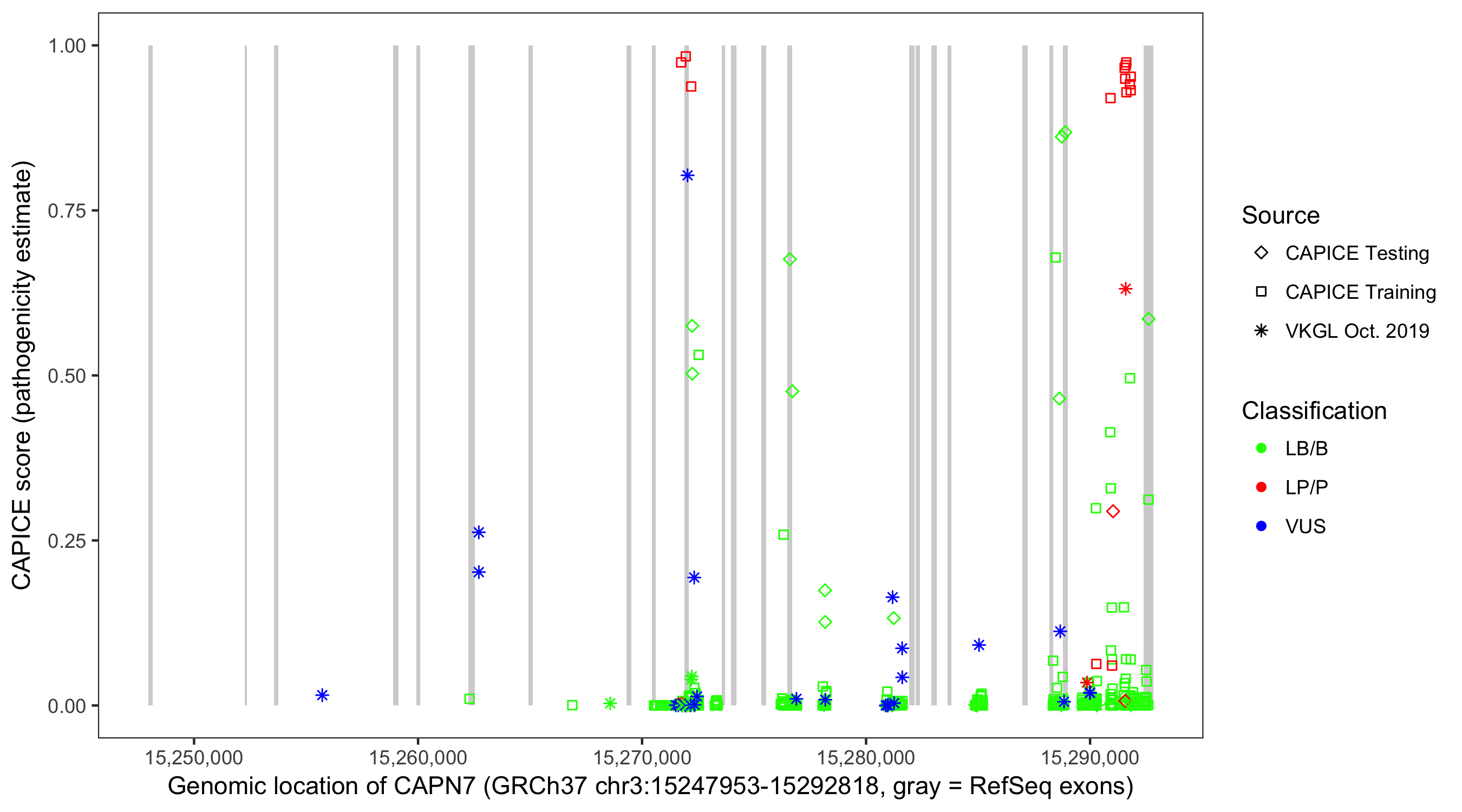 Shown are CAPICE train/test variants plus VKGL Oct 2019.