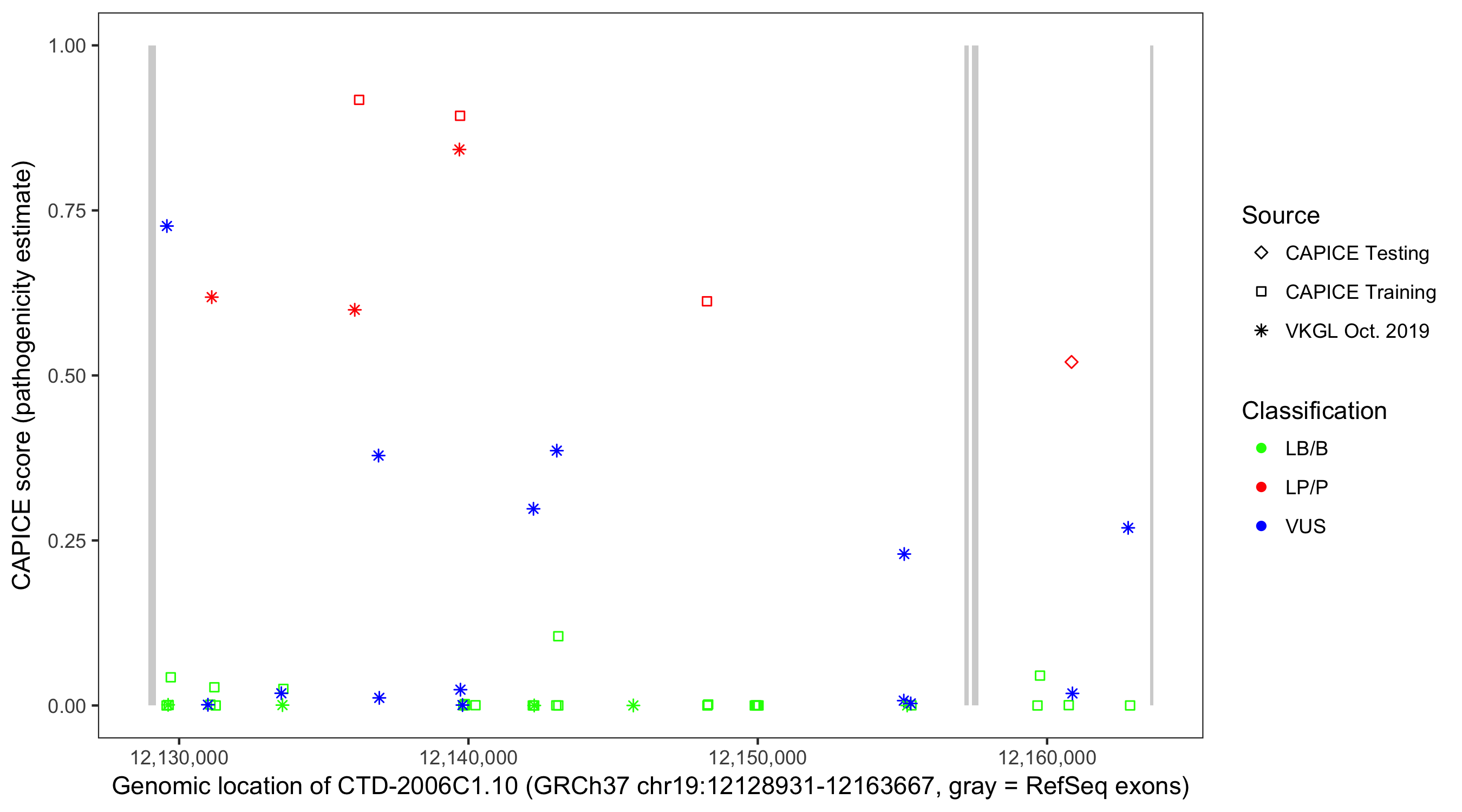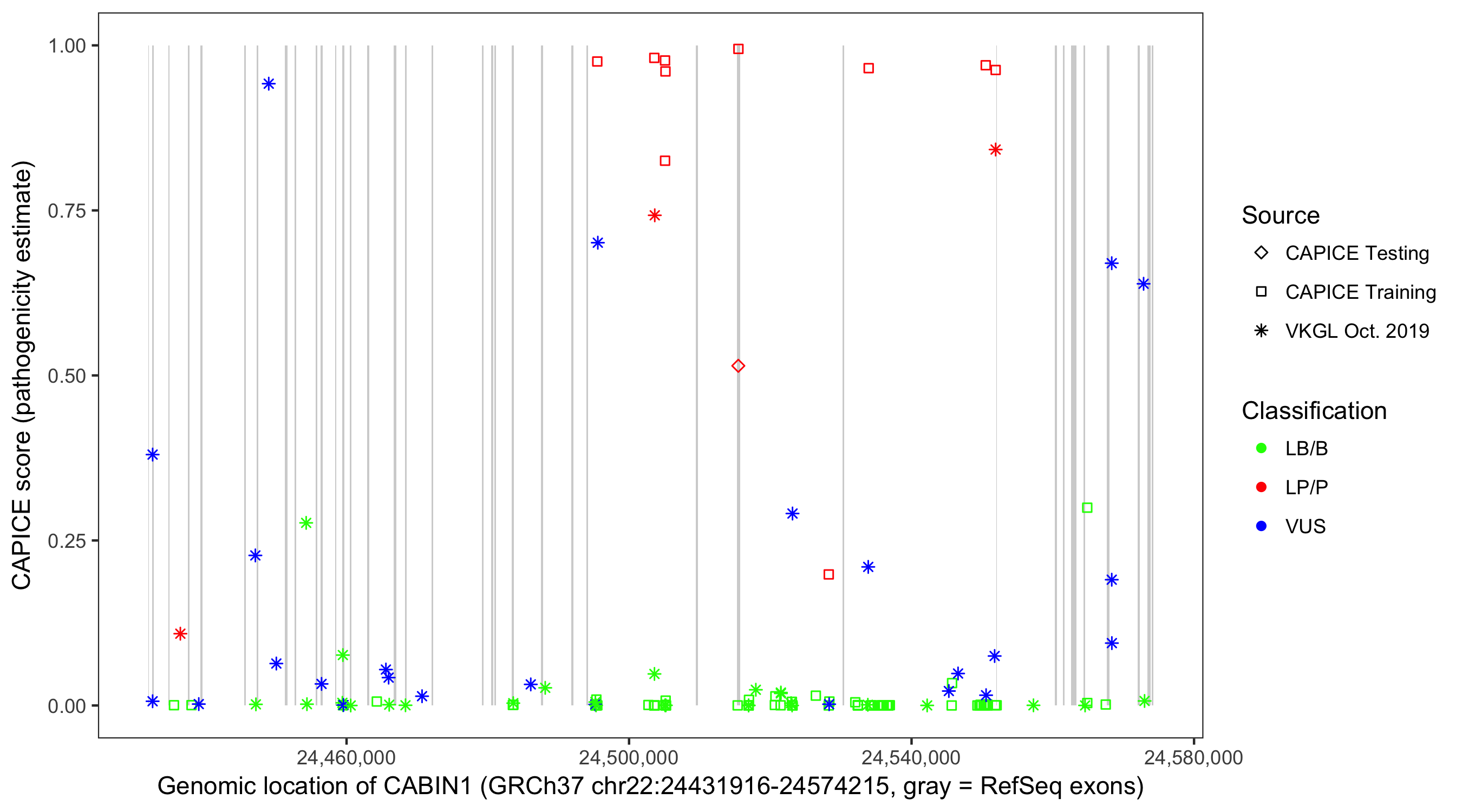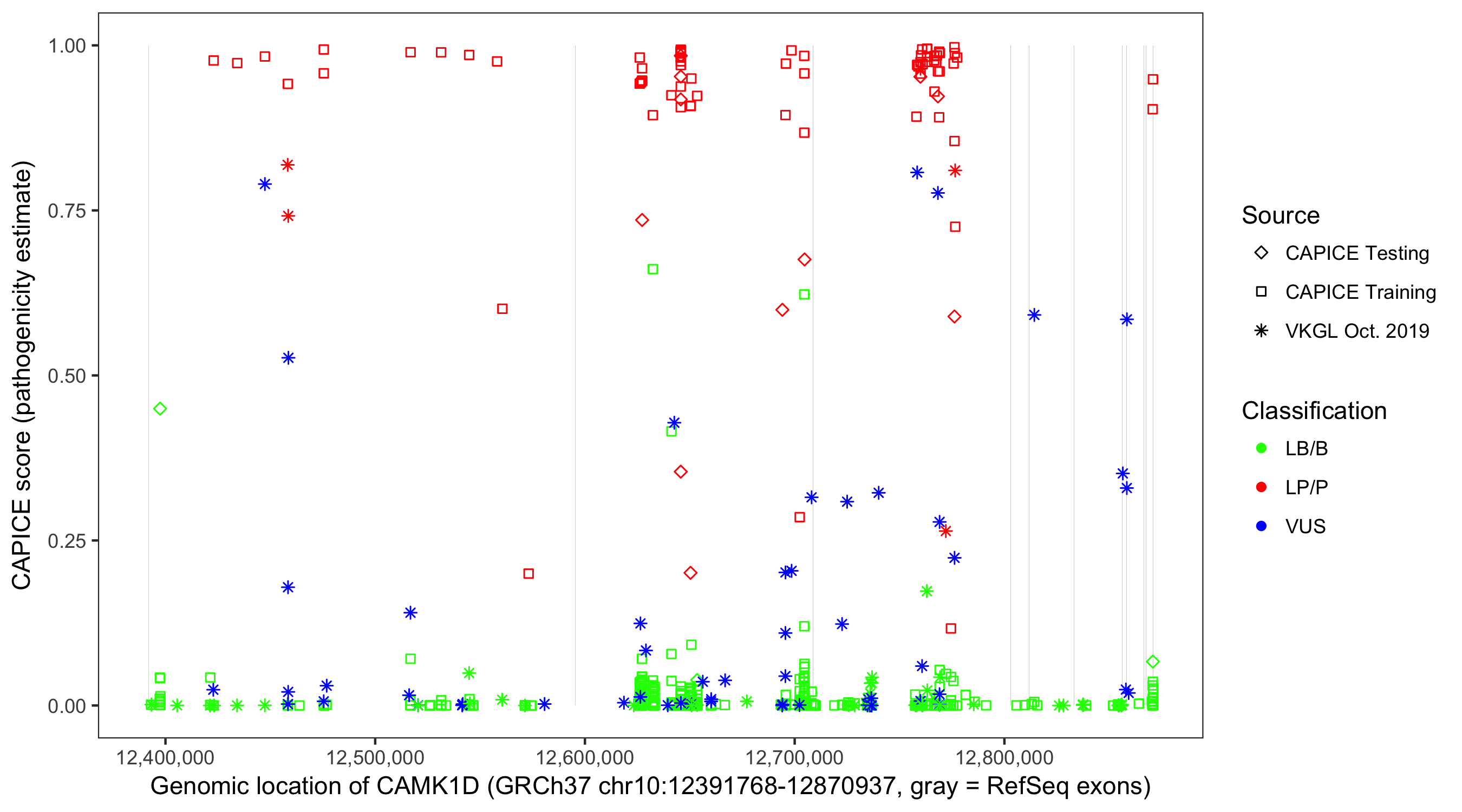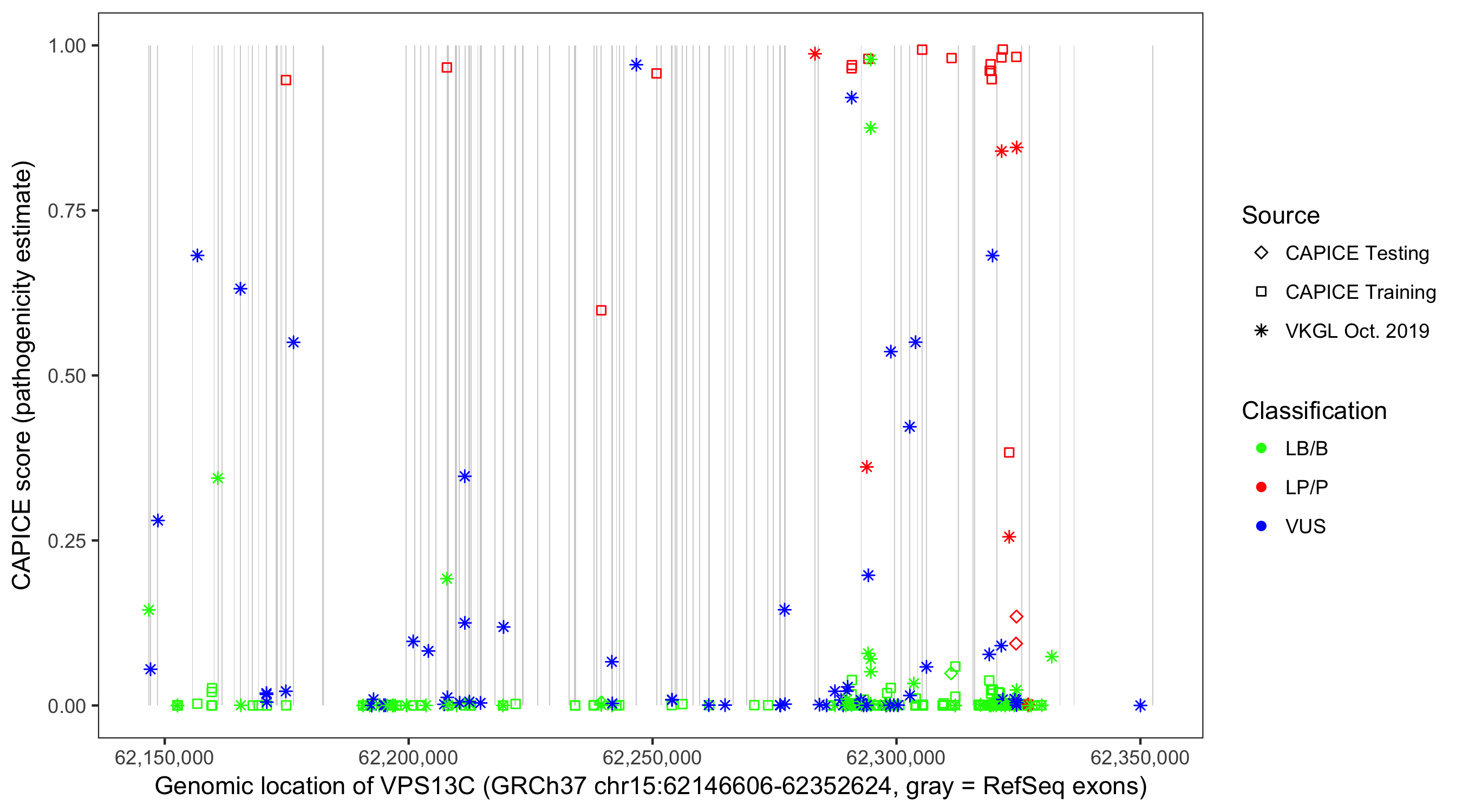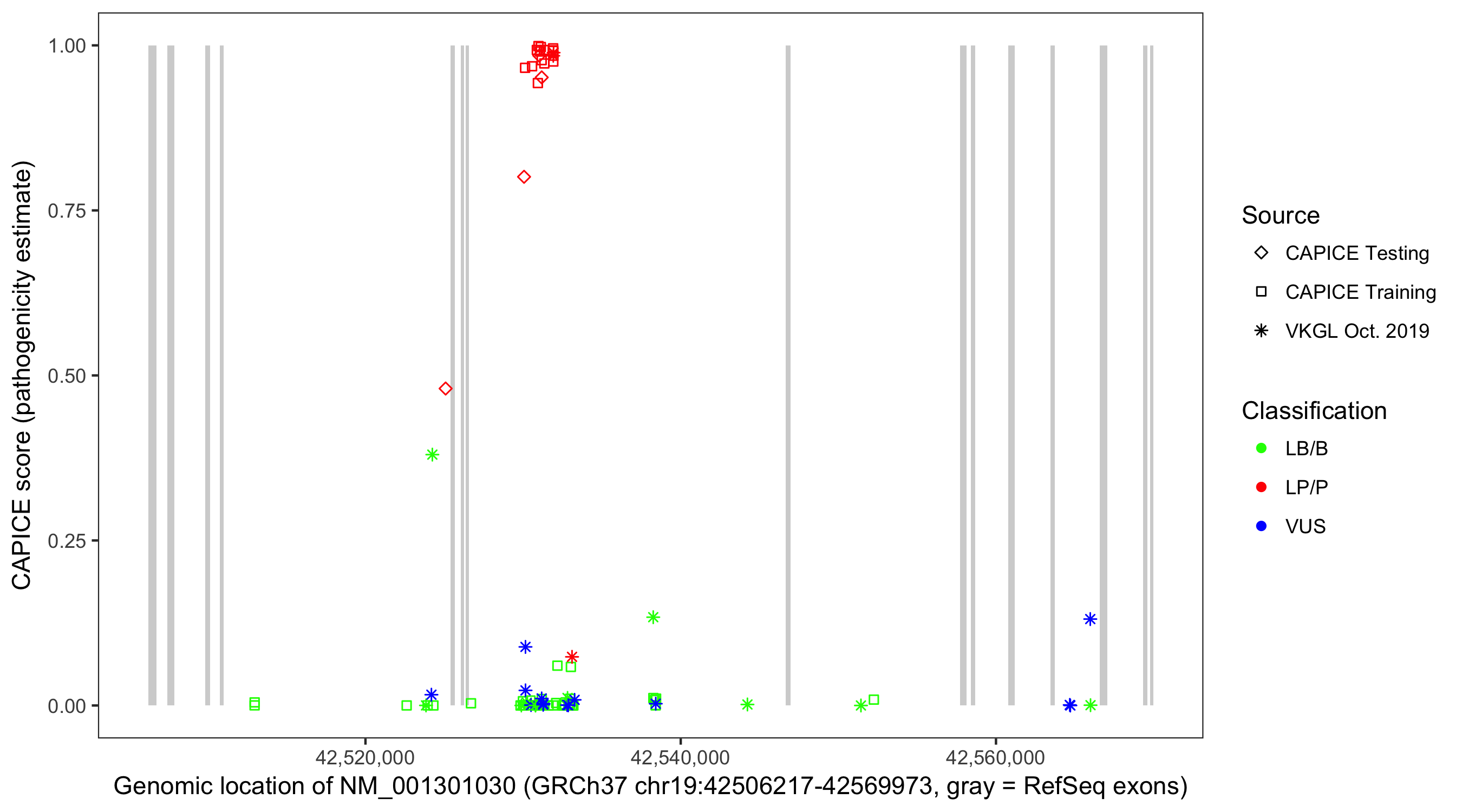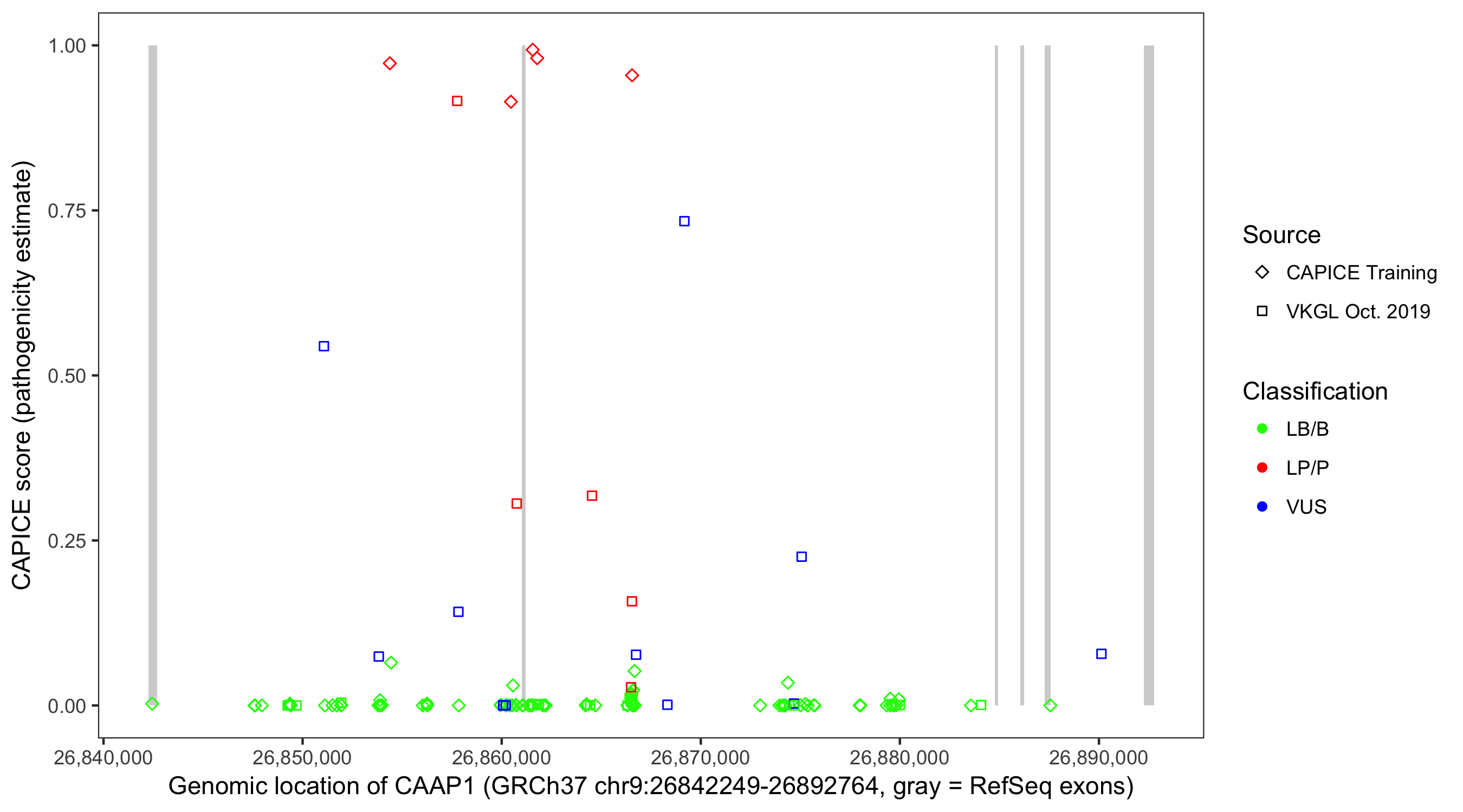 Shown are CAPICE train/test variants plus VKGL Oct 2019.