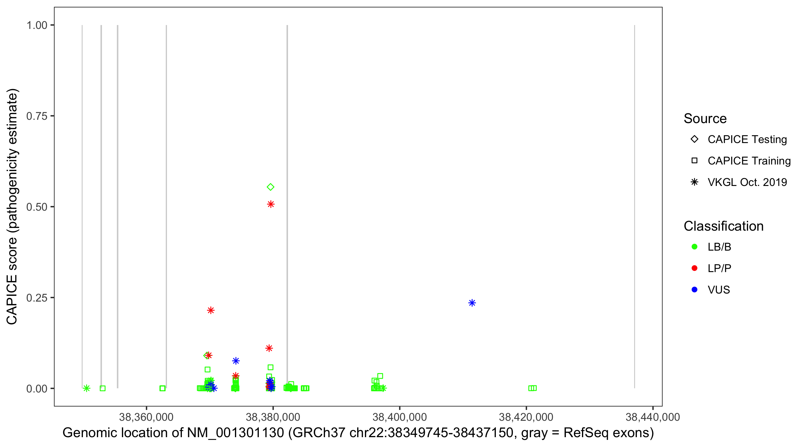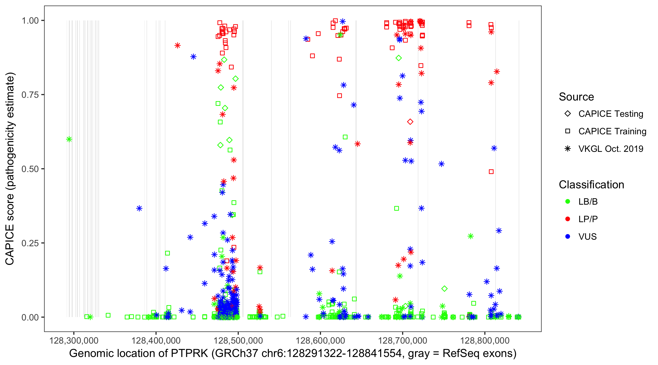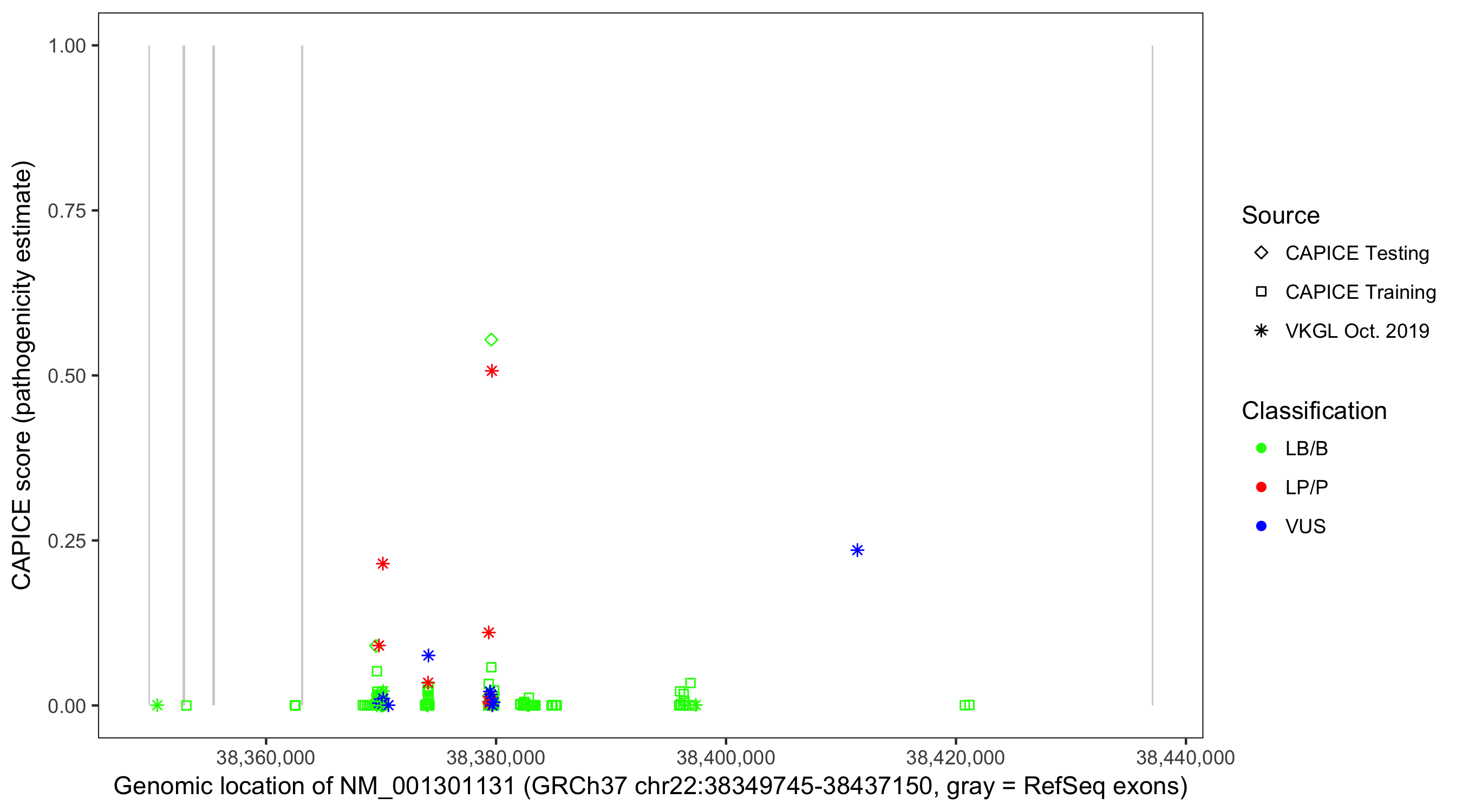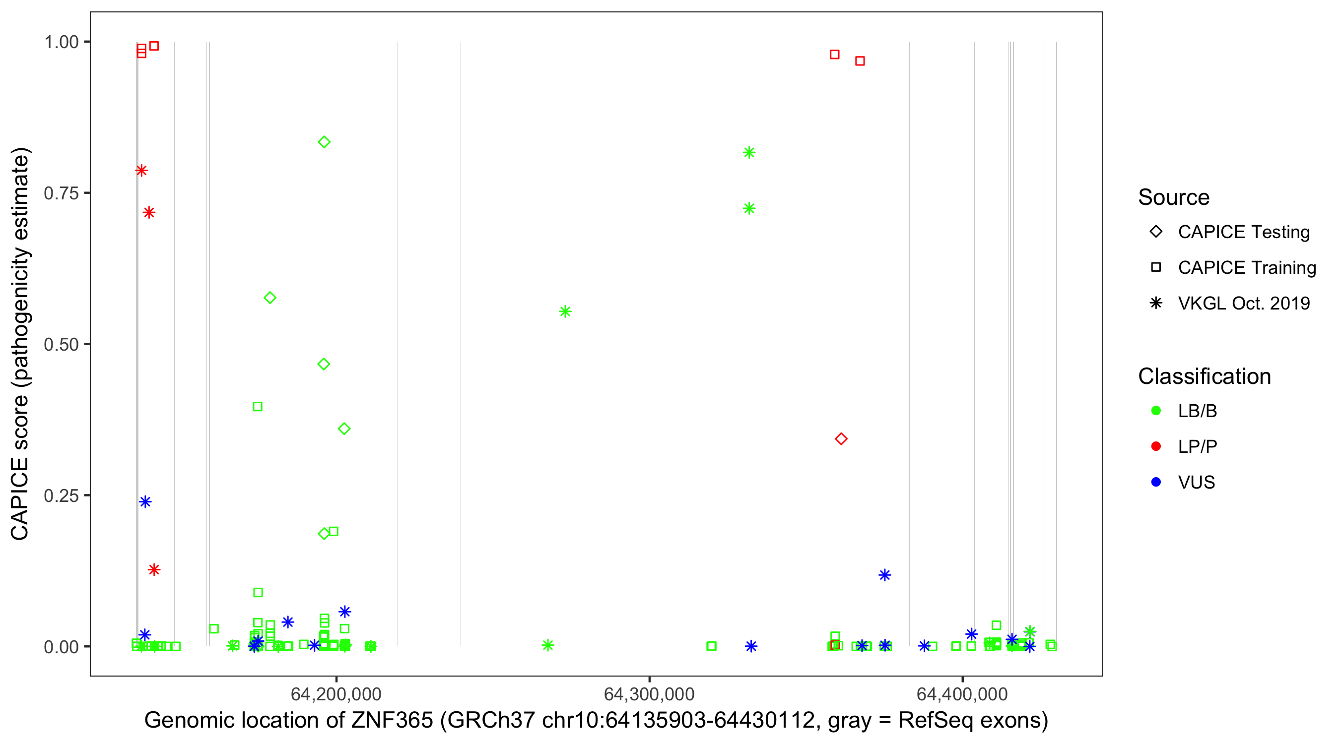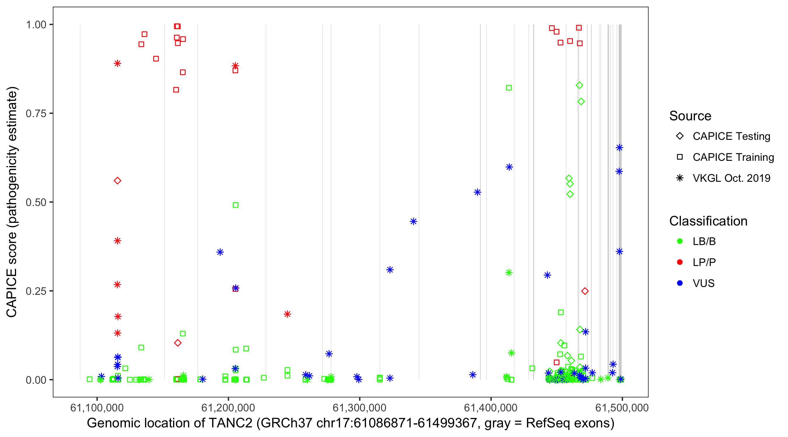 Shown are CAPICE train/test variants plus VKGL Oct 2019.