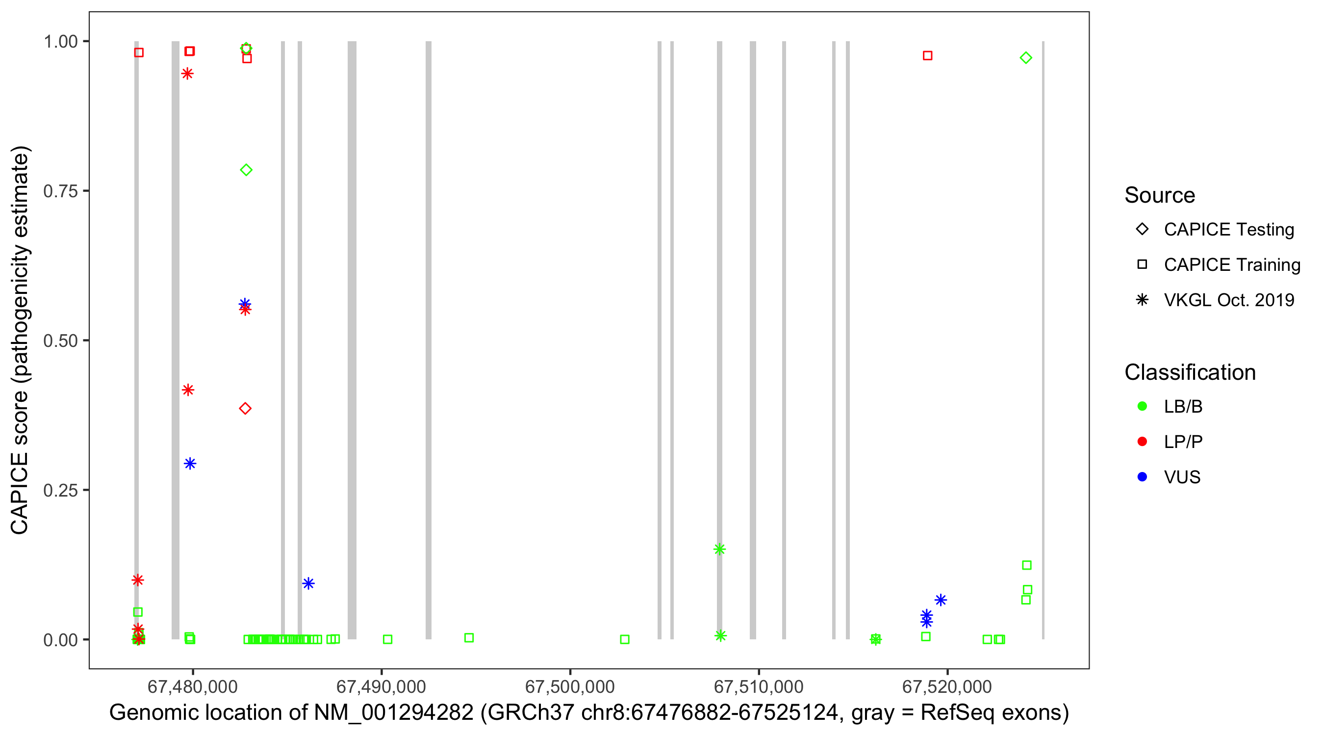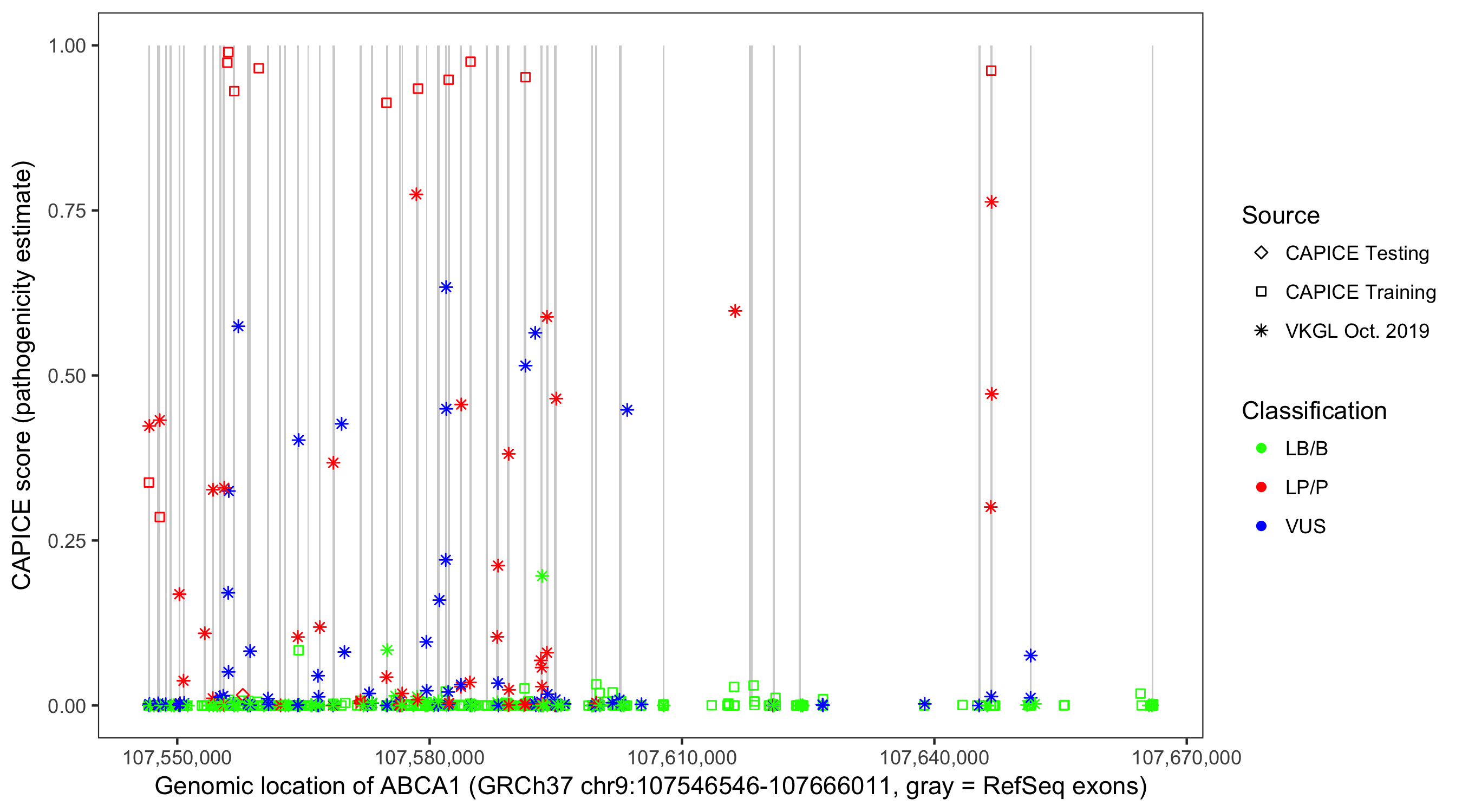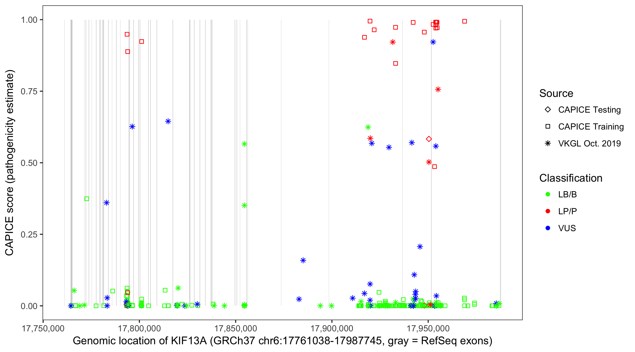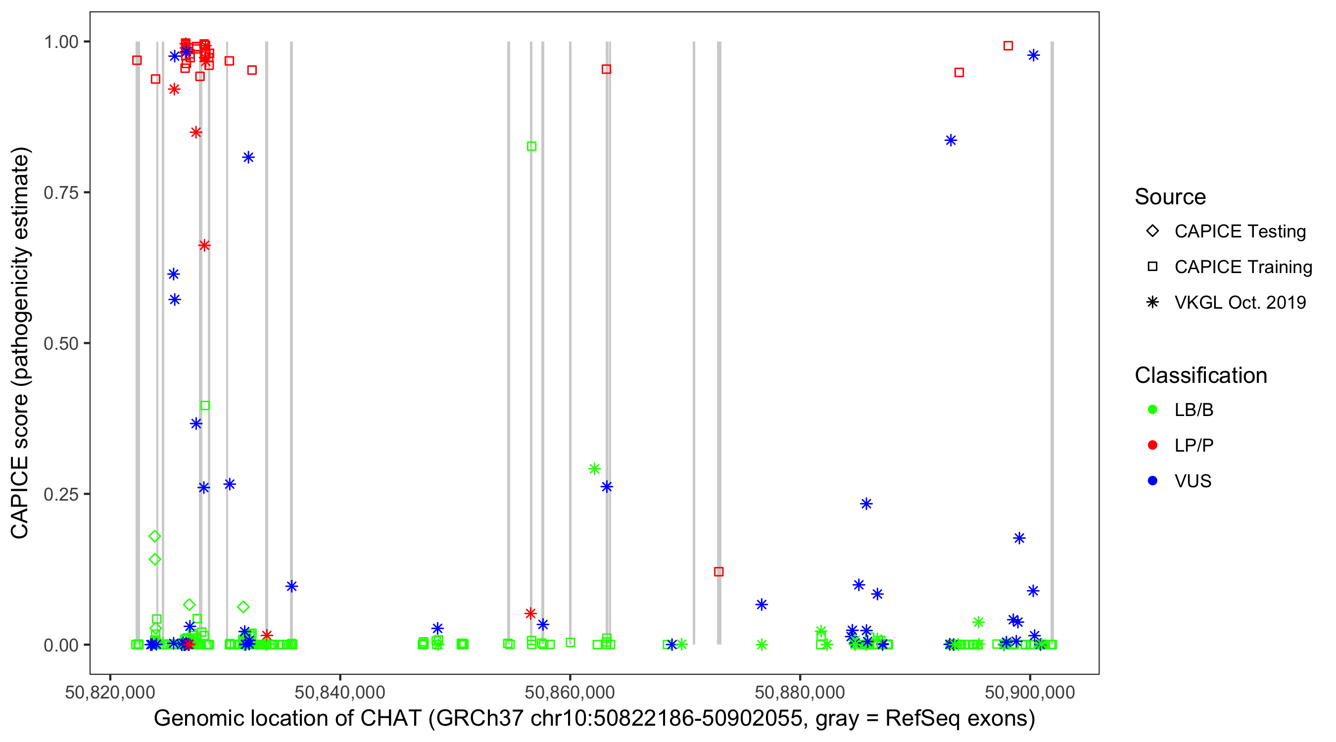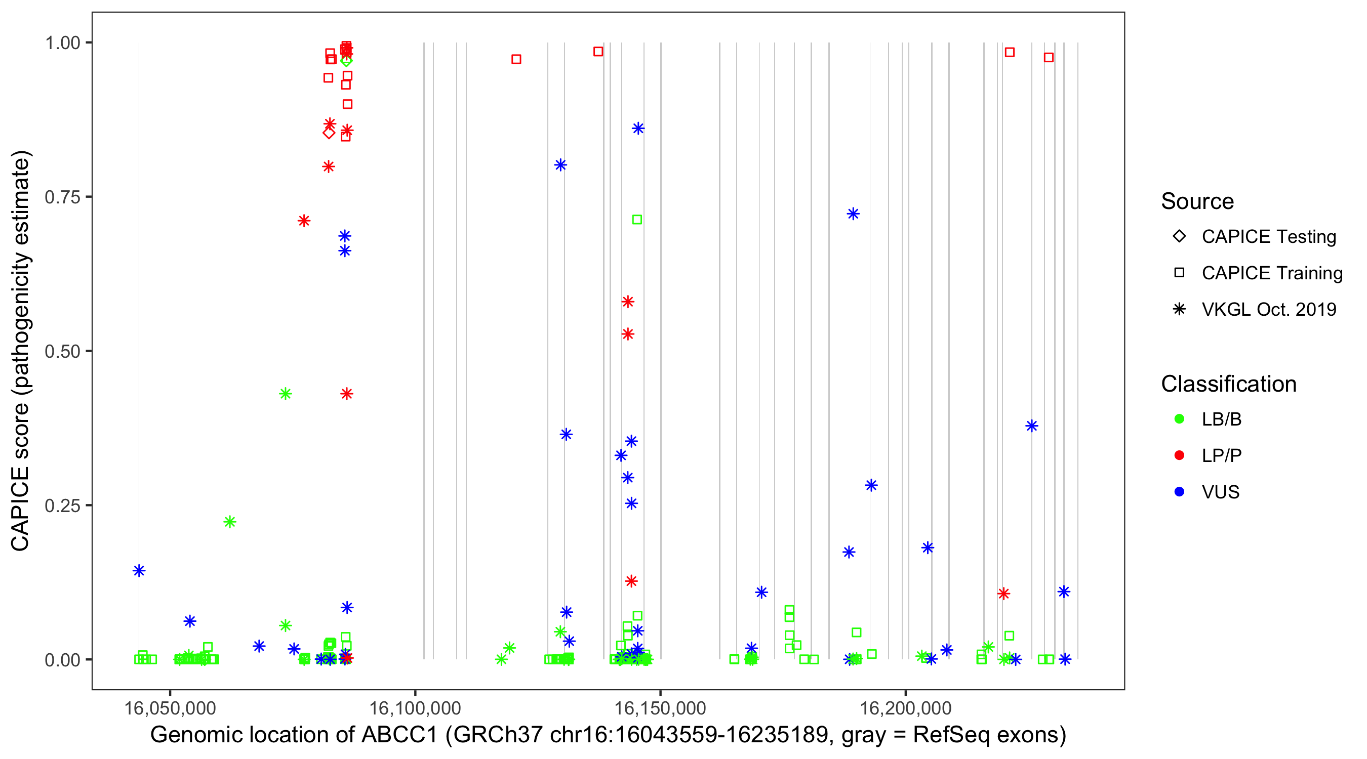 Shown are CAPICE train/test variants plus VKGL Oct 2019.