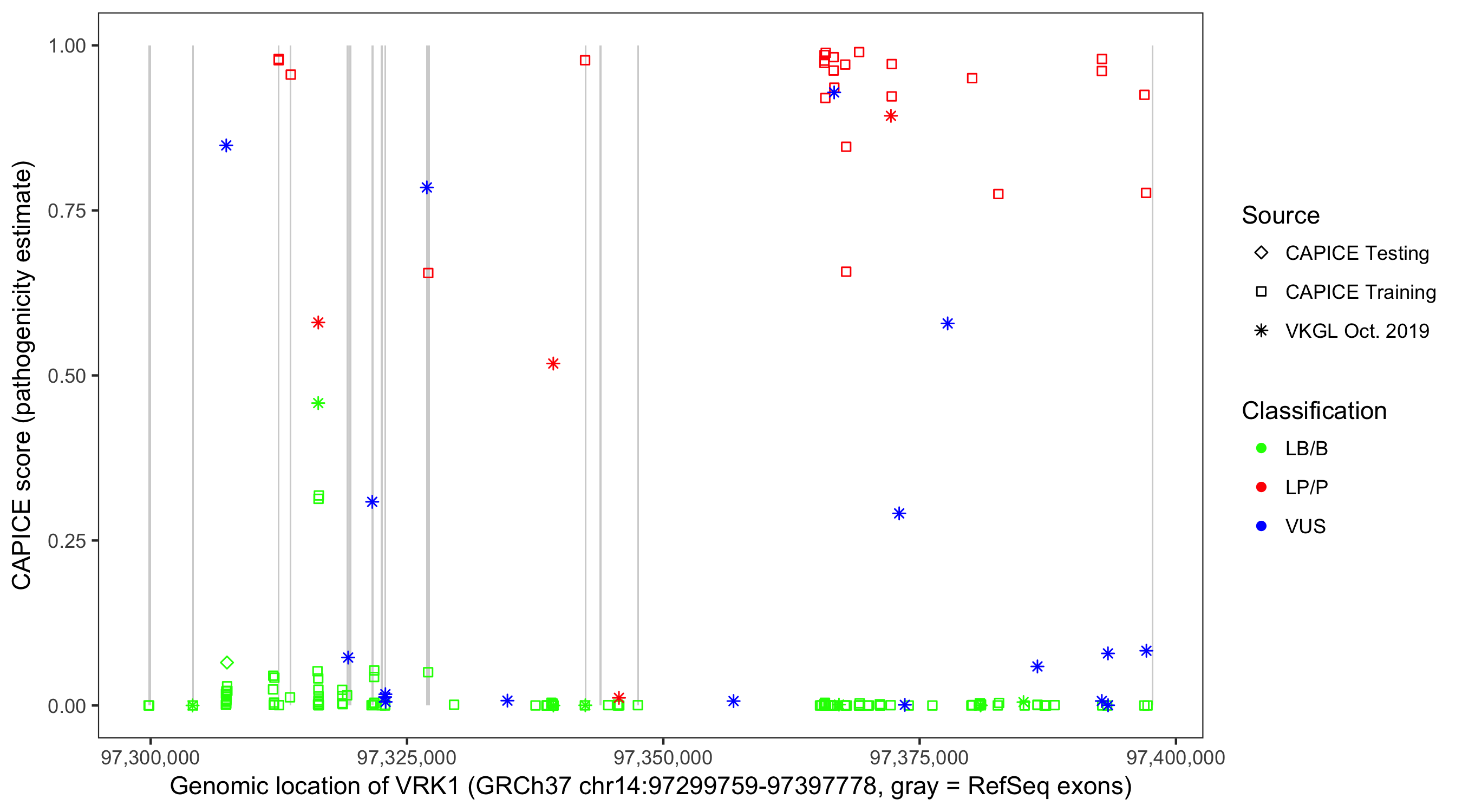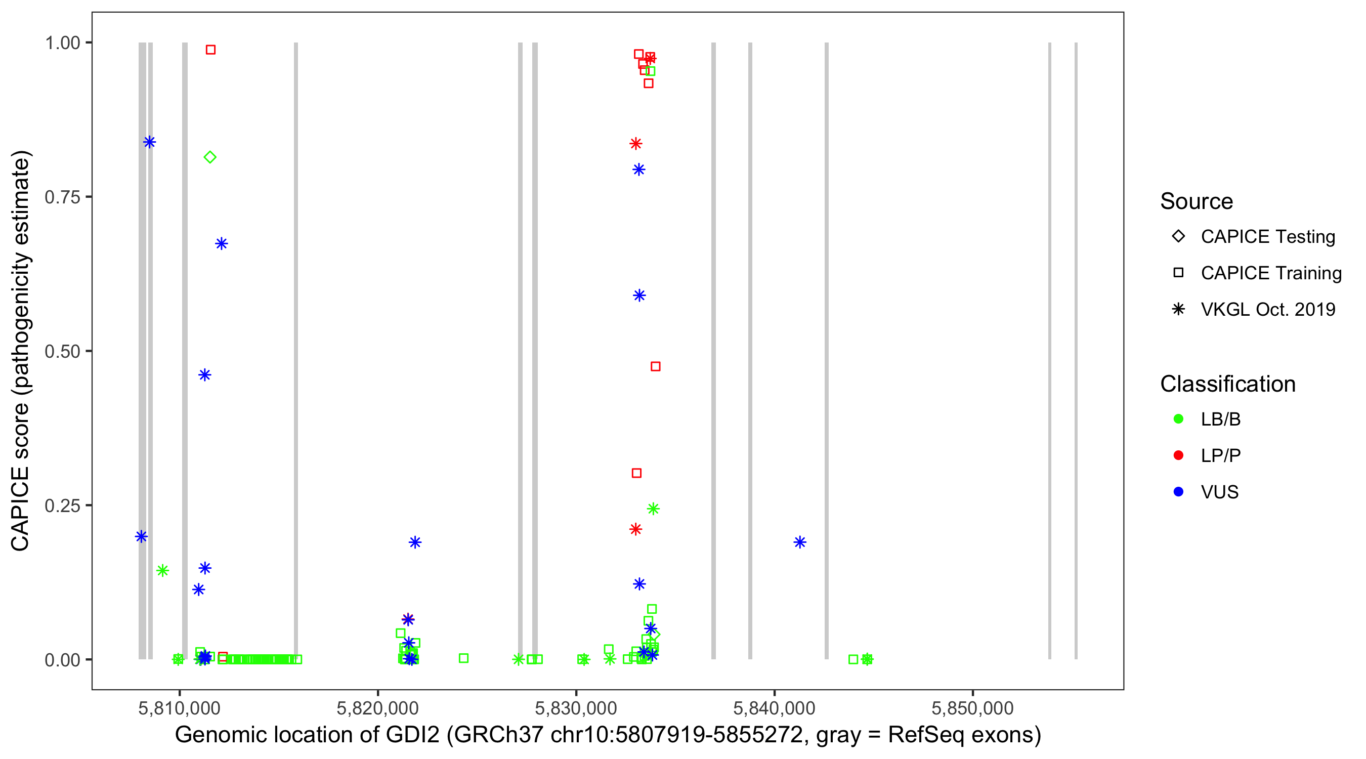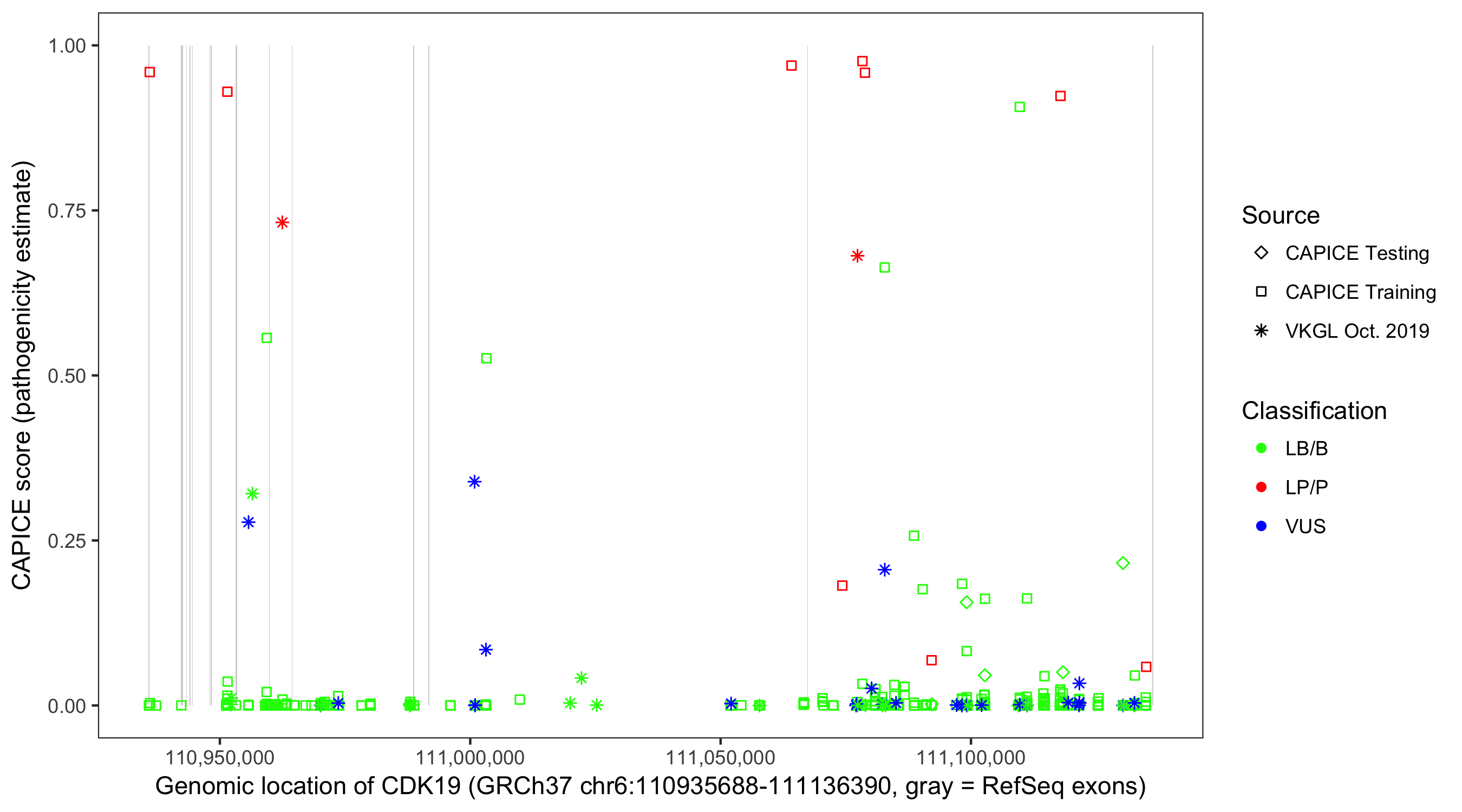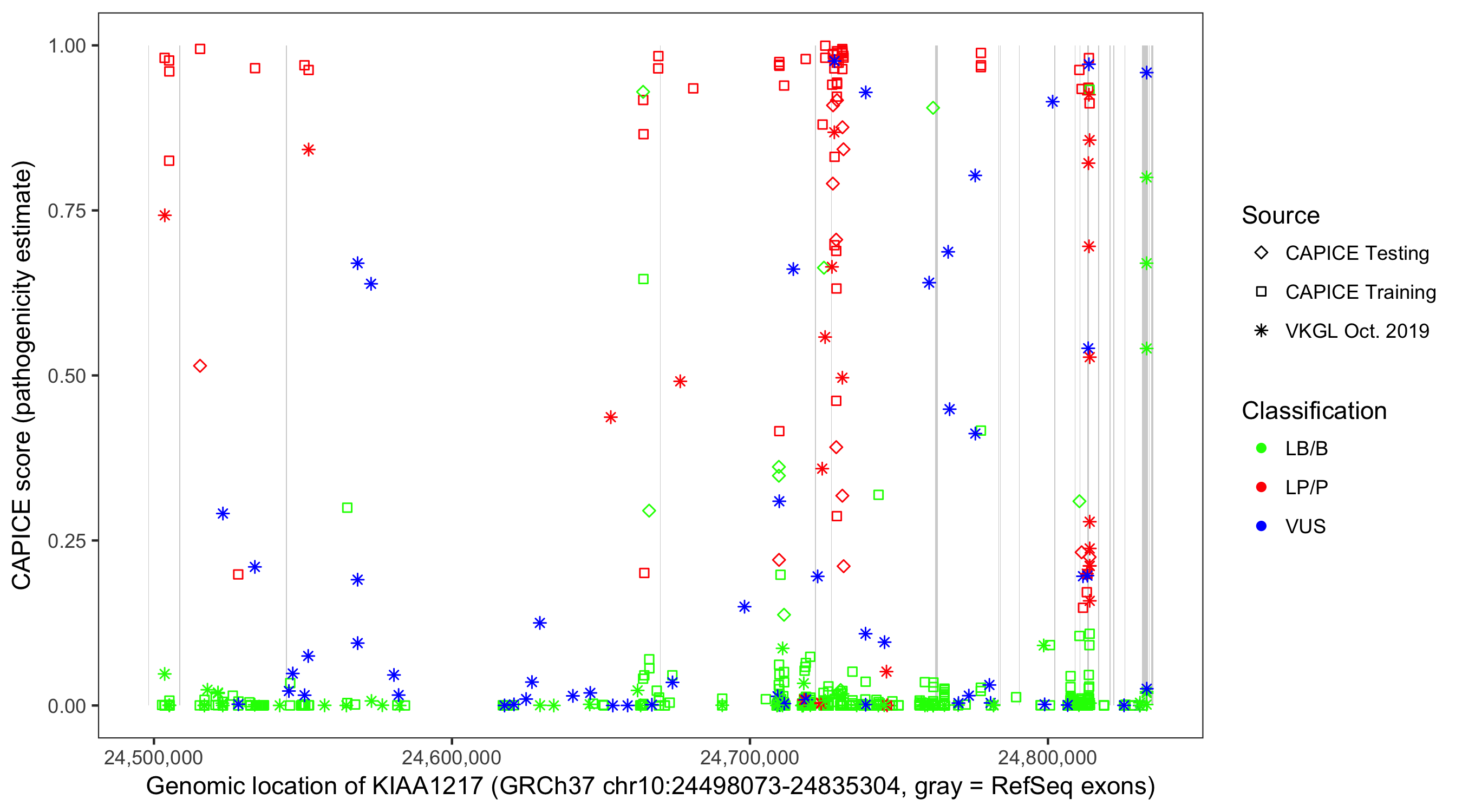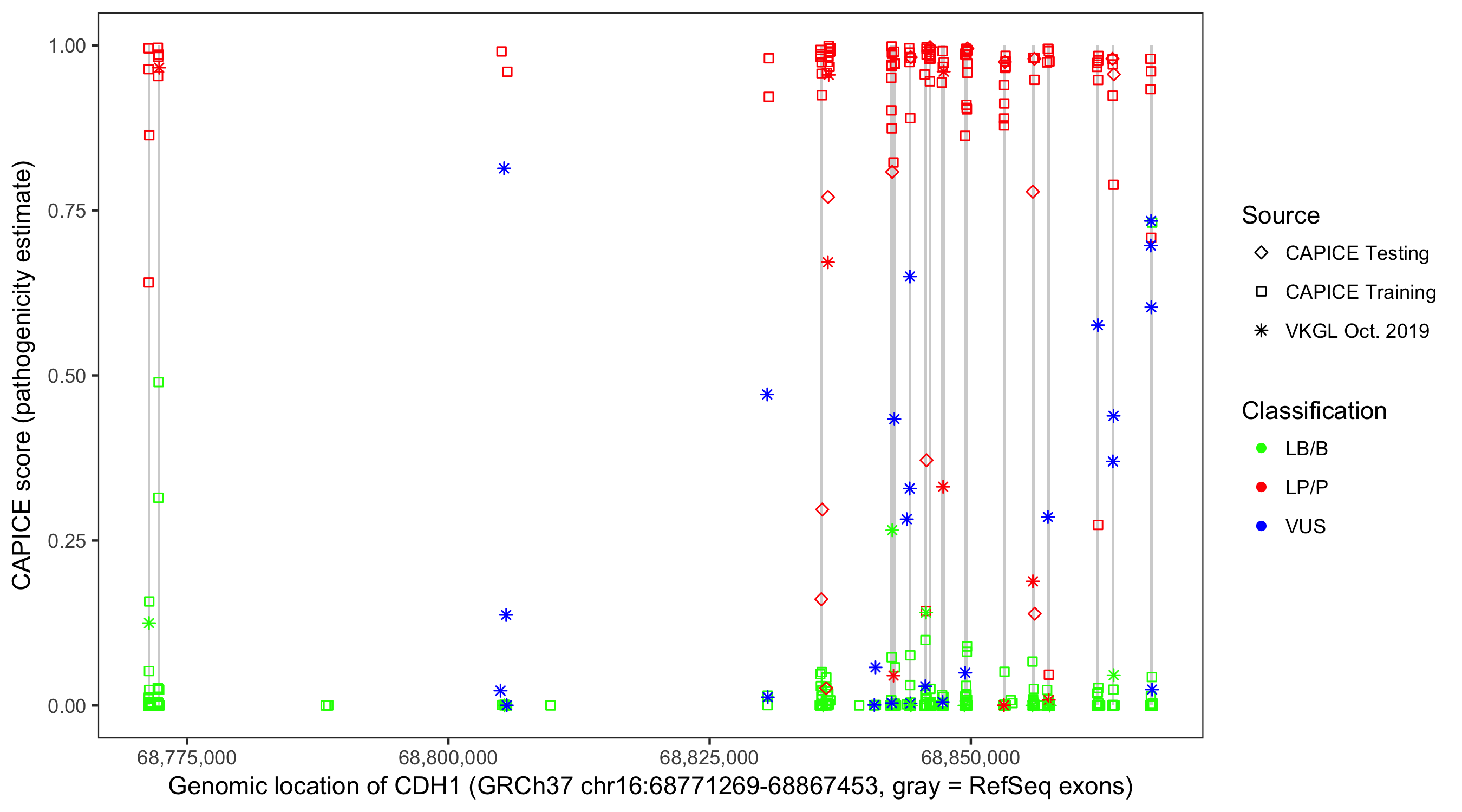 Shown are CAPICE train/test variants plus VKGL Oct 2019.