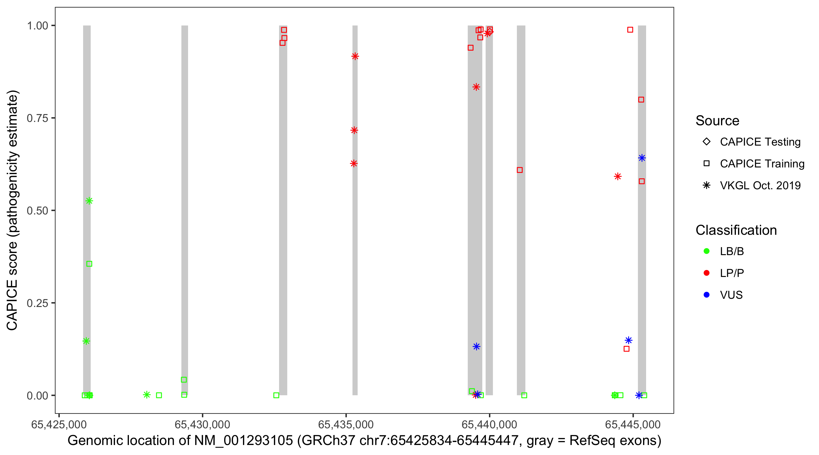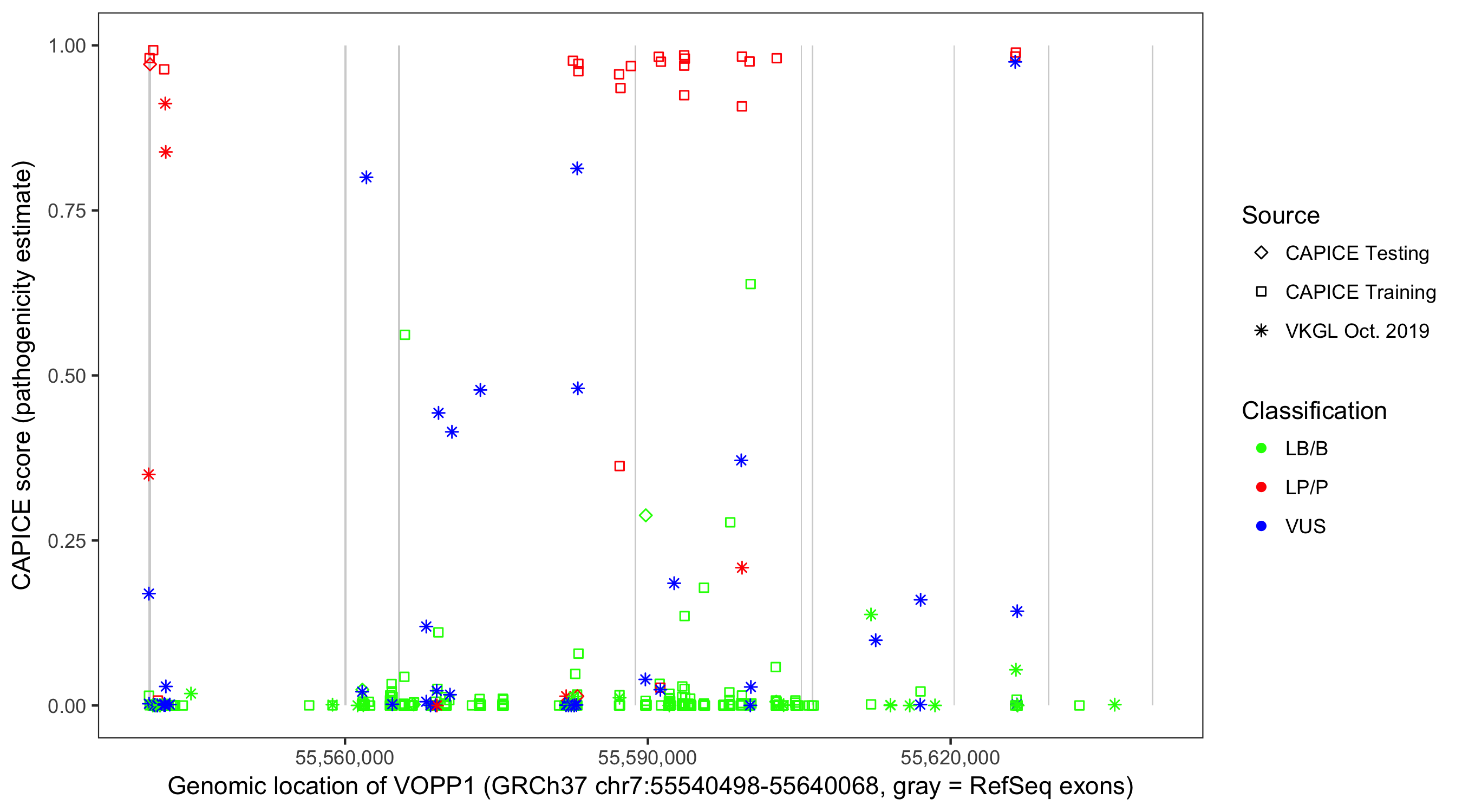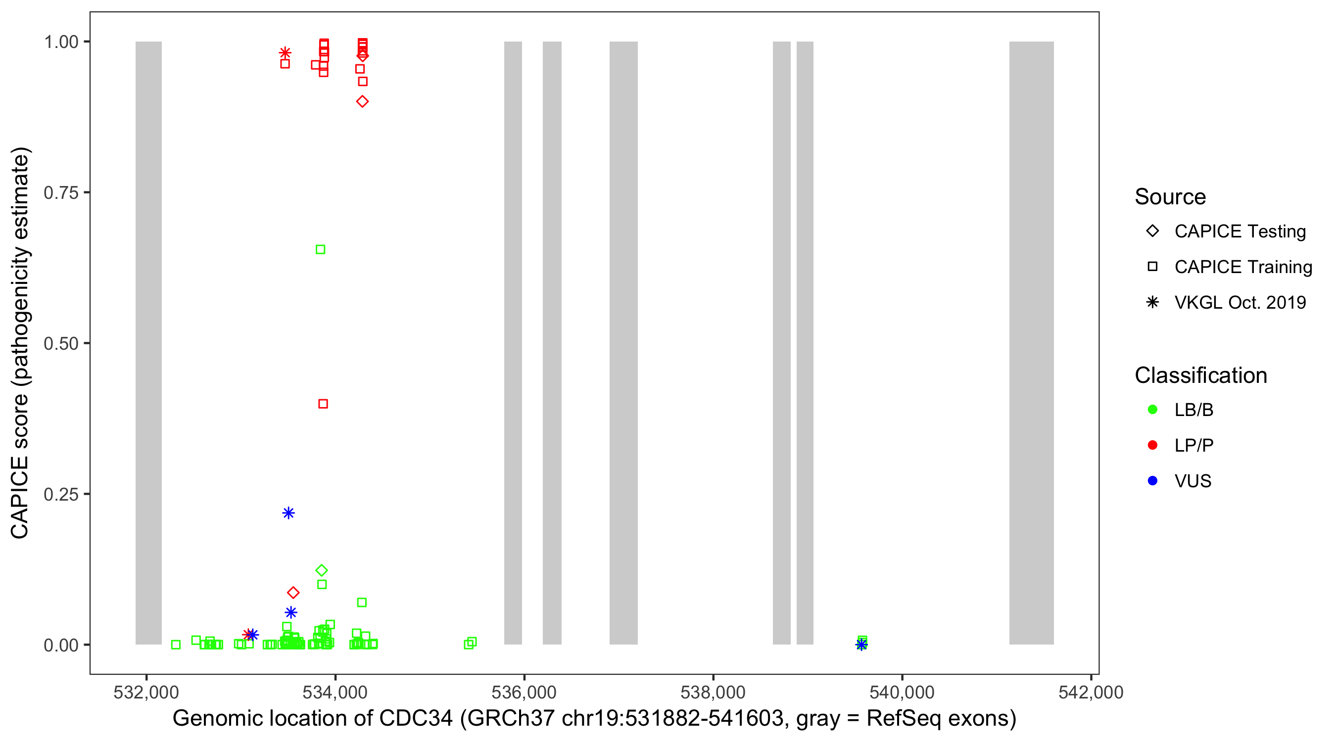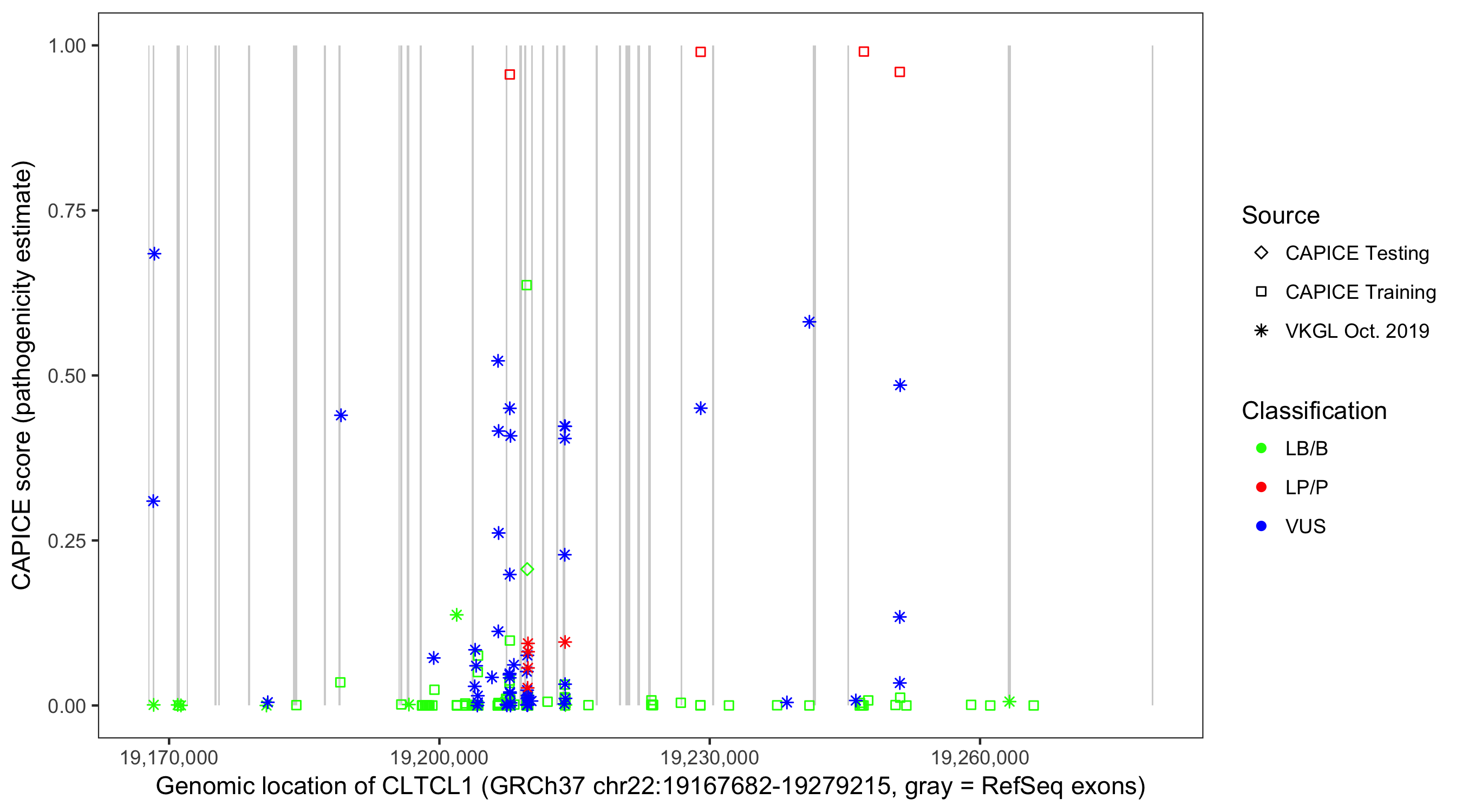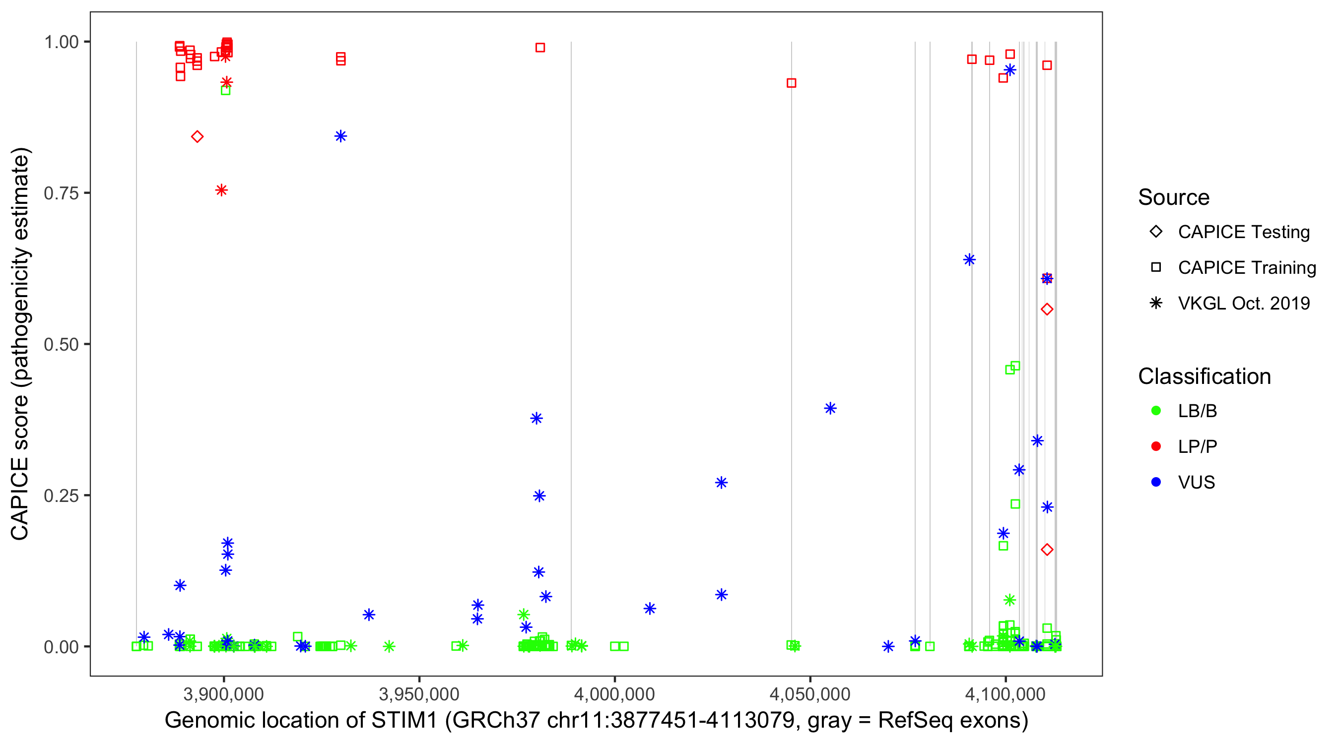 Shown are CAPICE train/test variants plus VKGL Oct 2019.