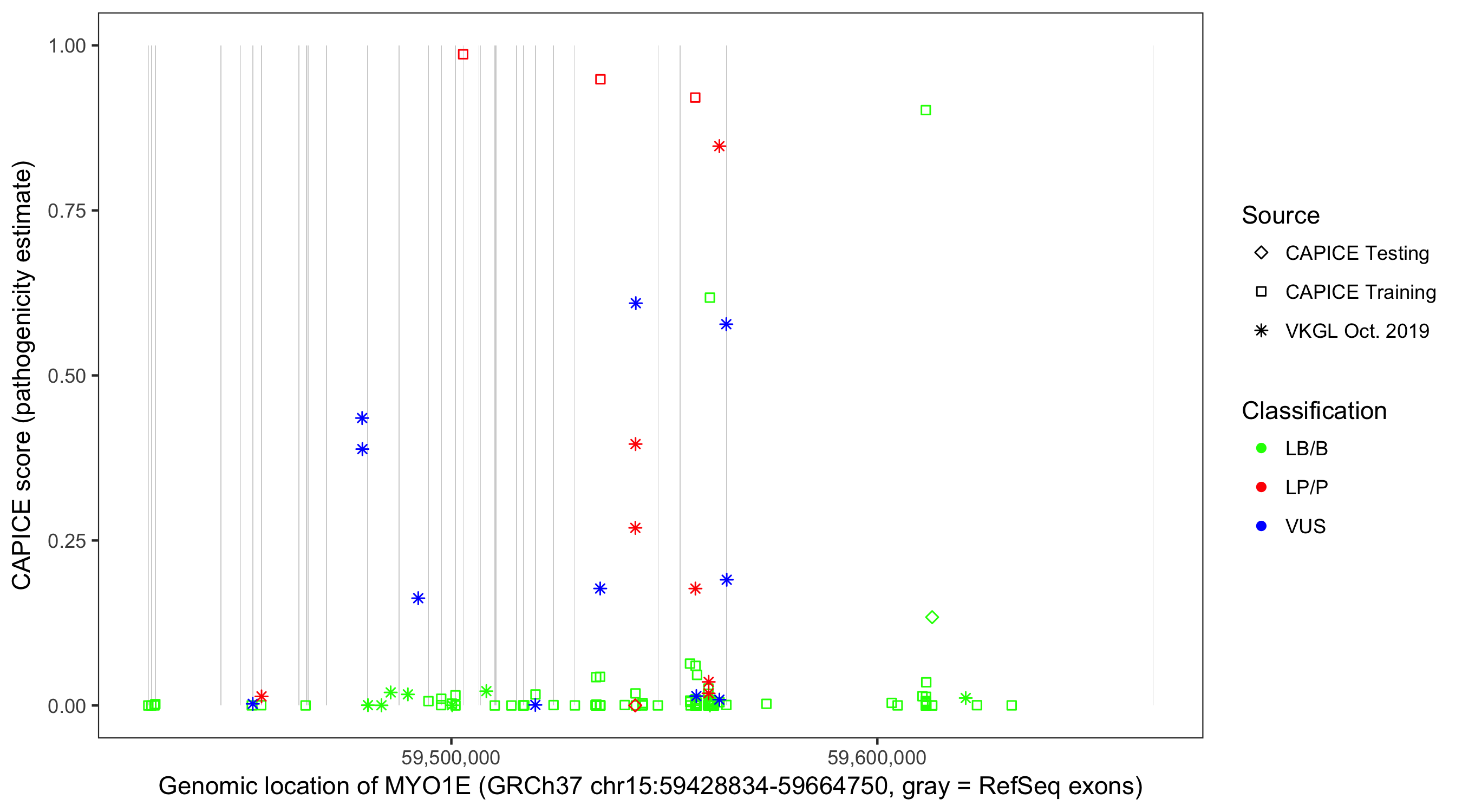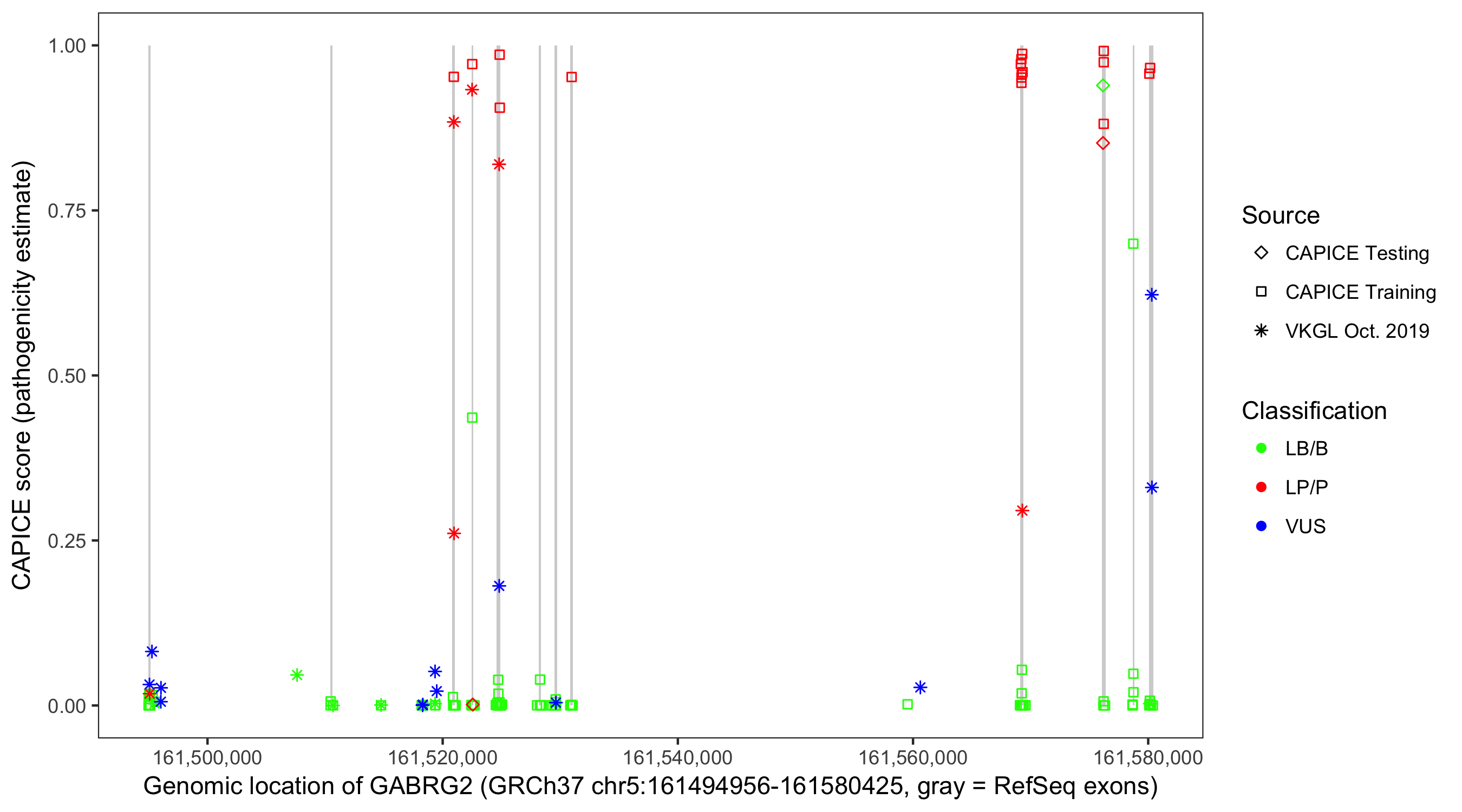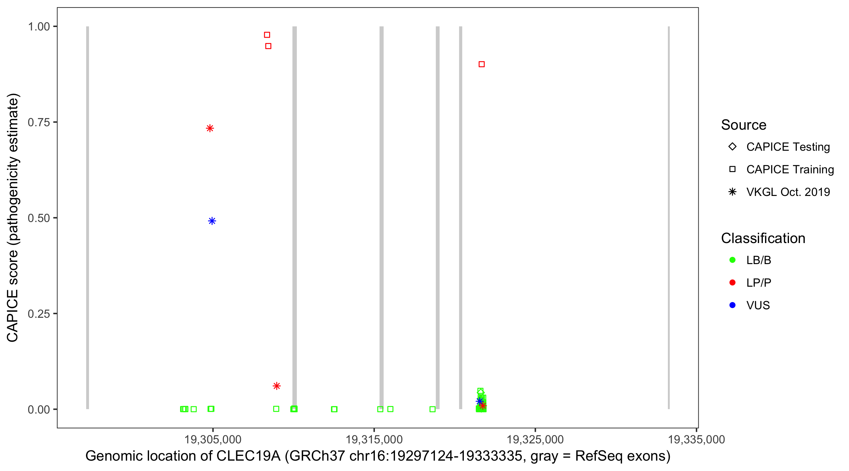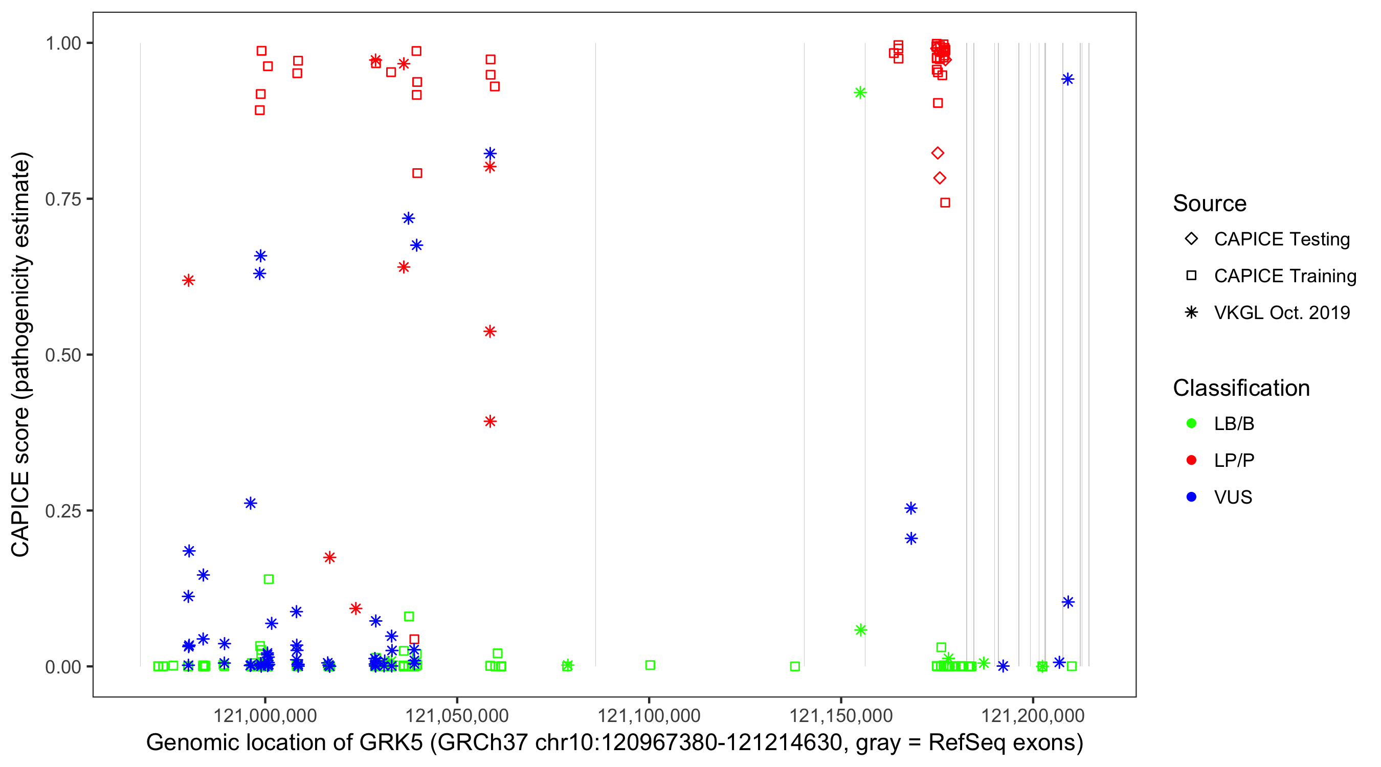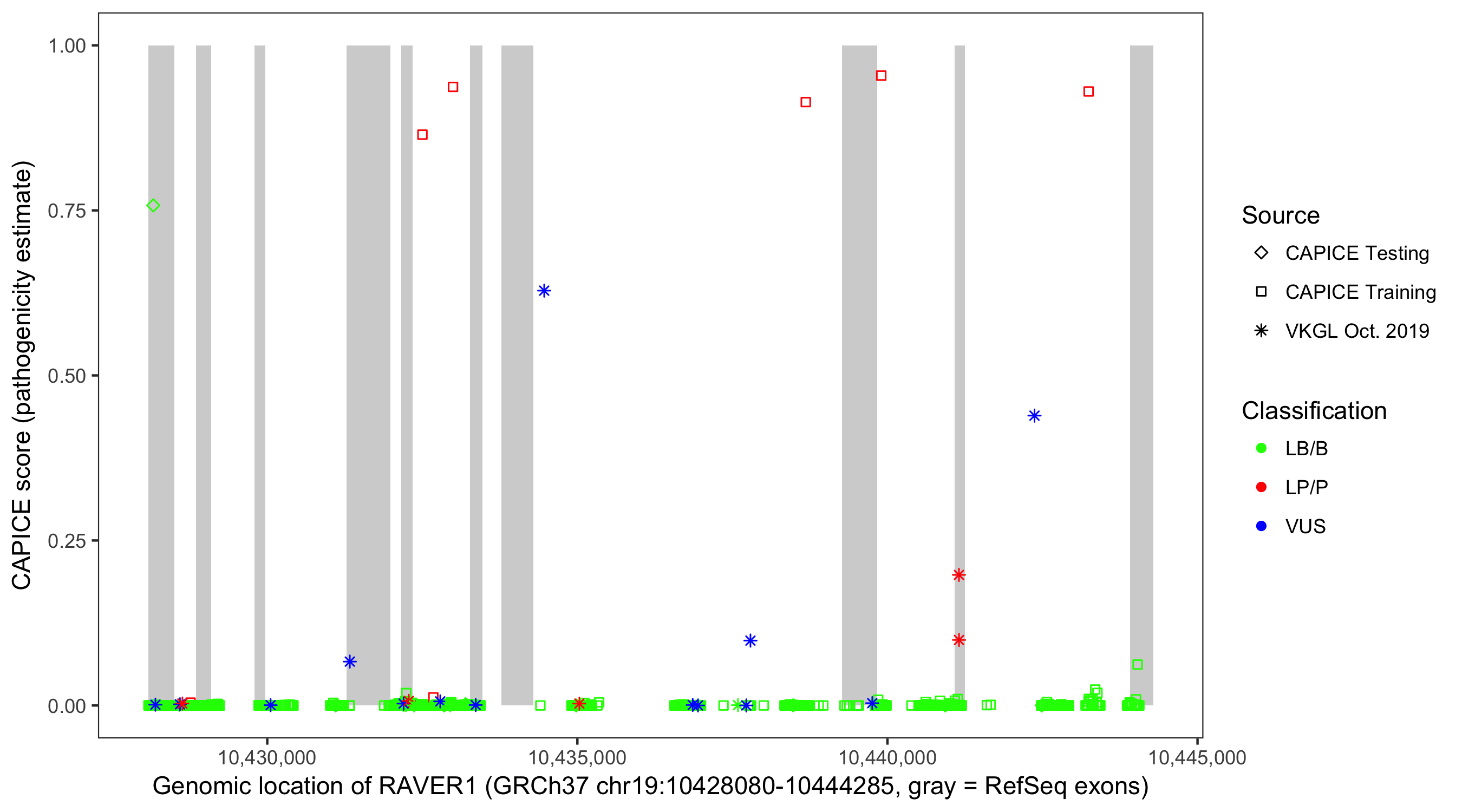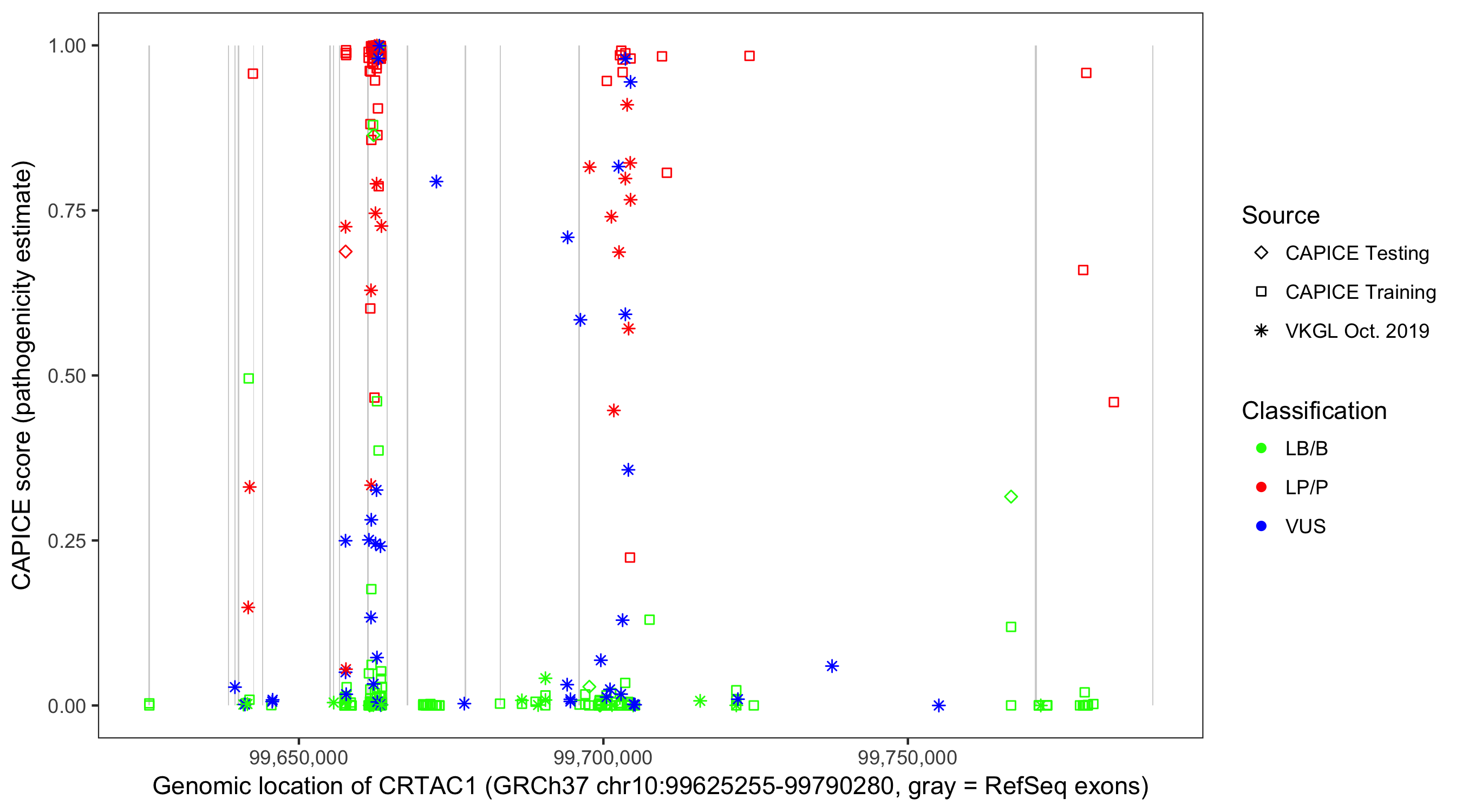 Shown are CAPICE train/test variants plus VKGL Oct 2019.