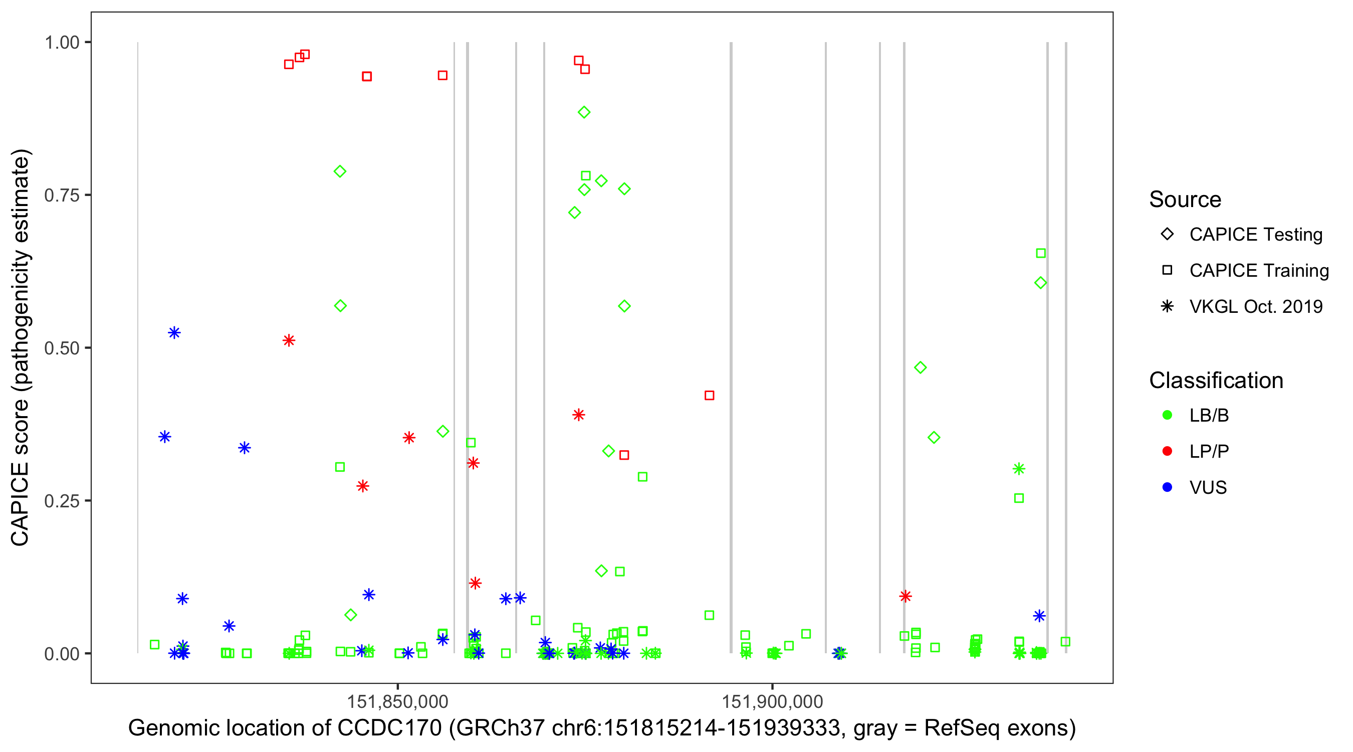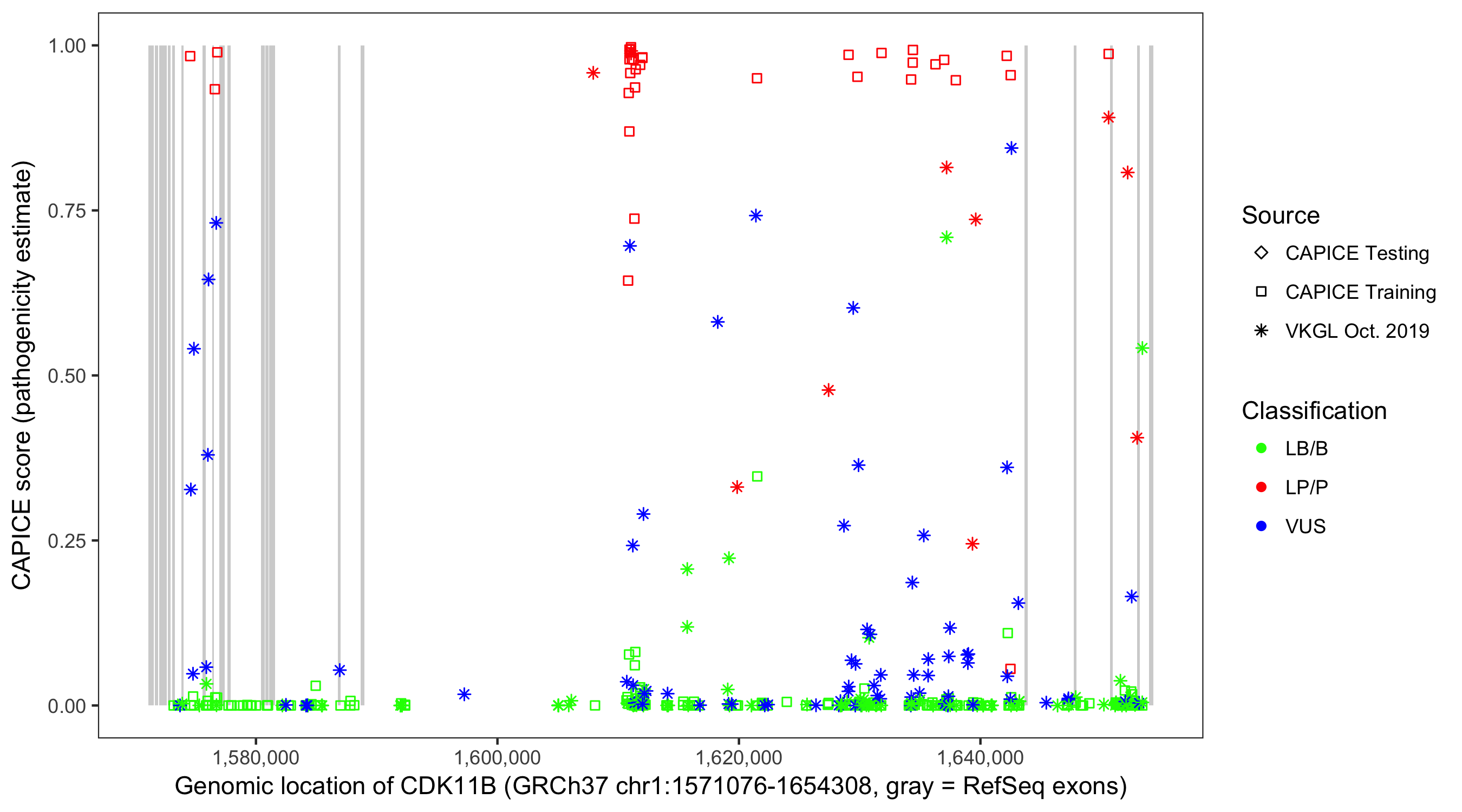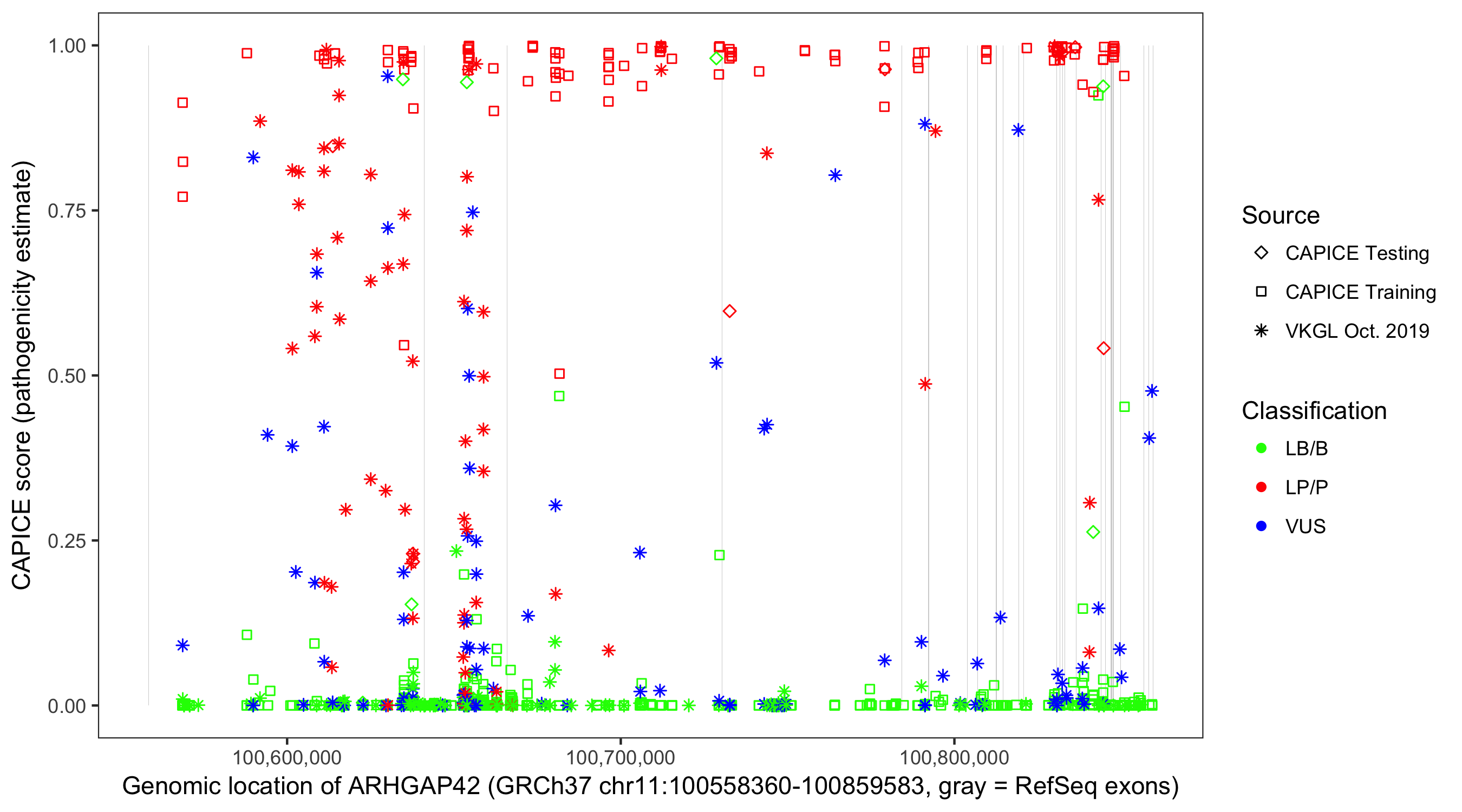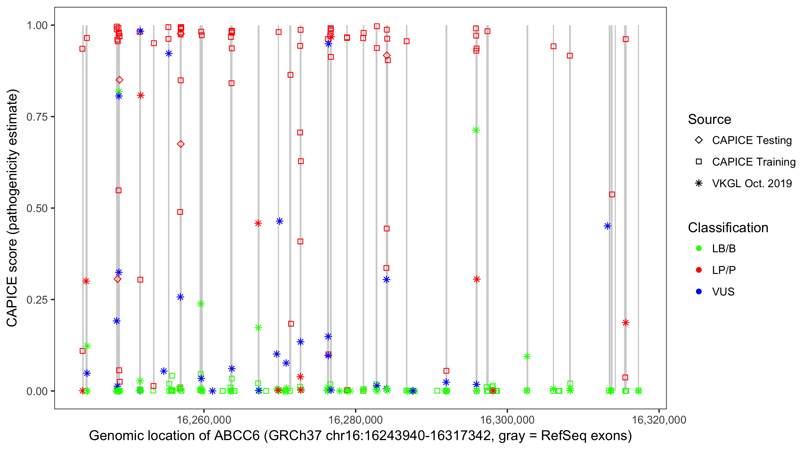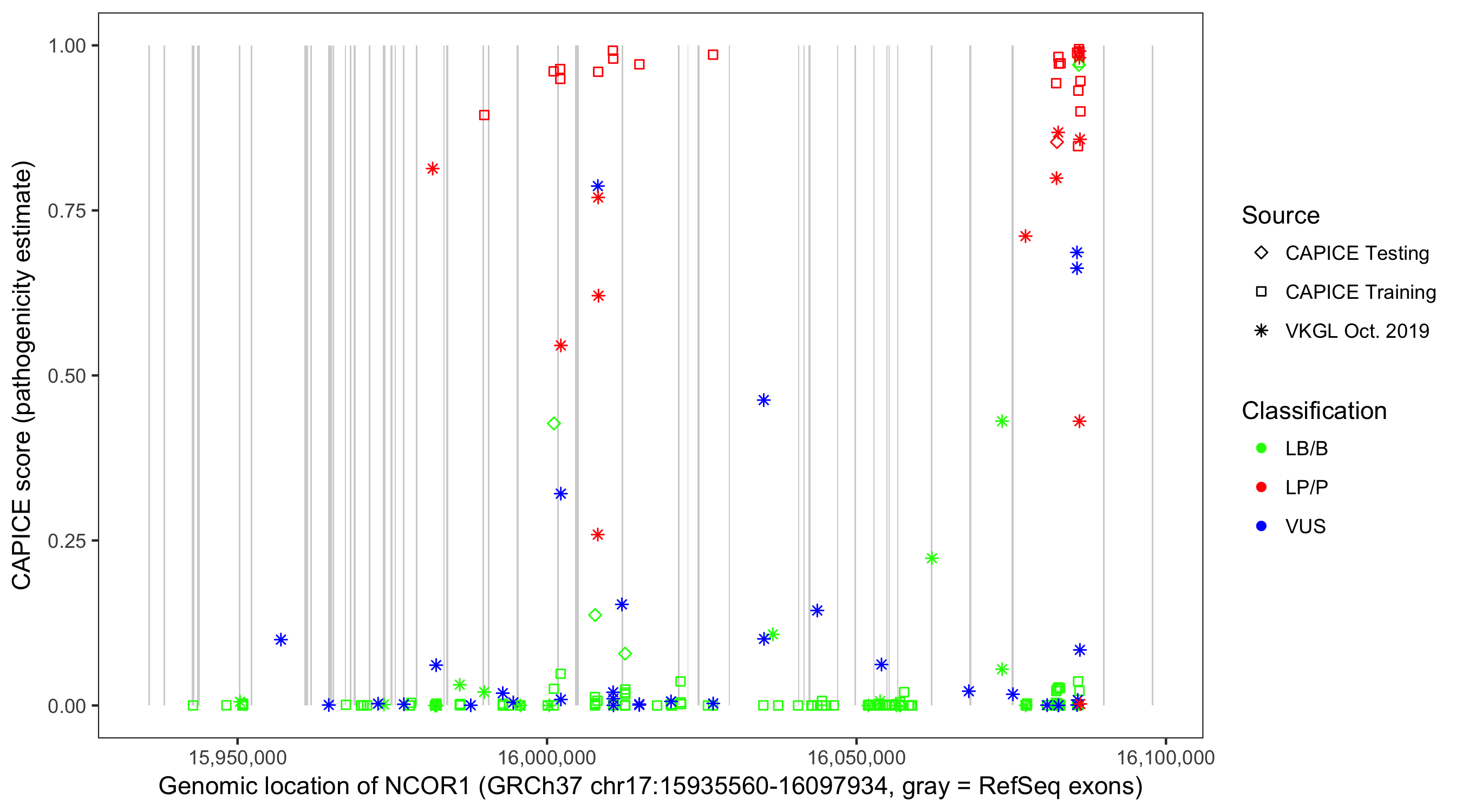 Shown are CAPICE train/test variants plus VKGL Oct 2019.