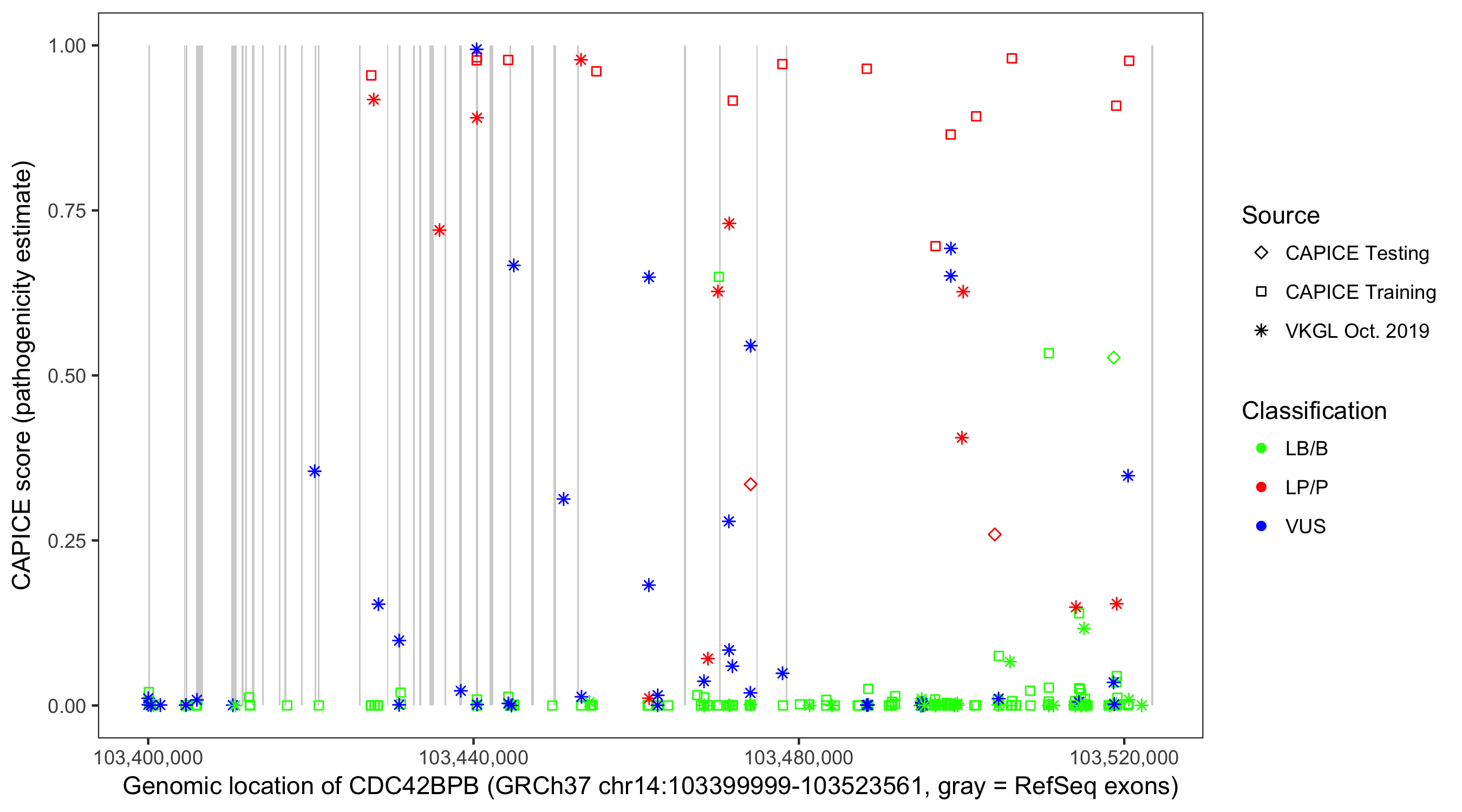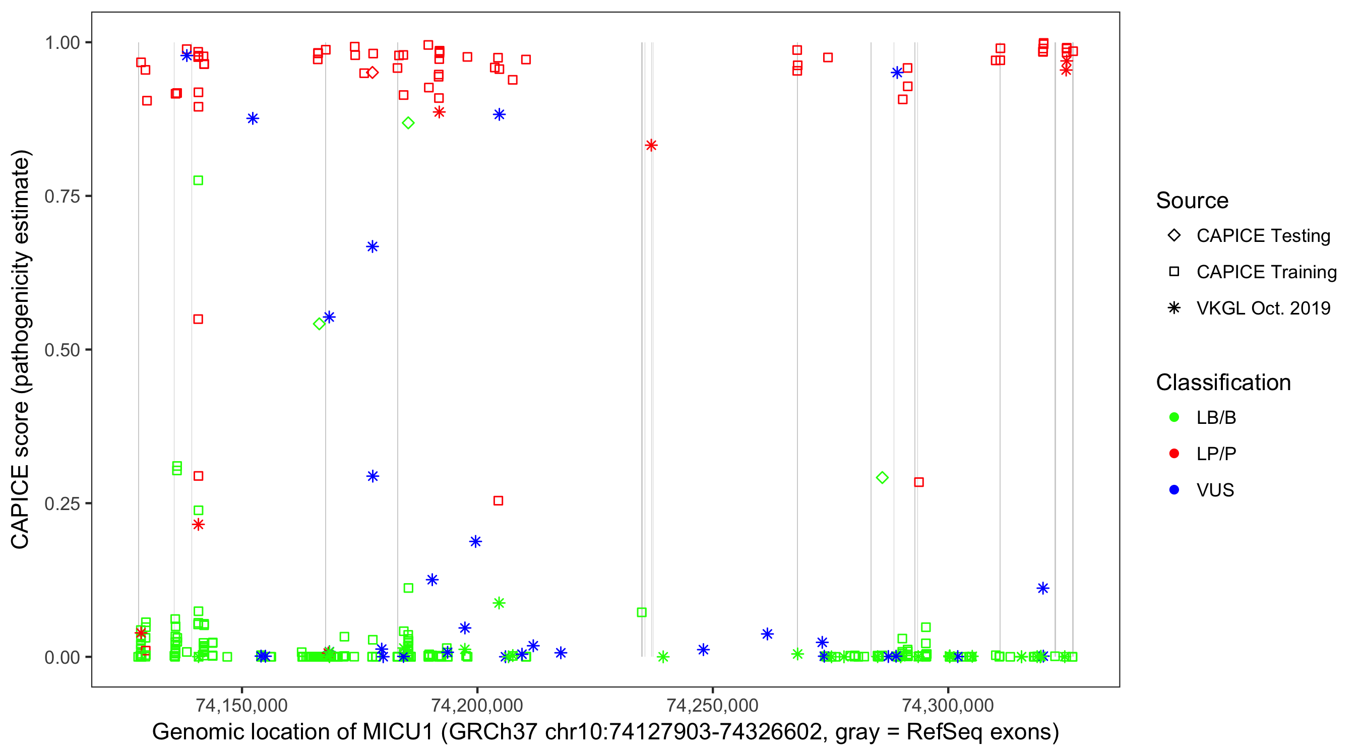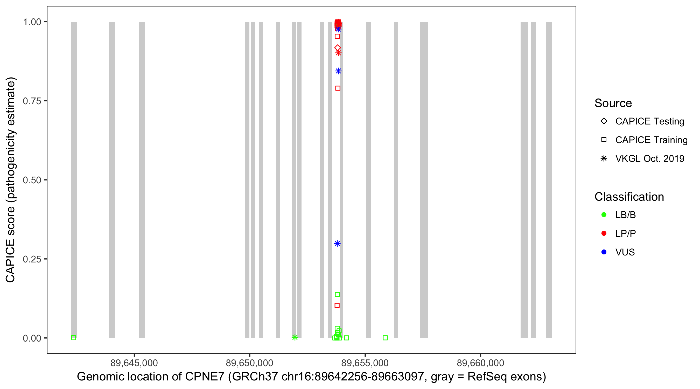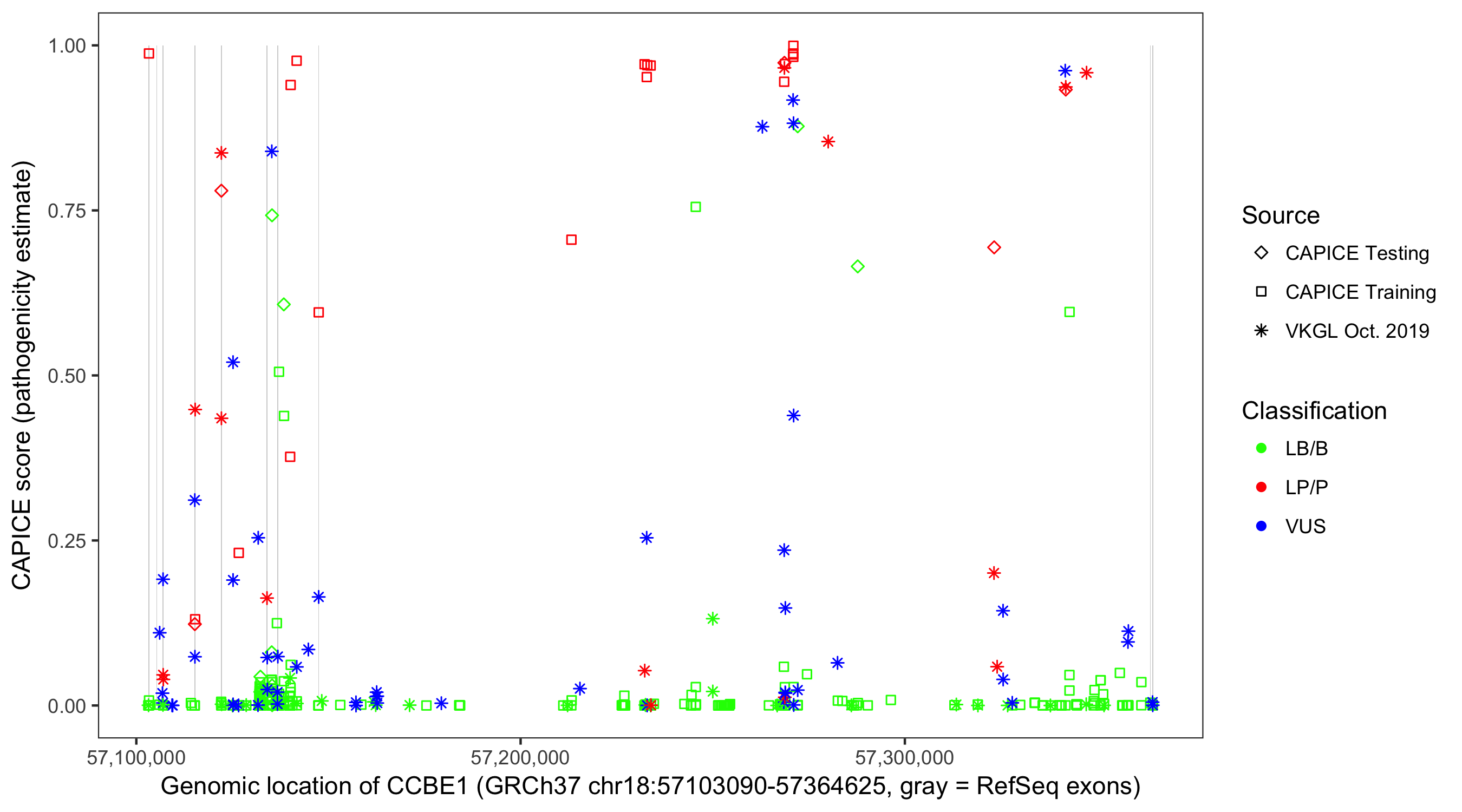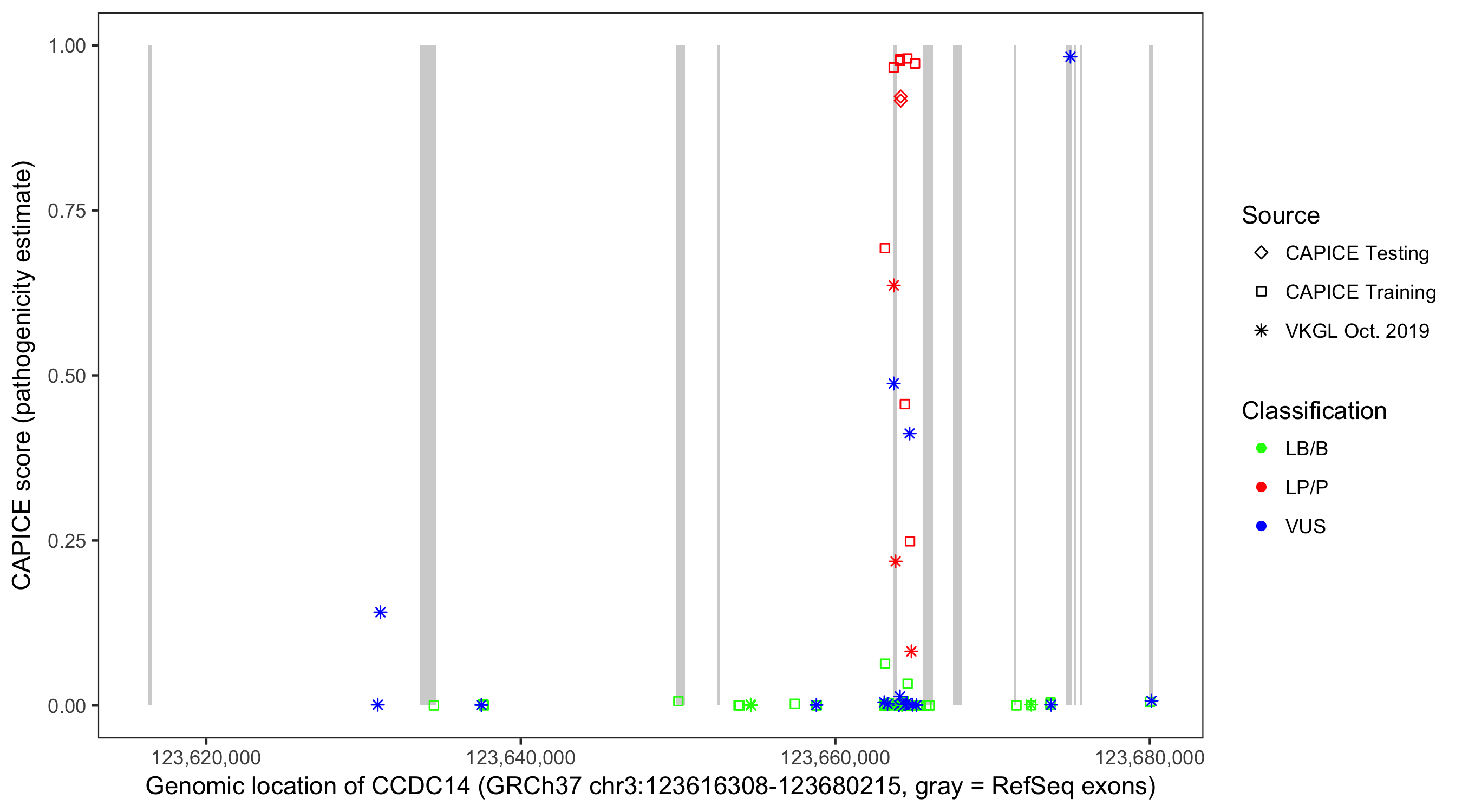 Shown are CAPICE train/test variants plus VKGL Oct 2019.