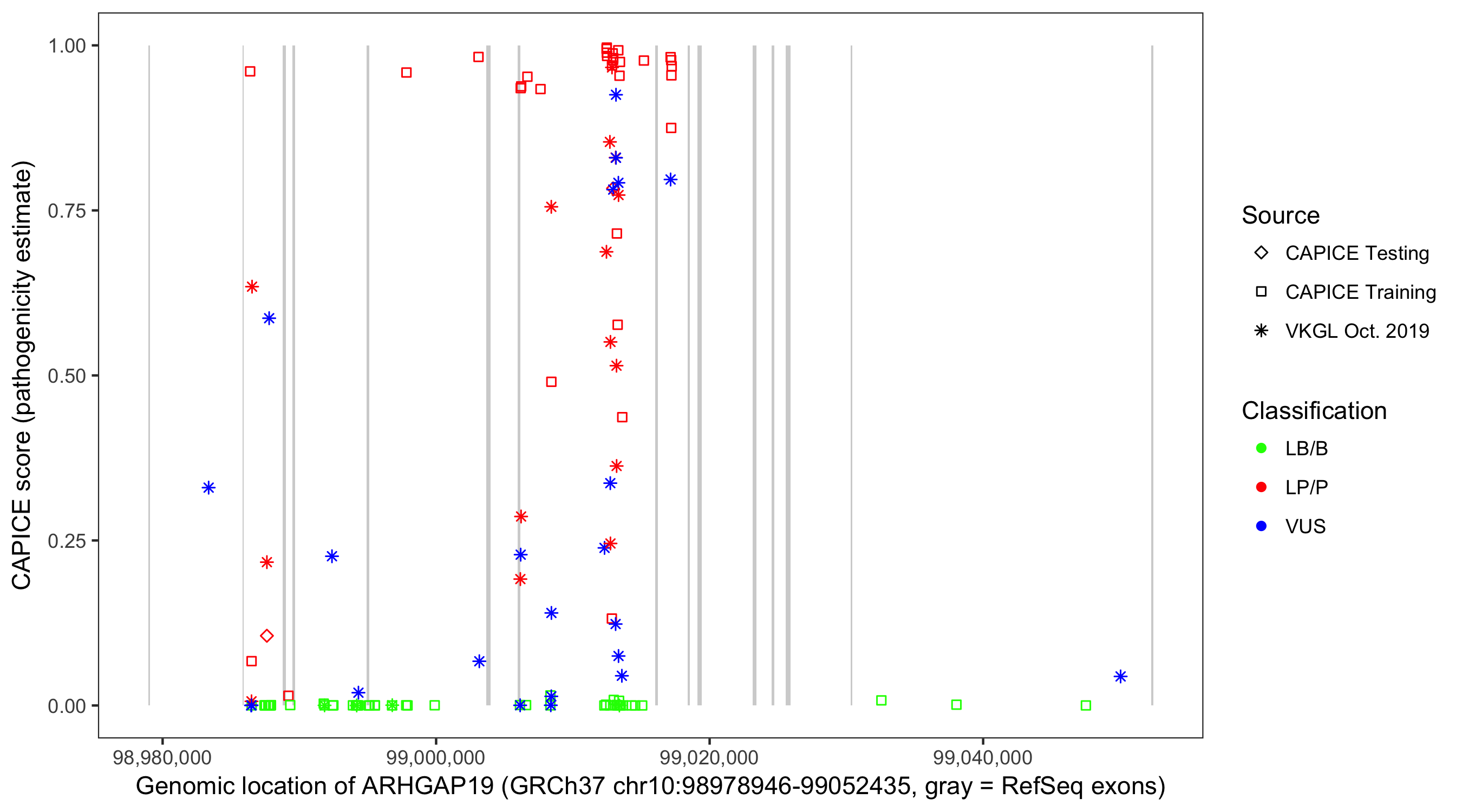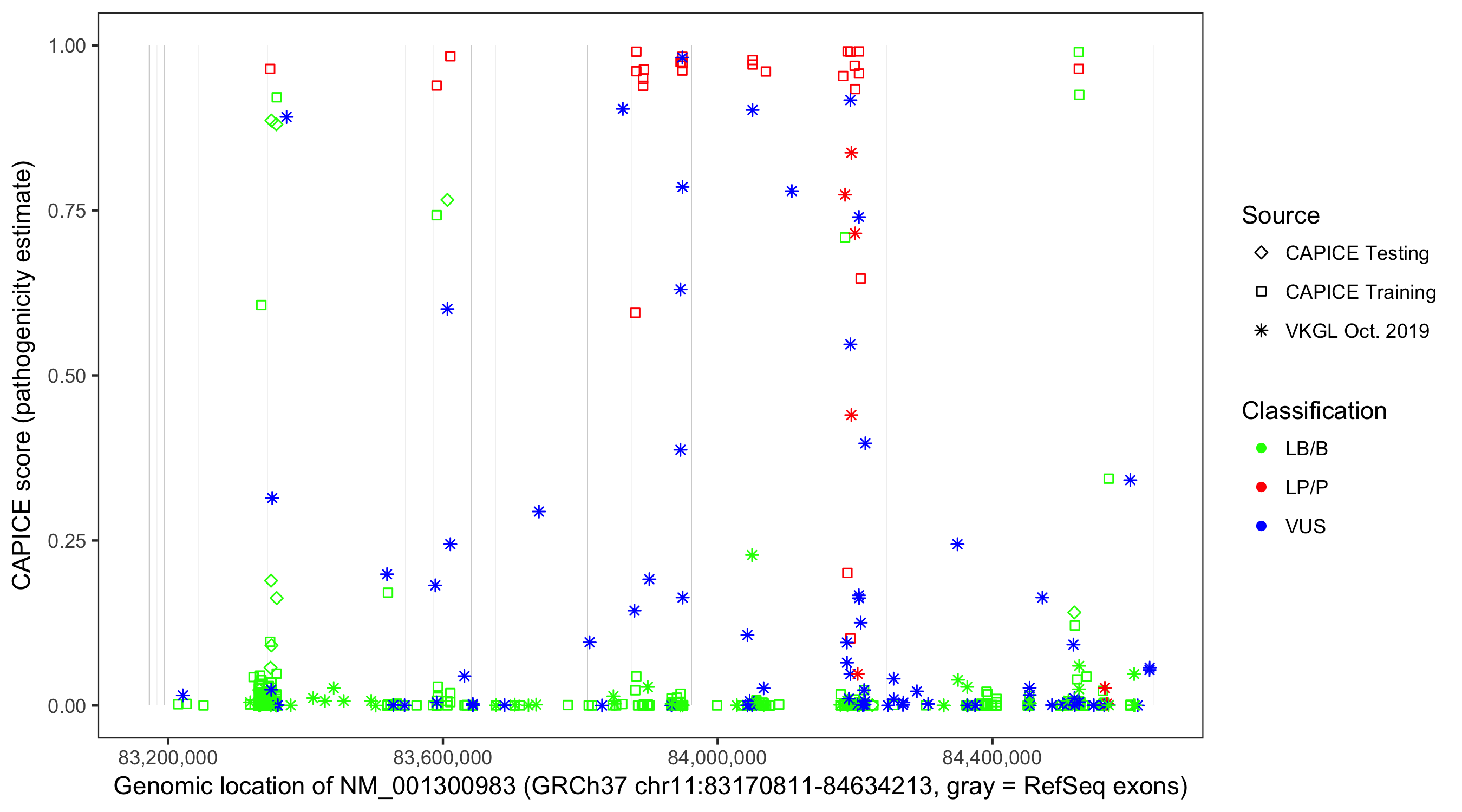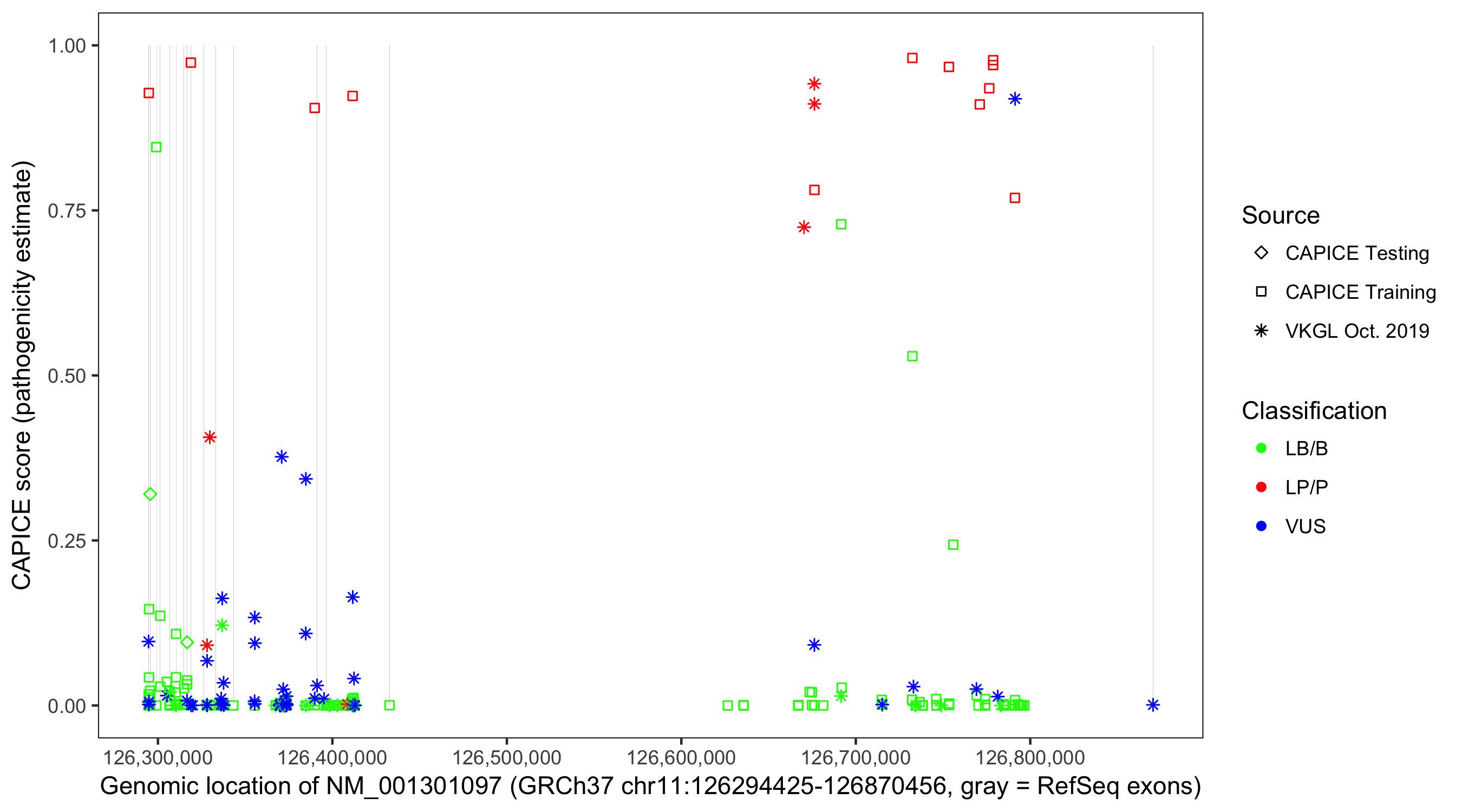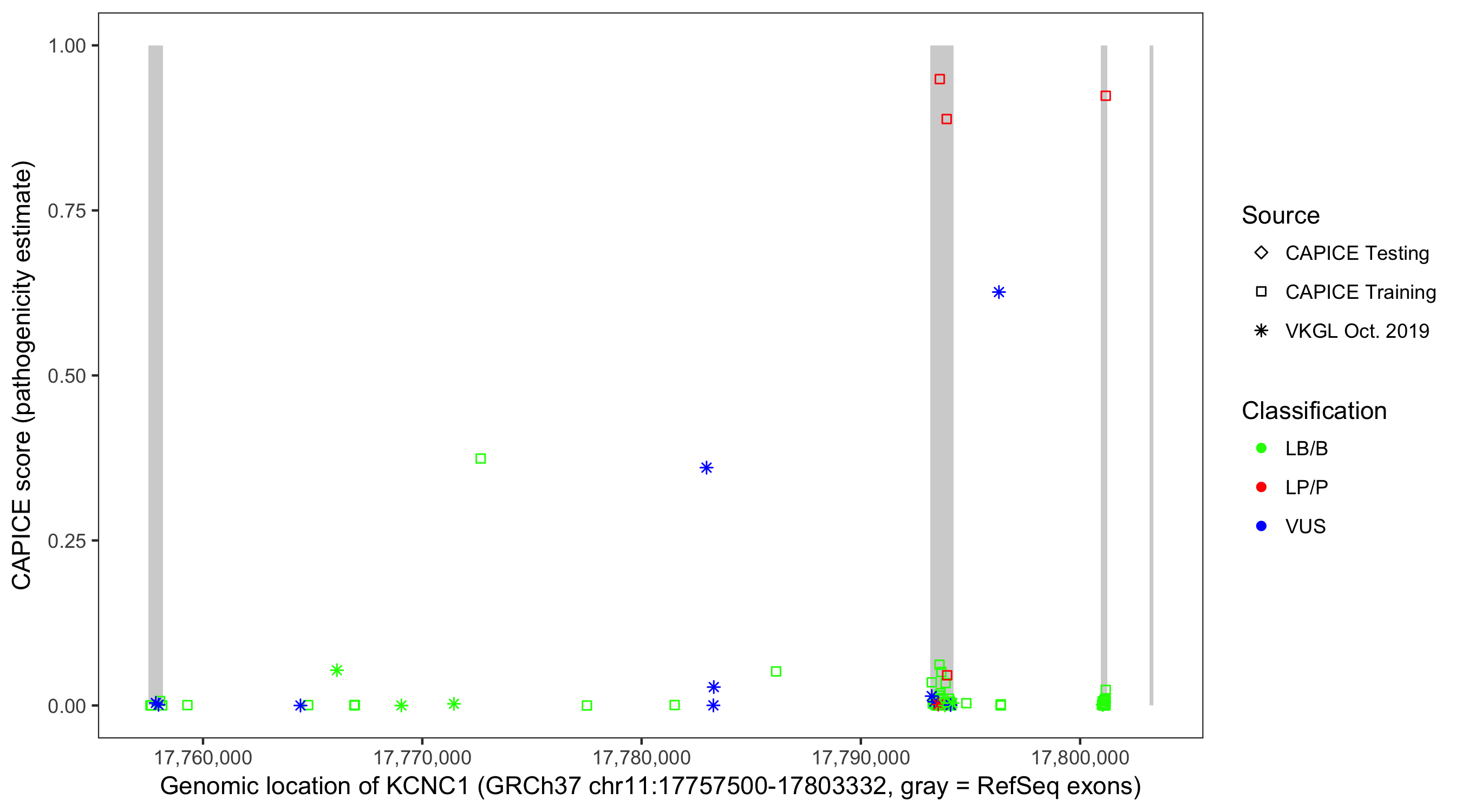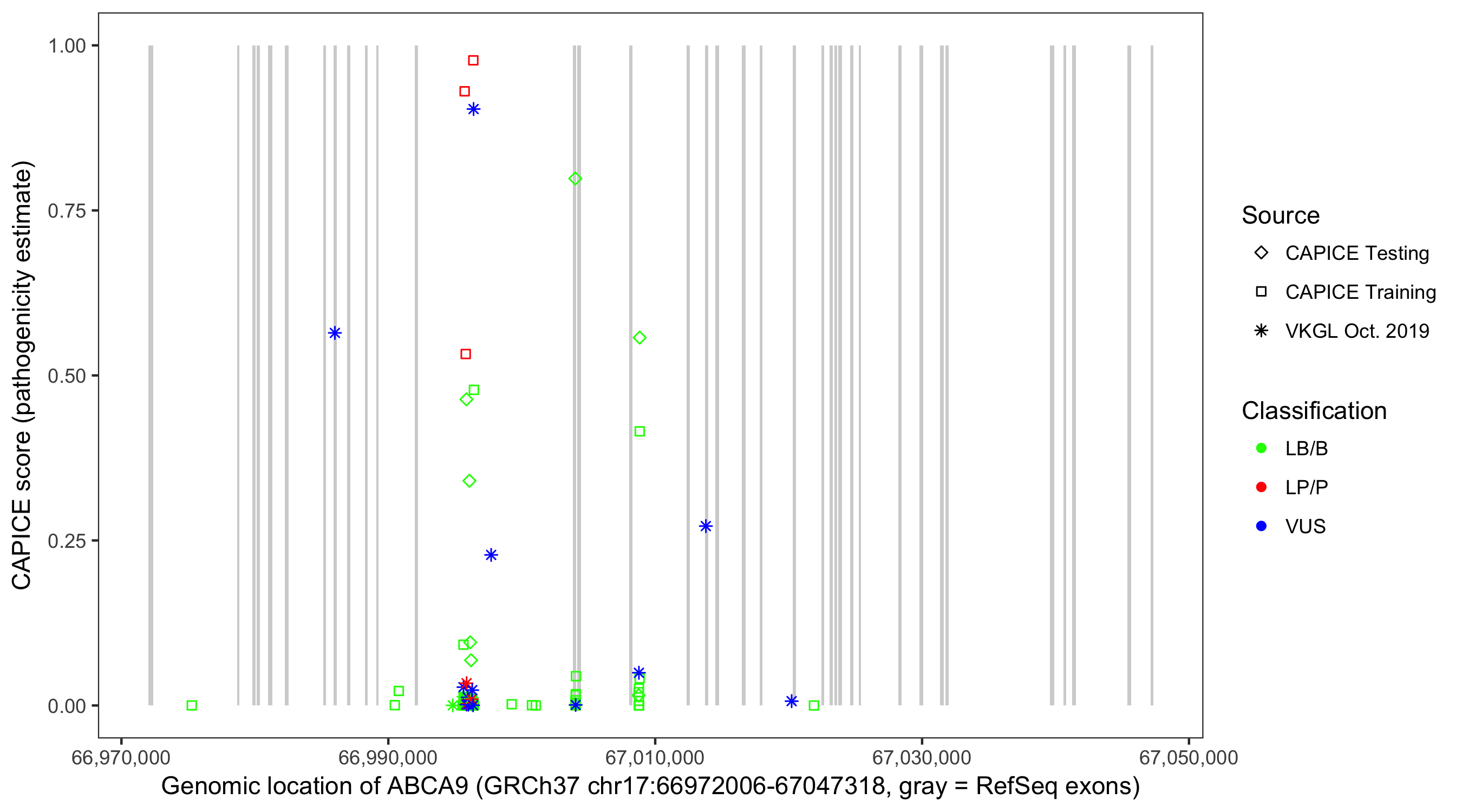 Shown are CAPICE train/test variants plus VKGL Oct 2019.