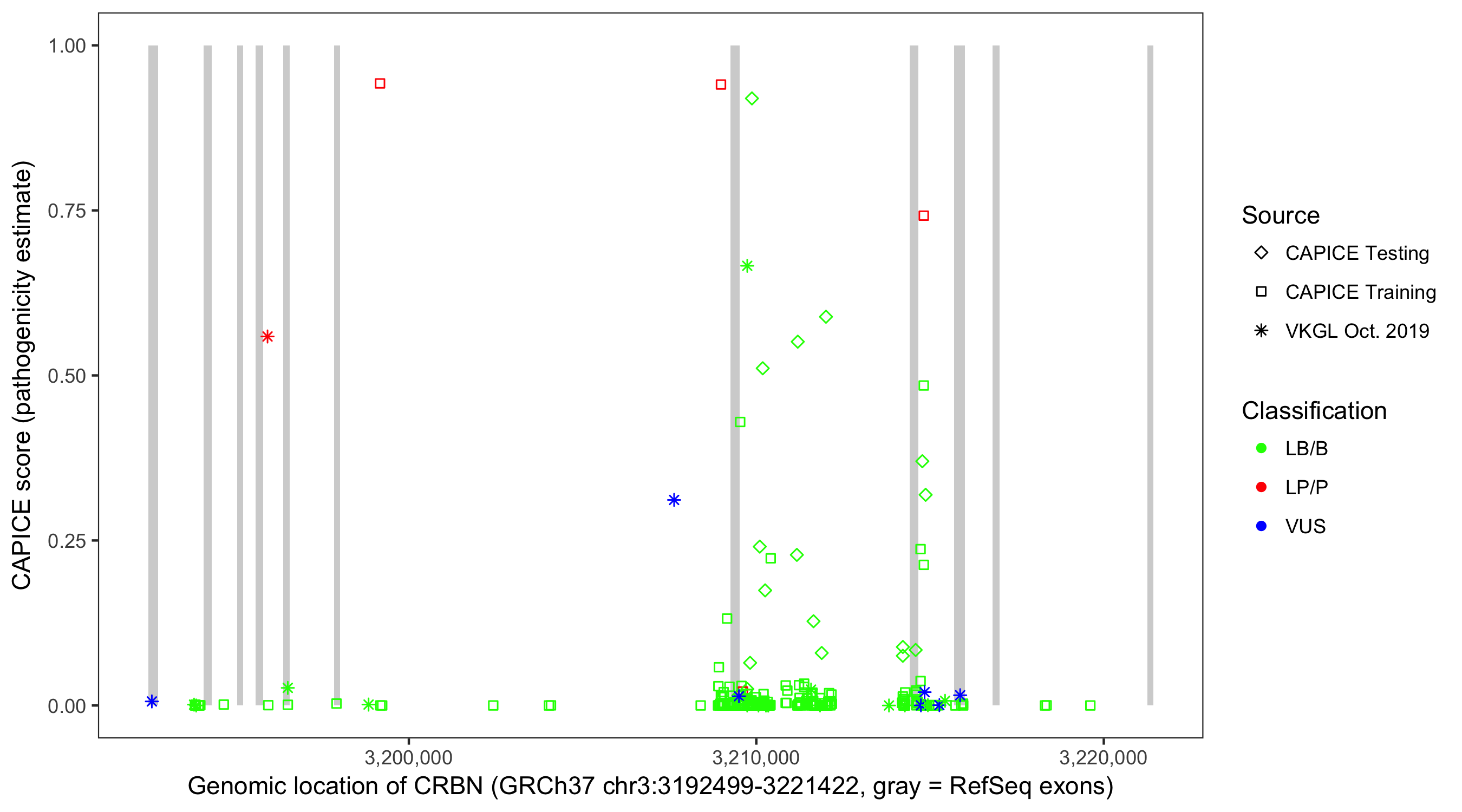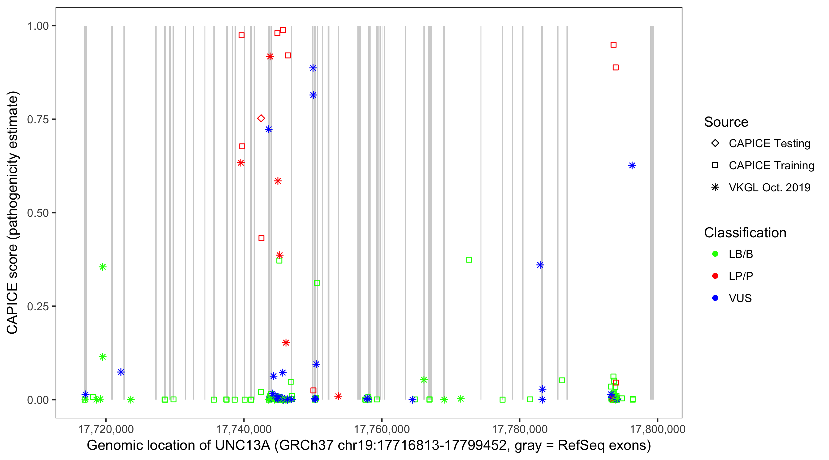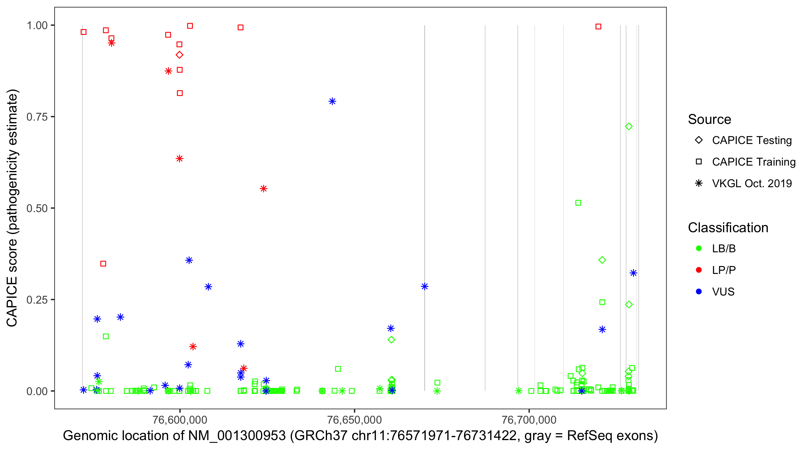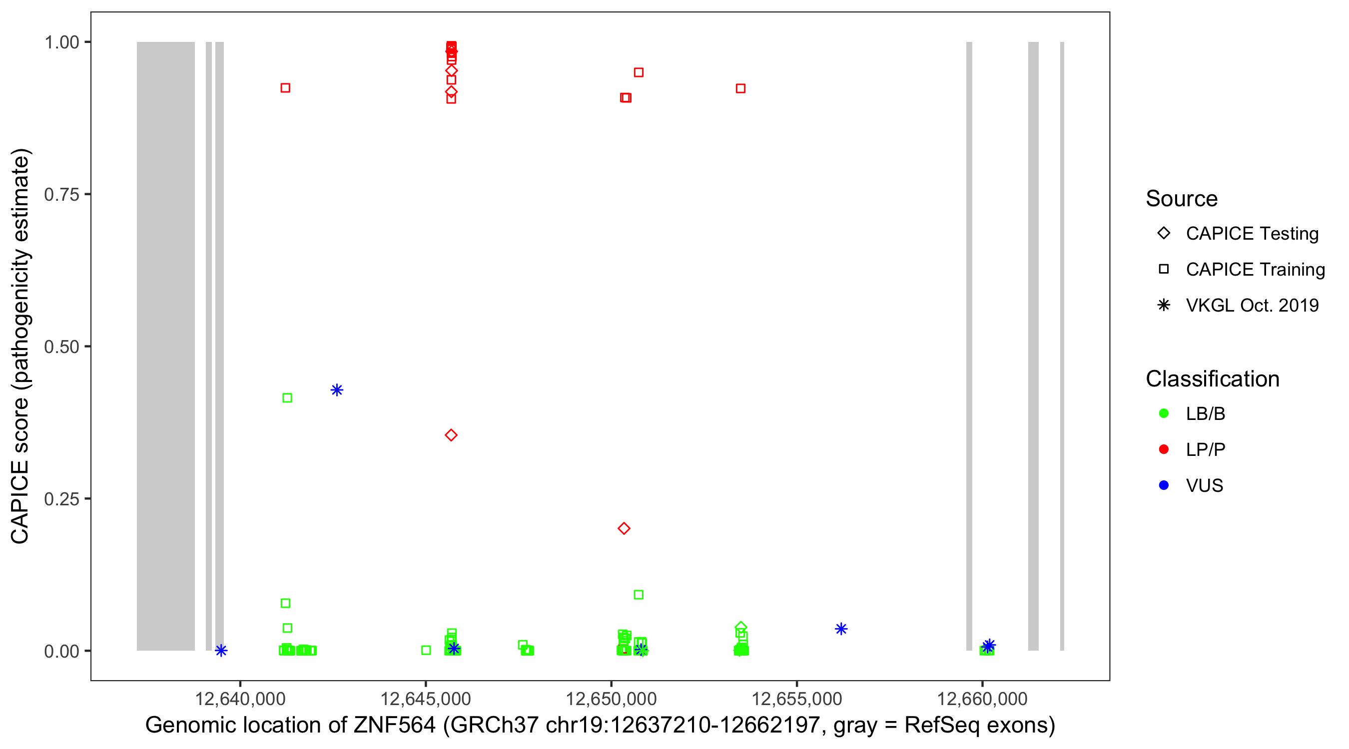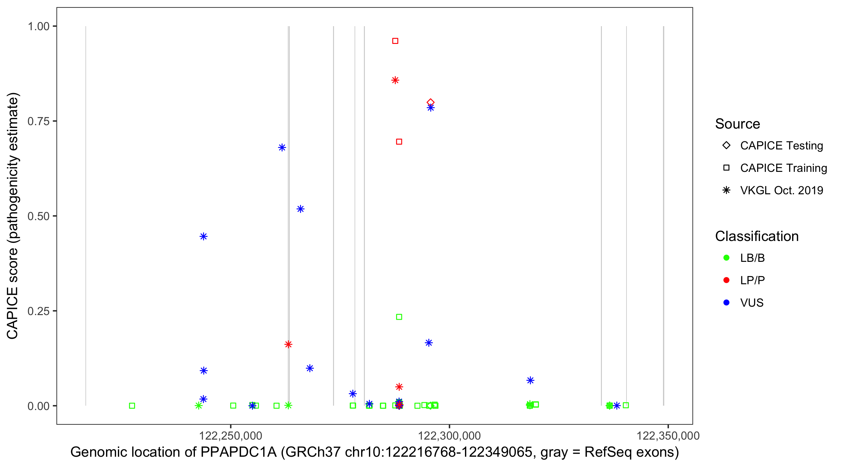 Shown are CAPICE train/test variants plus VKGL Oct 2019.