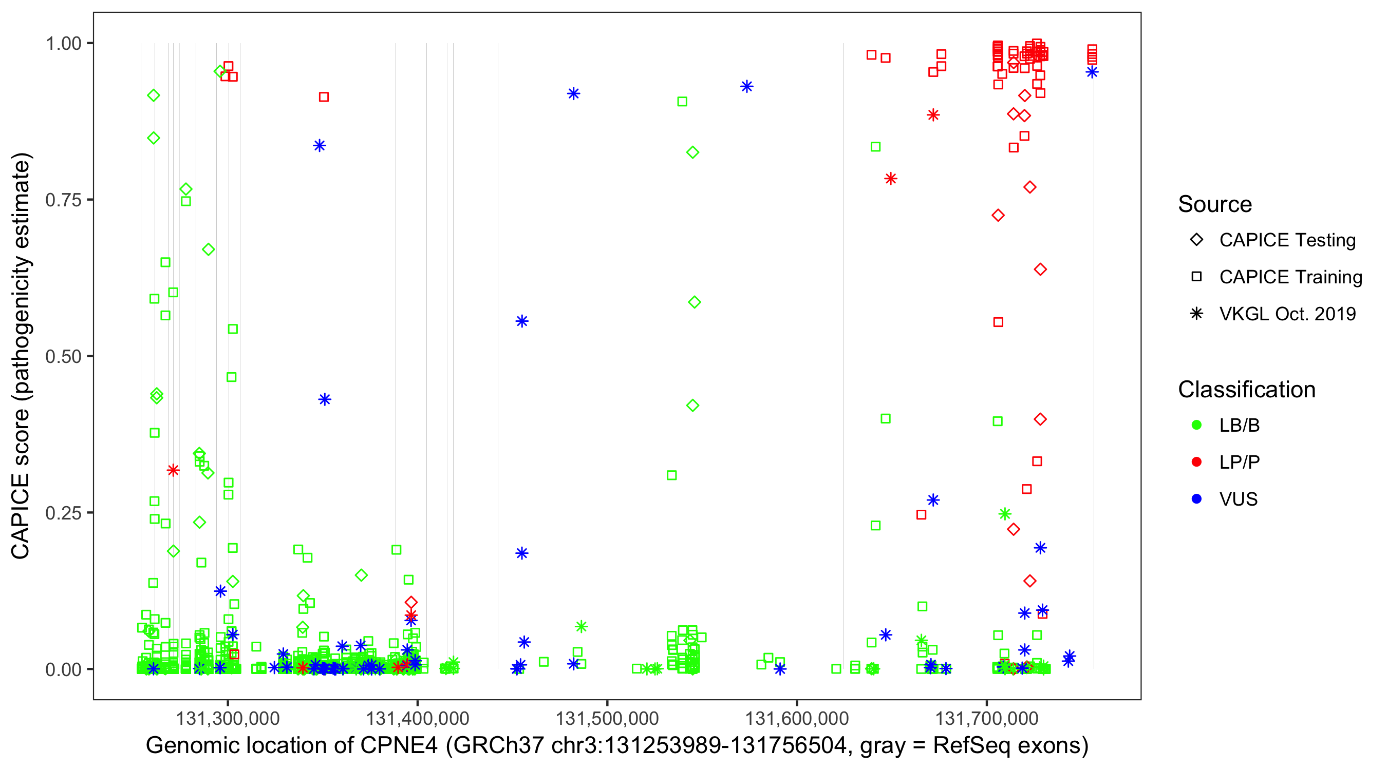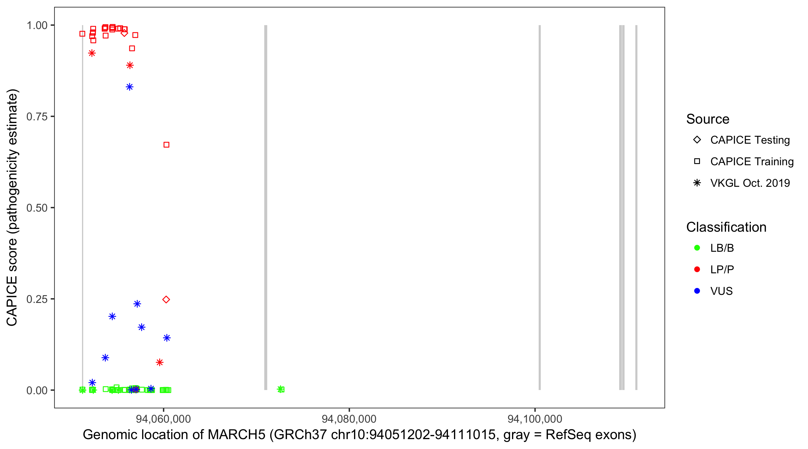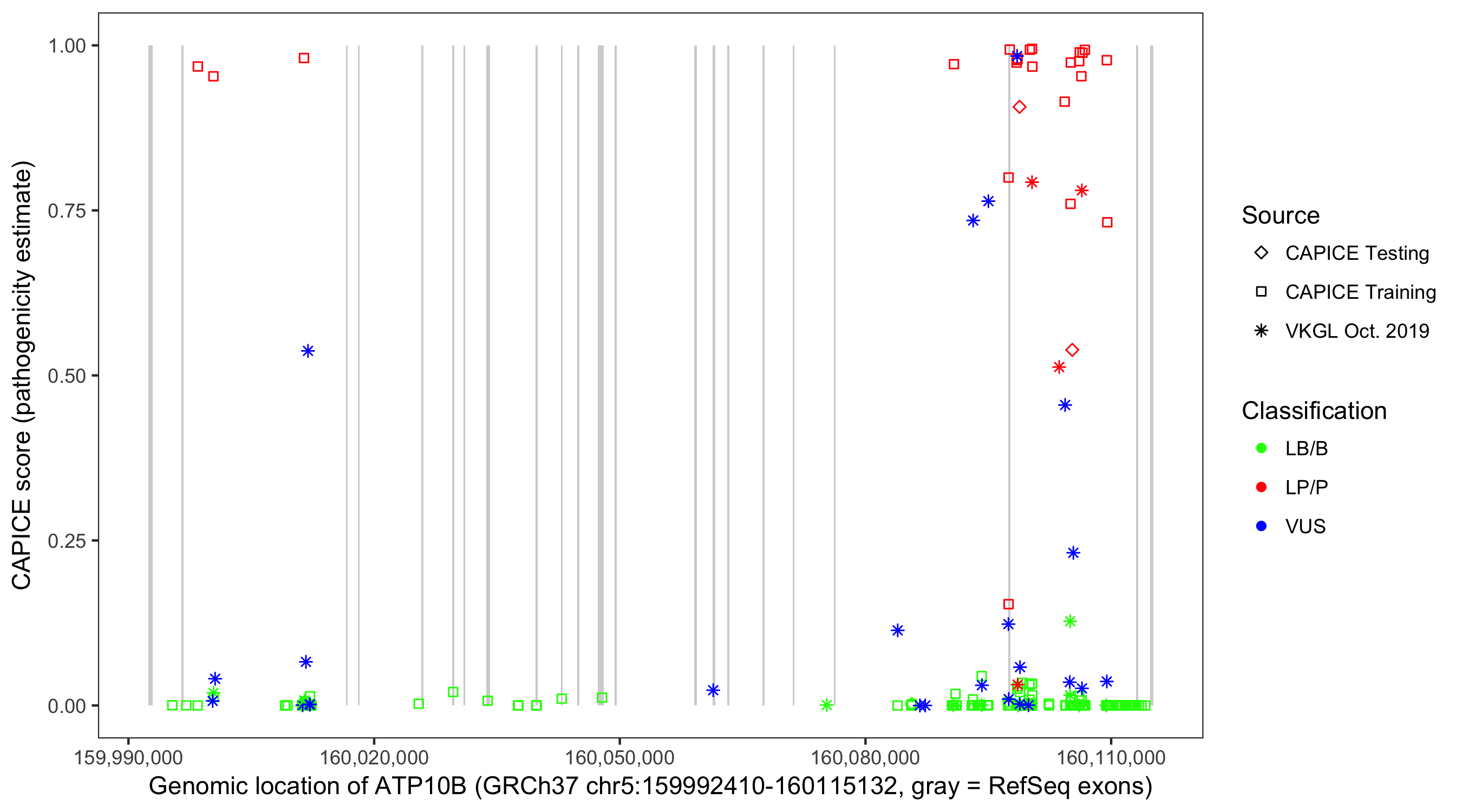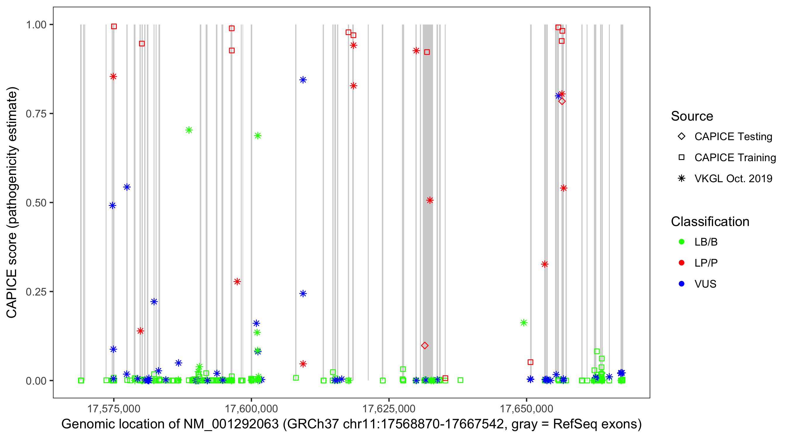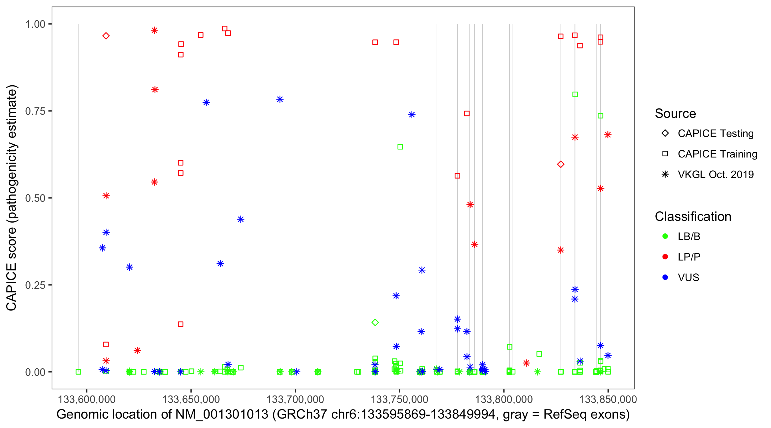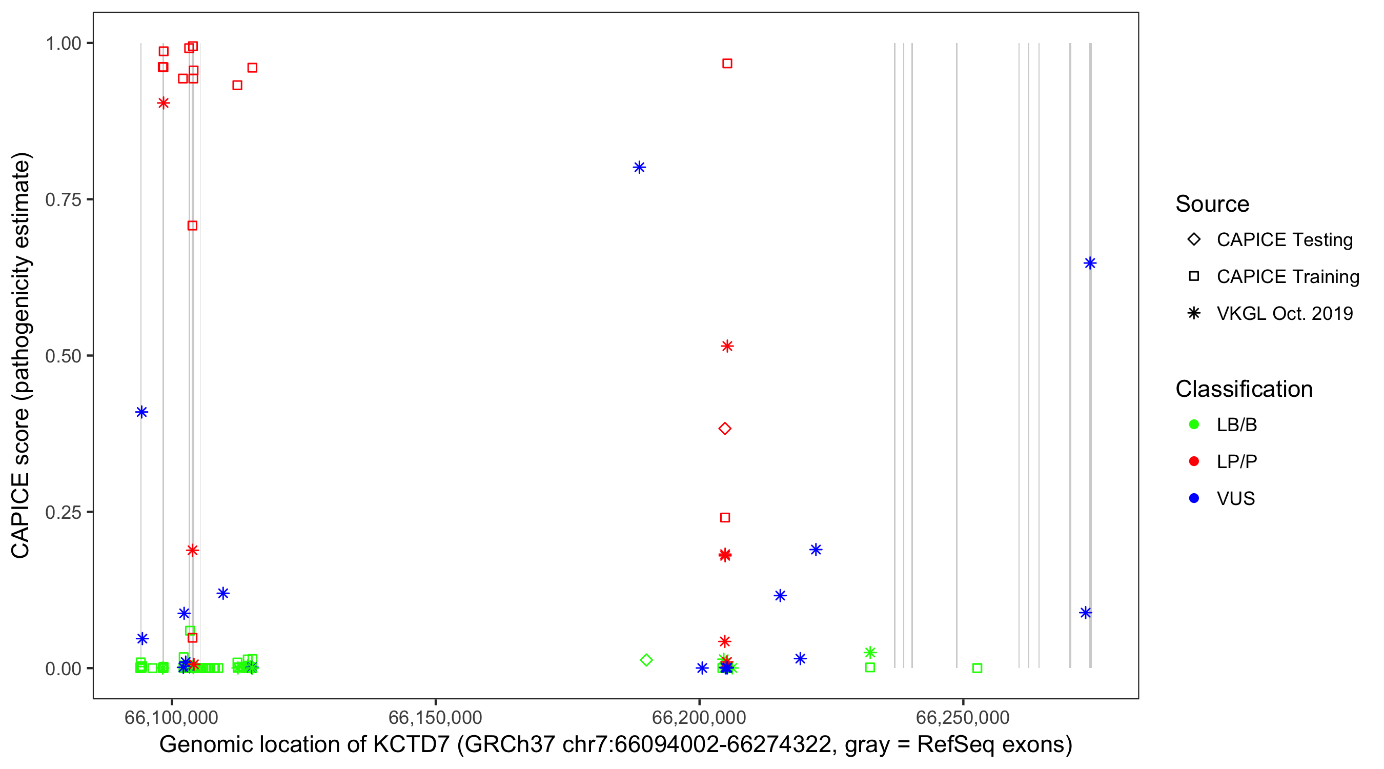 Shown are CAPICE train/test variants plus VKGL Oct 2019.