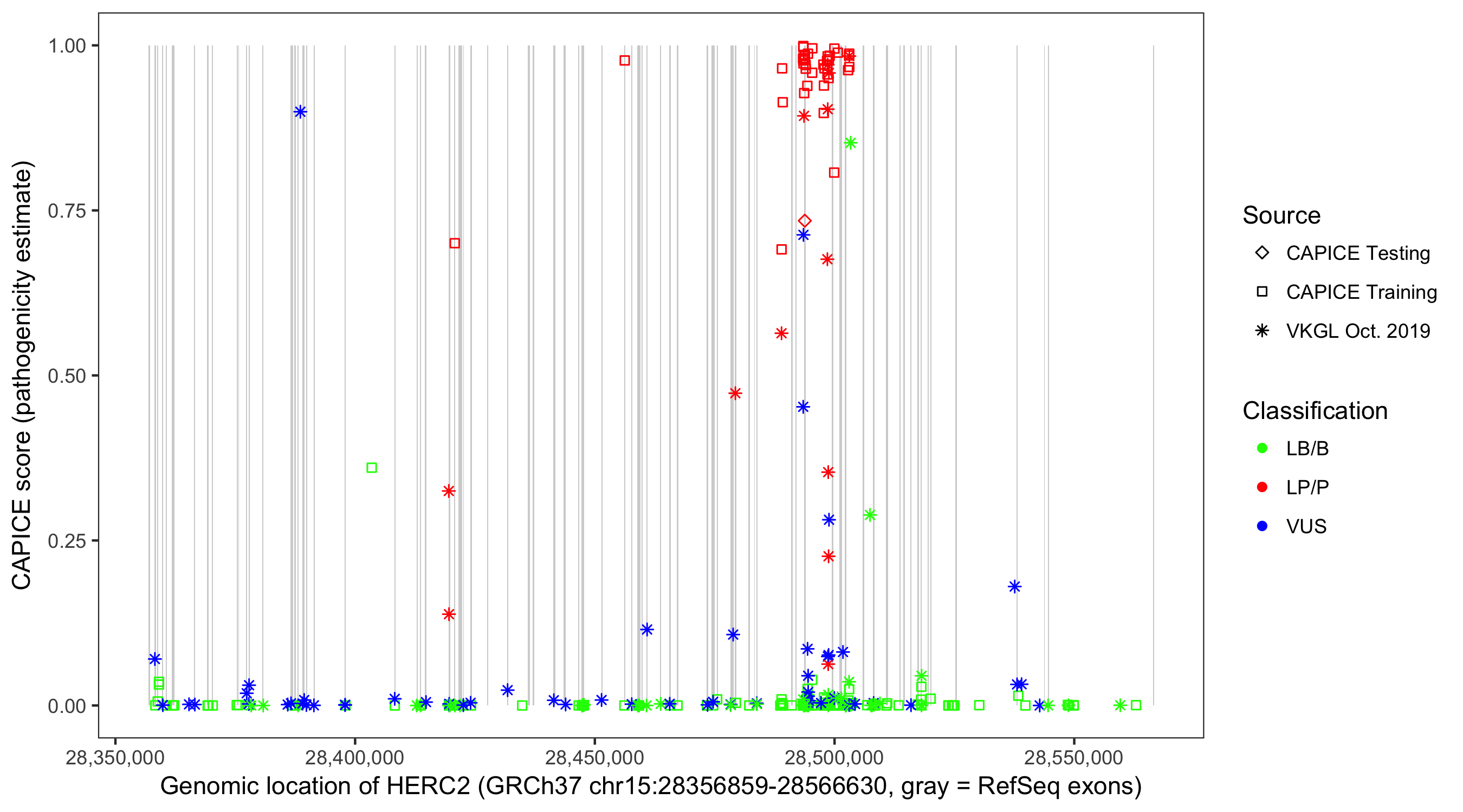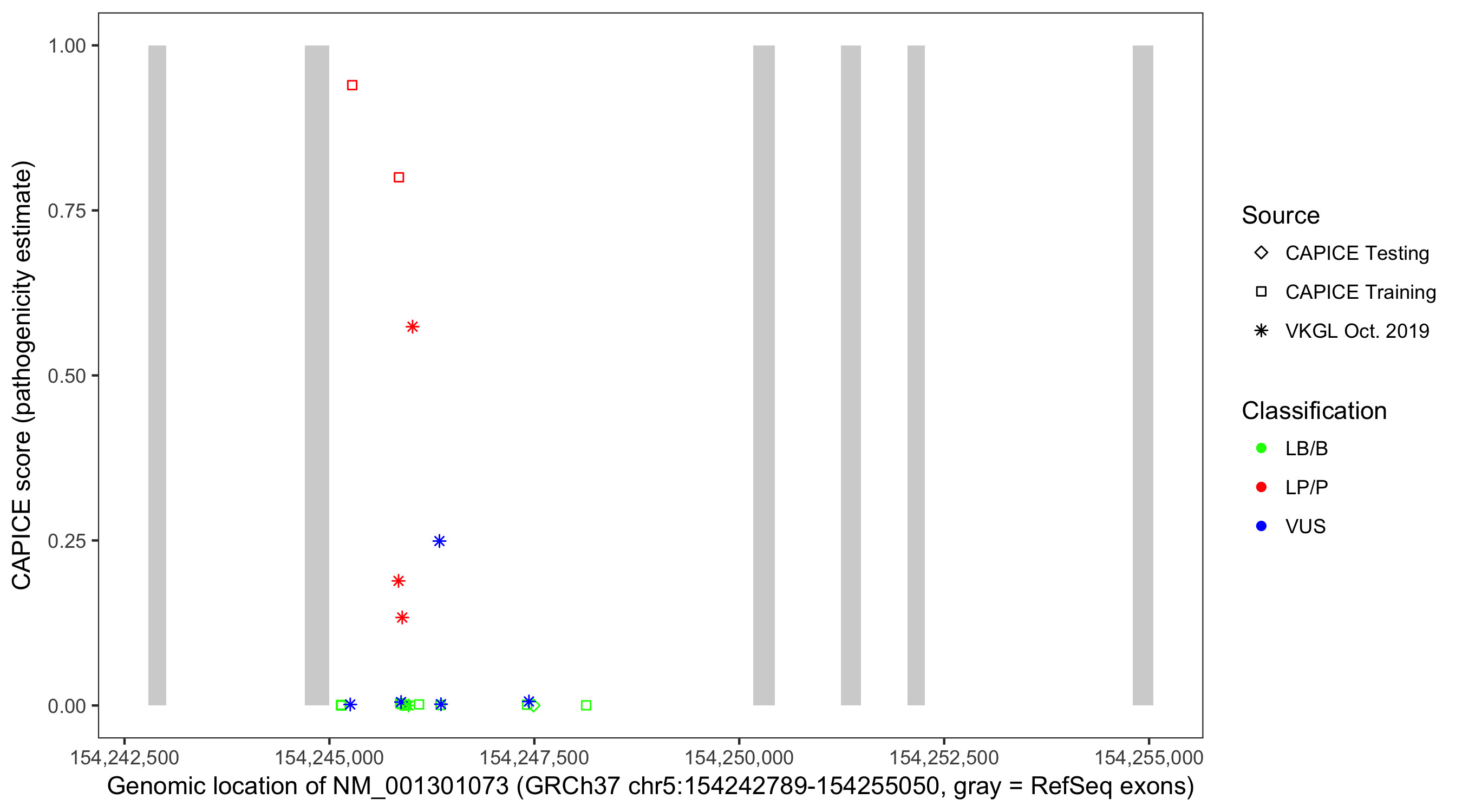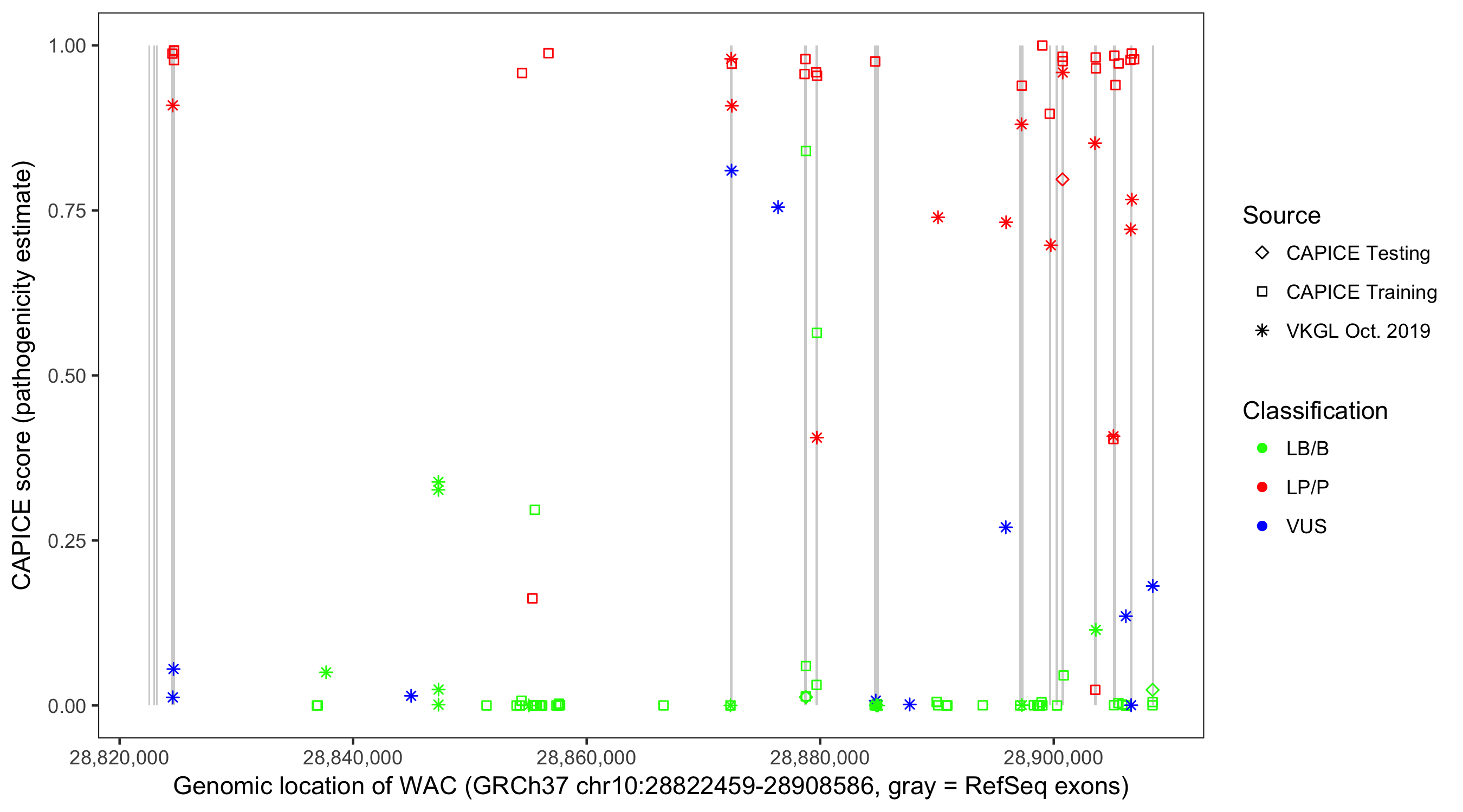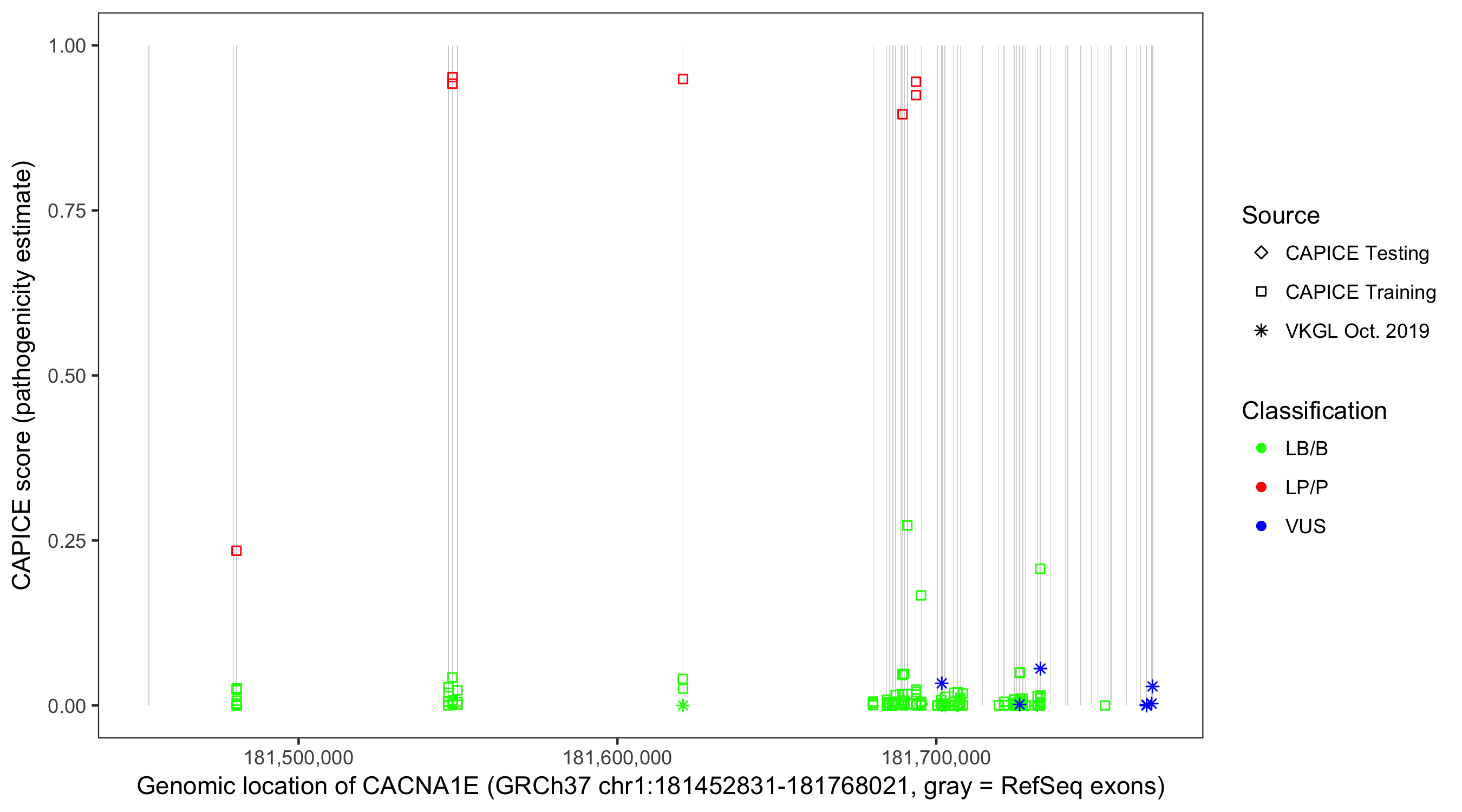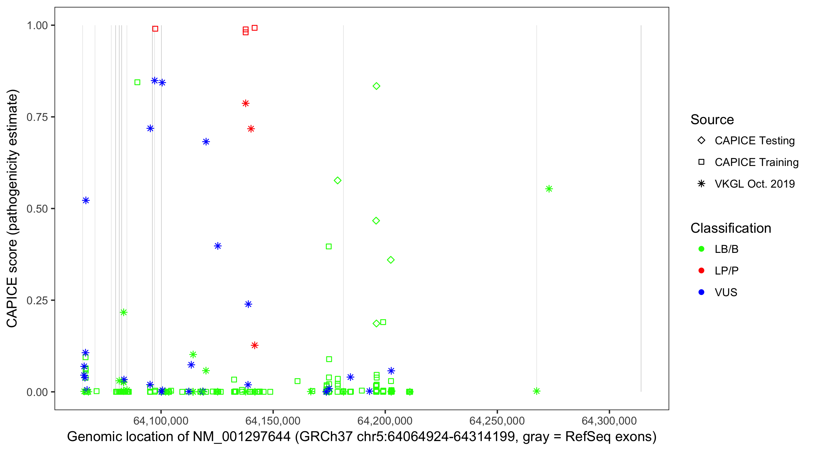 Shown are CAPICE train/test variants plus VKGL Oct 2019.