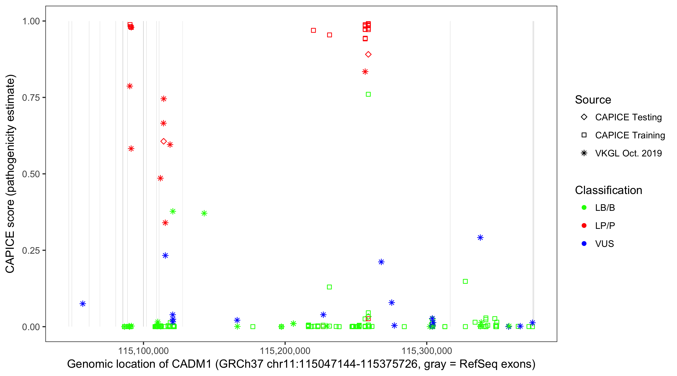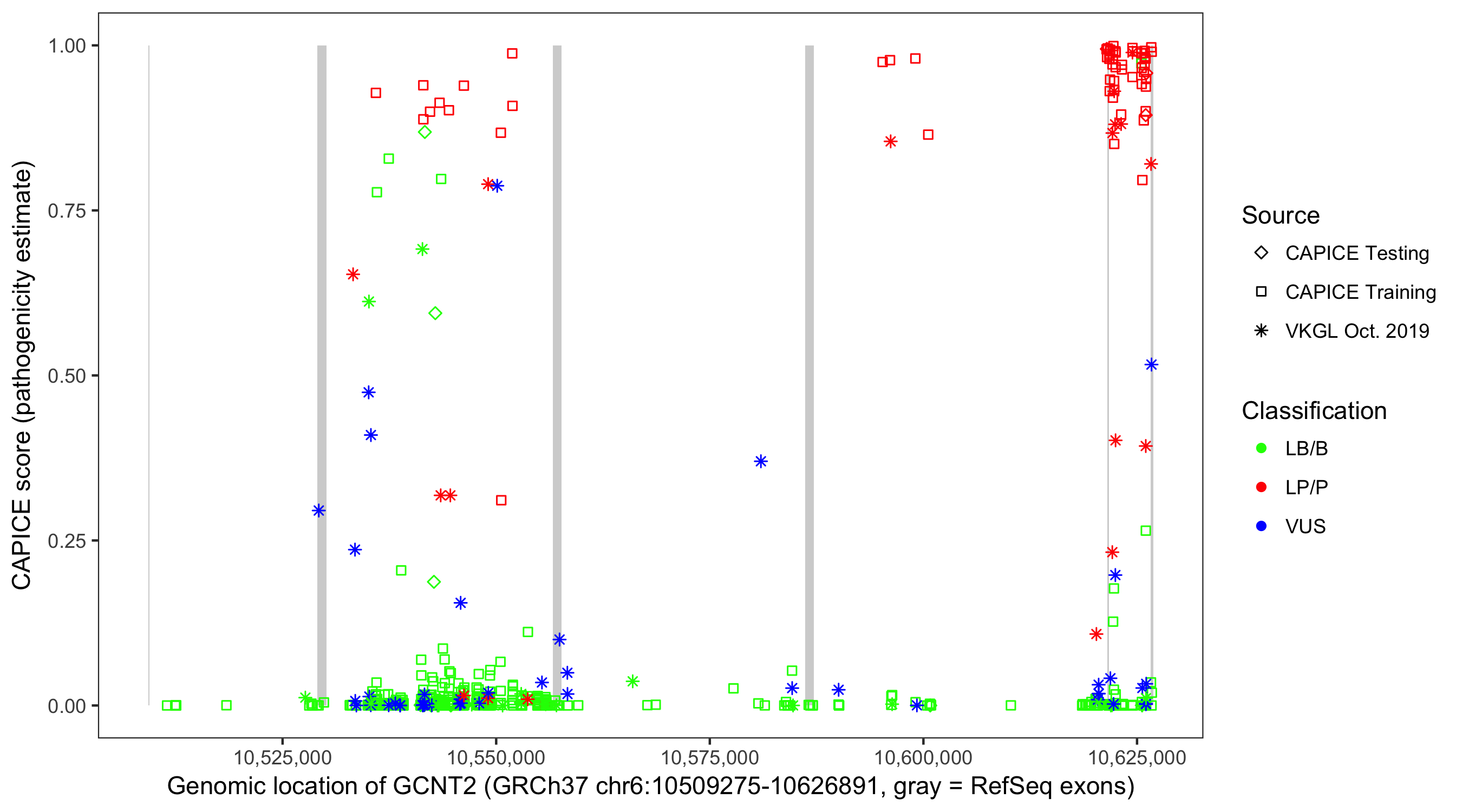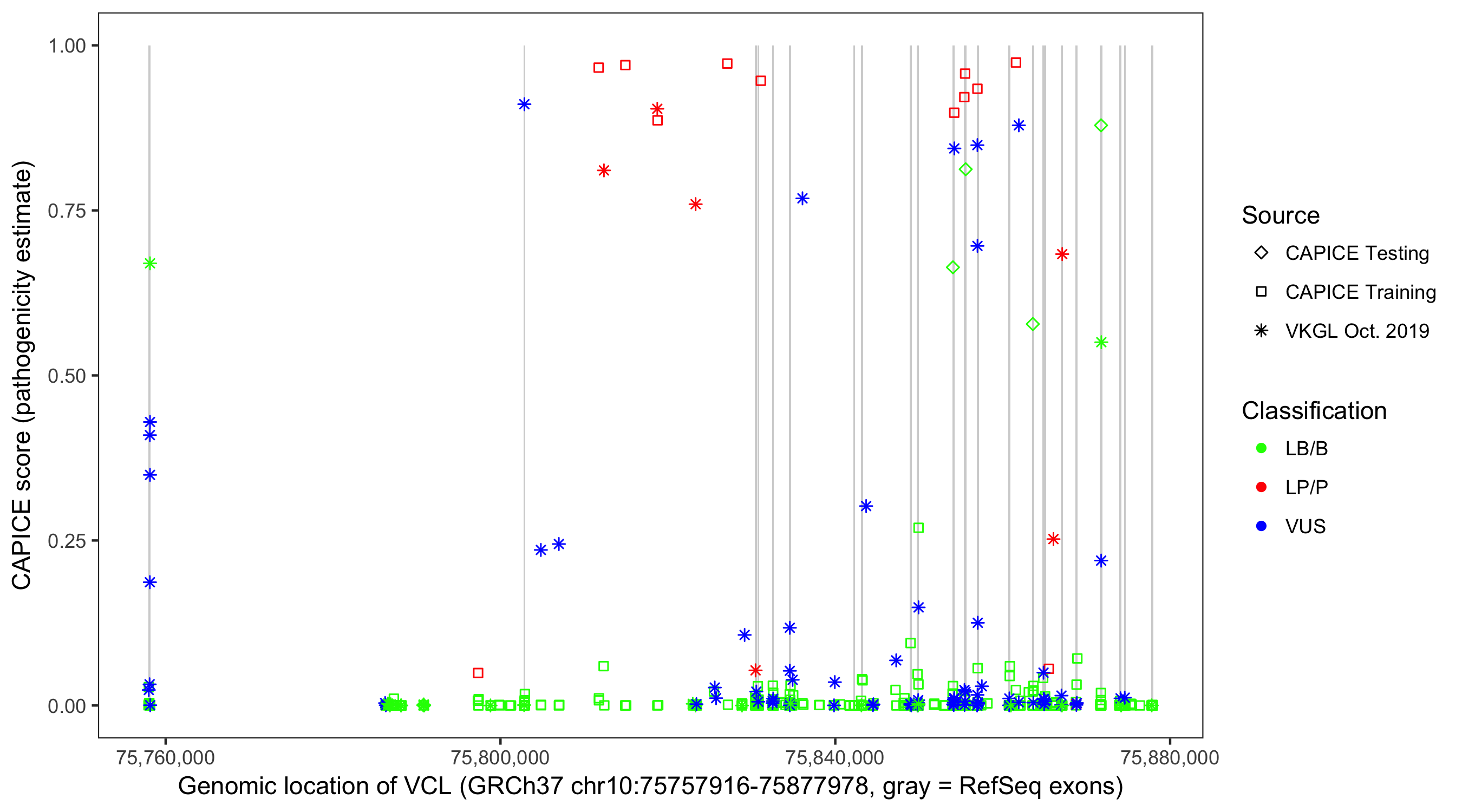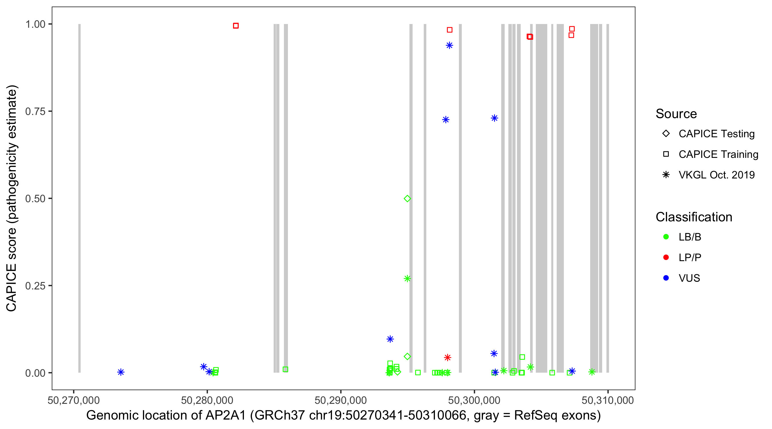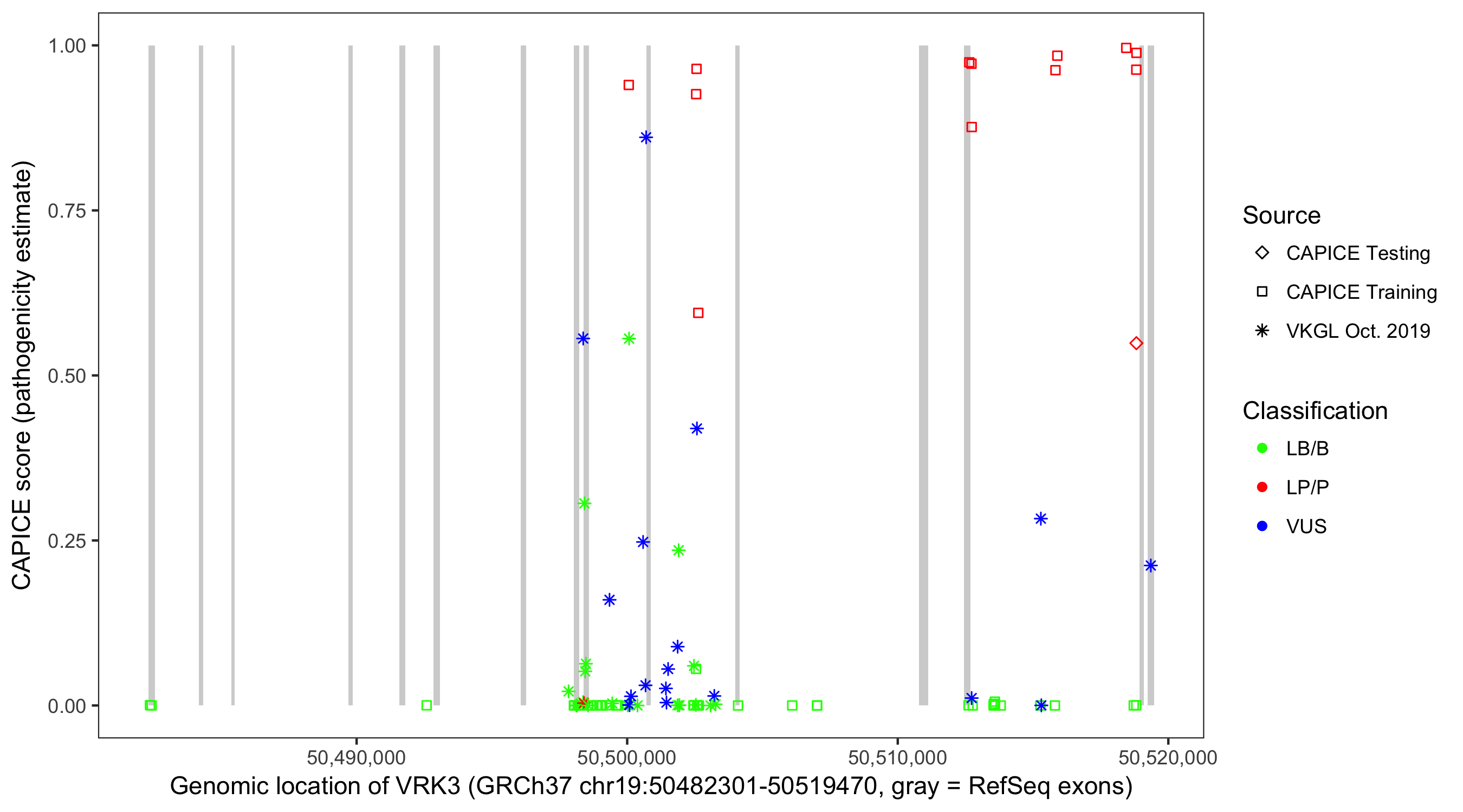 Shown are CAPICE train/test variants plus VKGL Oct 2019.