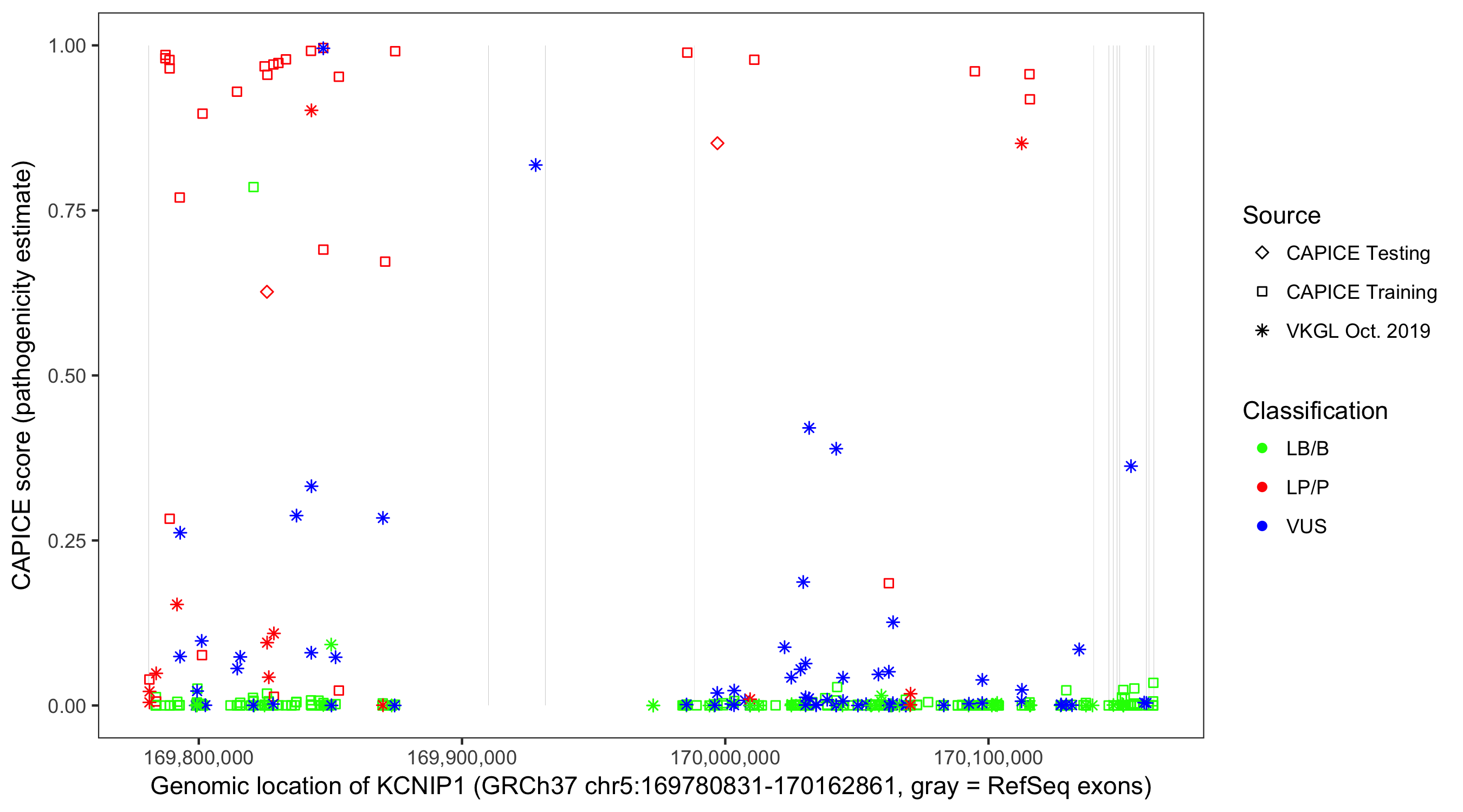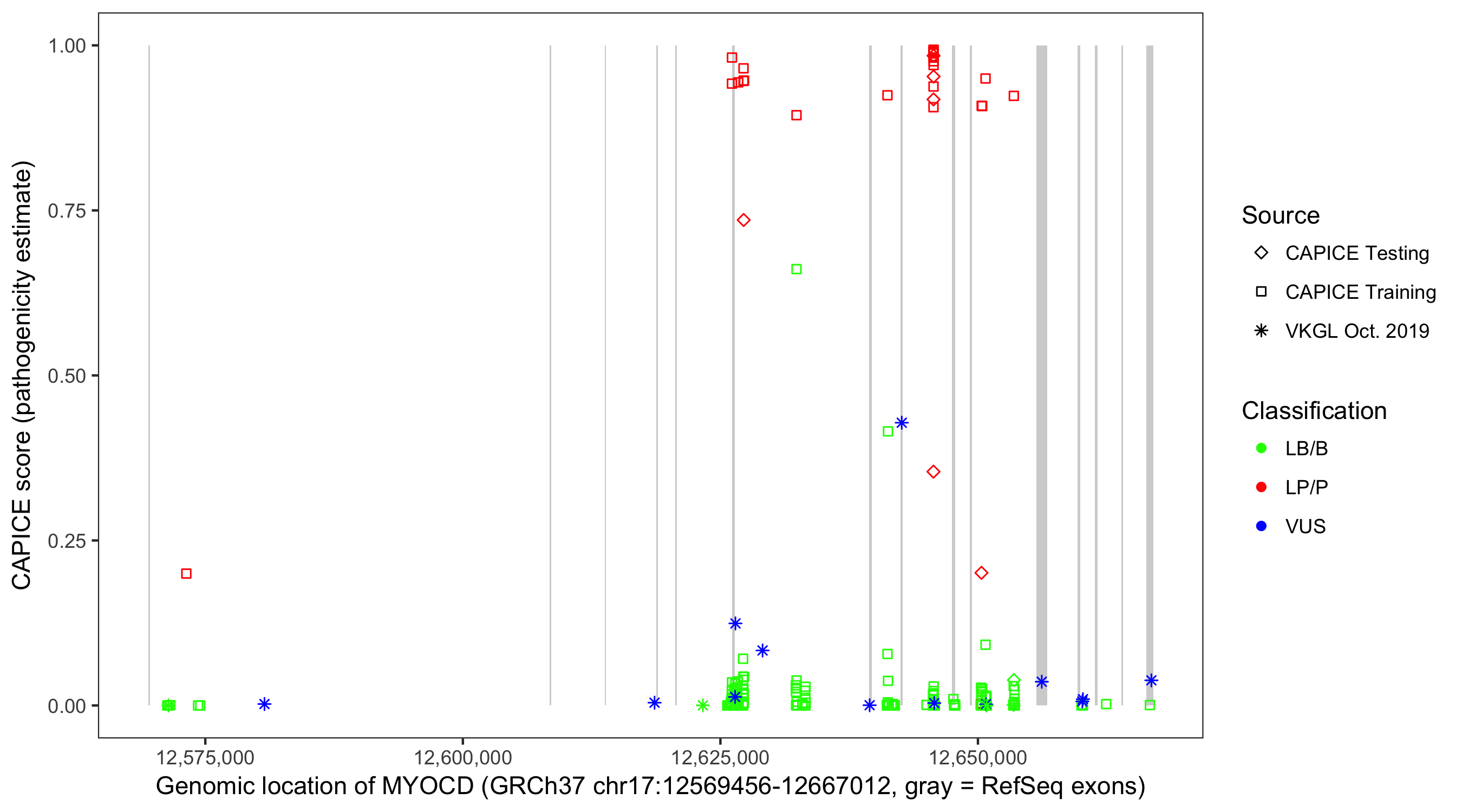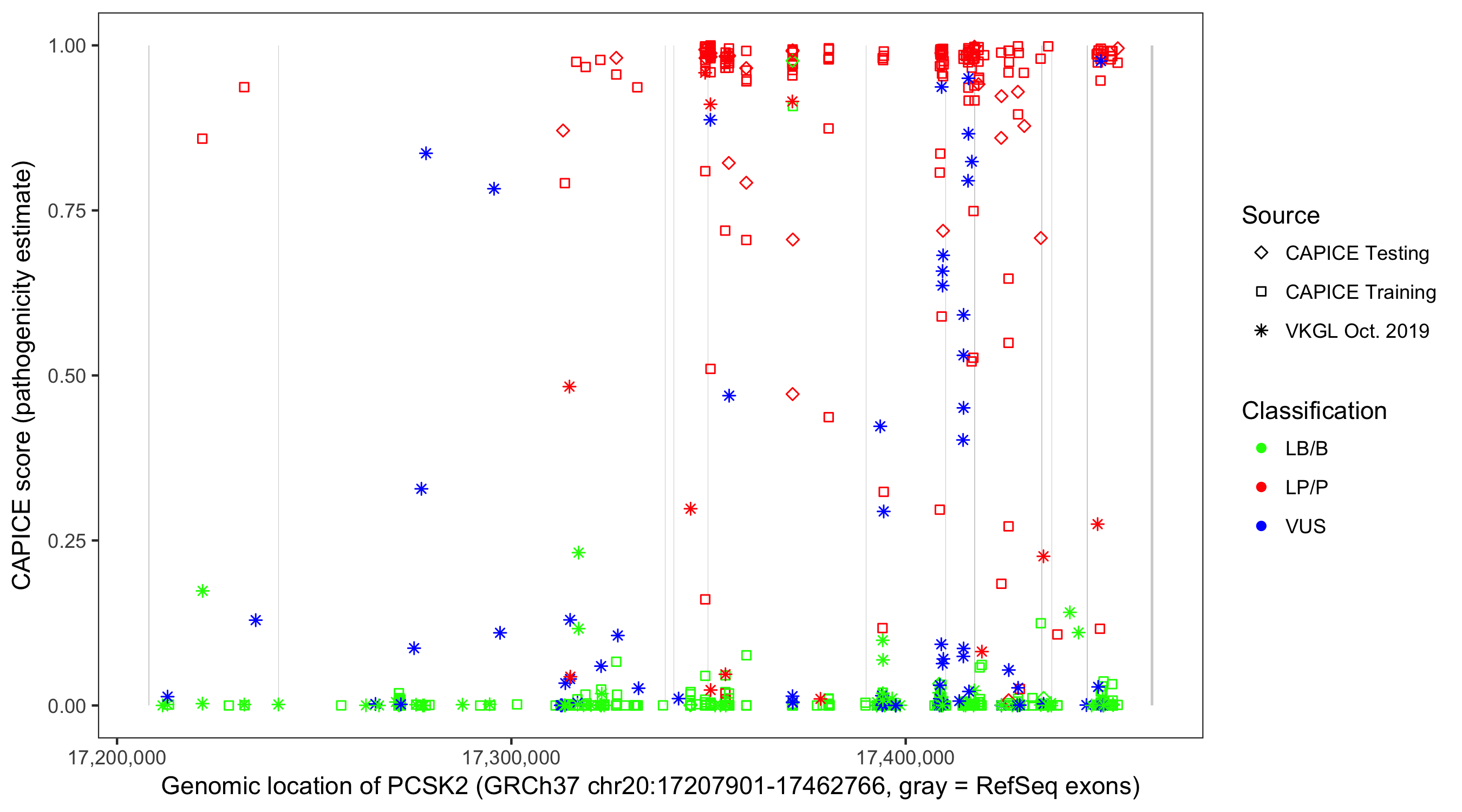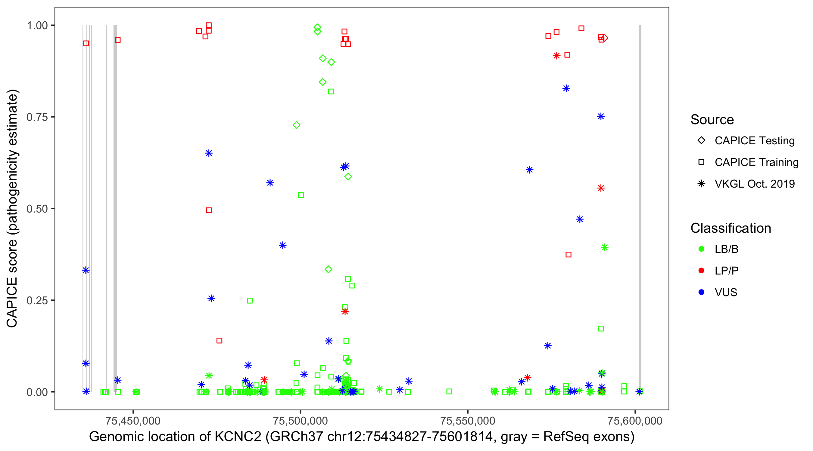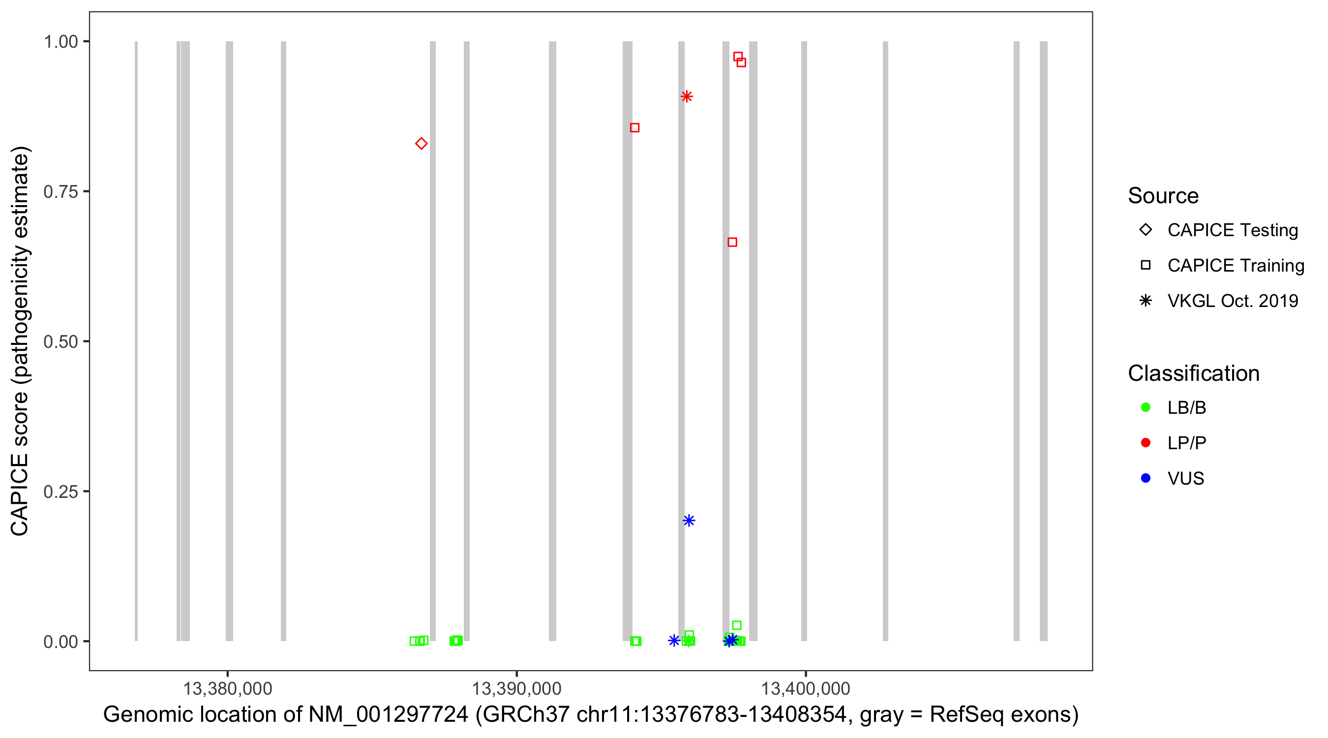 Shown are CAPICE train/test variants plus VKGL Oct 2019.