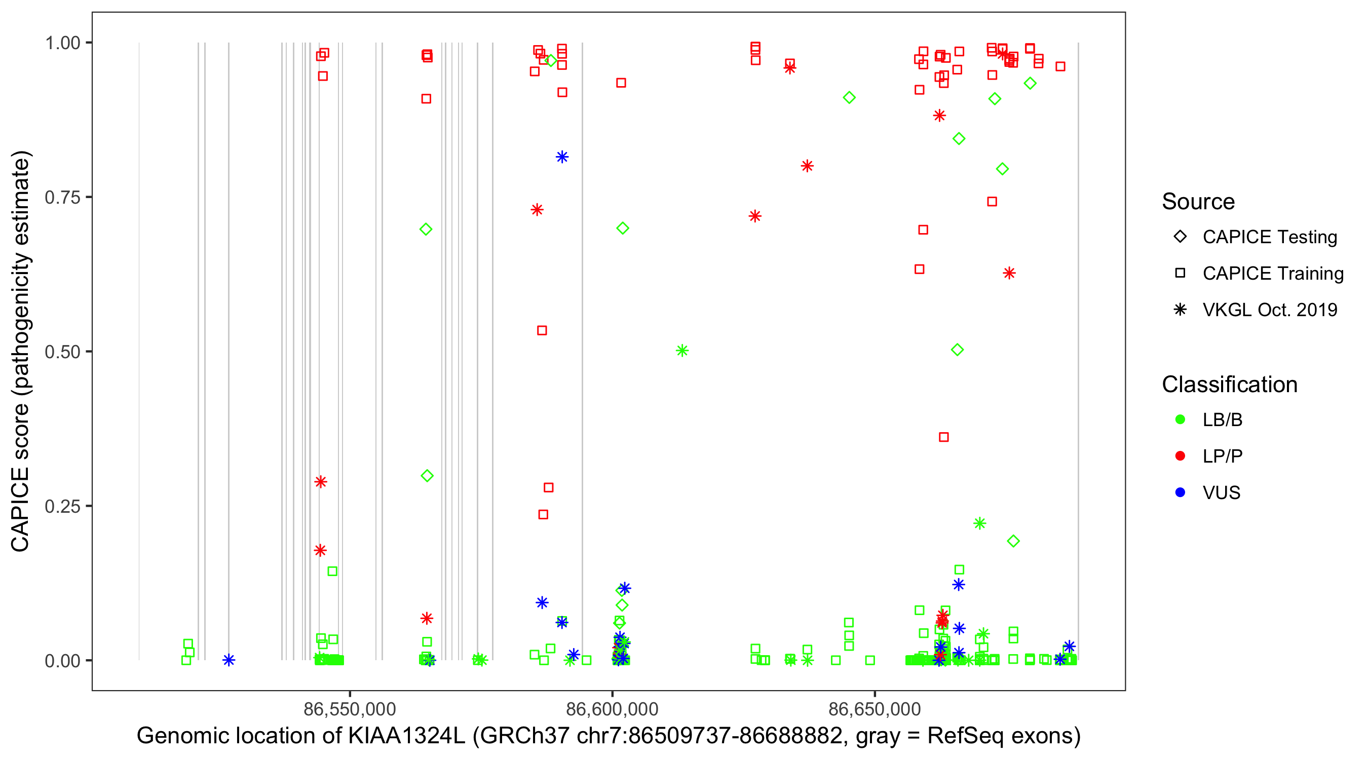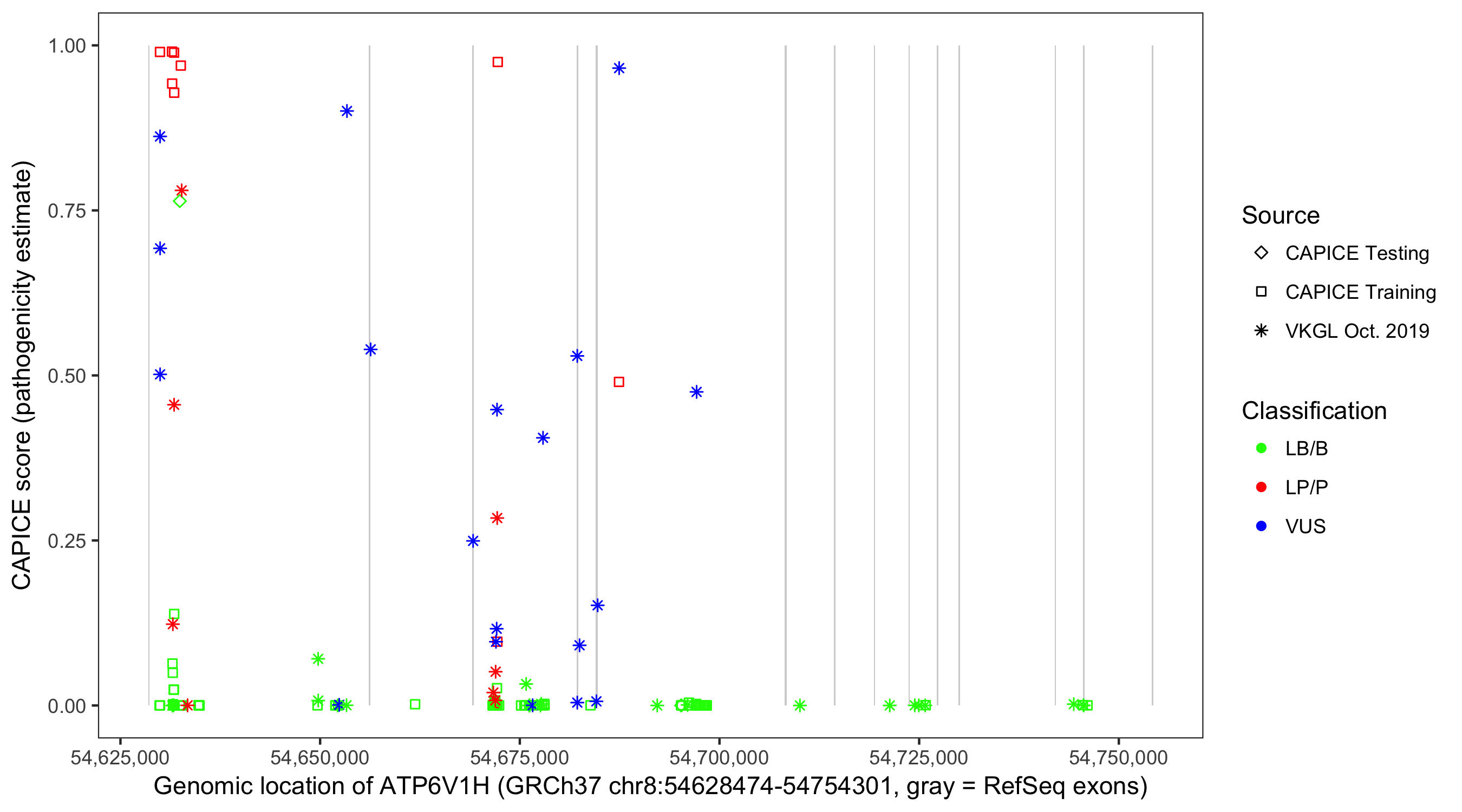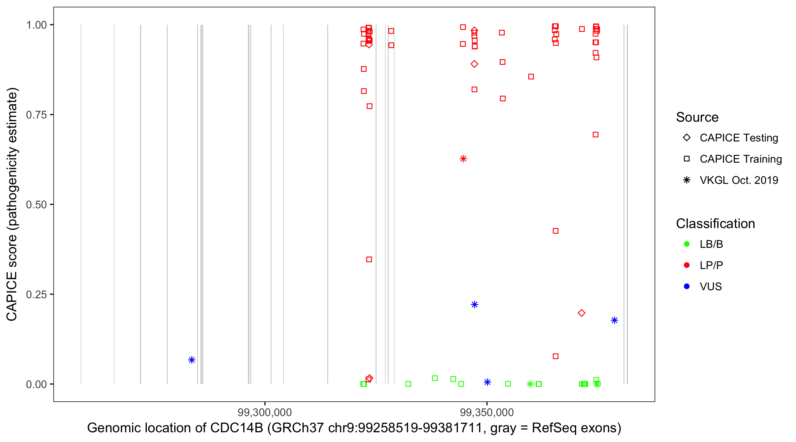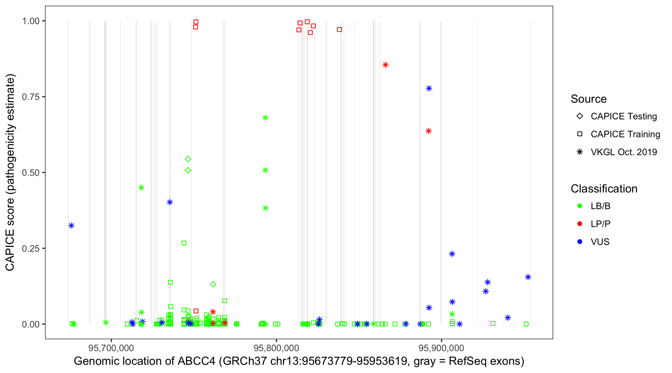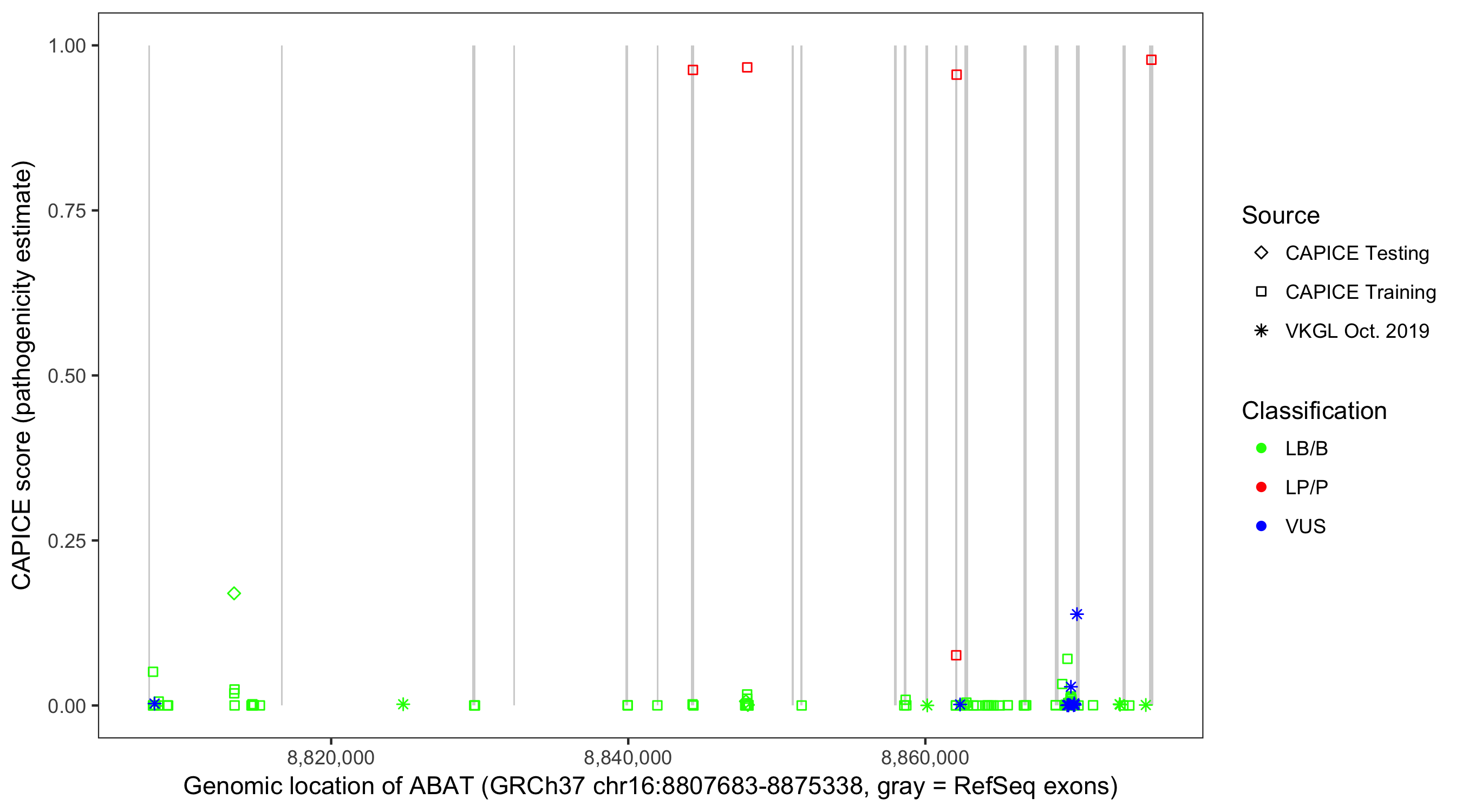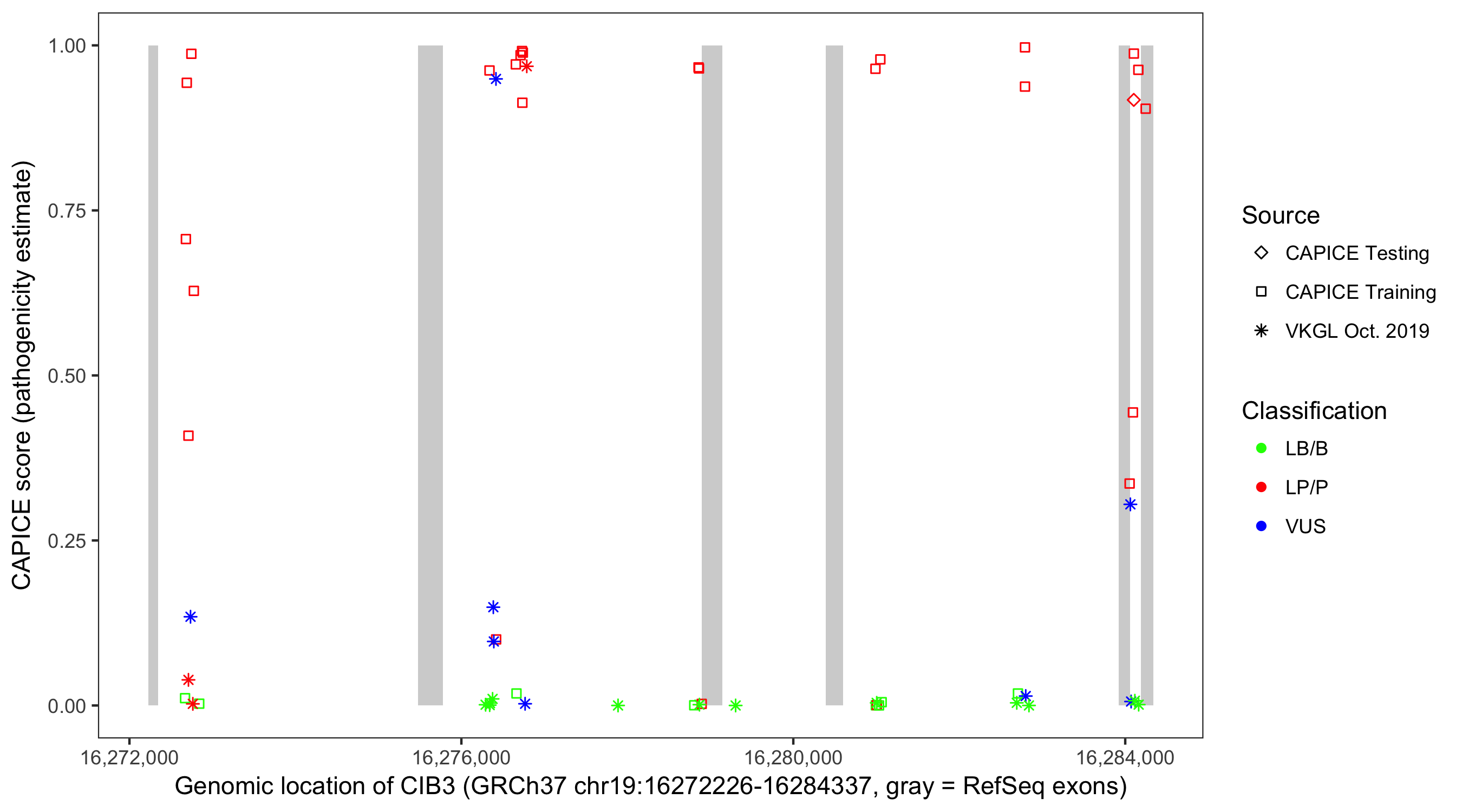 Shown are CAPICE train/test variants plus VKGL Oct 2019.