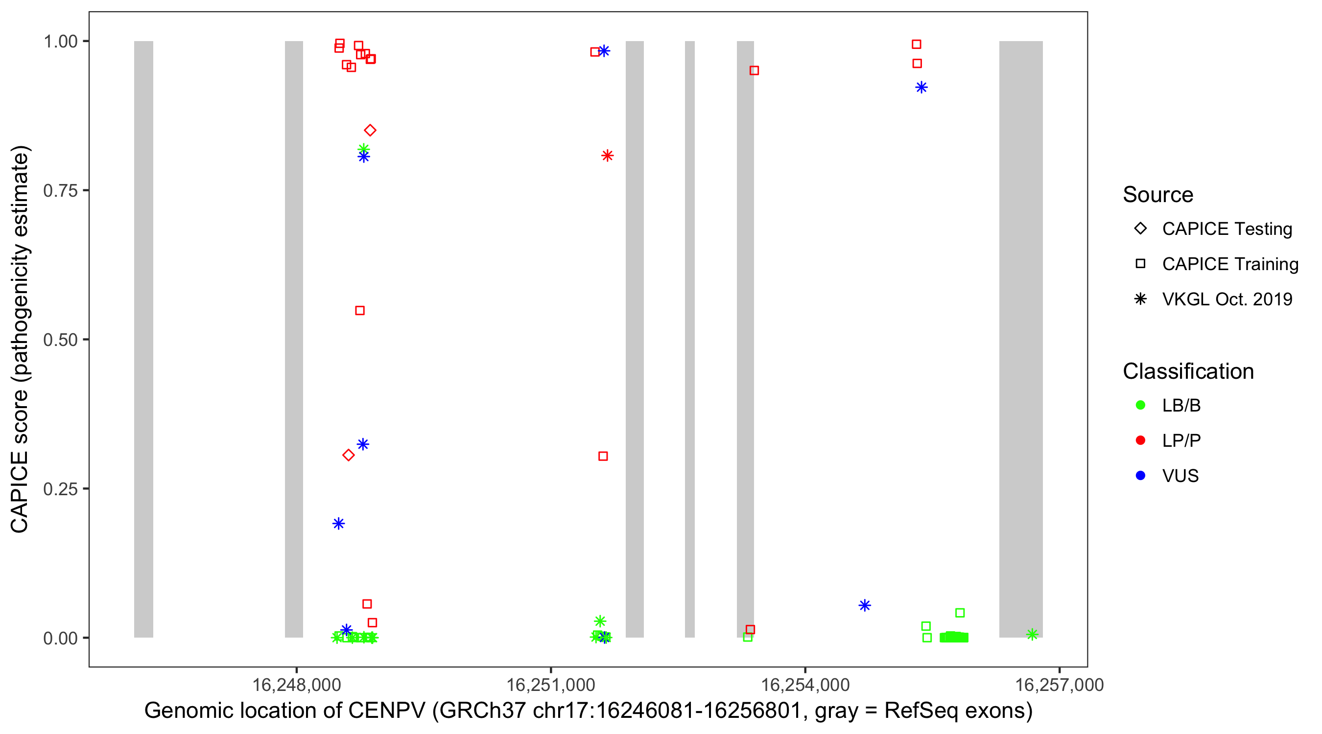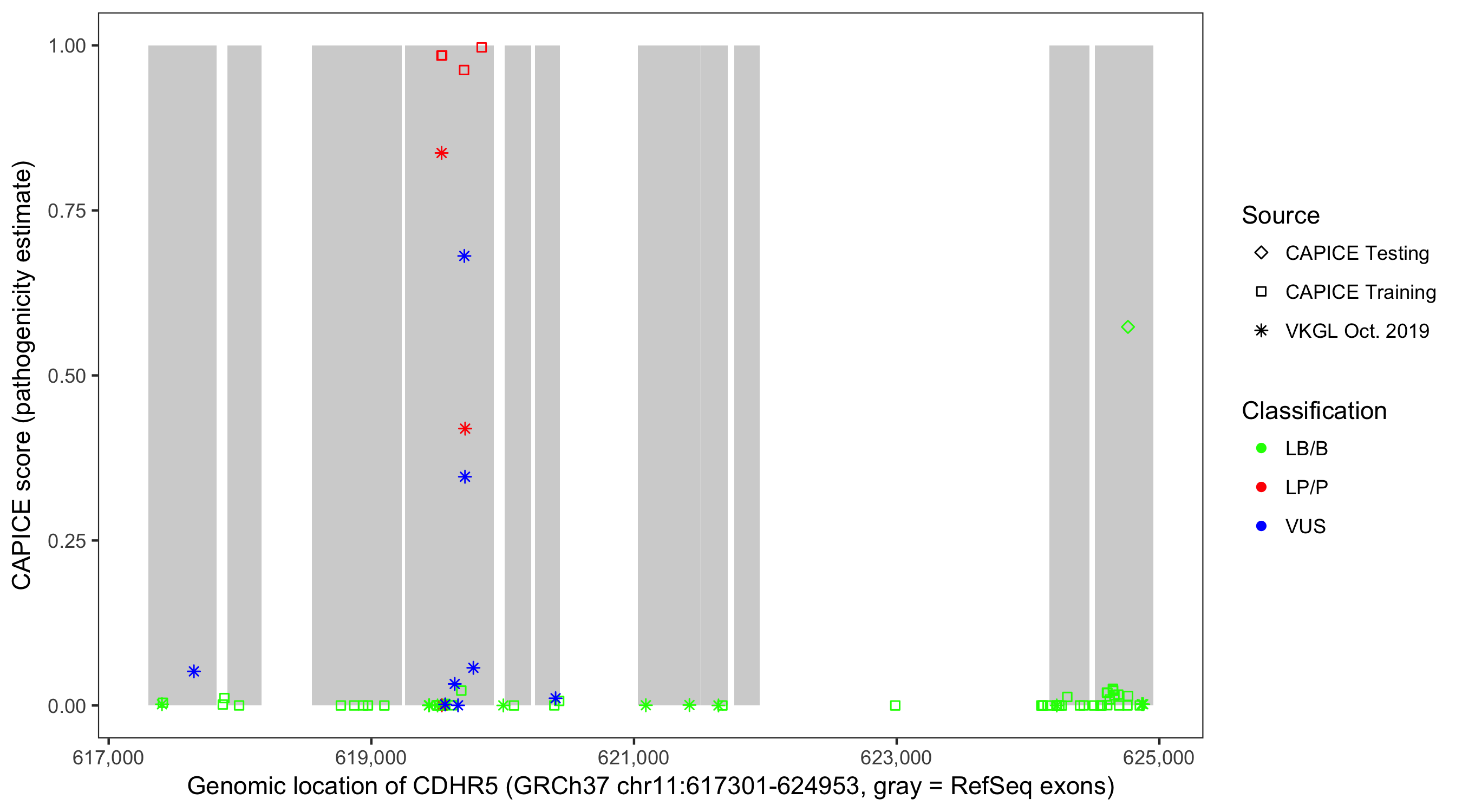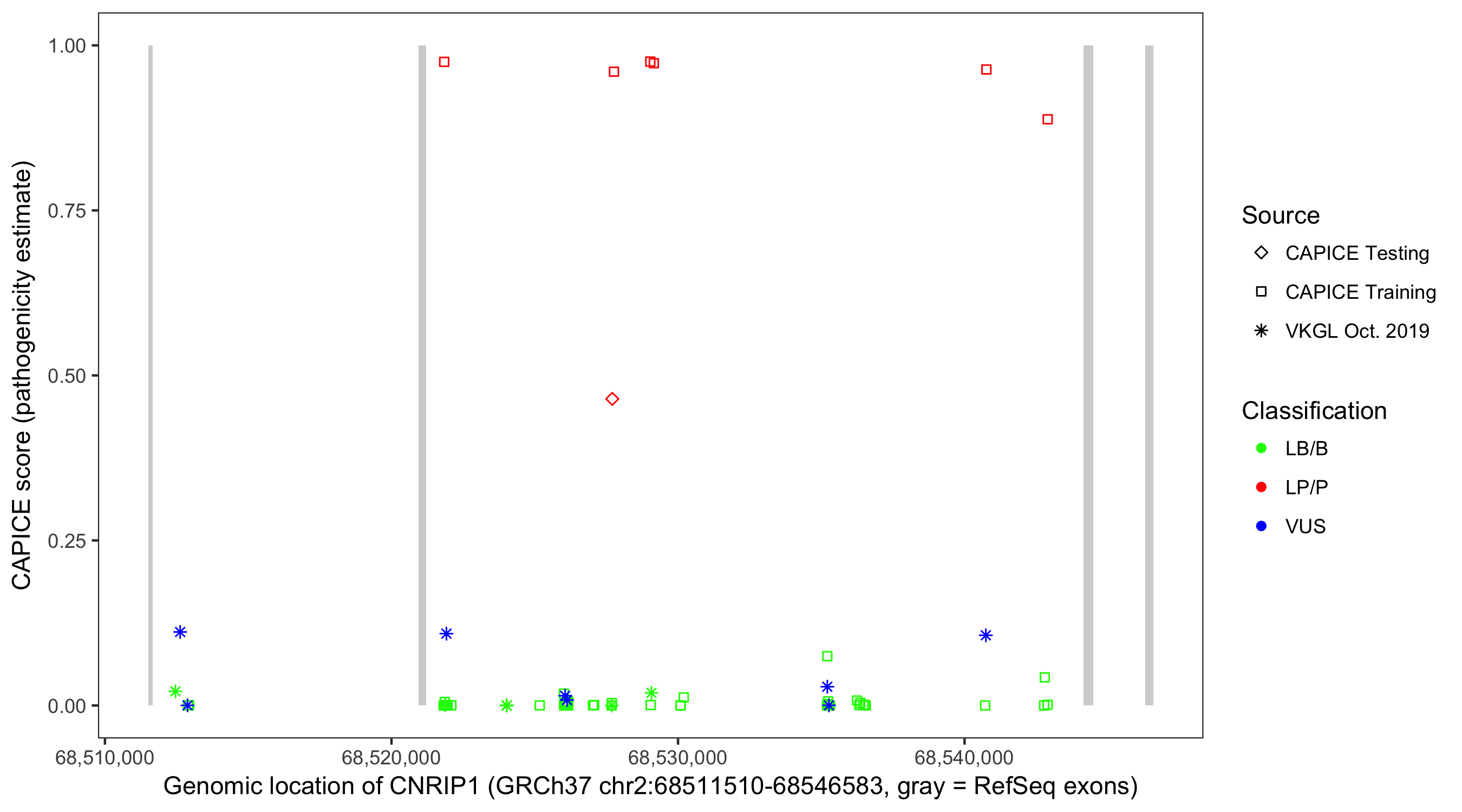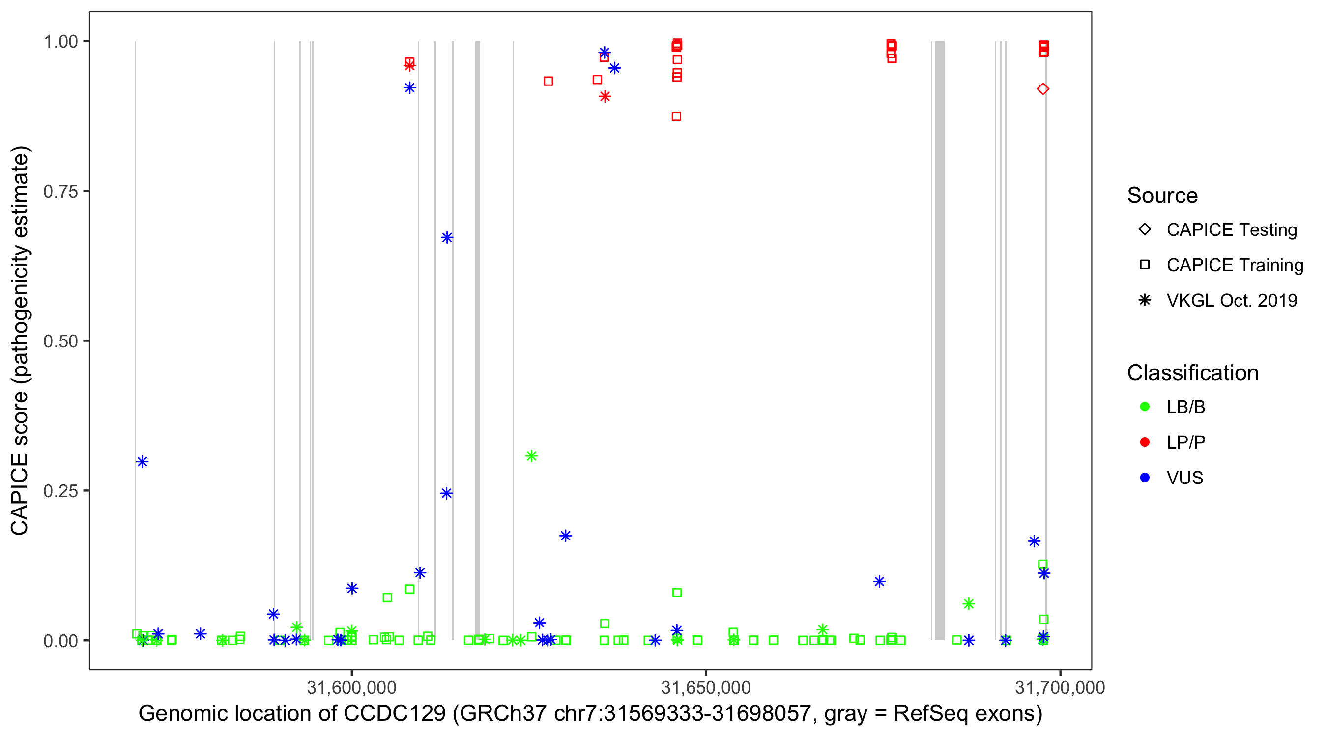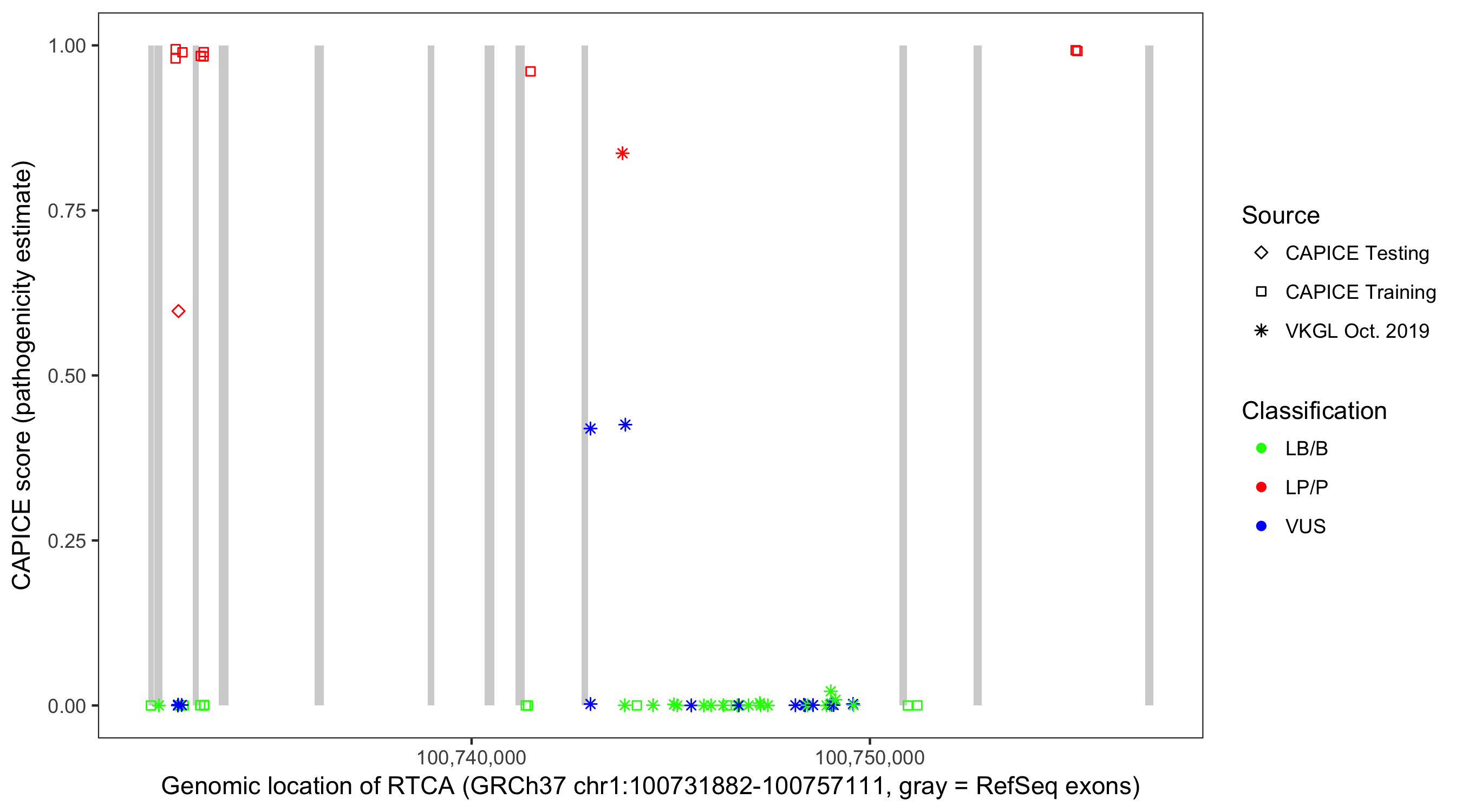 Shown are CAPICE train/test variants plus VKGL Oct 2019.