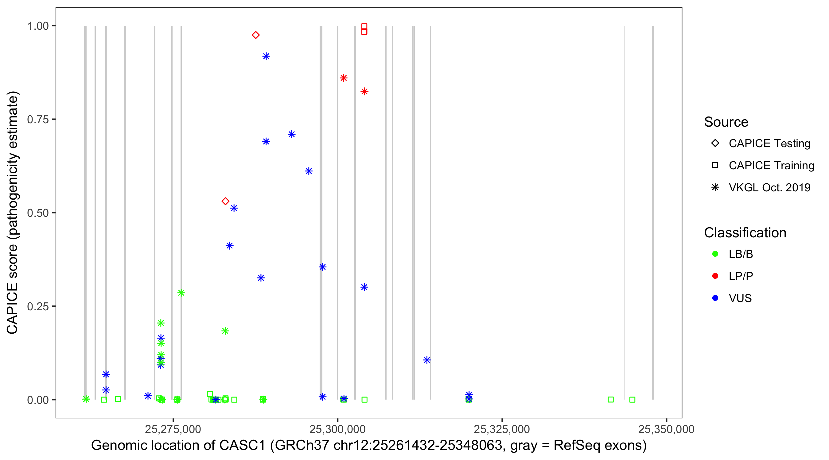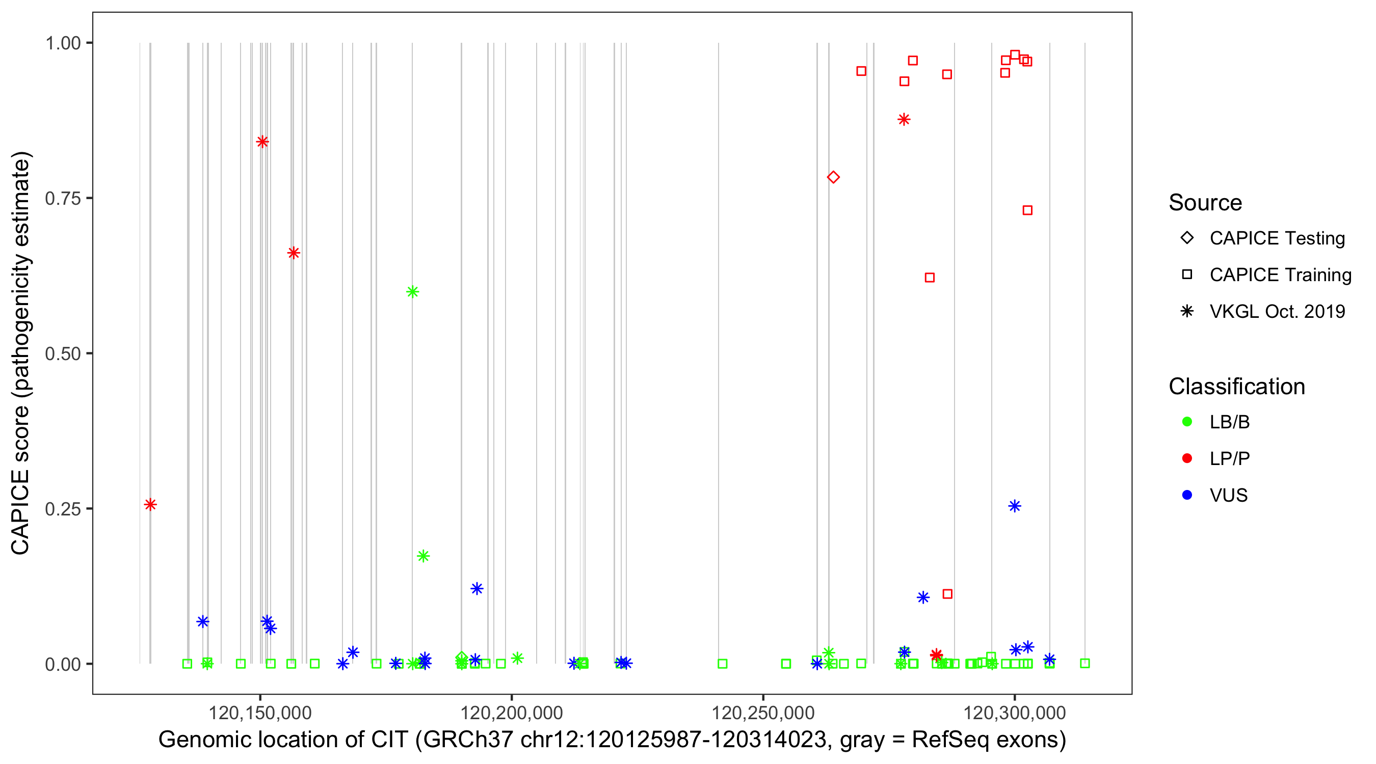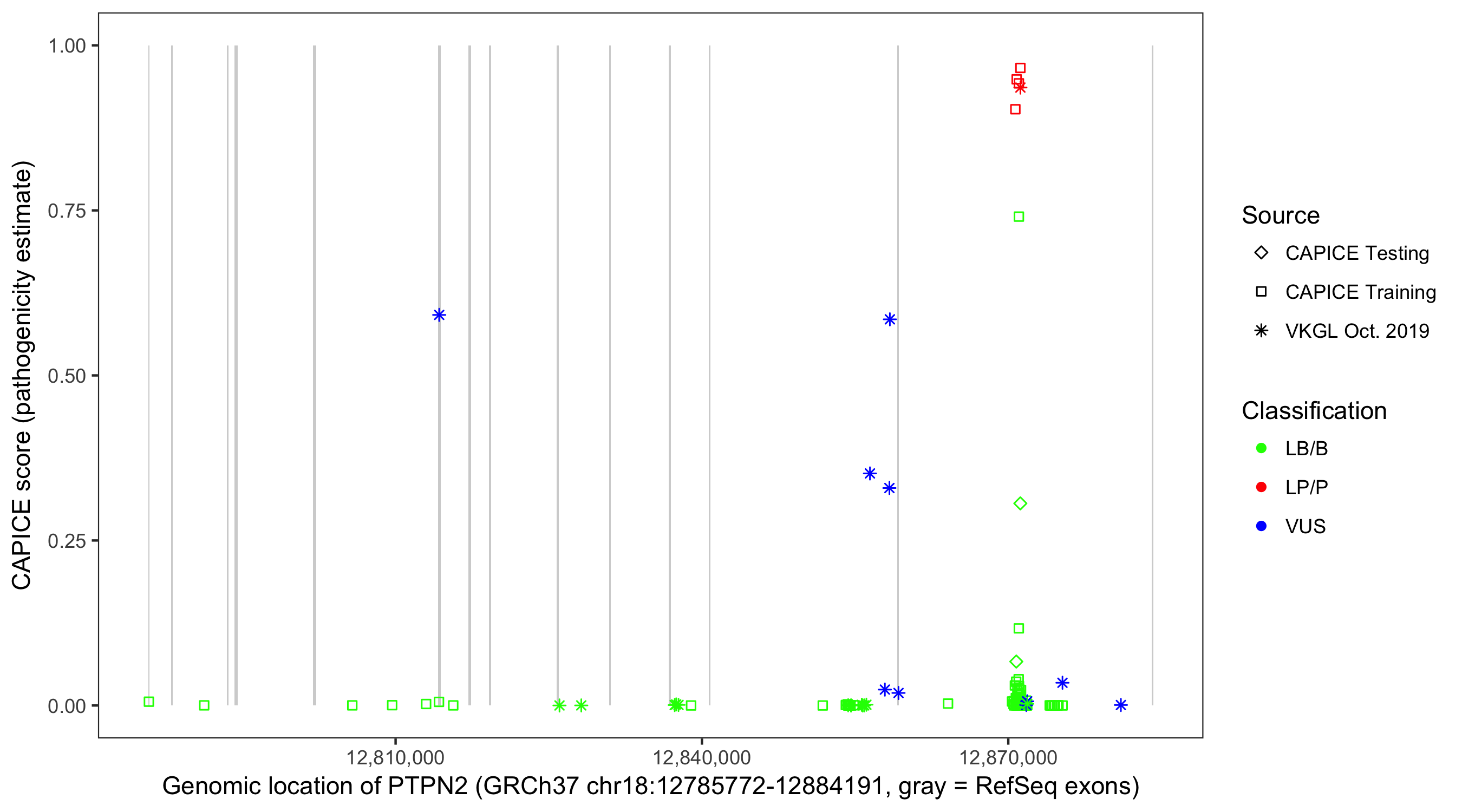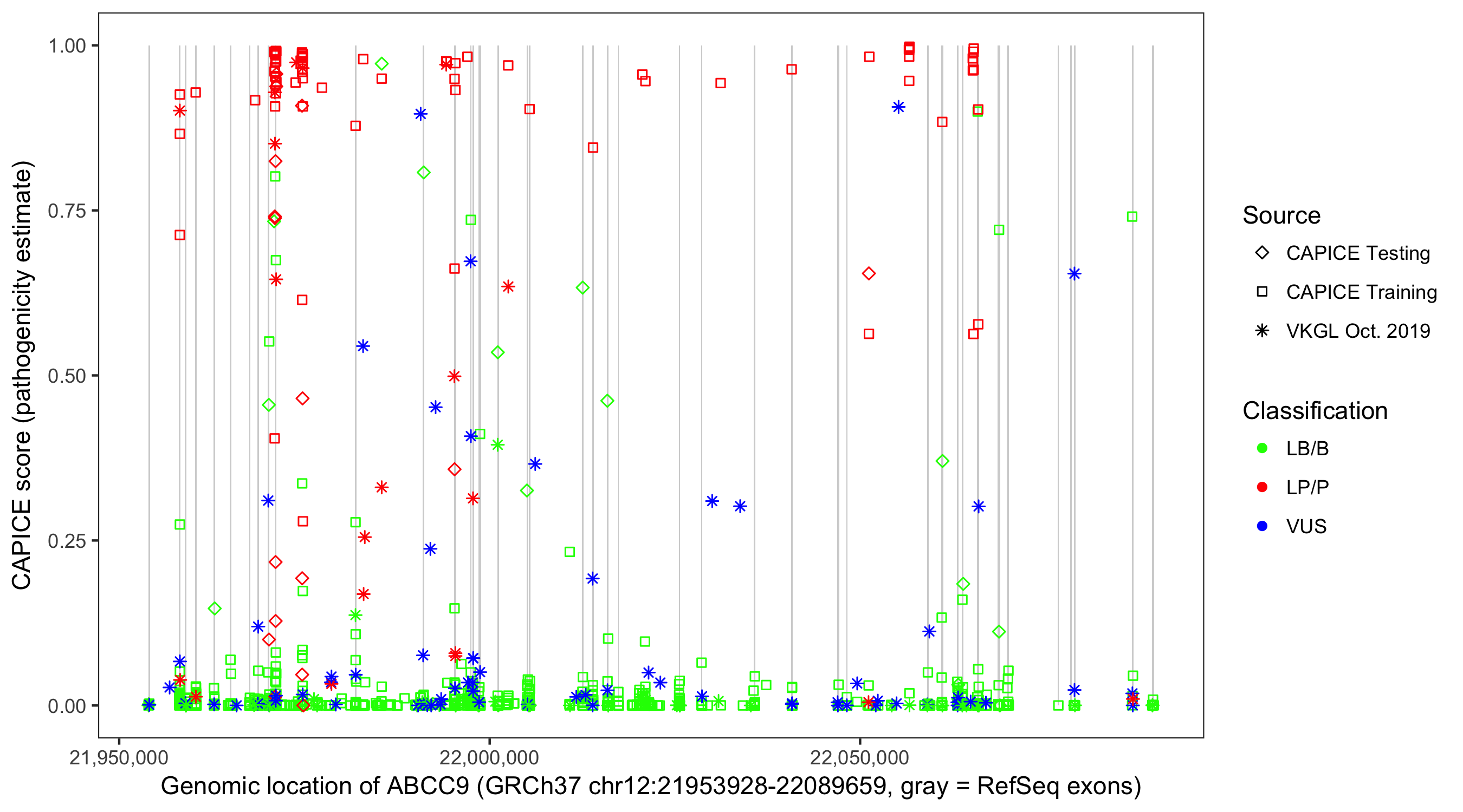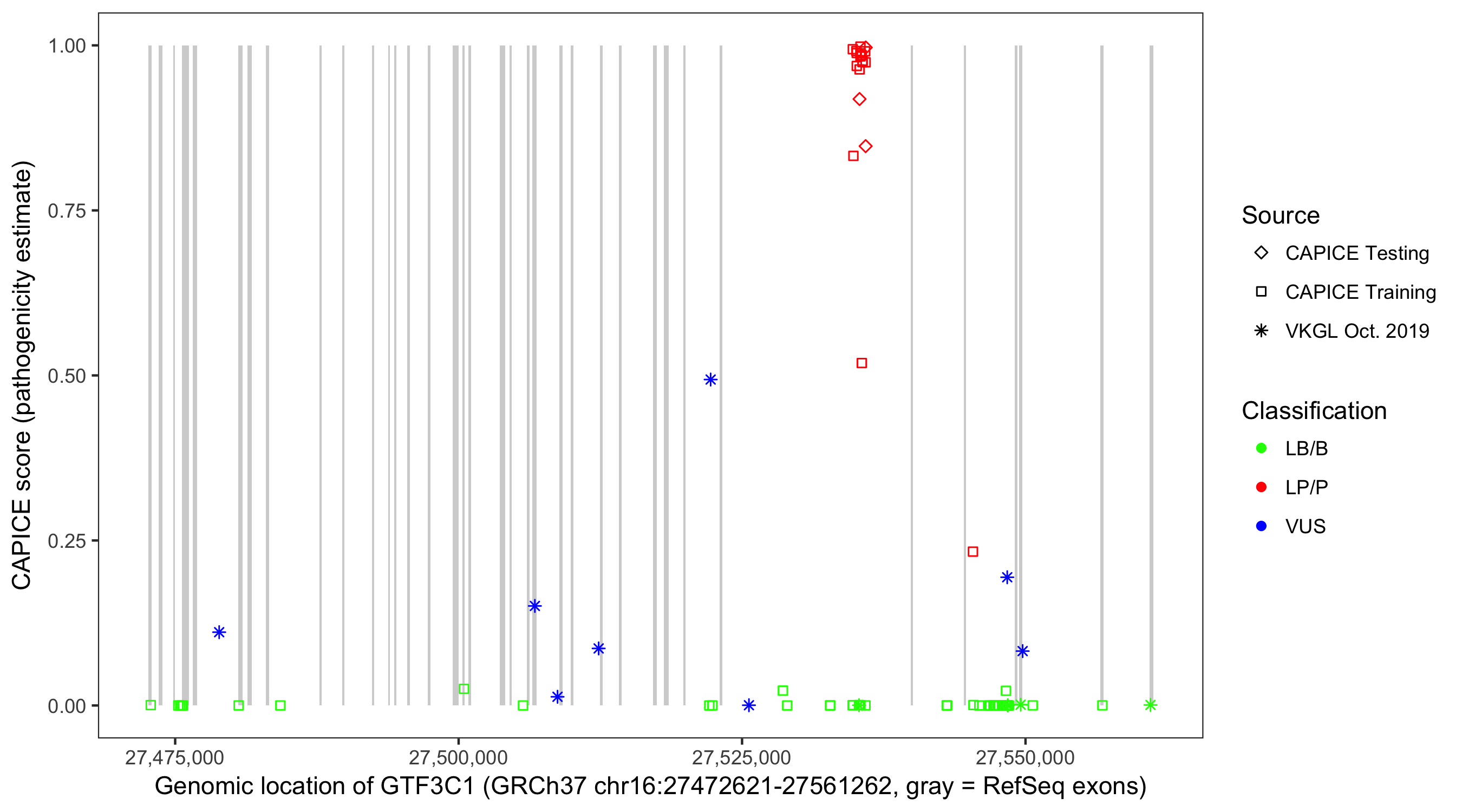 Shown are CAPICE train/test variants plus VKGL Oct 2019.