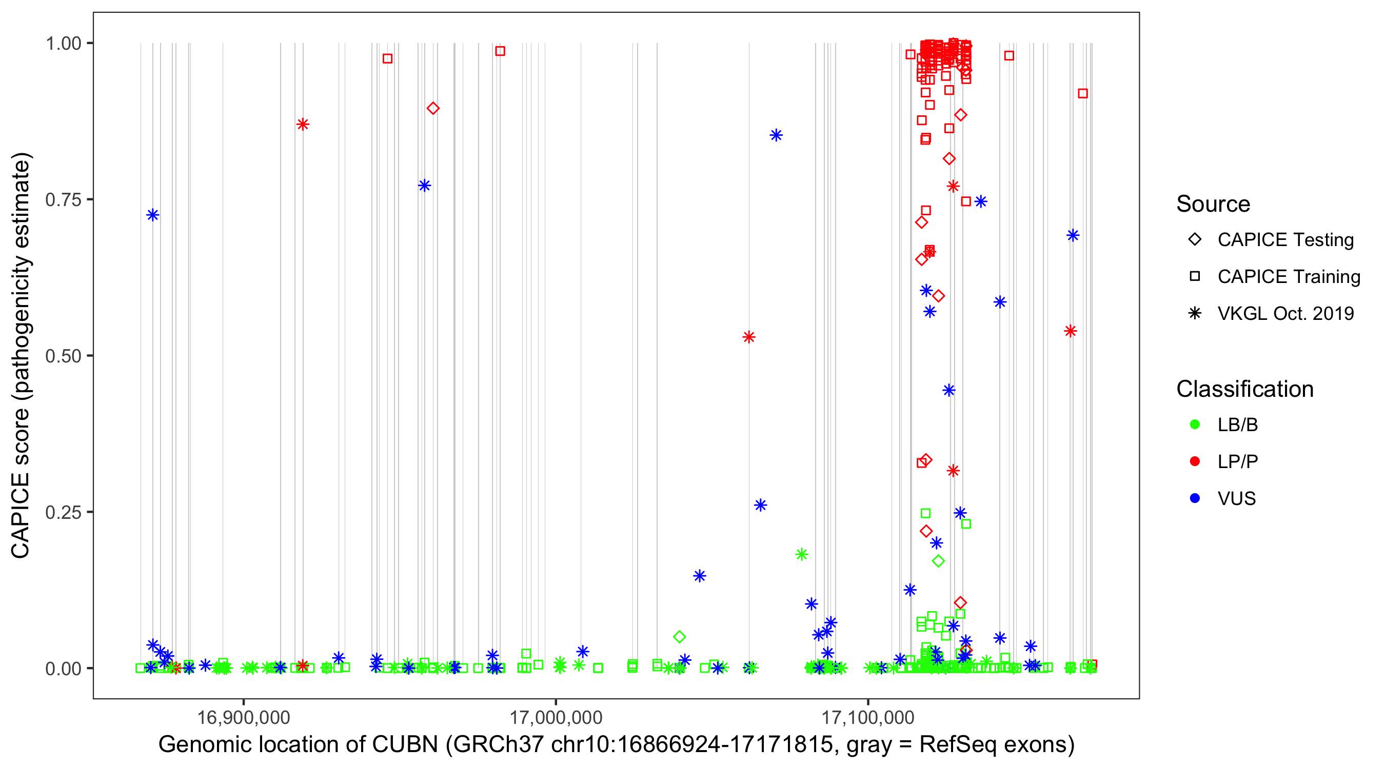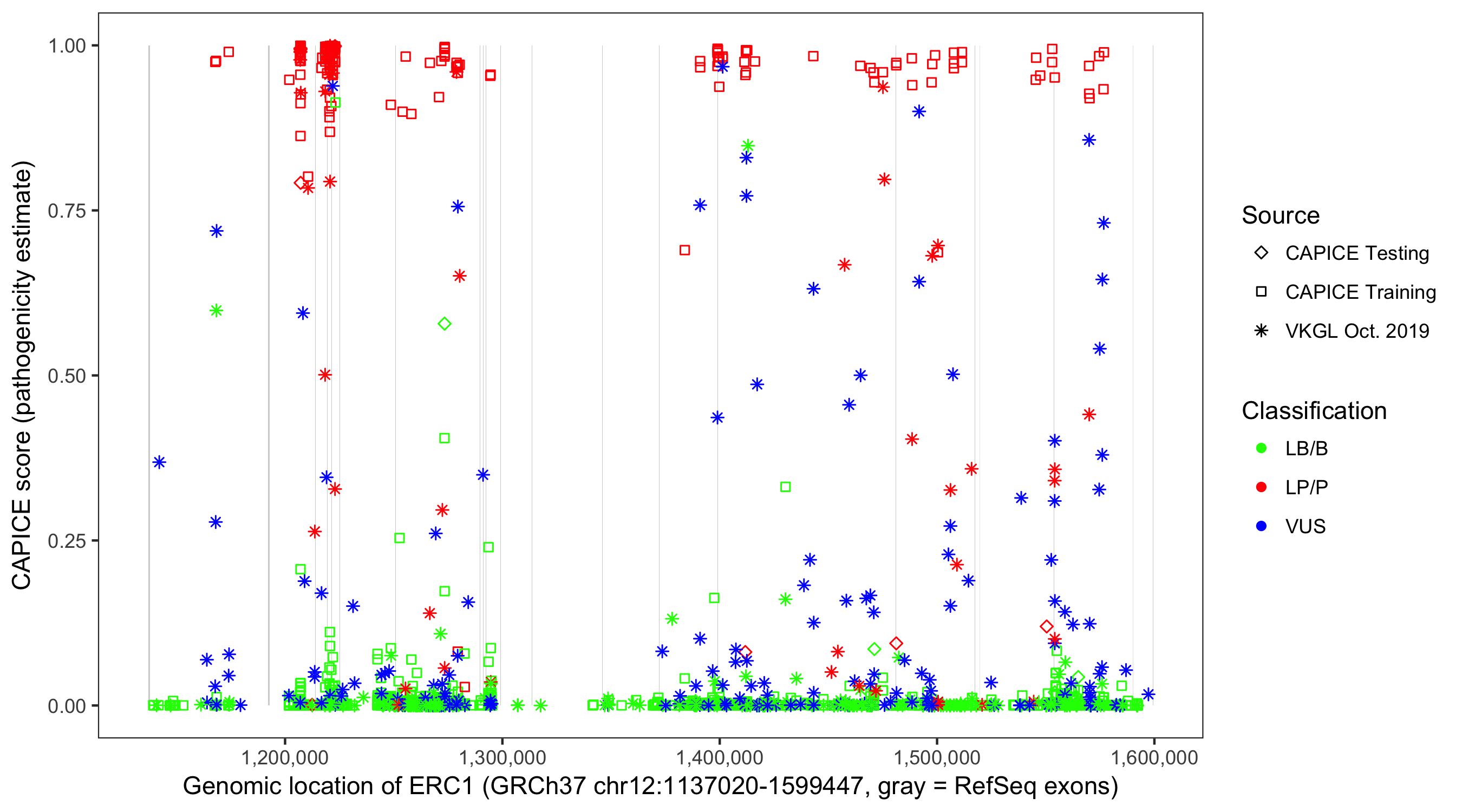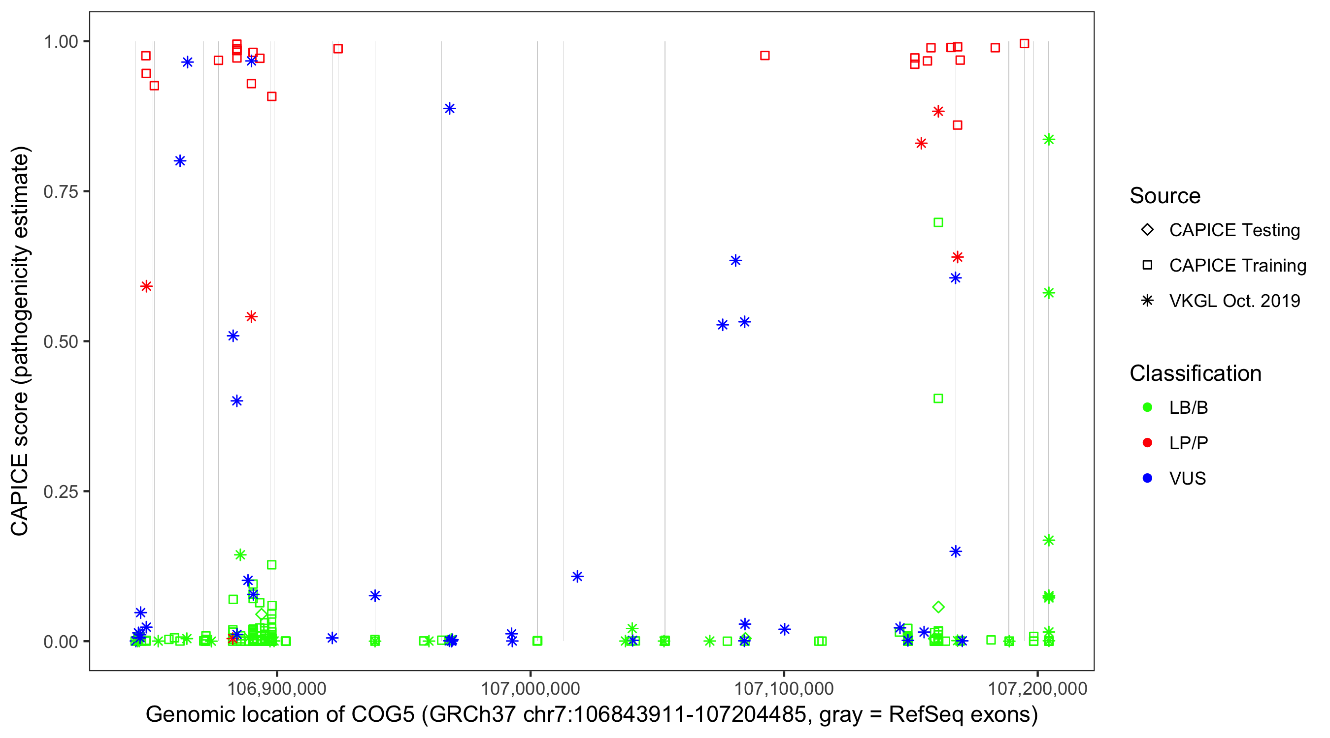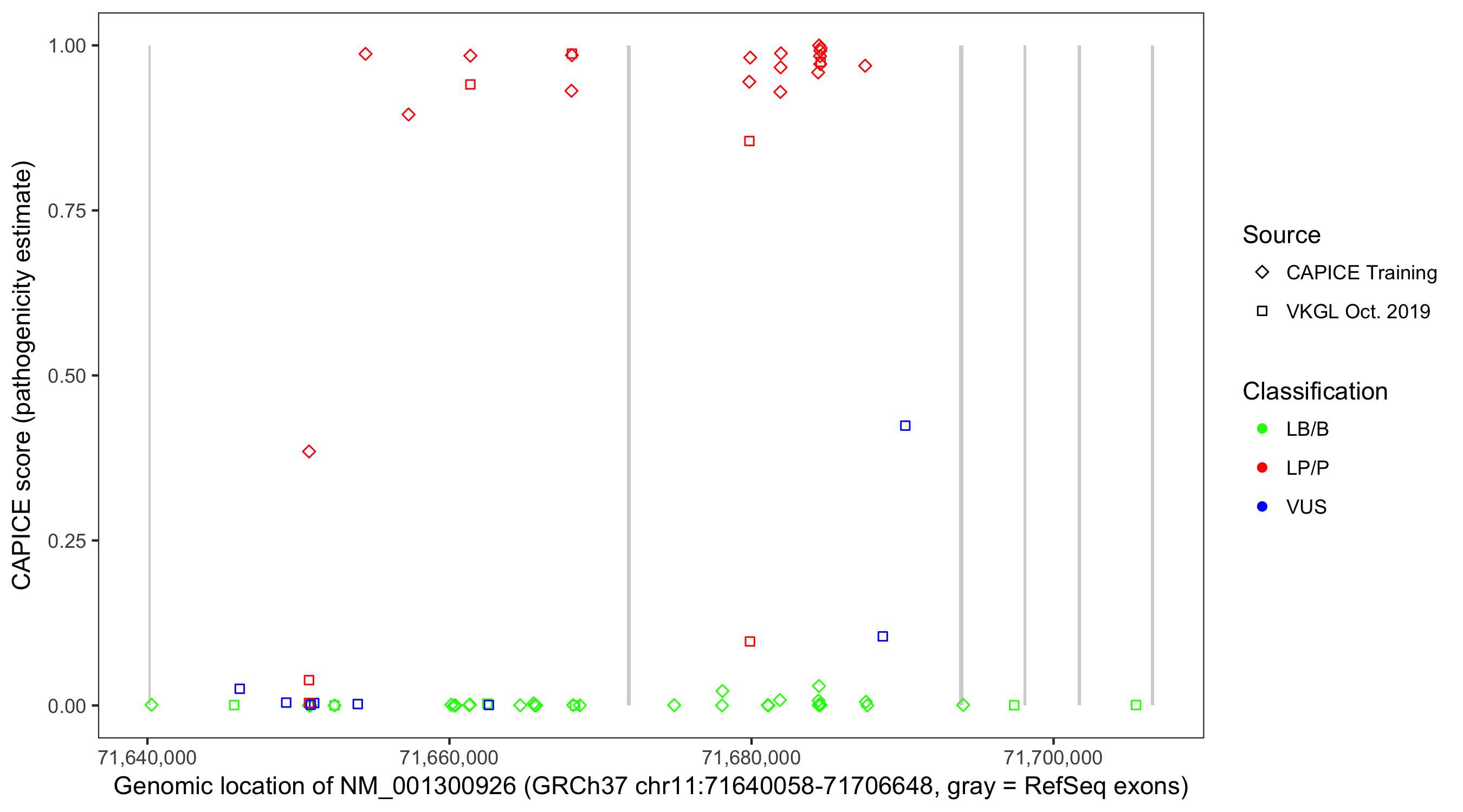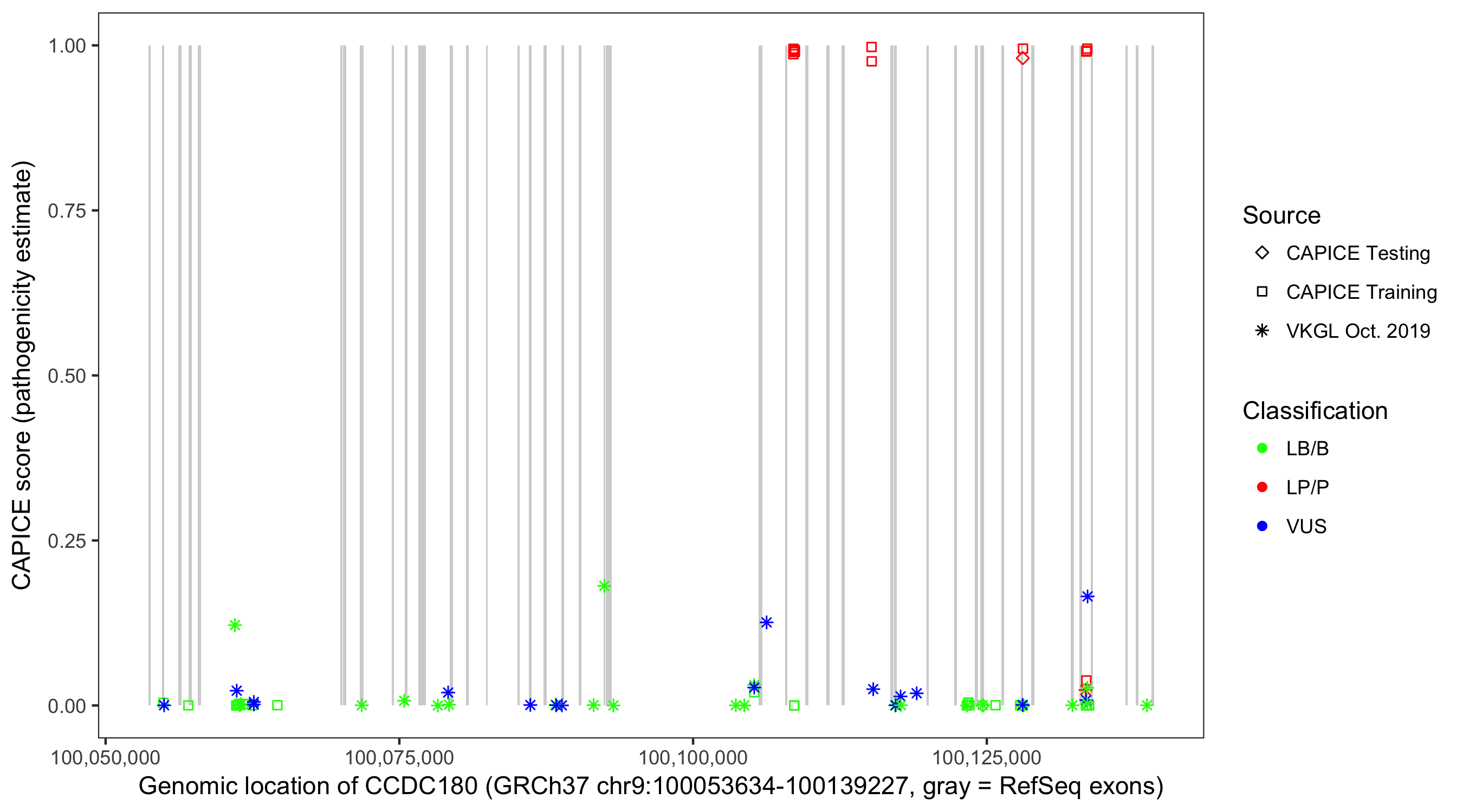 Shown are CAPICE train/test variants plus VKGL Oct 2019.