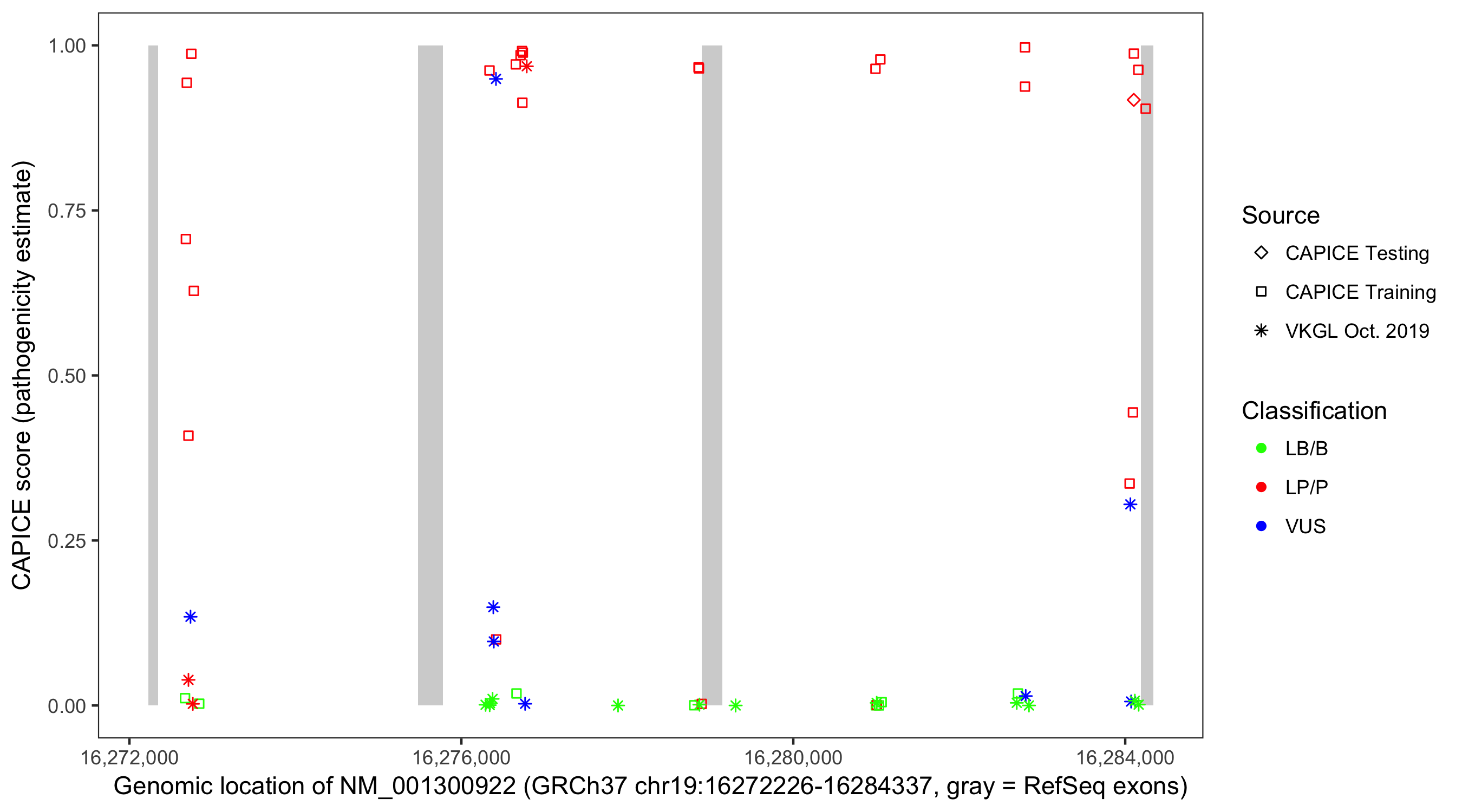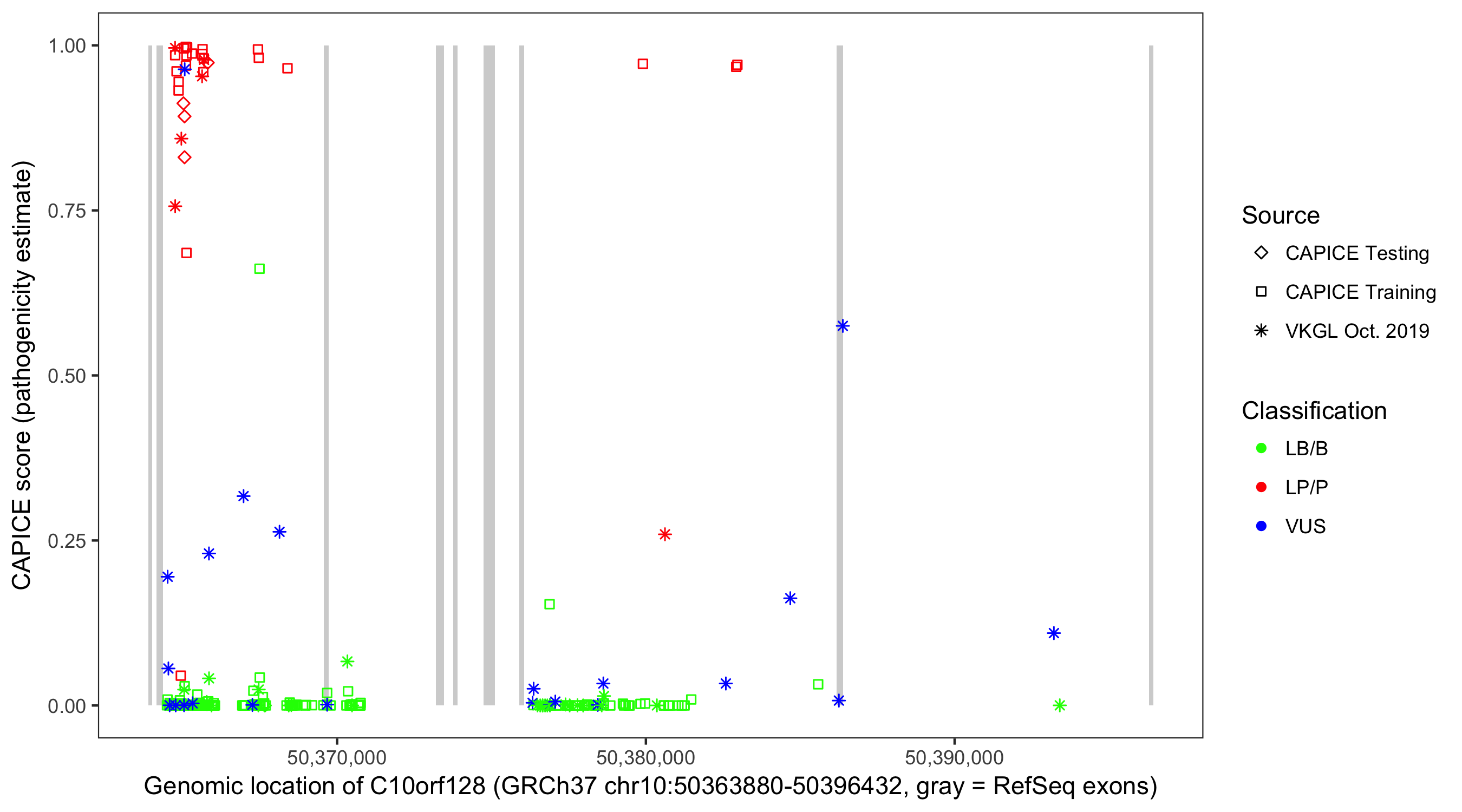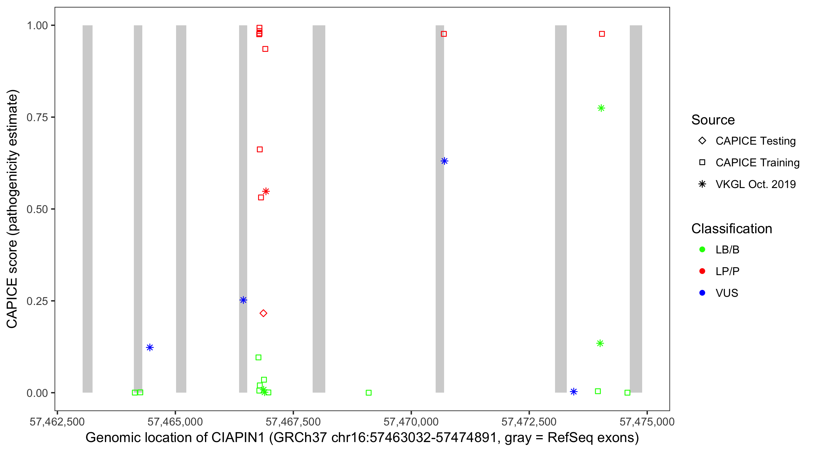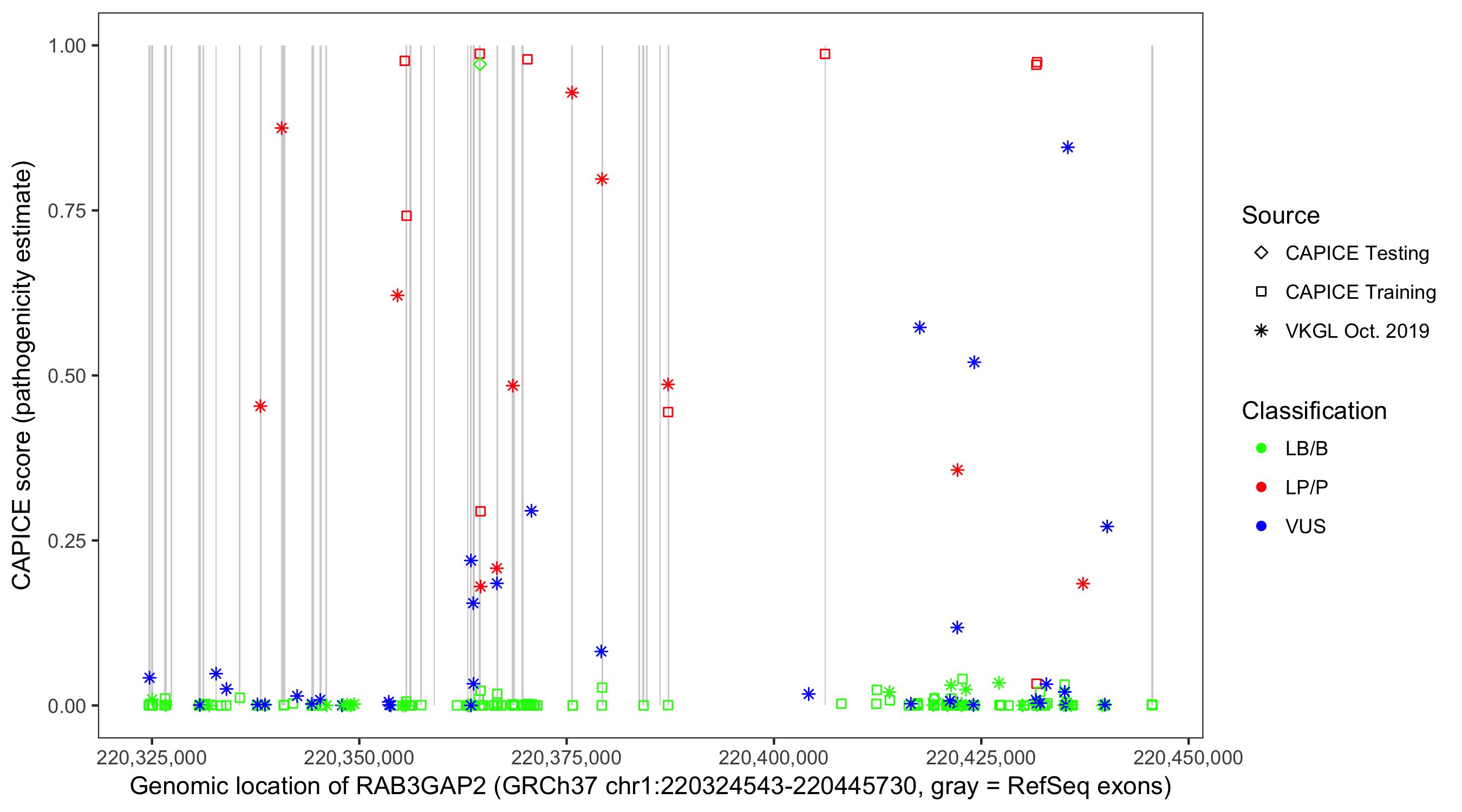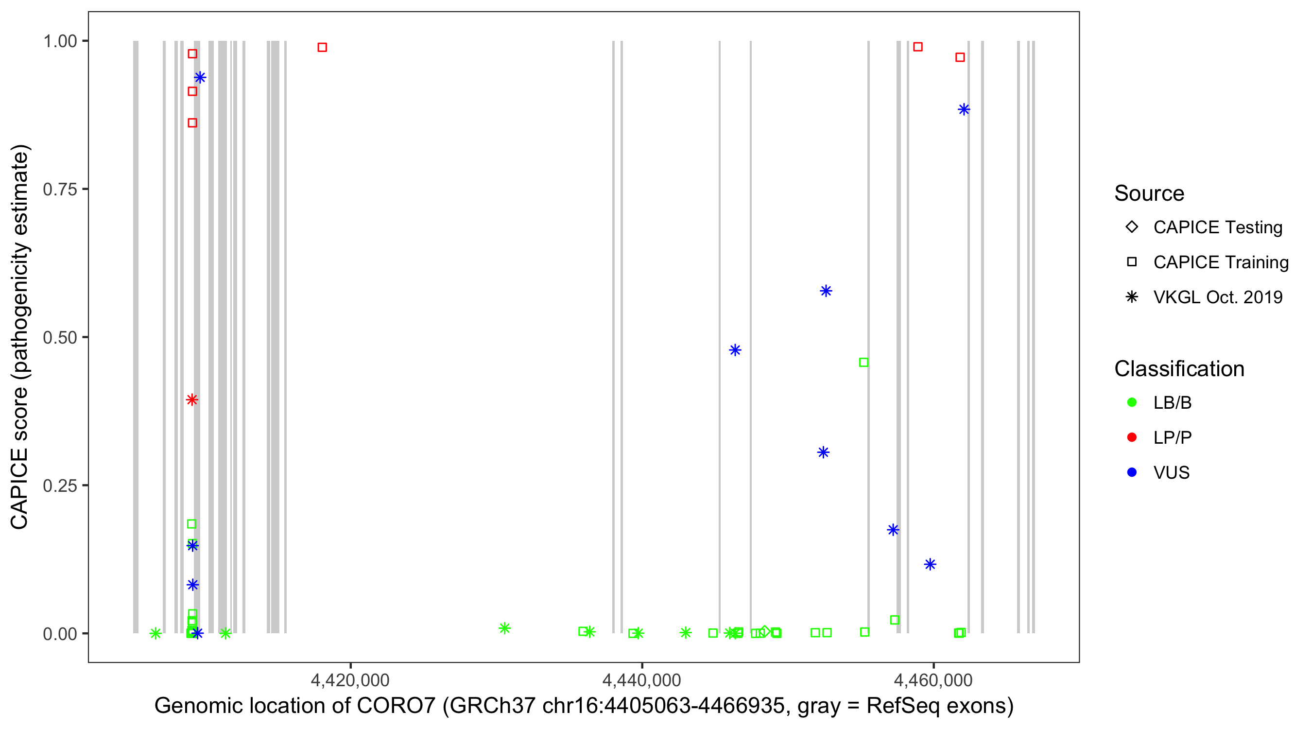 Shown are CAPICE train/test variants plus VKGL Oct 2019.