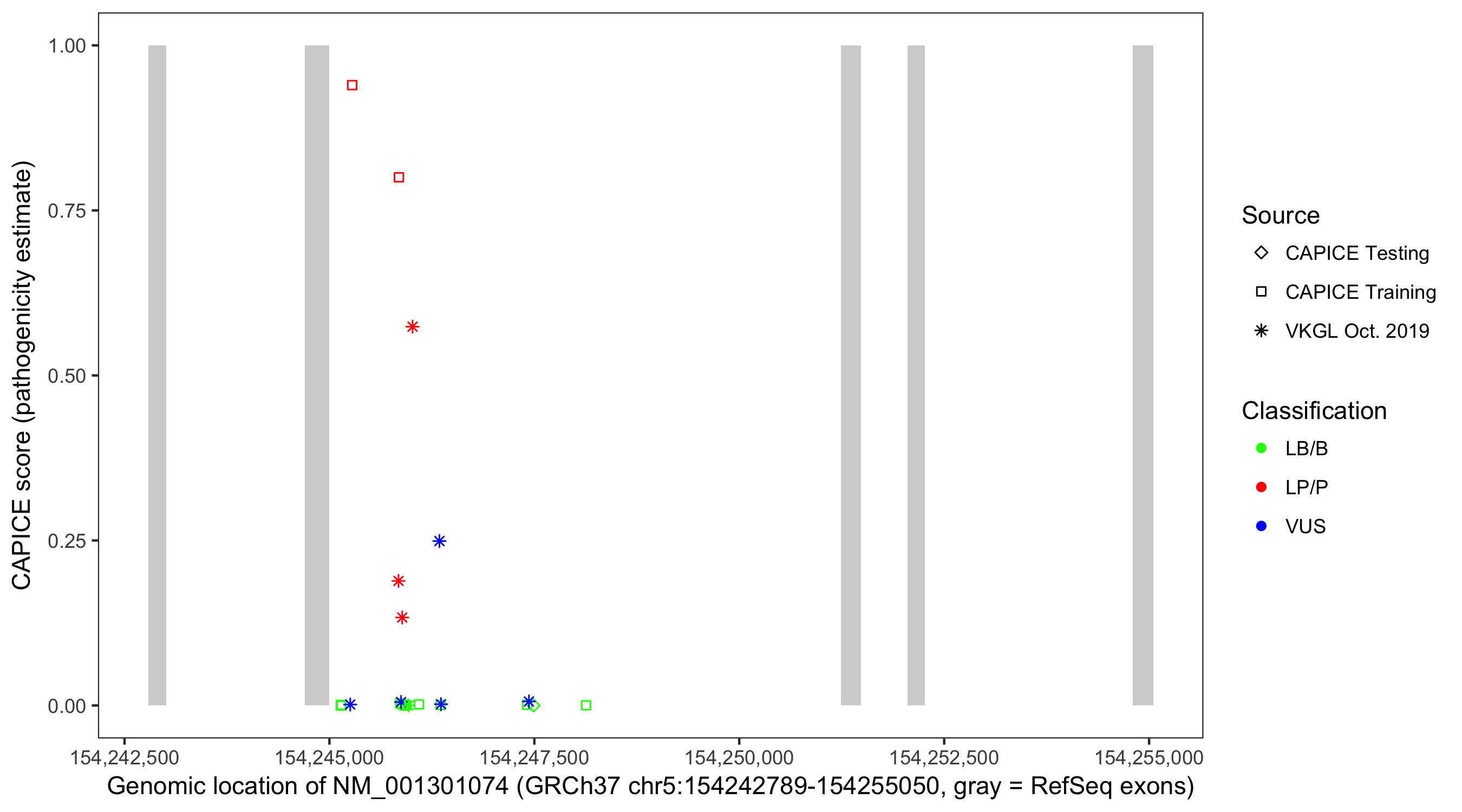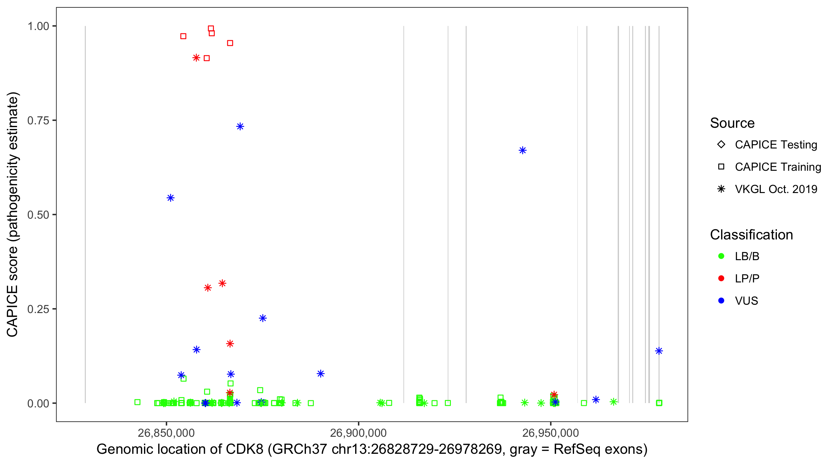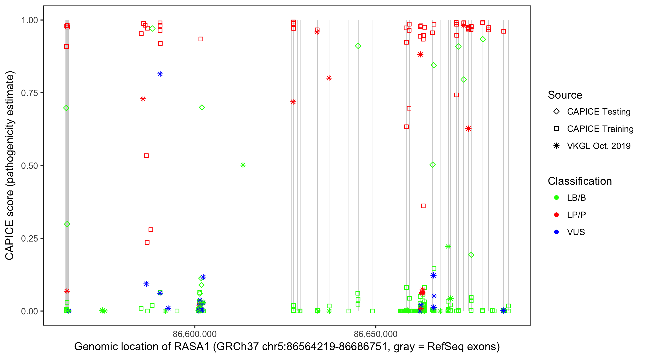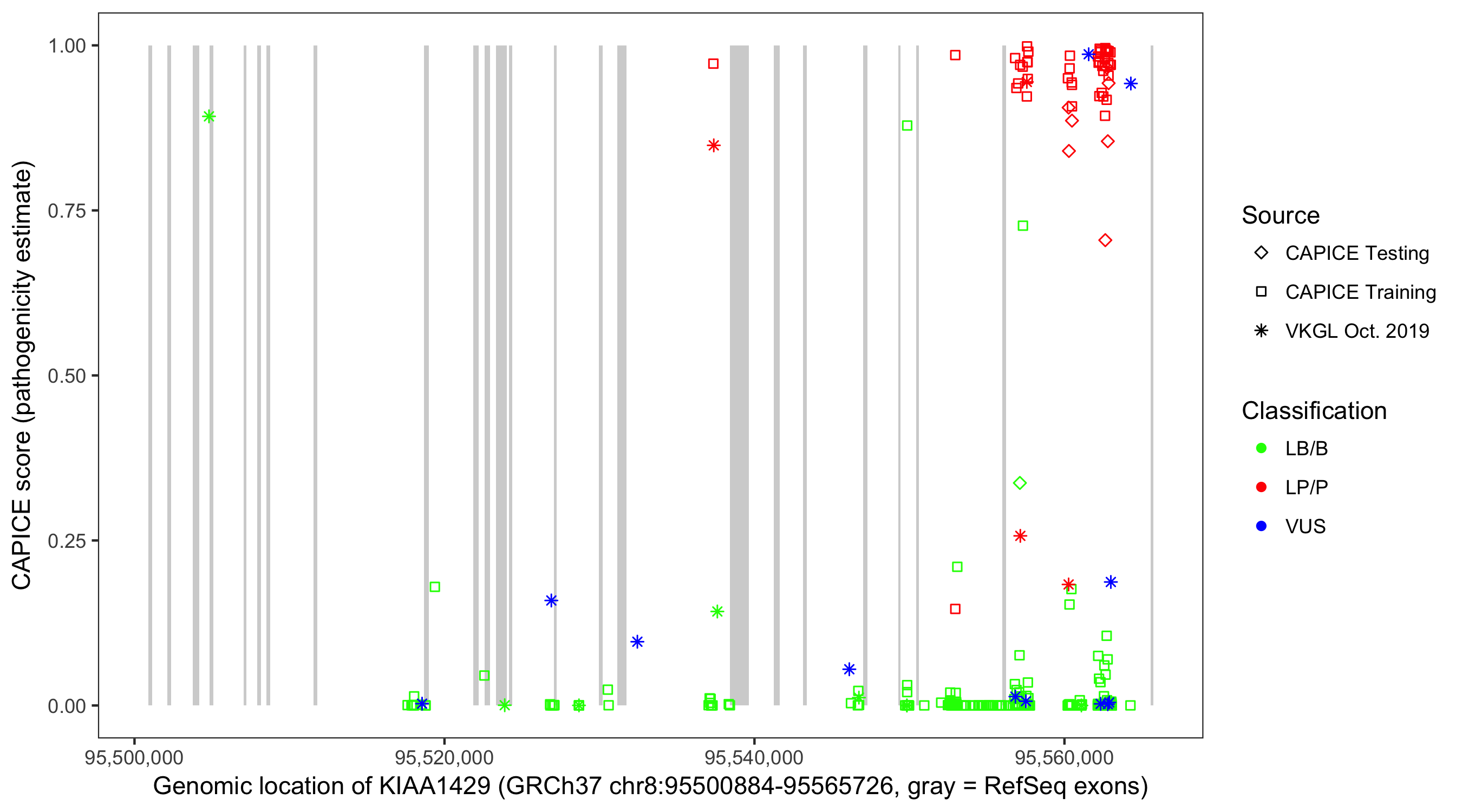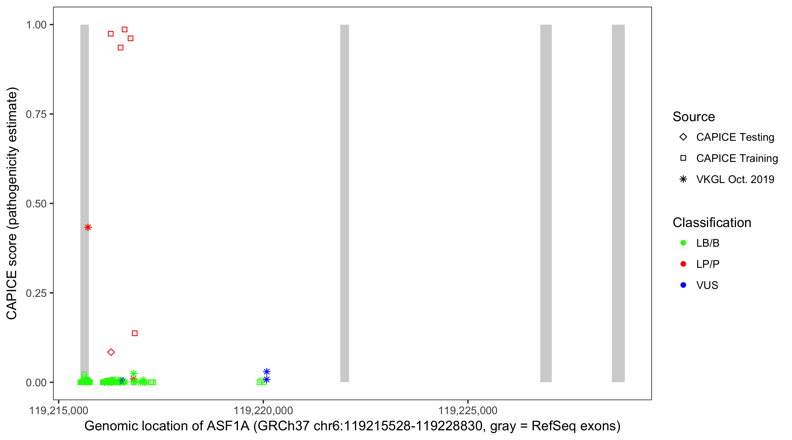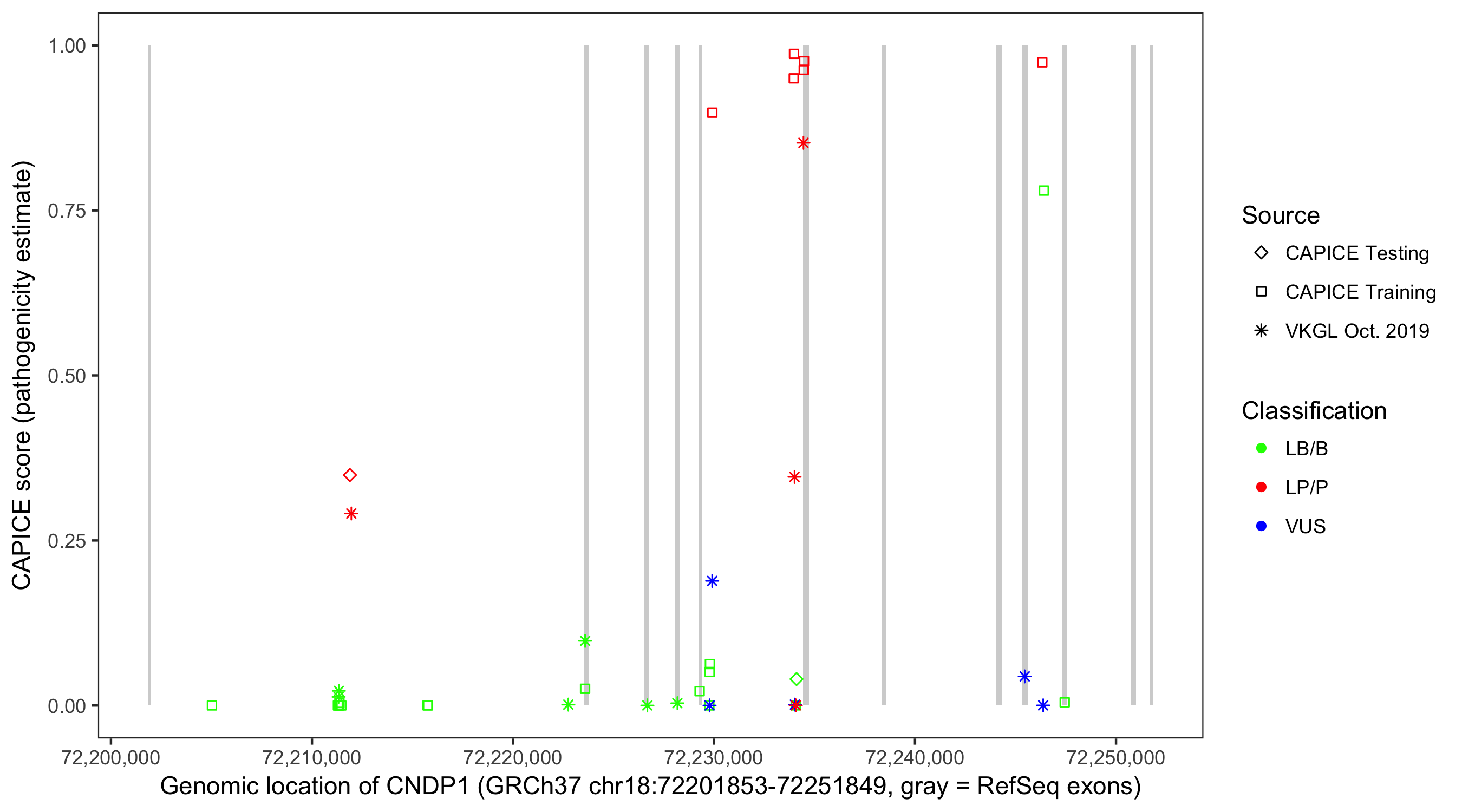 Shown are CAPICE train/test variants plus VKGL Oct 2019.