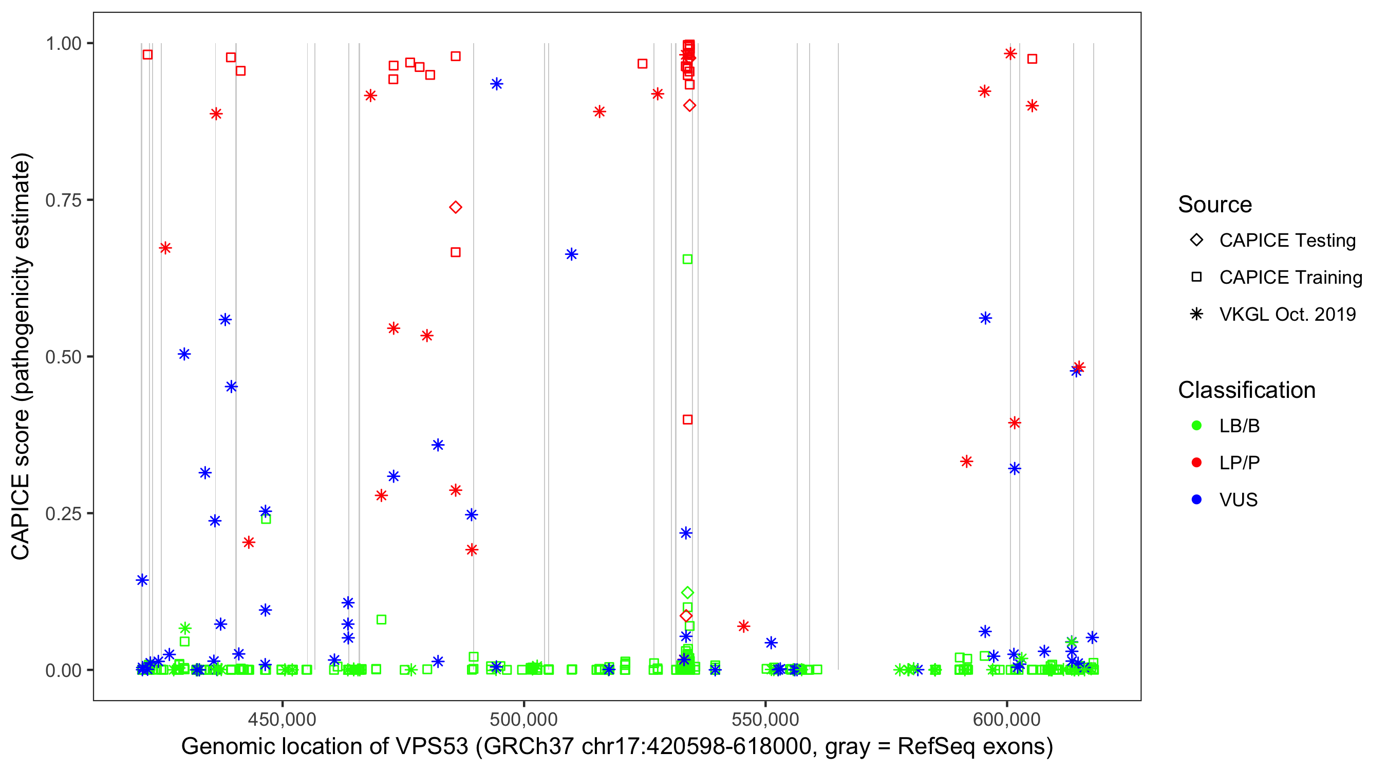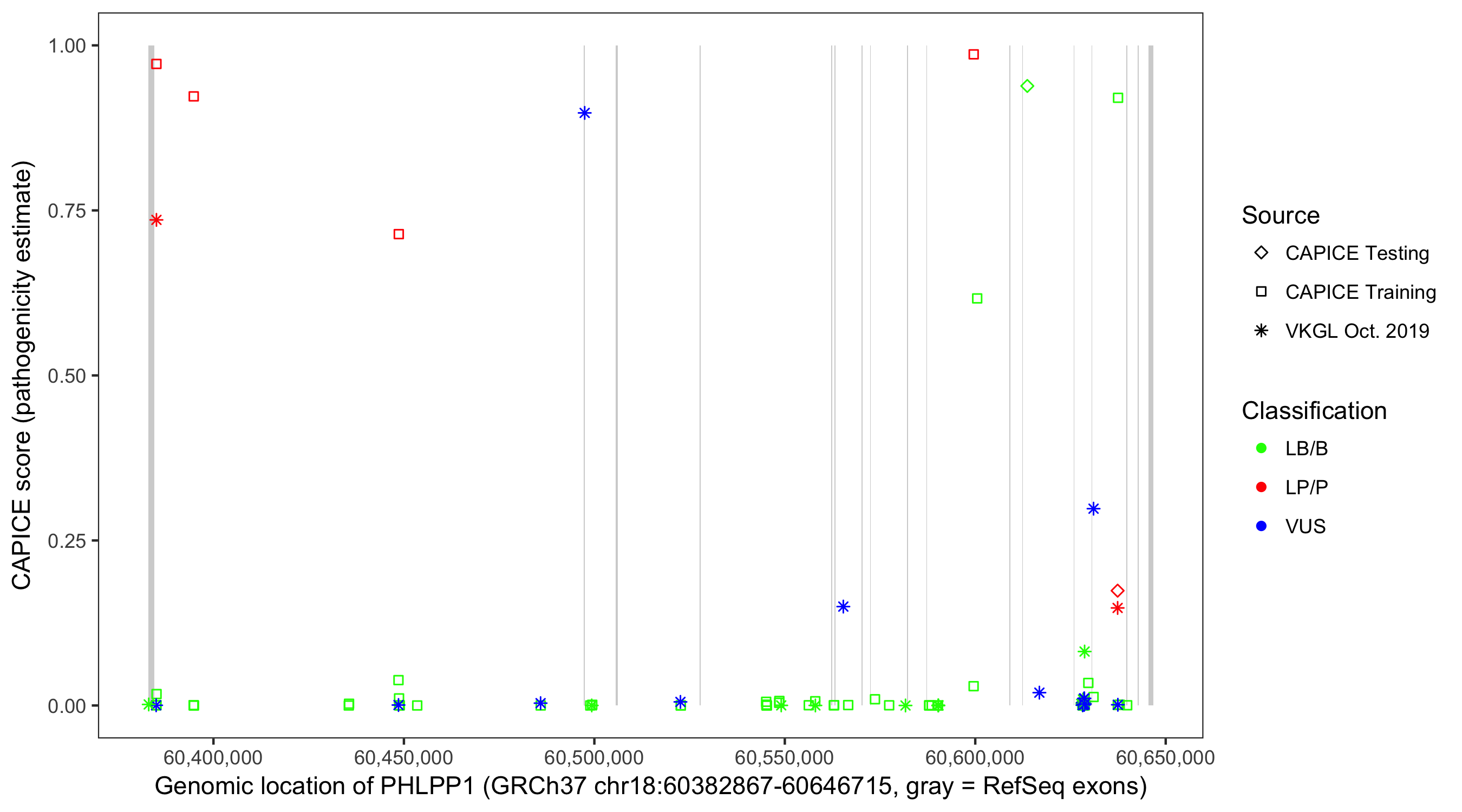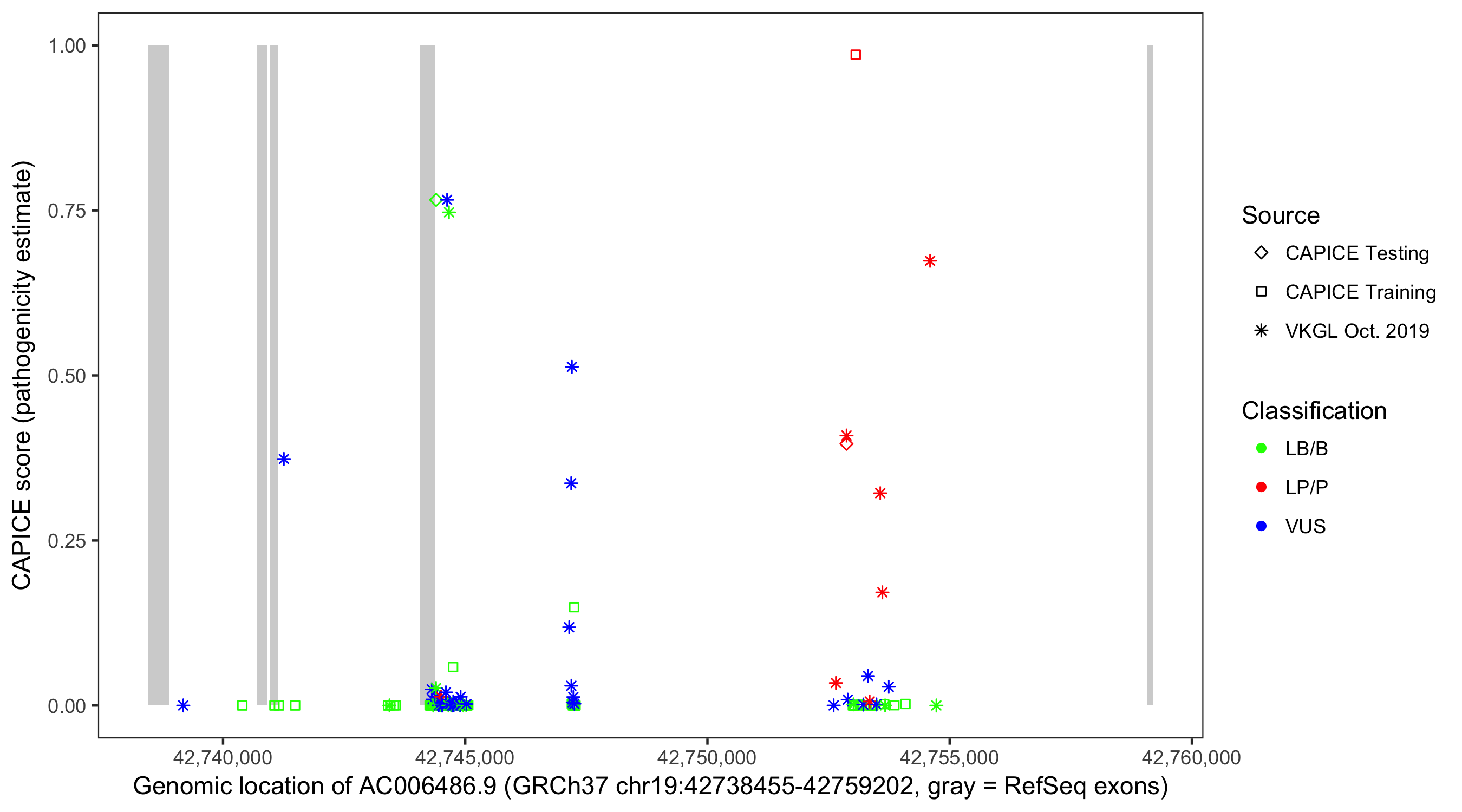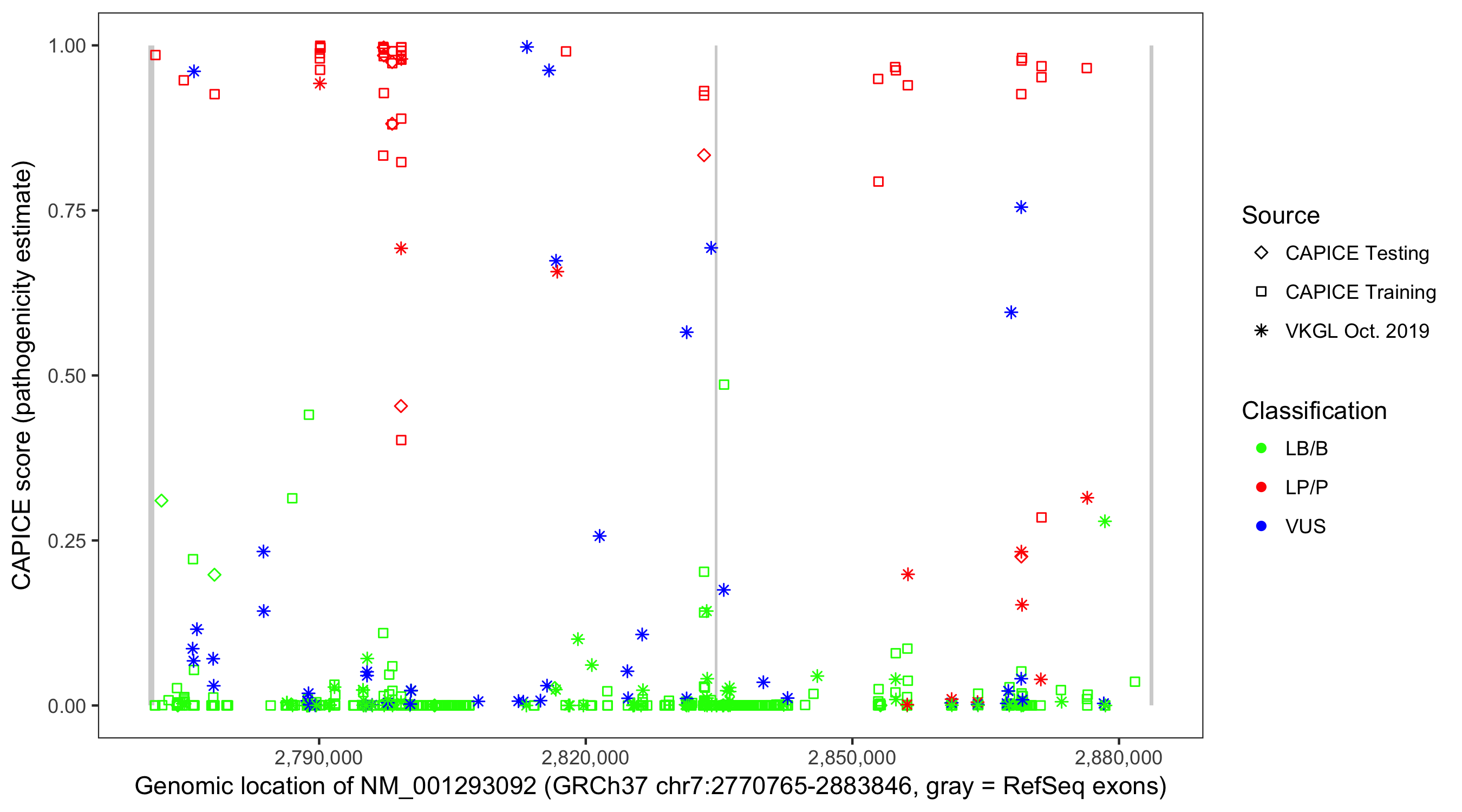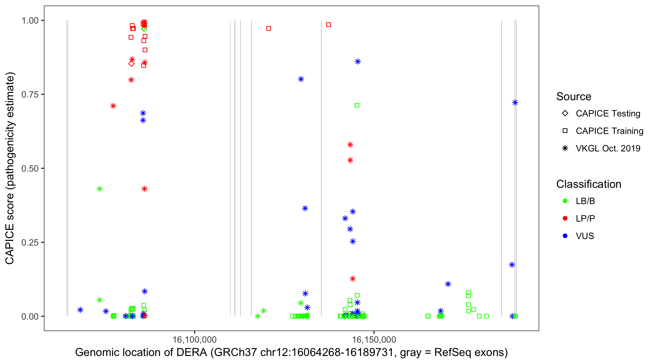 Shown are CAPICE train/test variants plus VKGL Oct 2019.