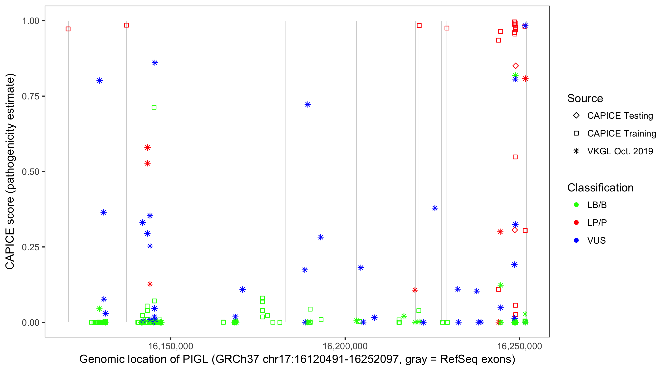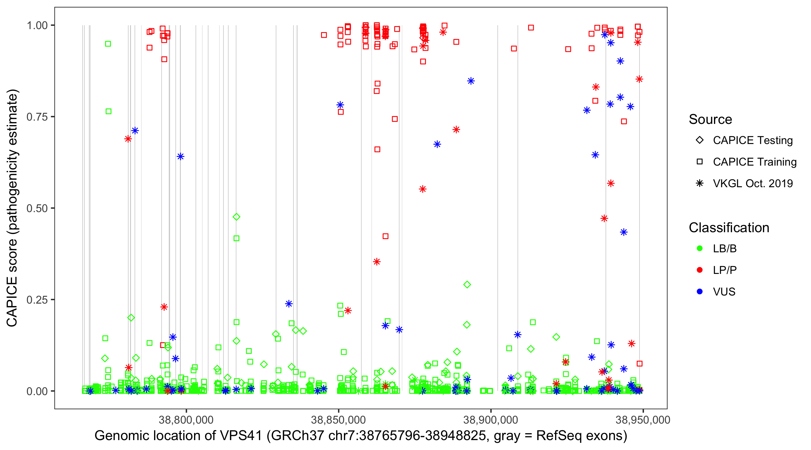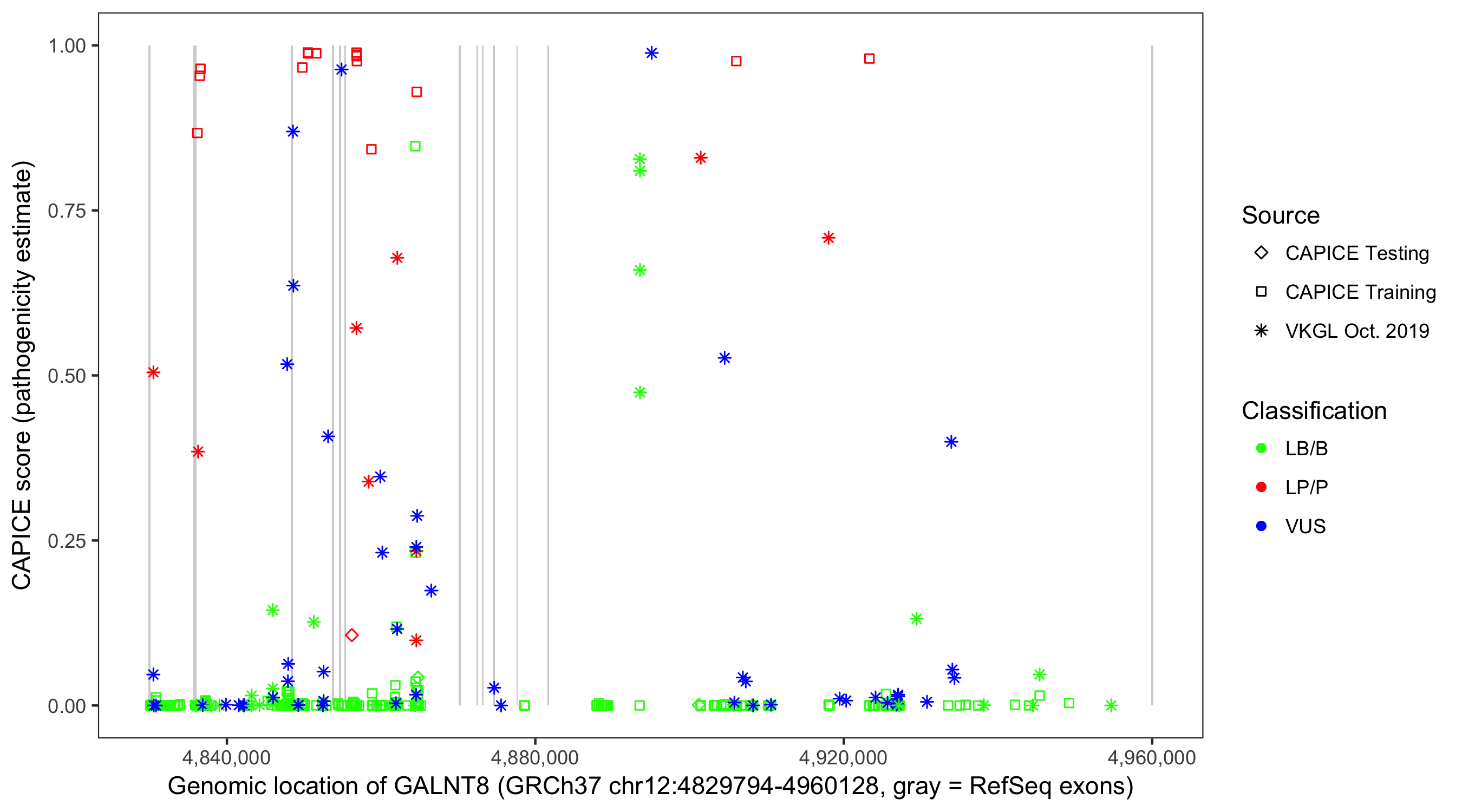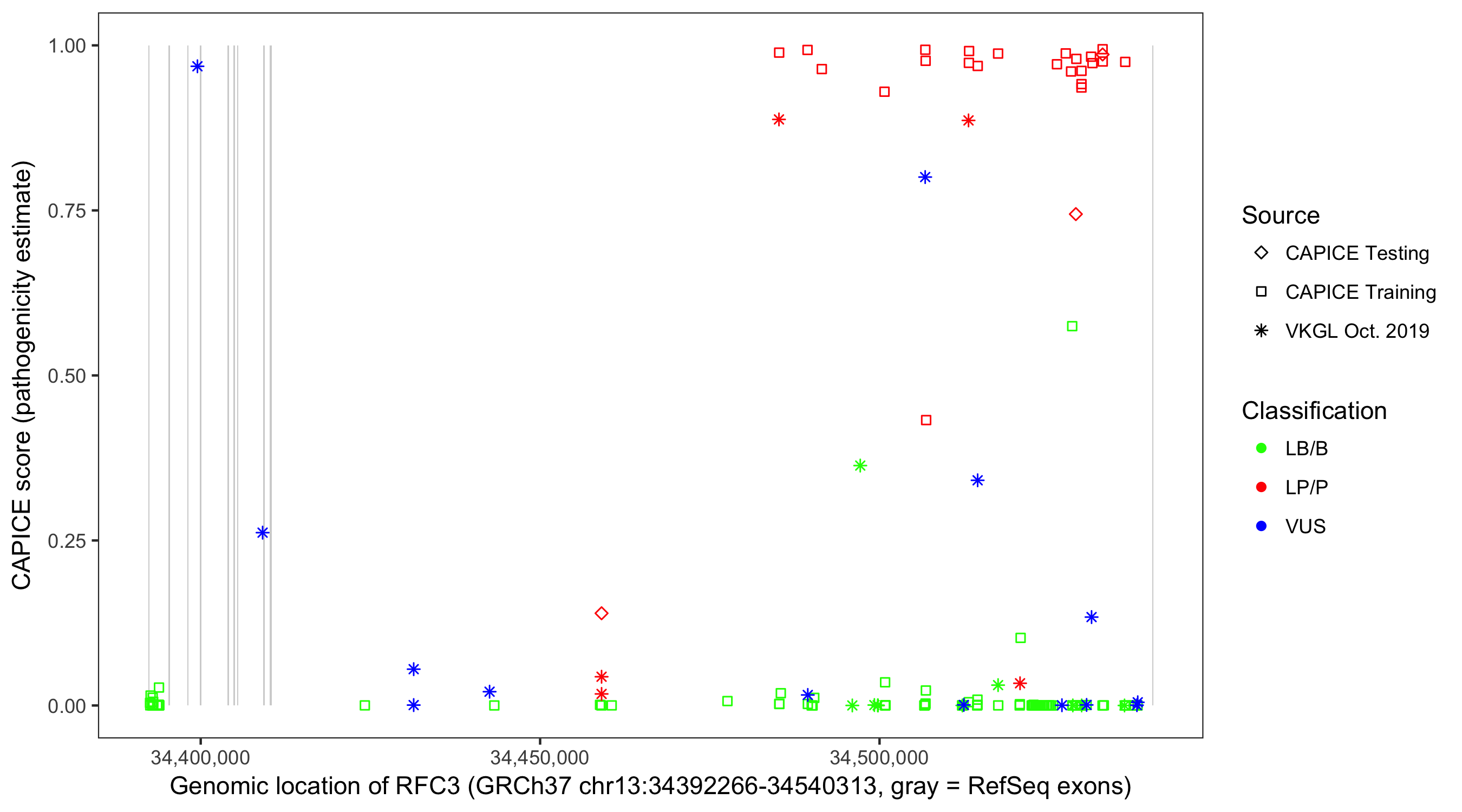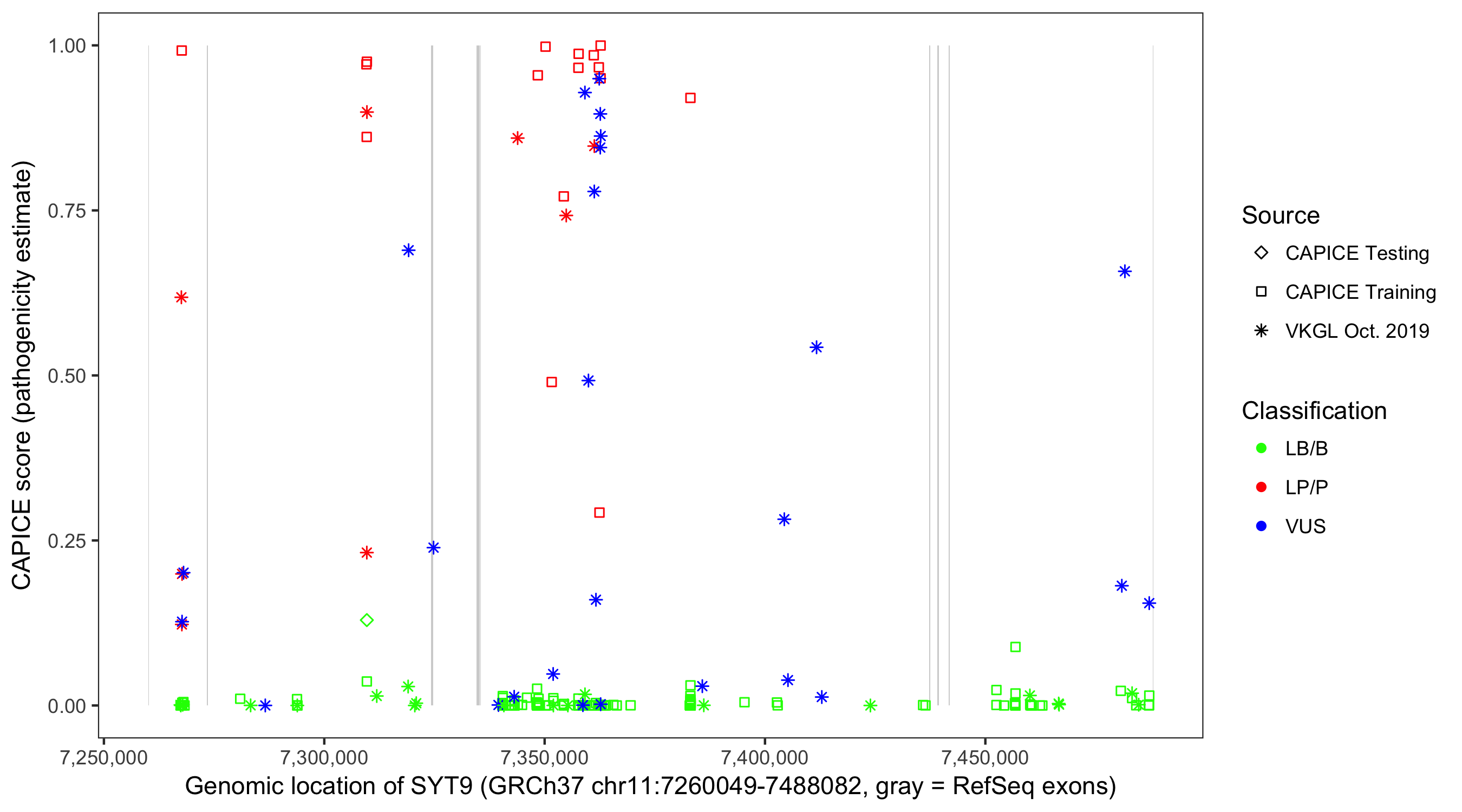 Shown are CAPICE train/test variants plus VKGL Oct 2019.