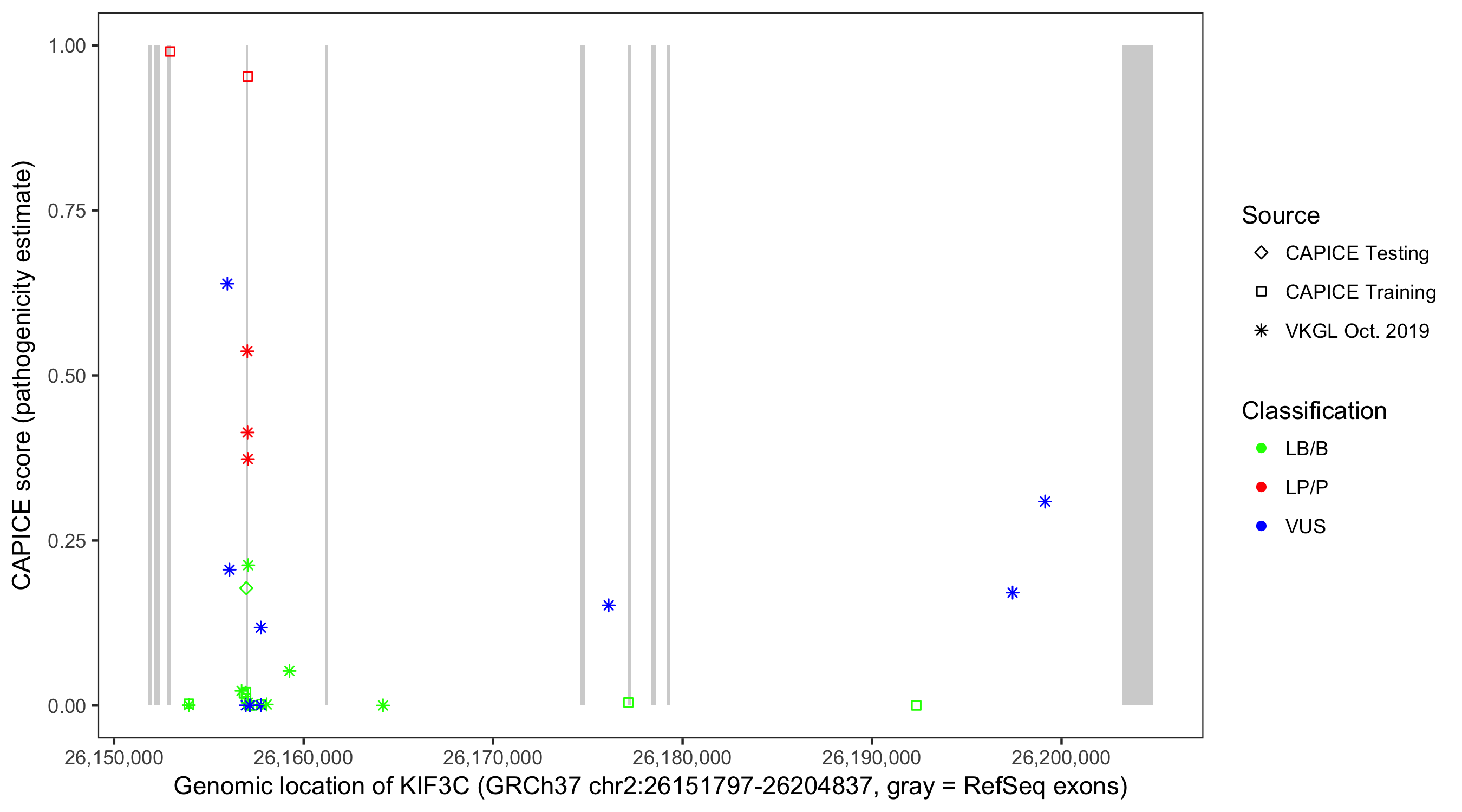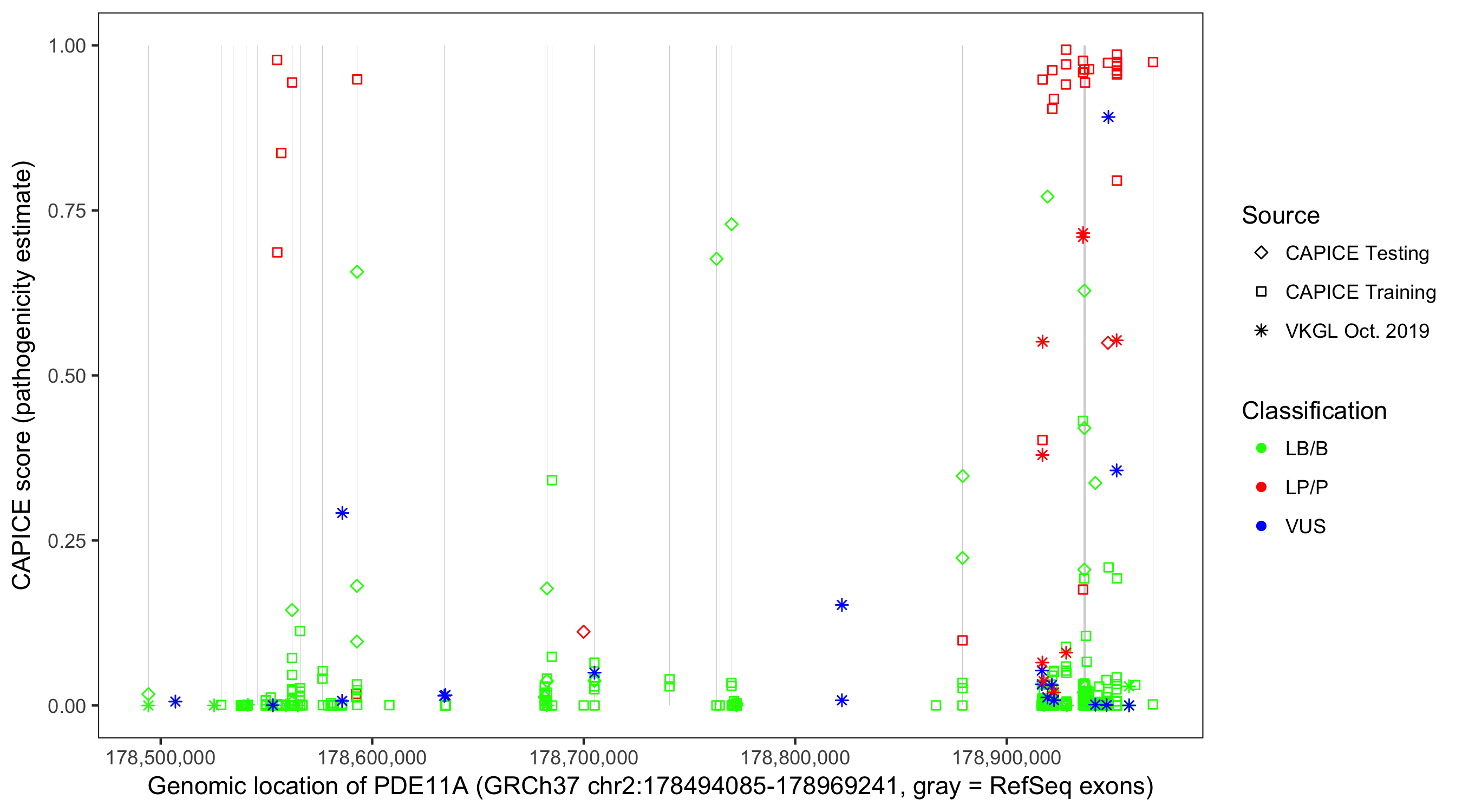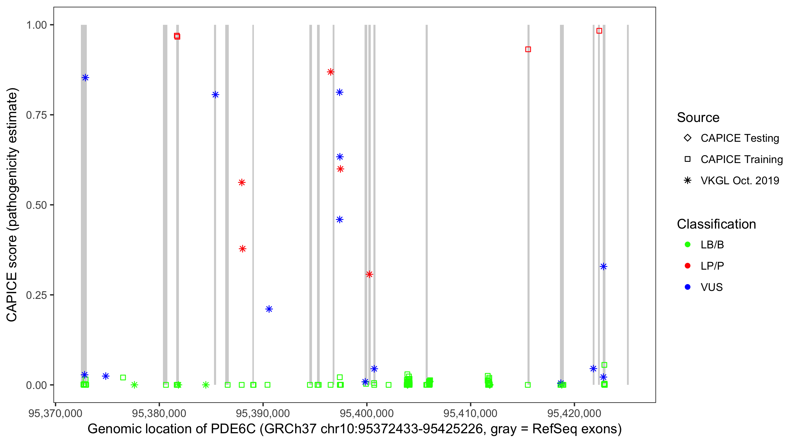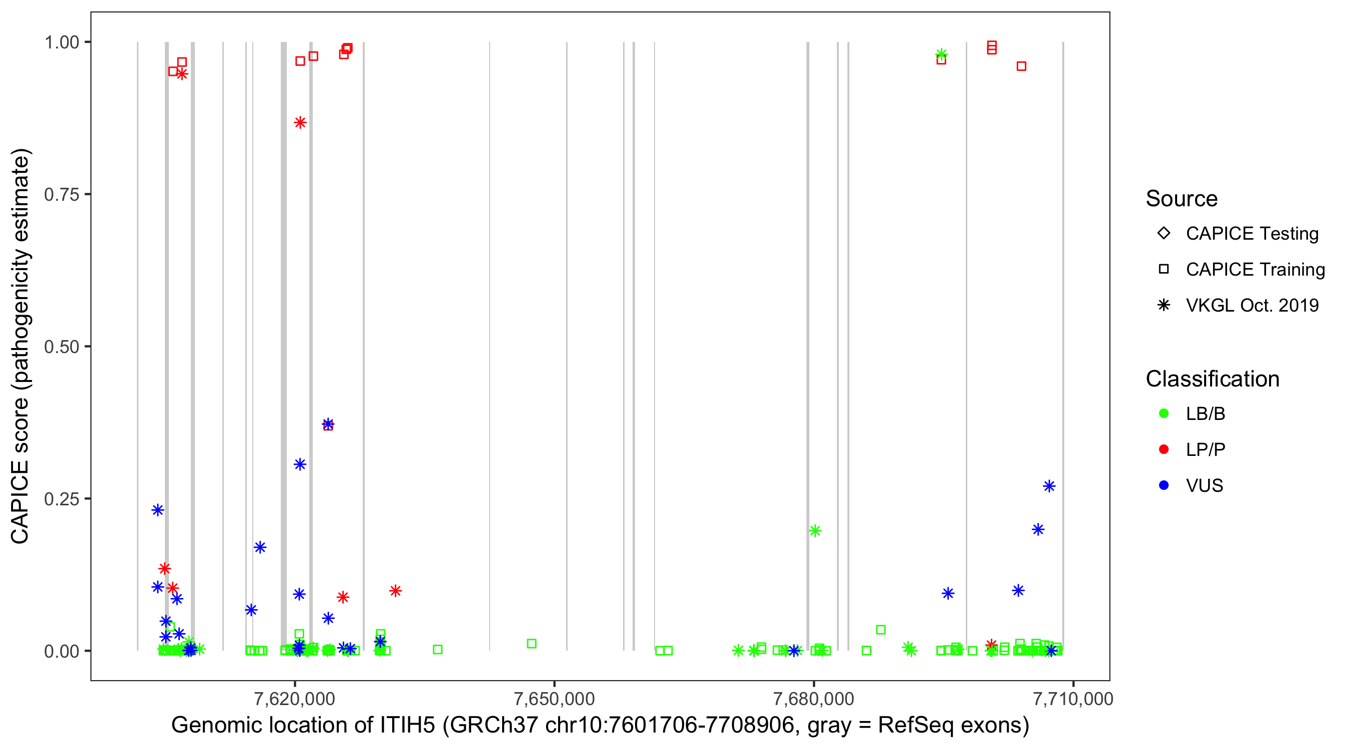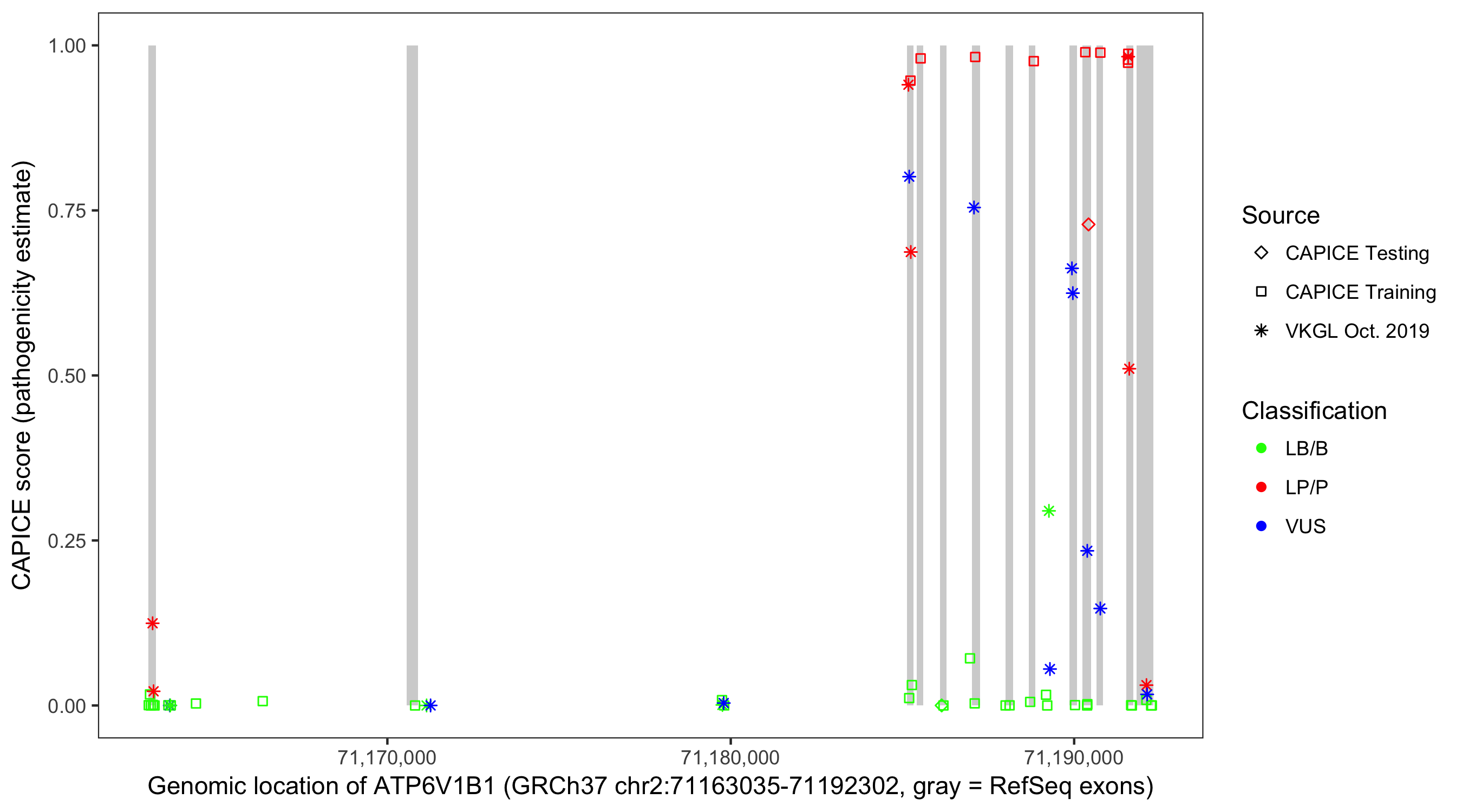Shown are CAPICE train/test variants plus VKGL Oct 2019.