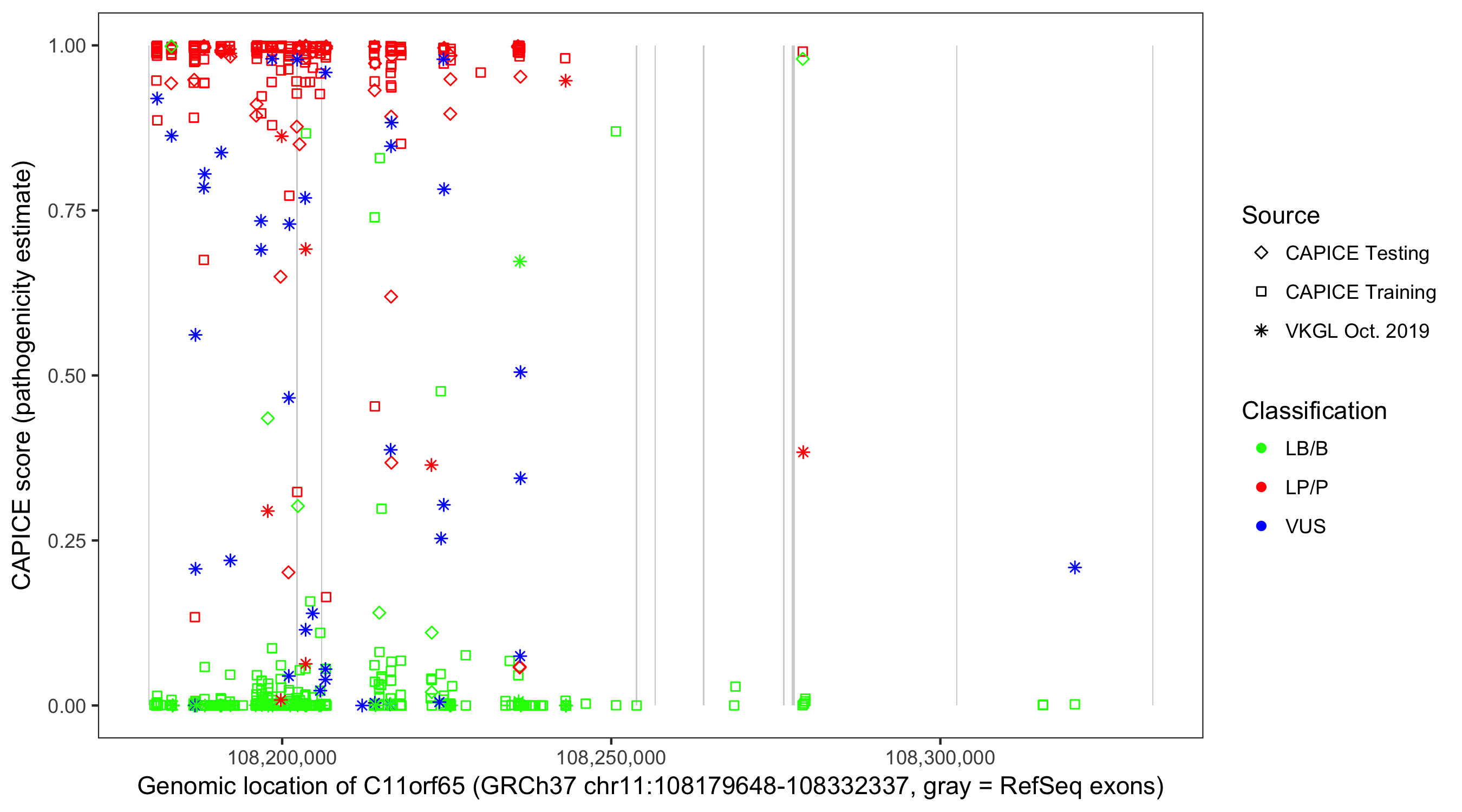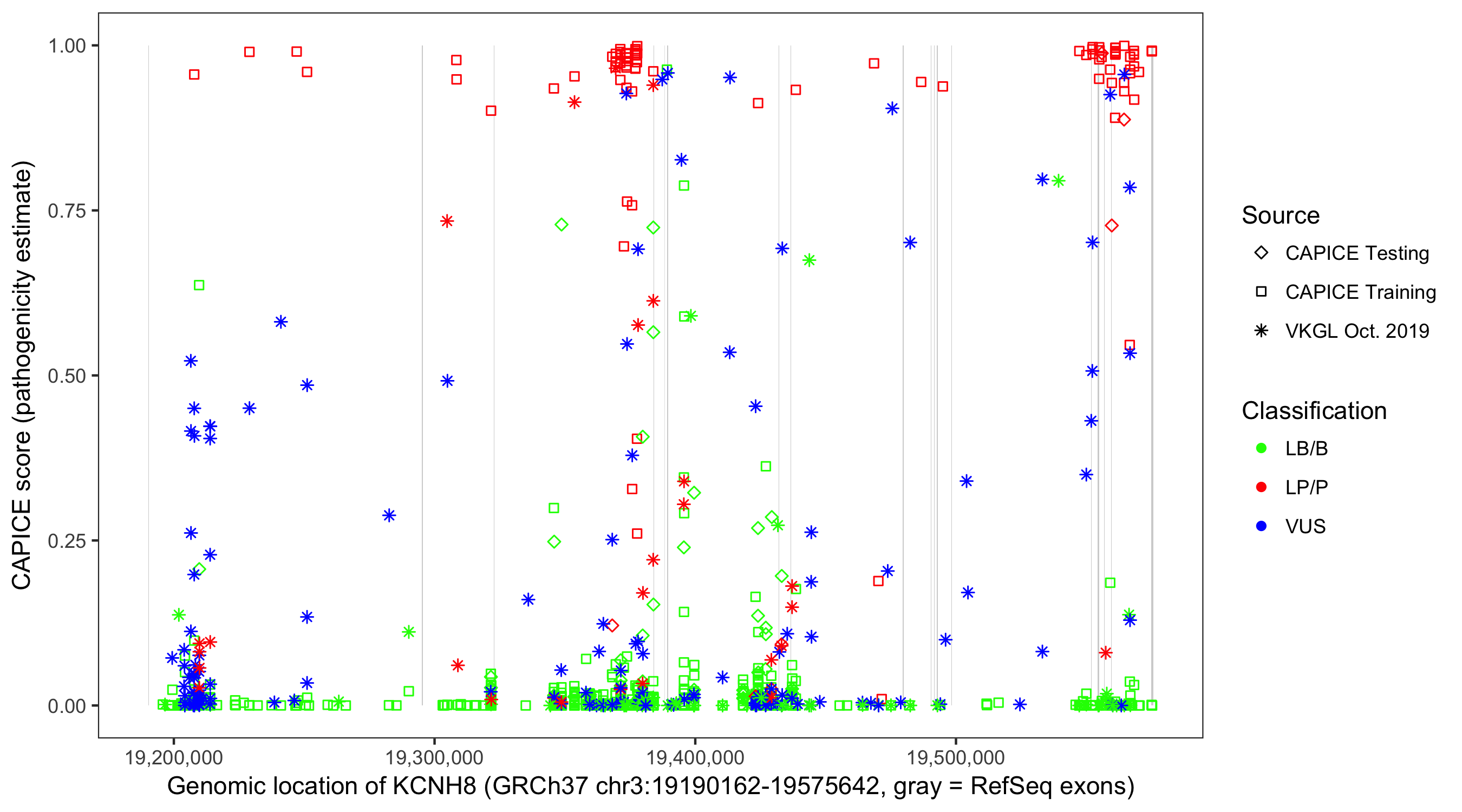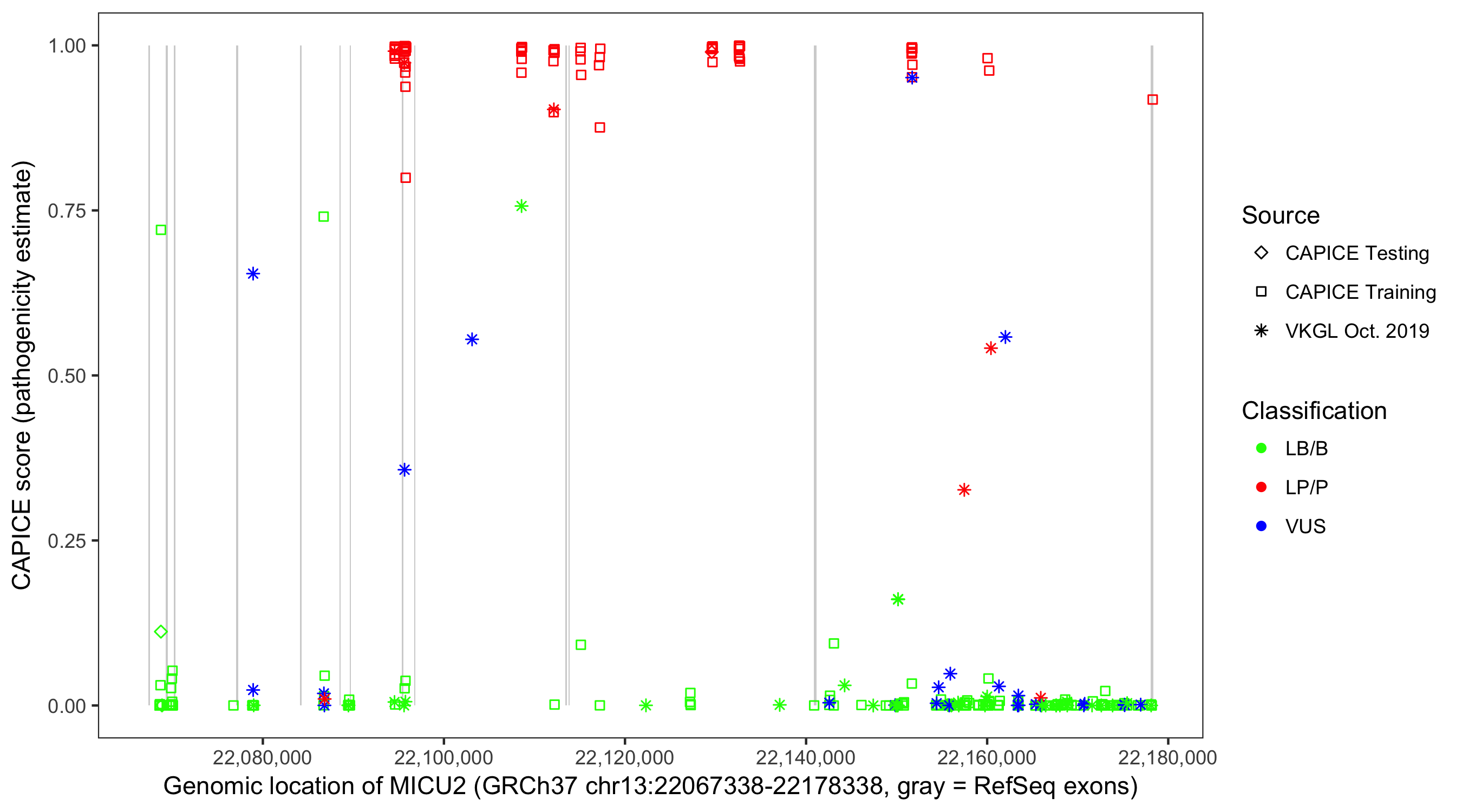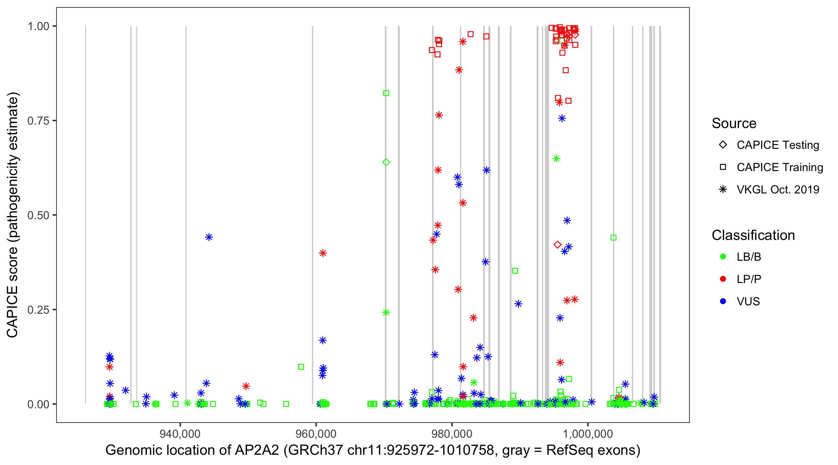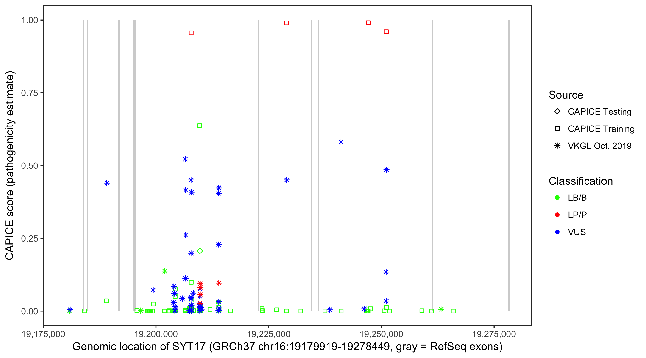 Shown are CAPICE train/test variants plus VKGL Oct 2019.