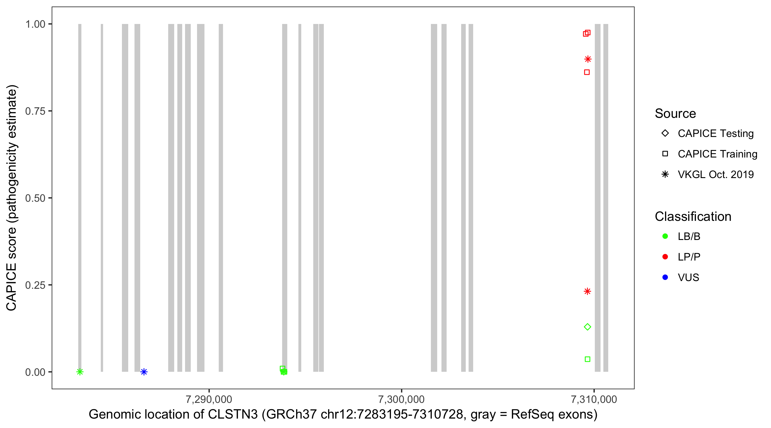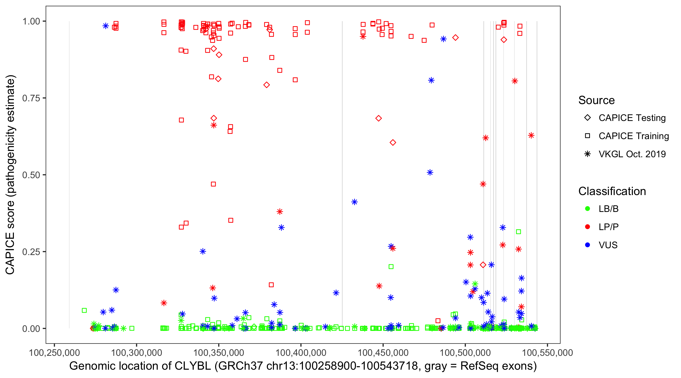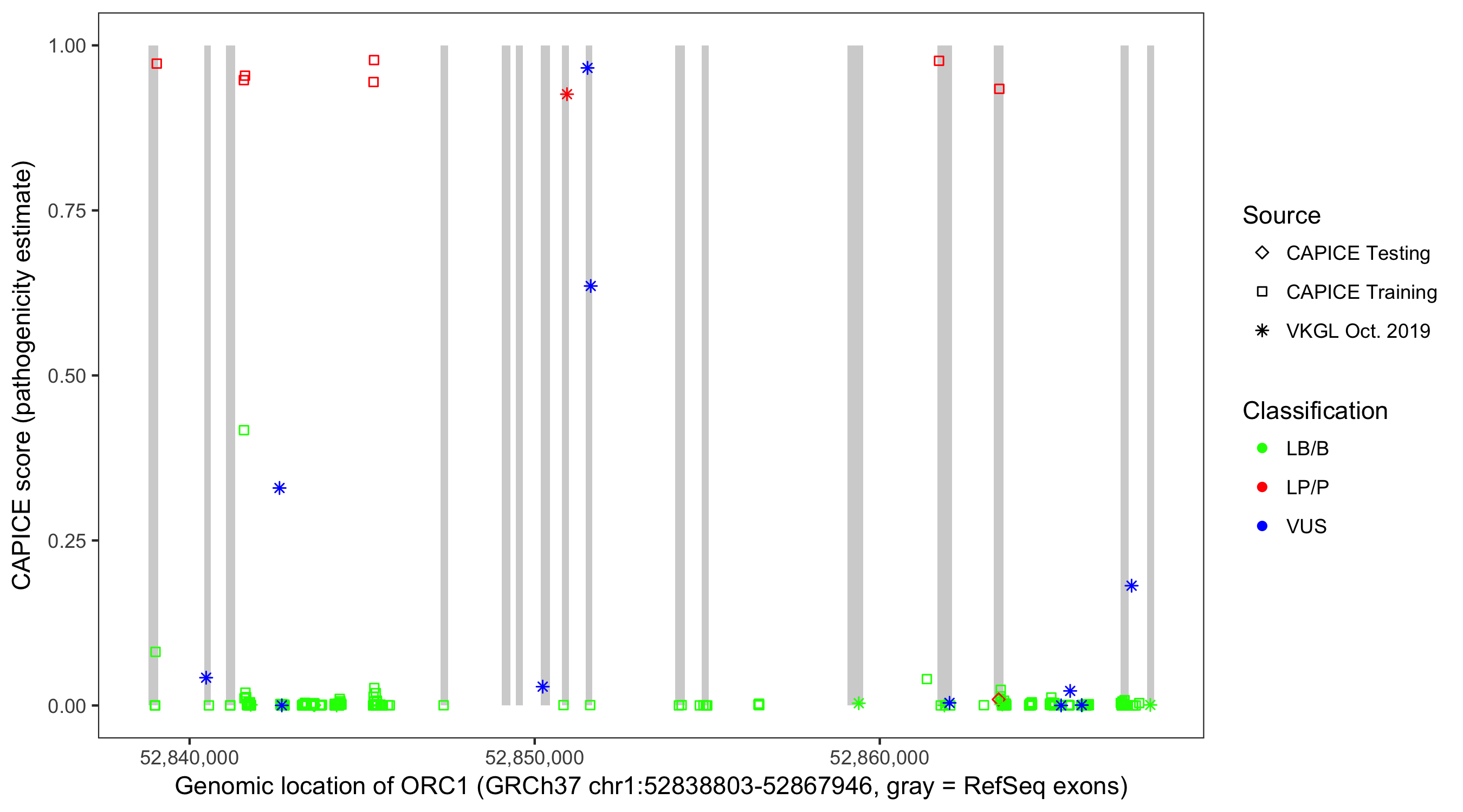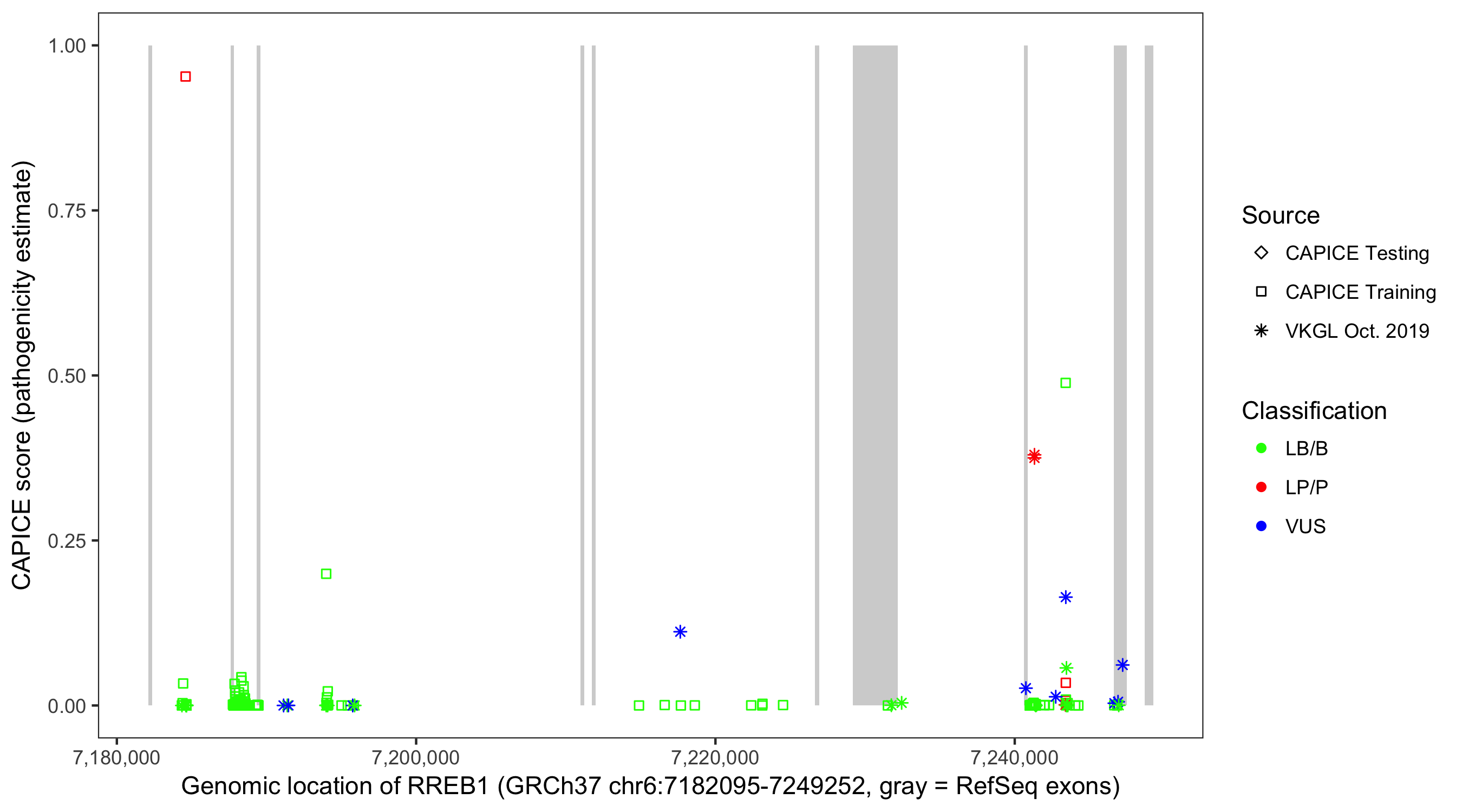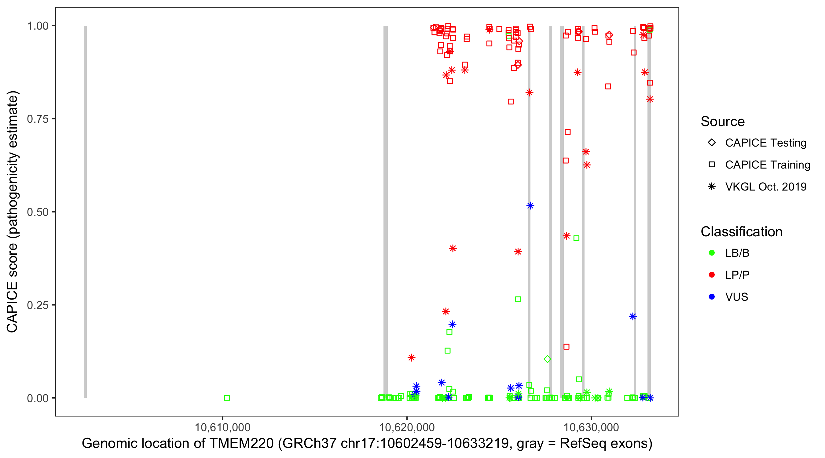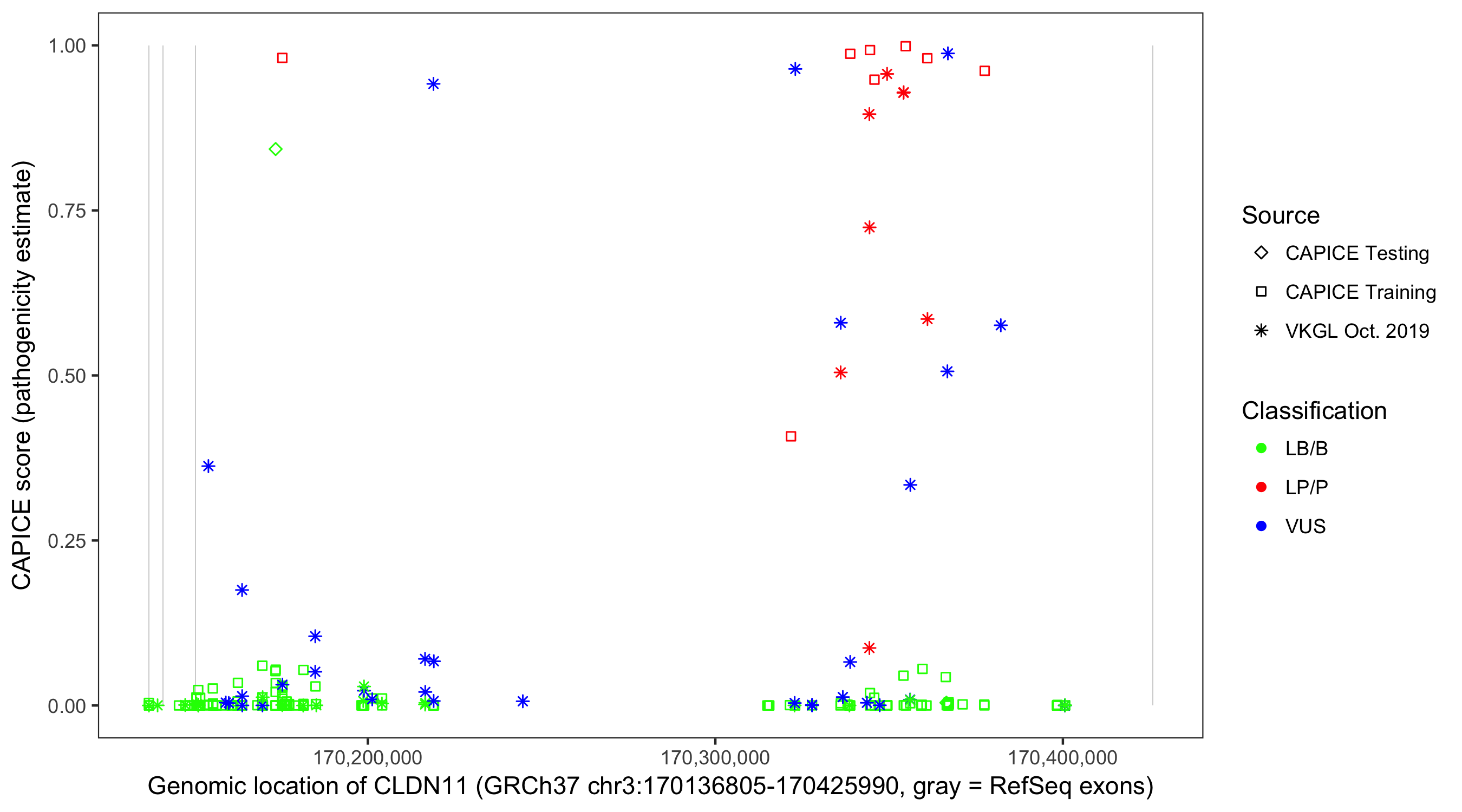 Shown are CAPICE train/test variants plus VKGL Oct 2019.