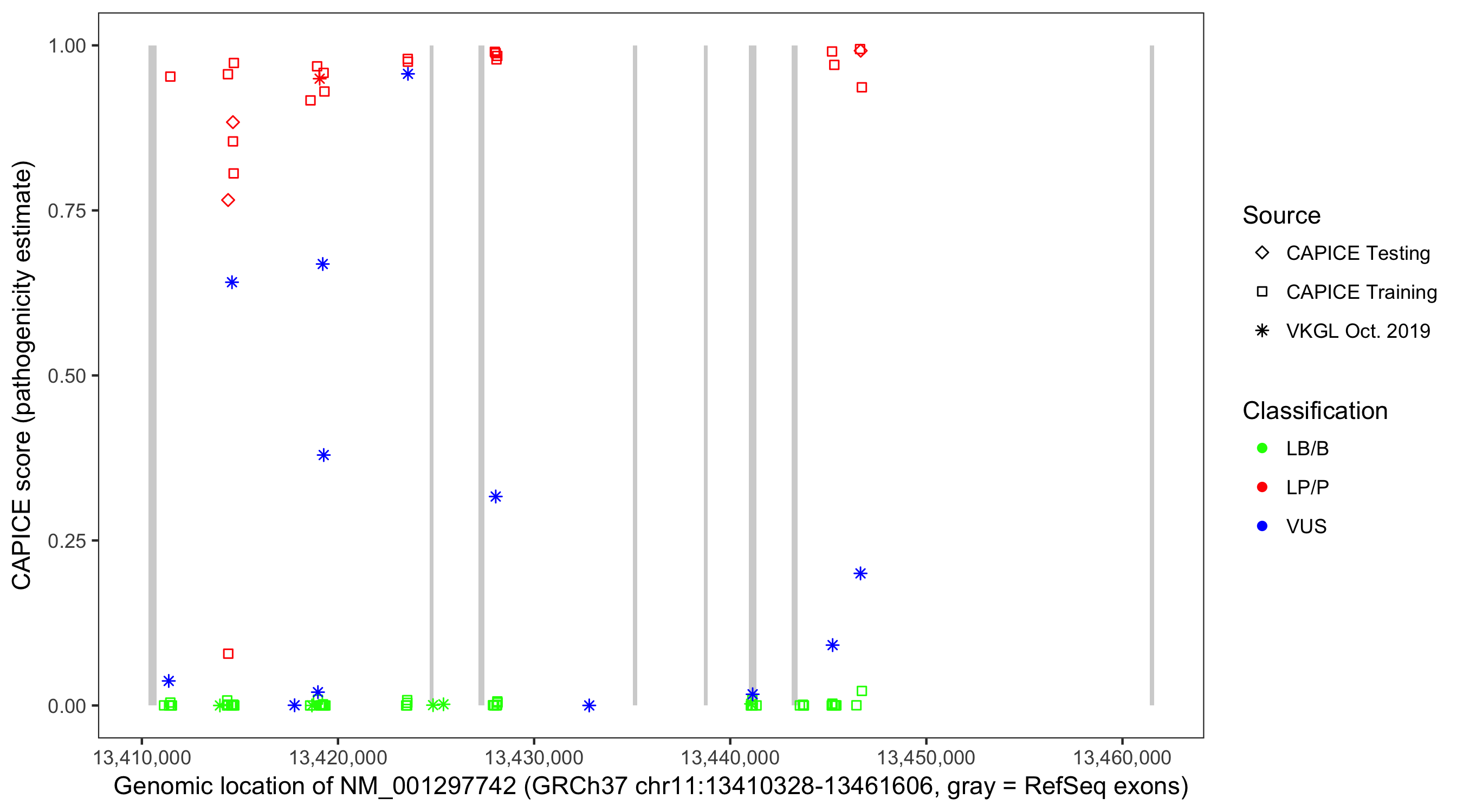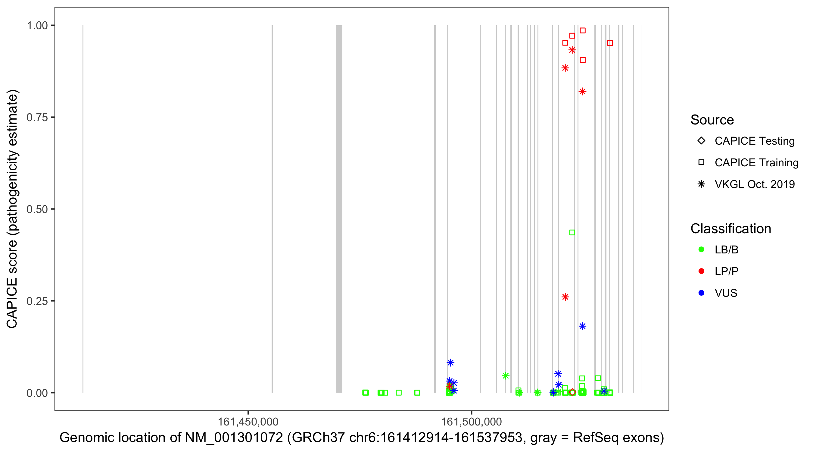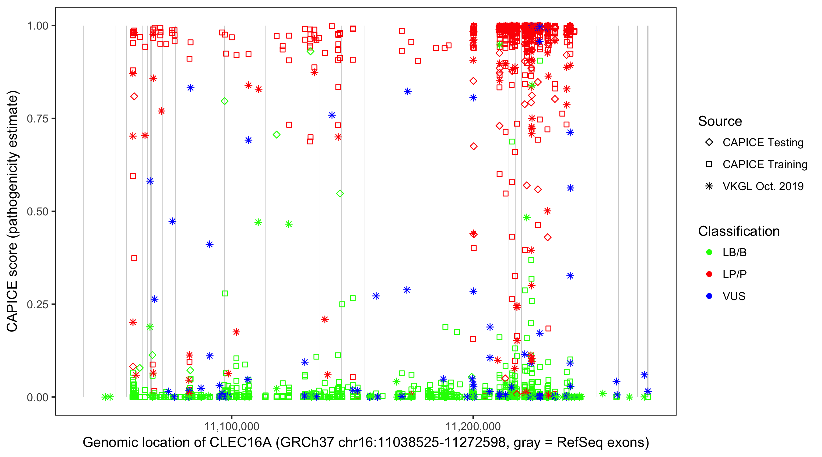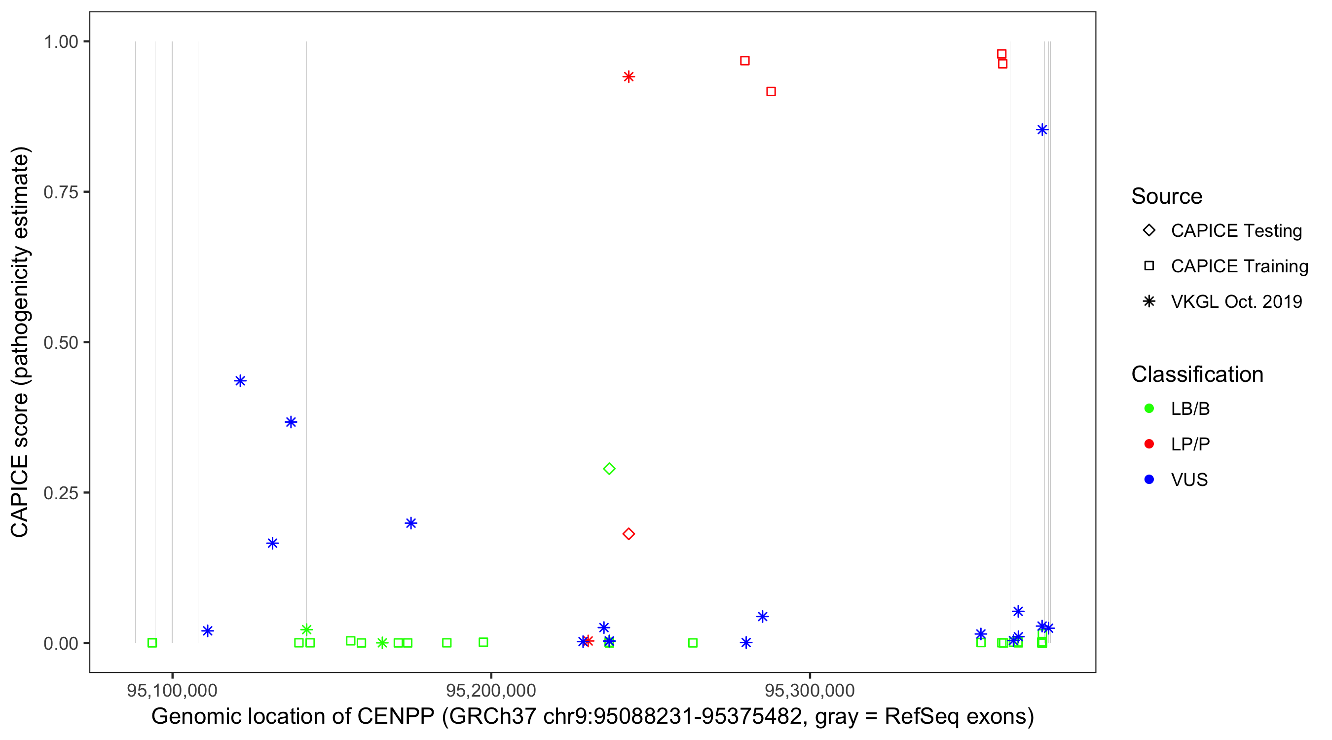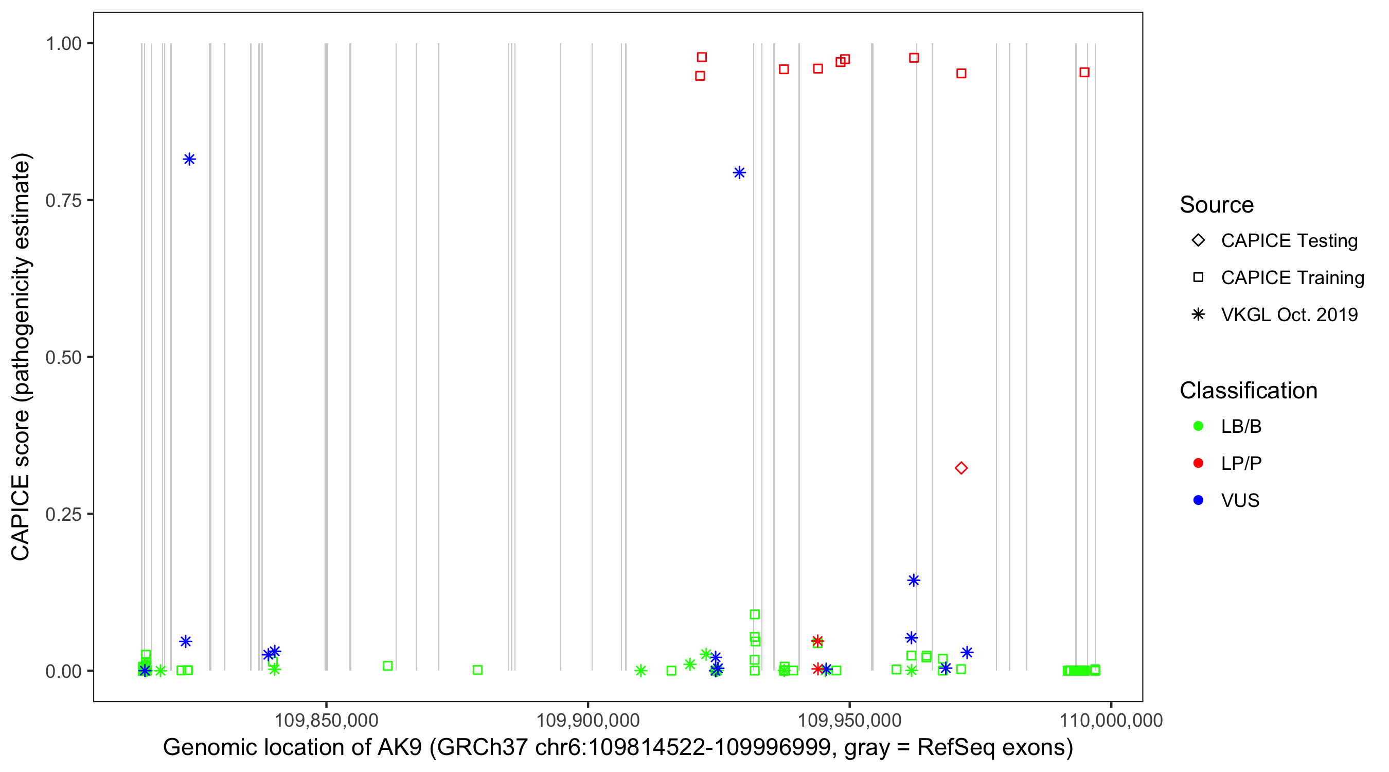 Shown are CAPICE train/test variants plus VKGL Oct 2019.