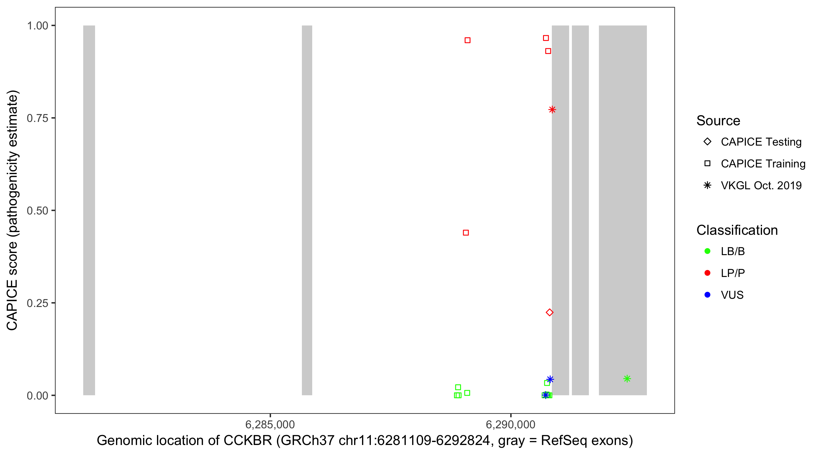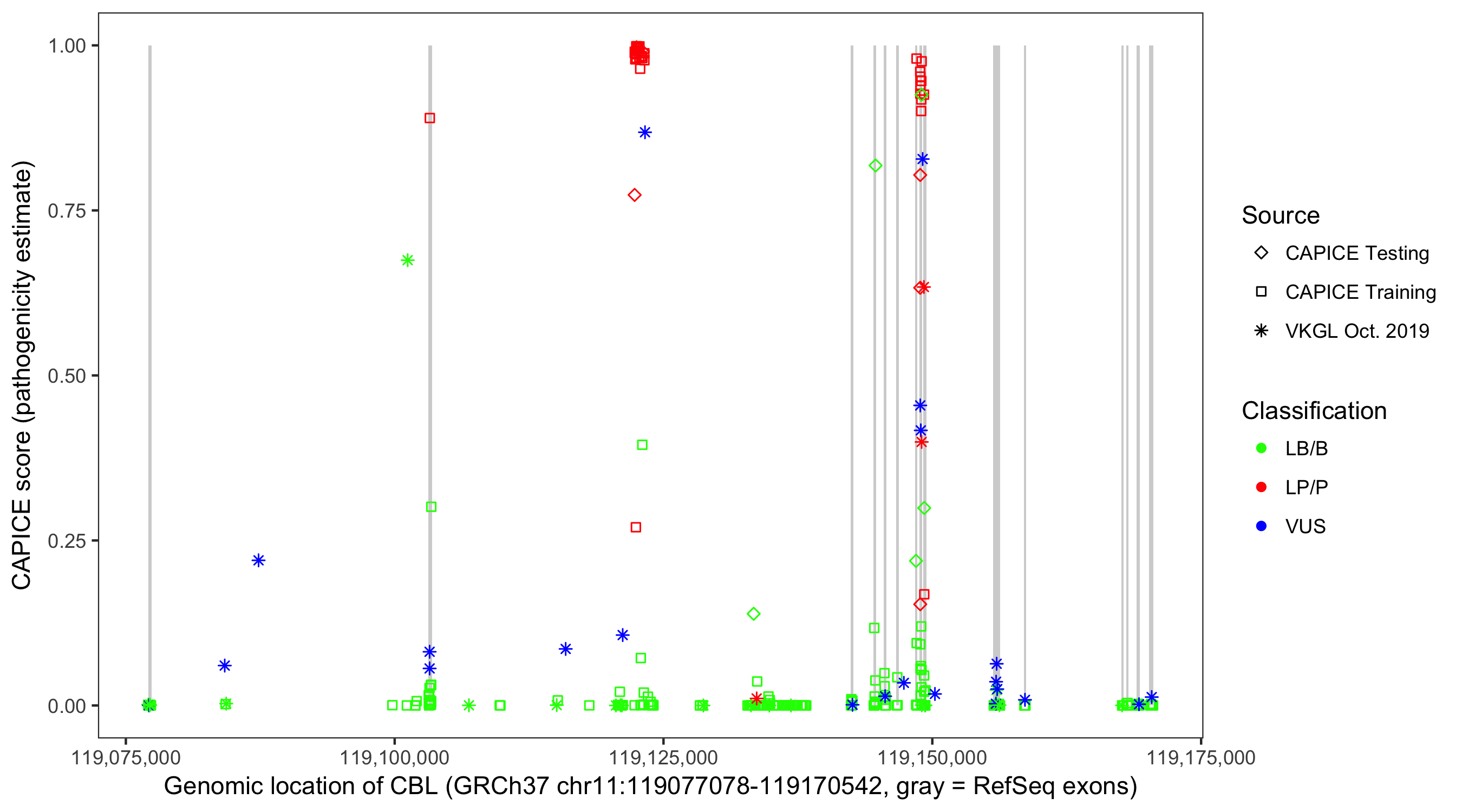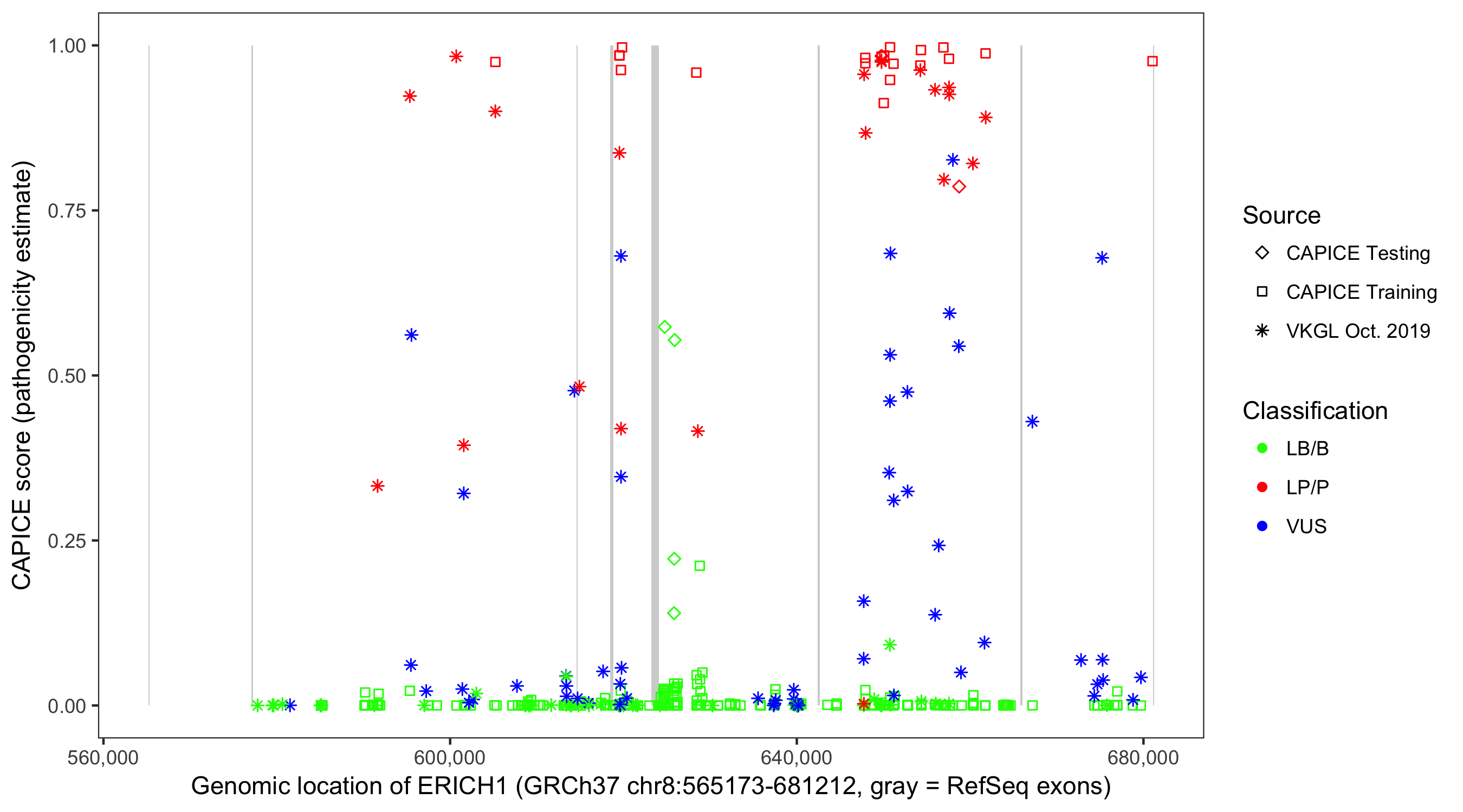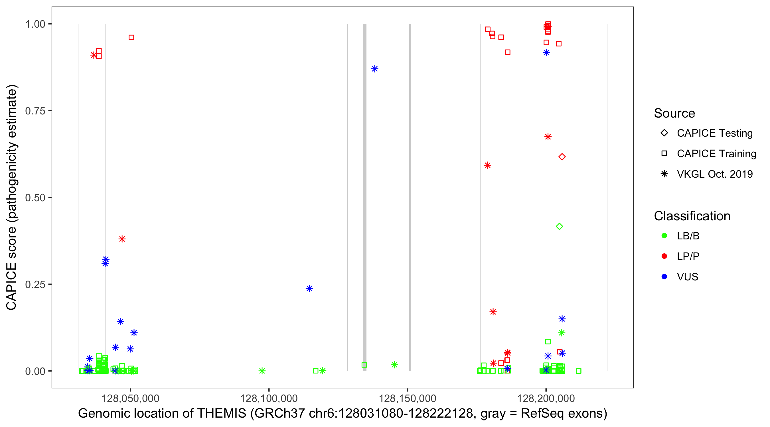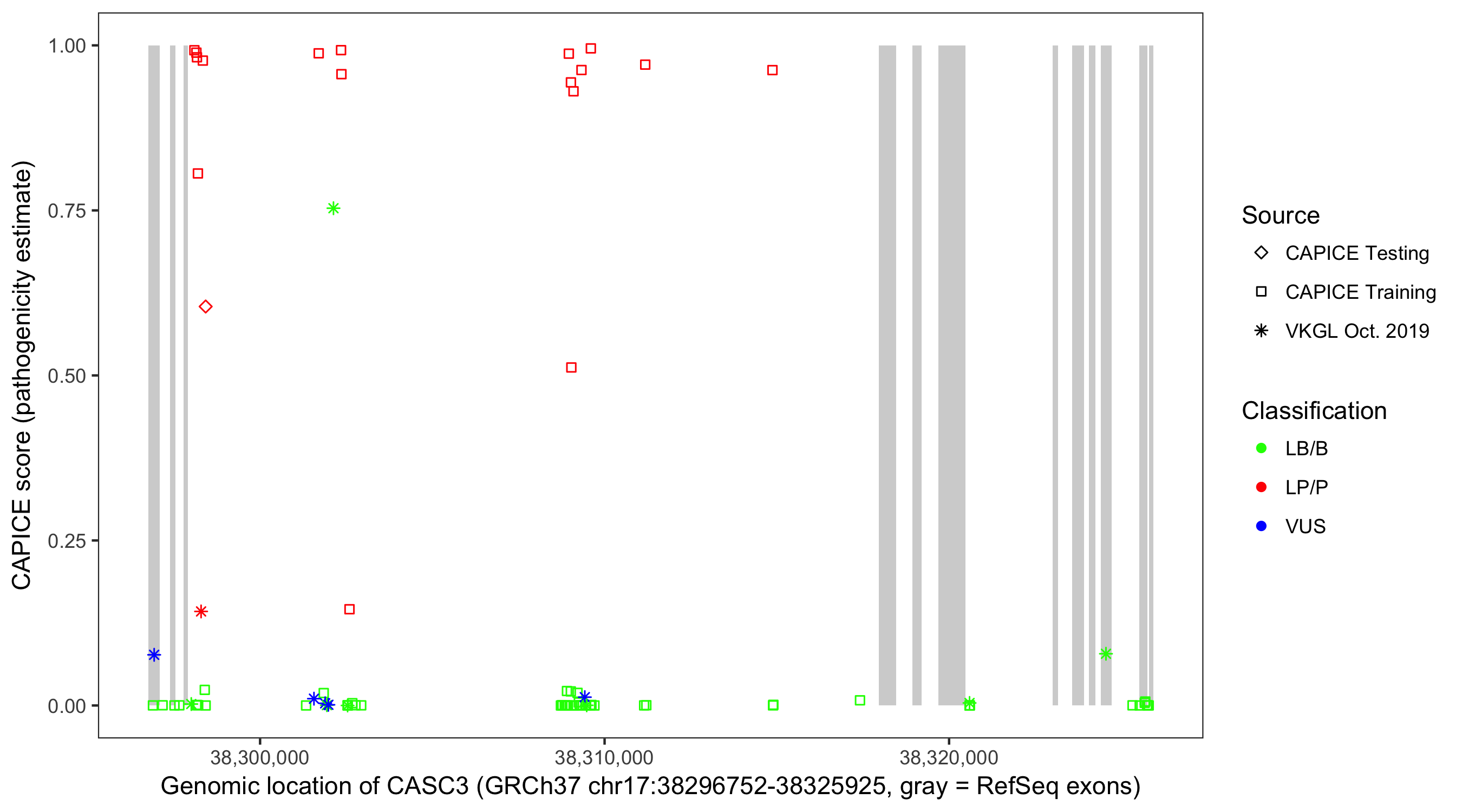 Shown are CAPICE train/test variants plus VKGL Oct 2019.