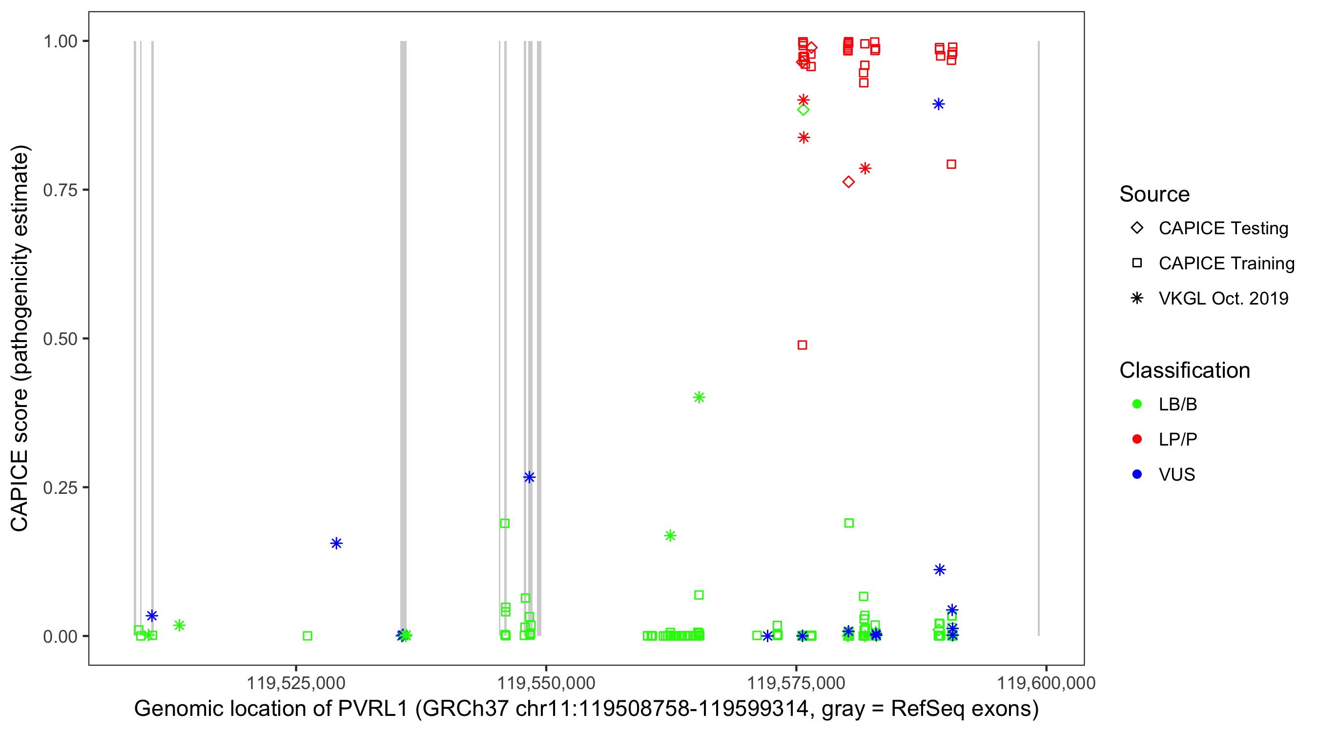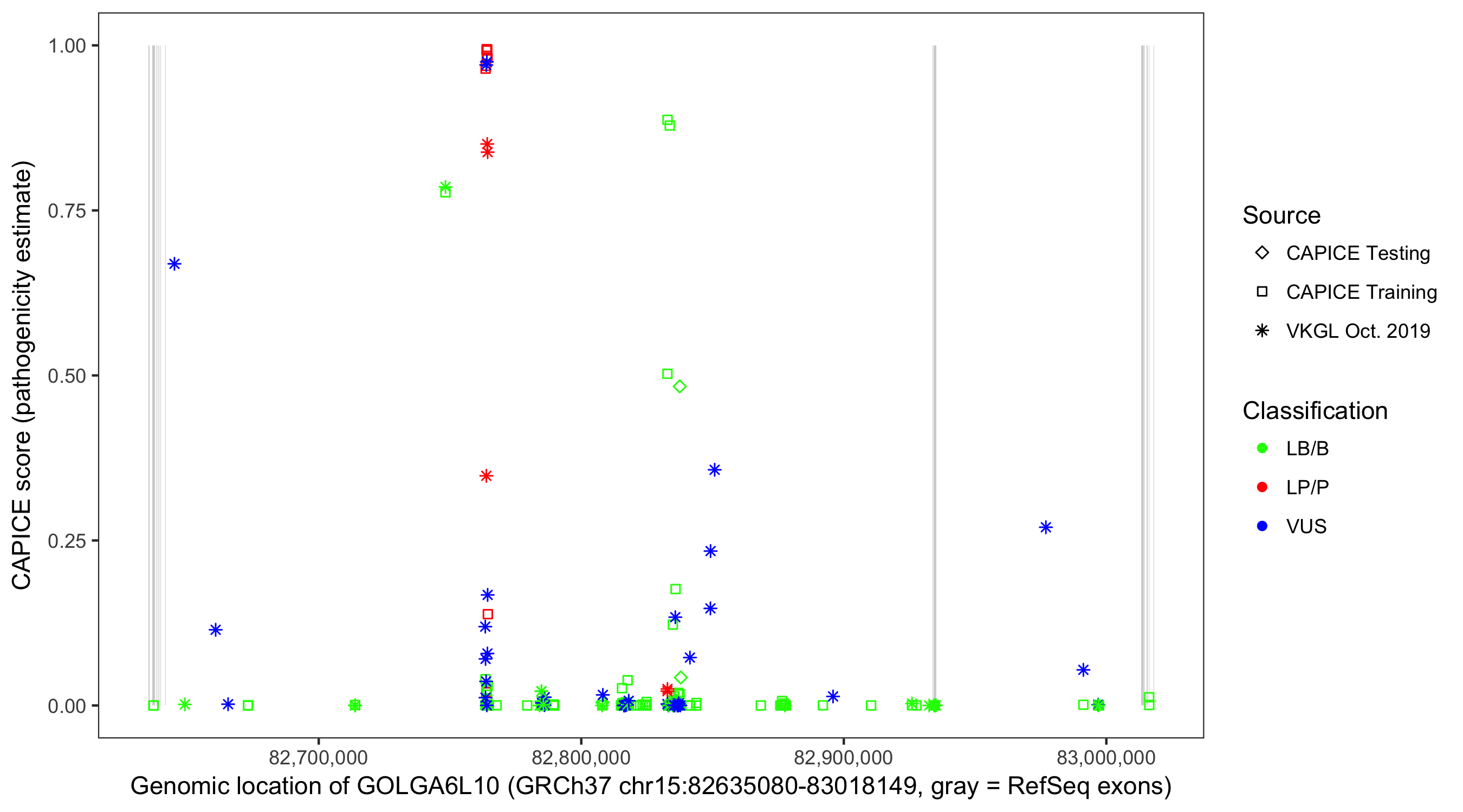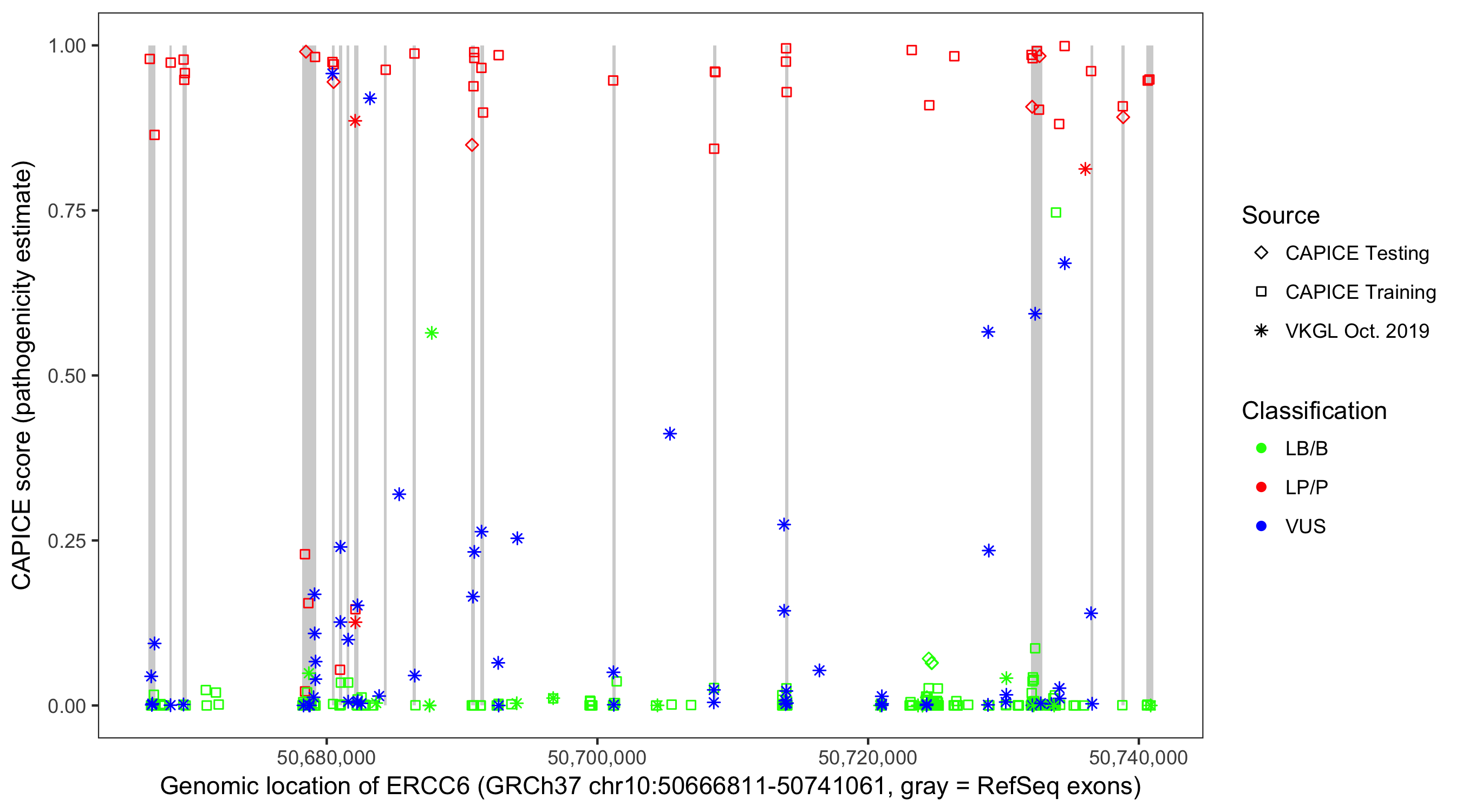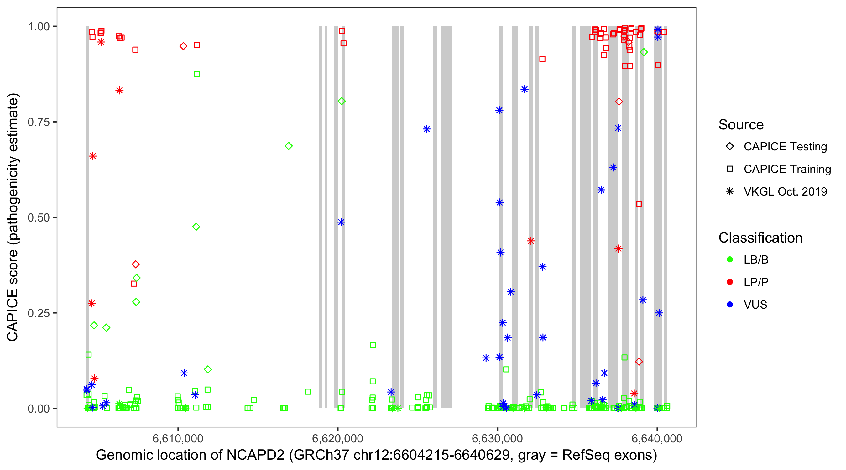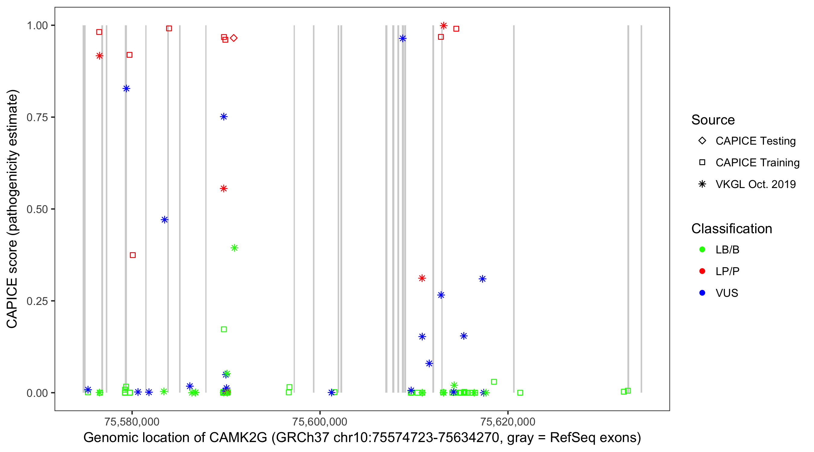 Shown are CAPICE train/test variants plus VKGL Oct 2019.