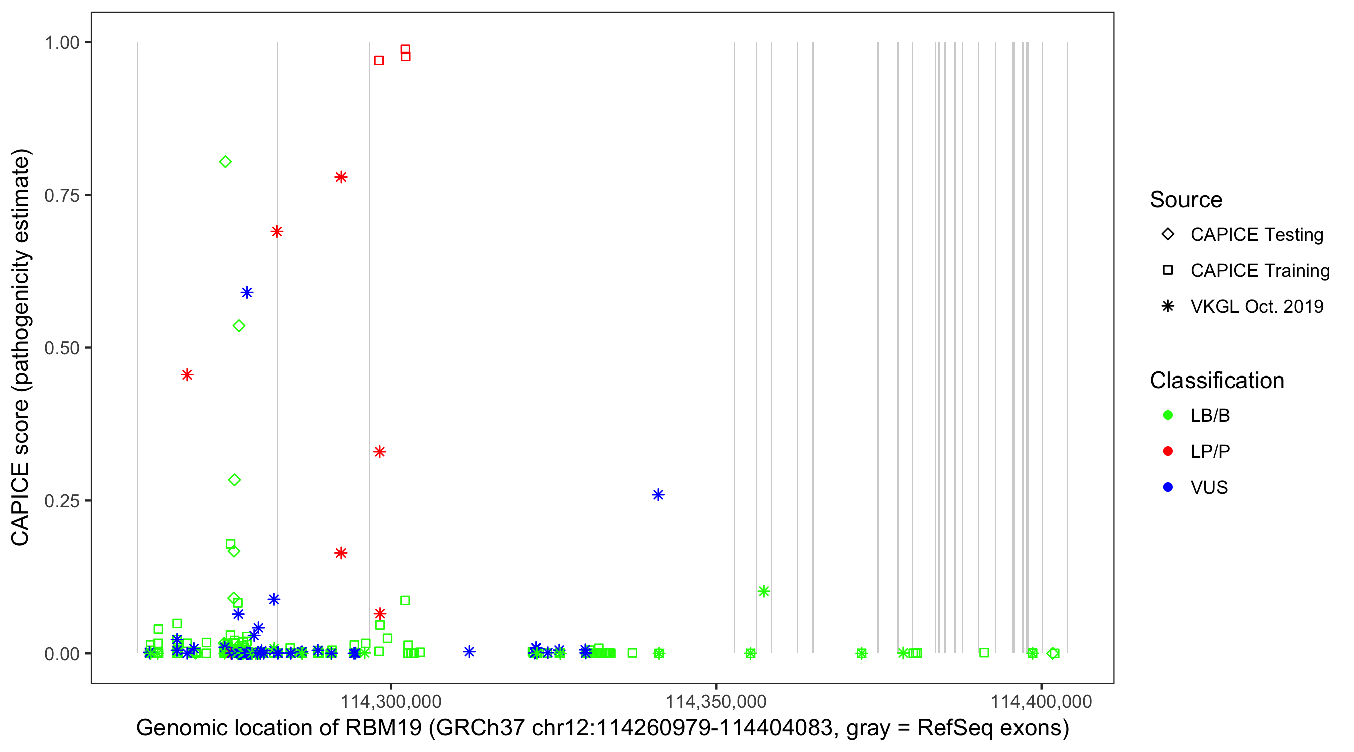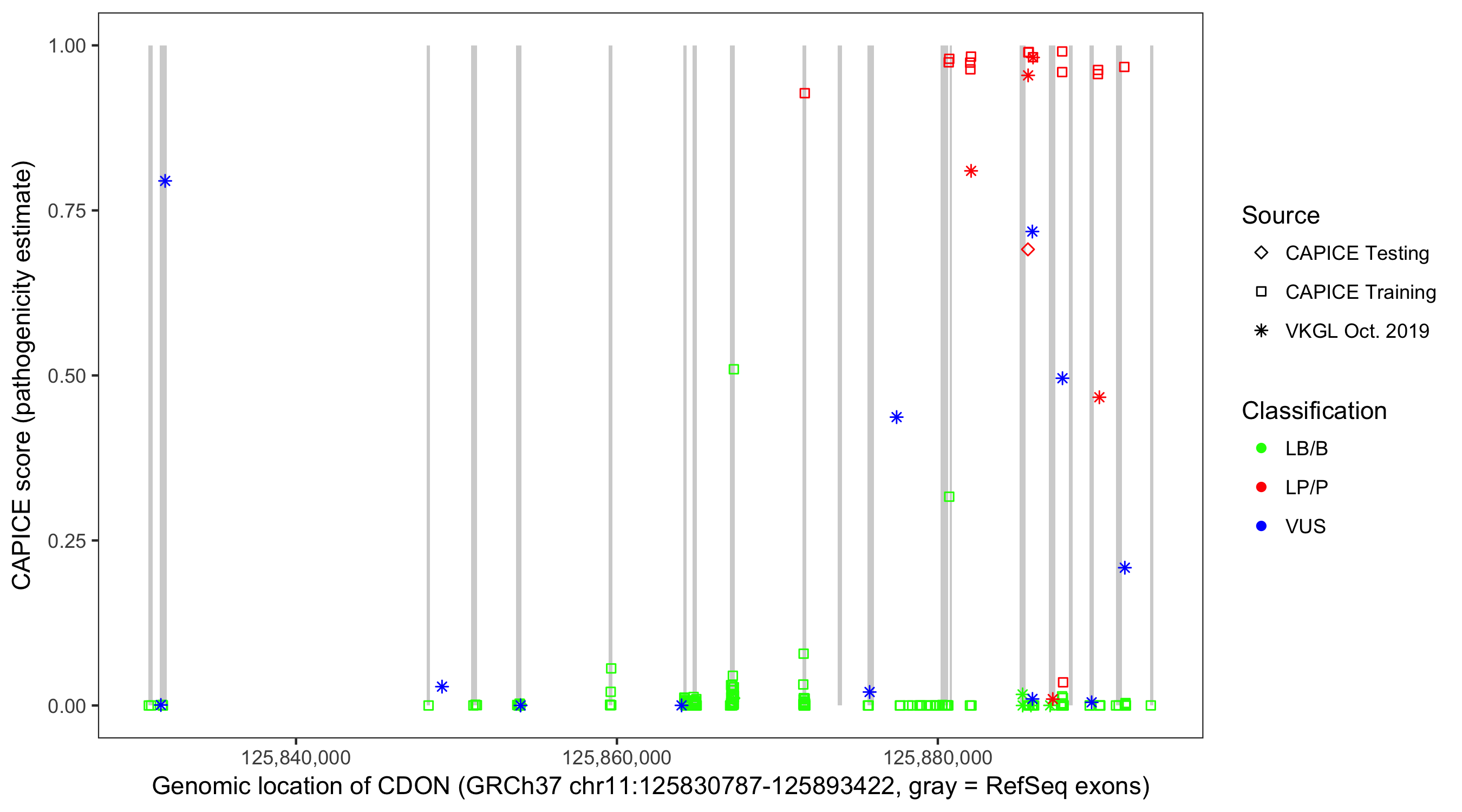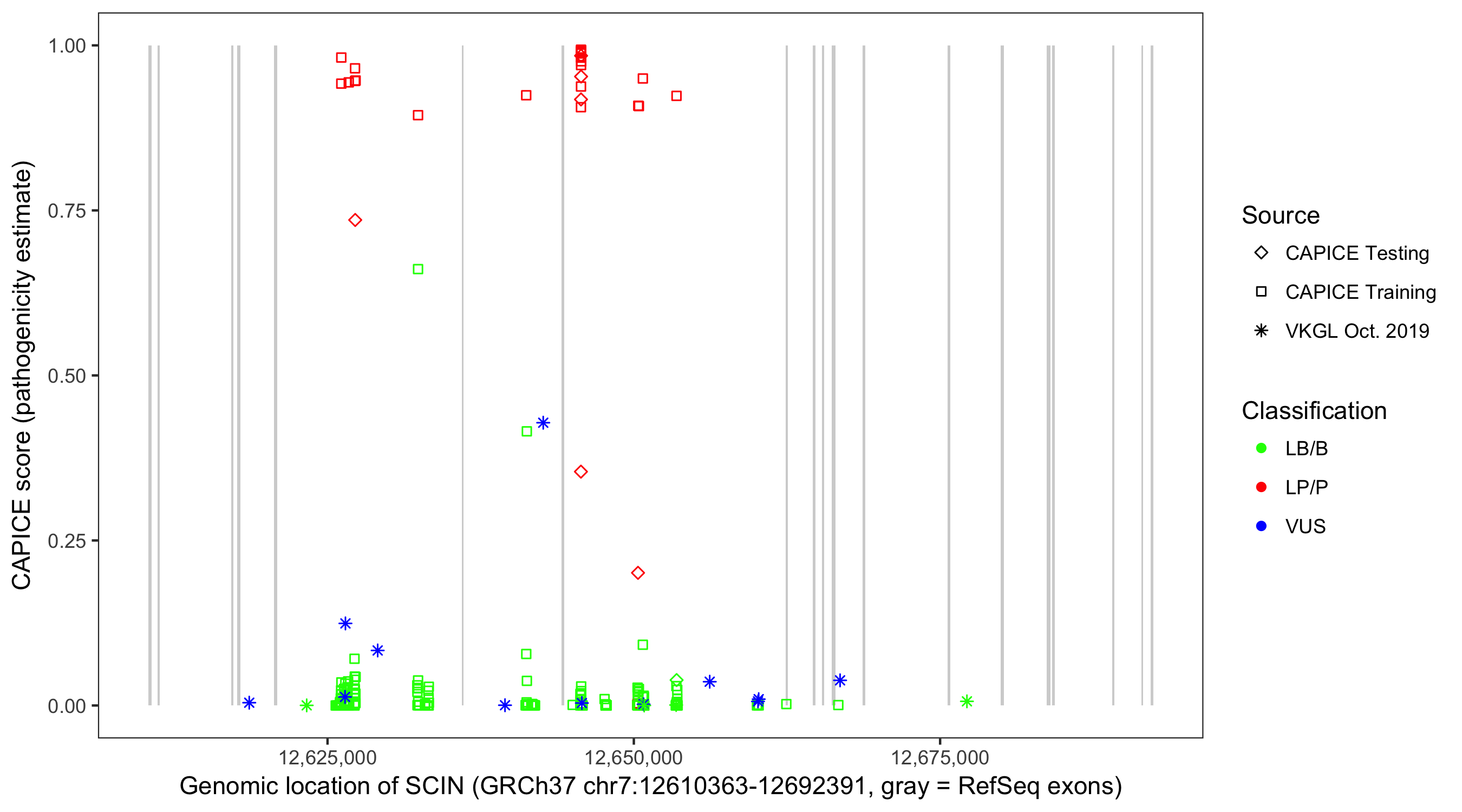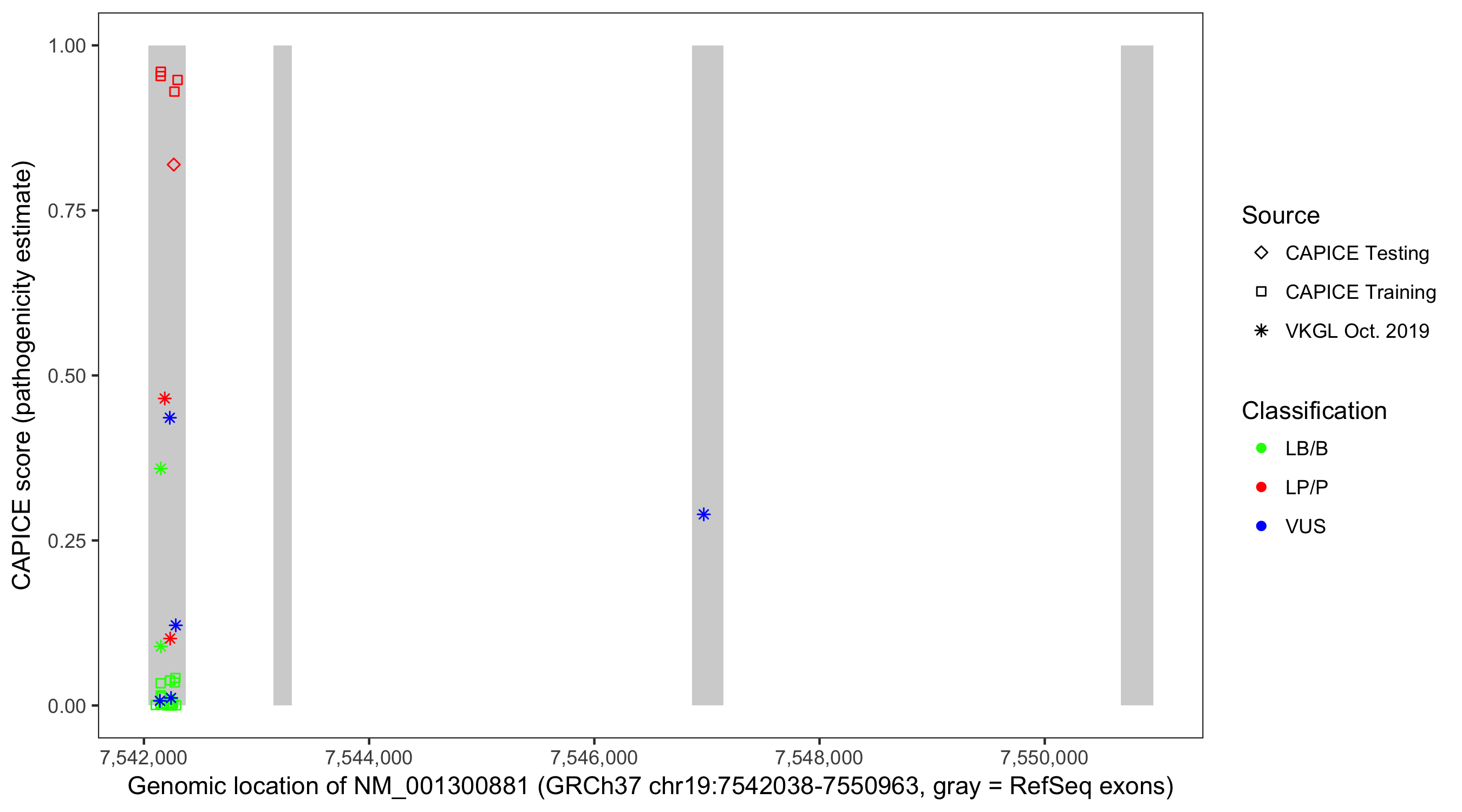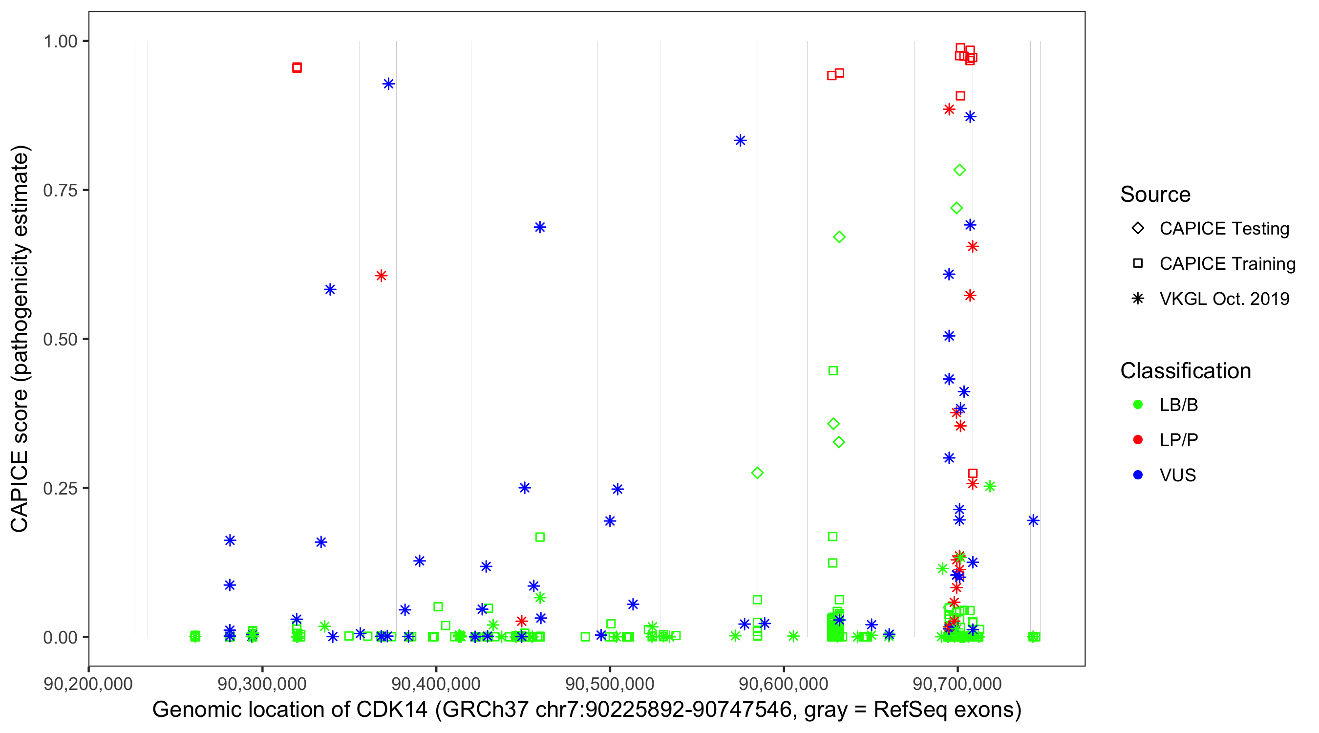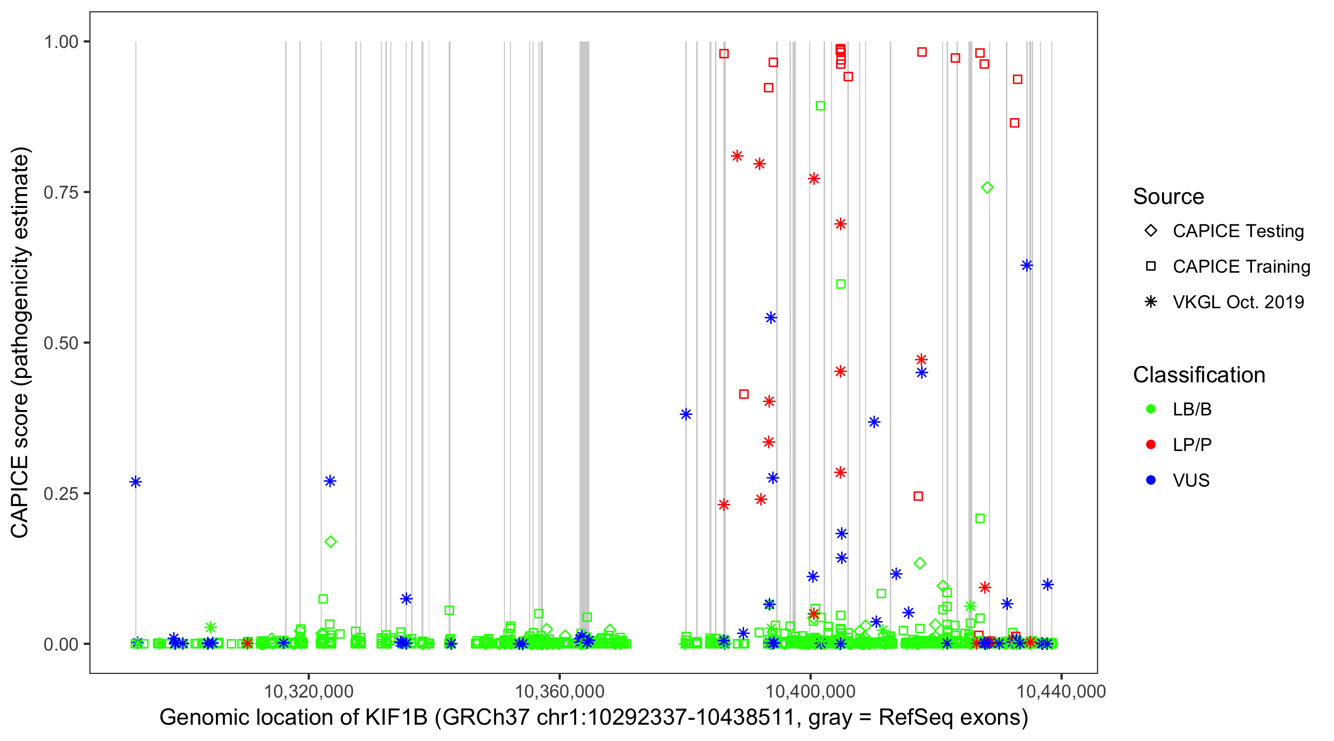 Shown are CAPICE train/test variants plus VKGL Oct 2019.