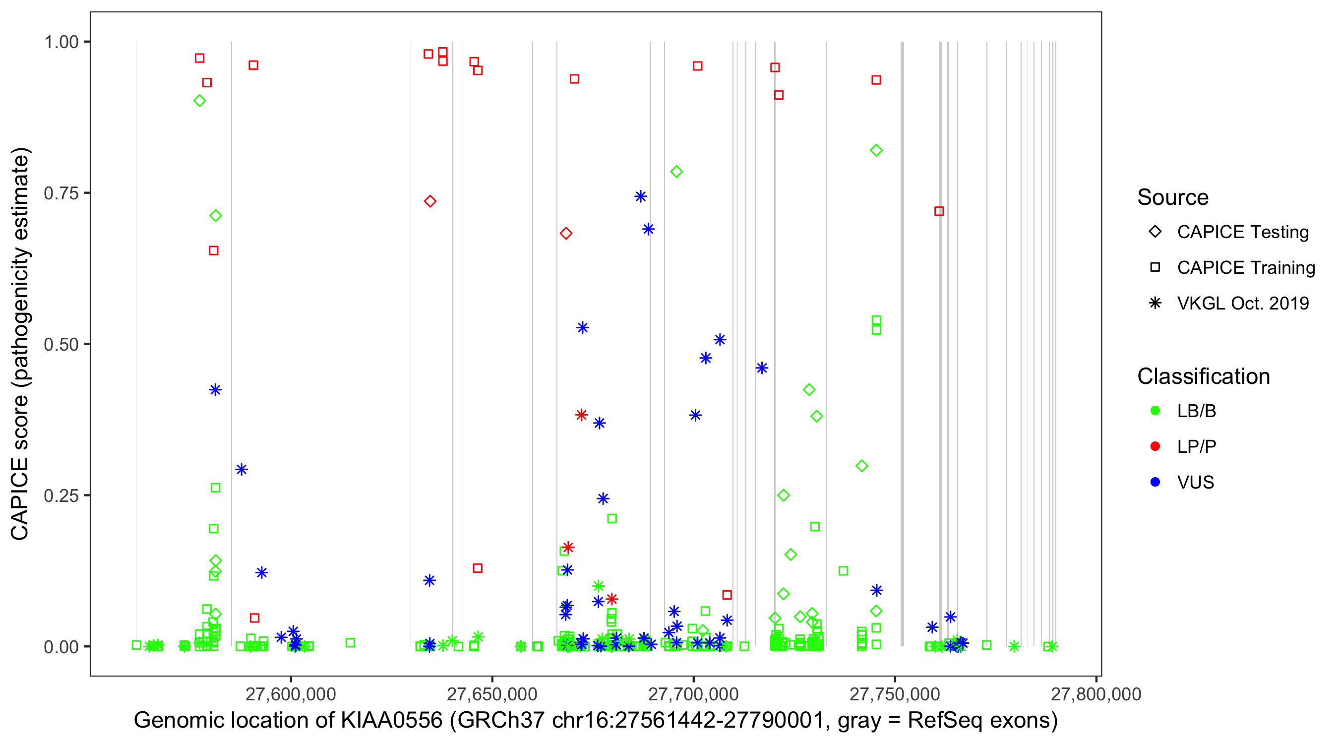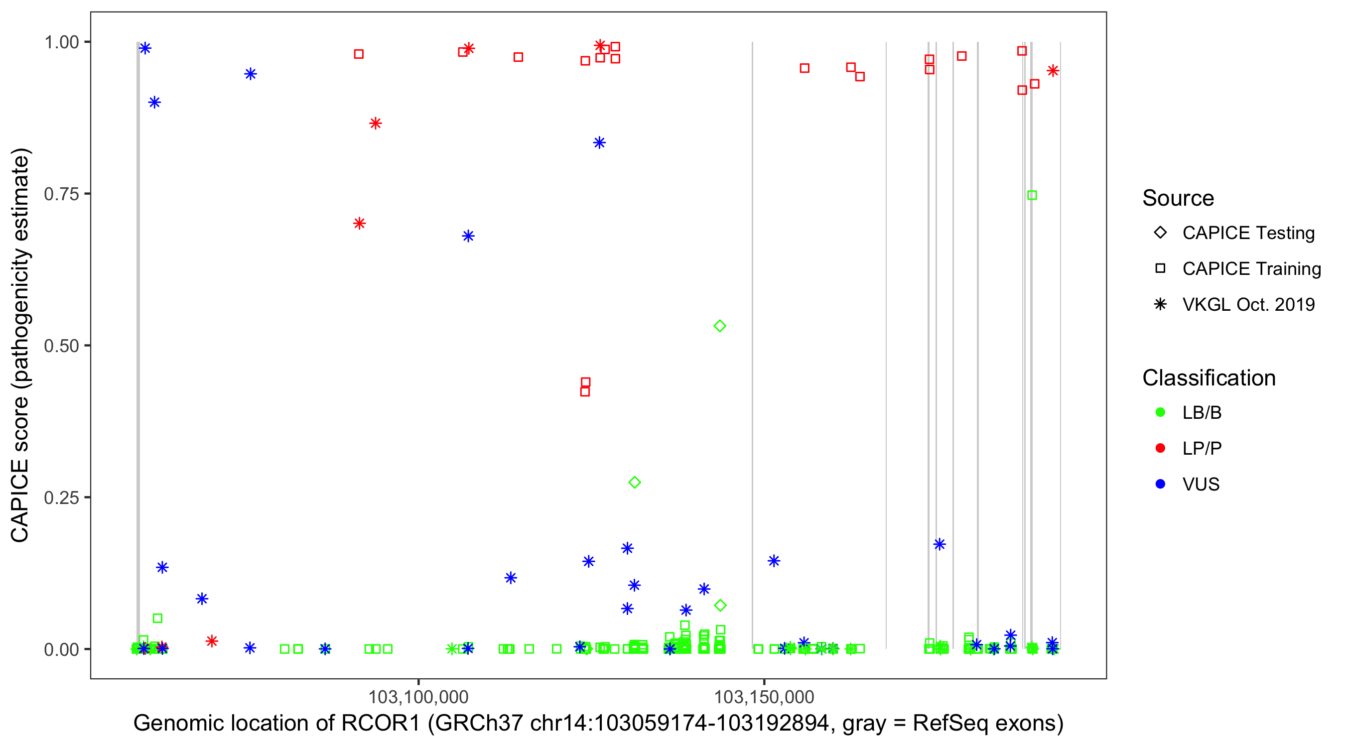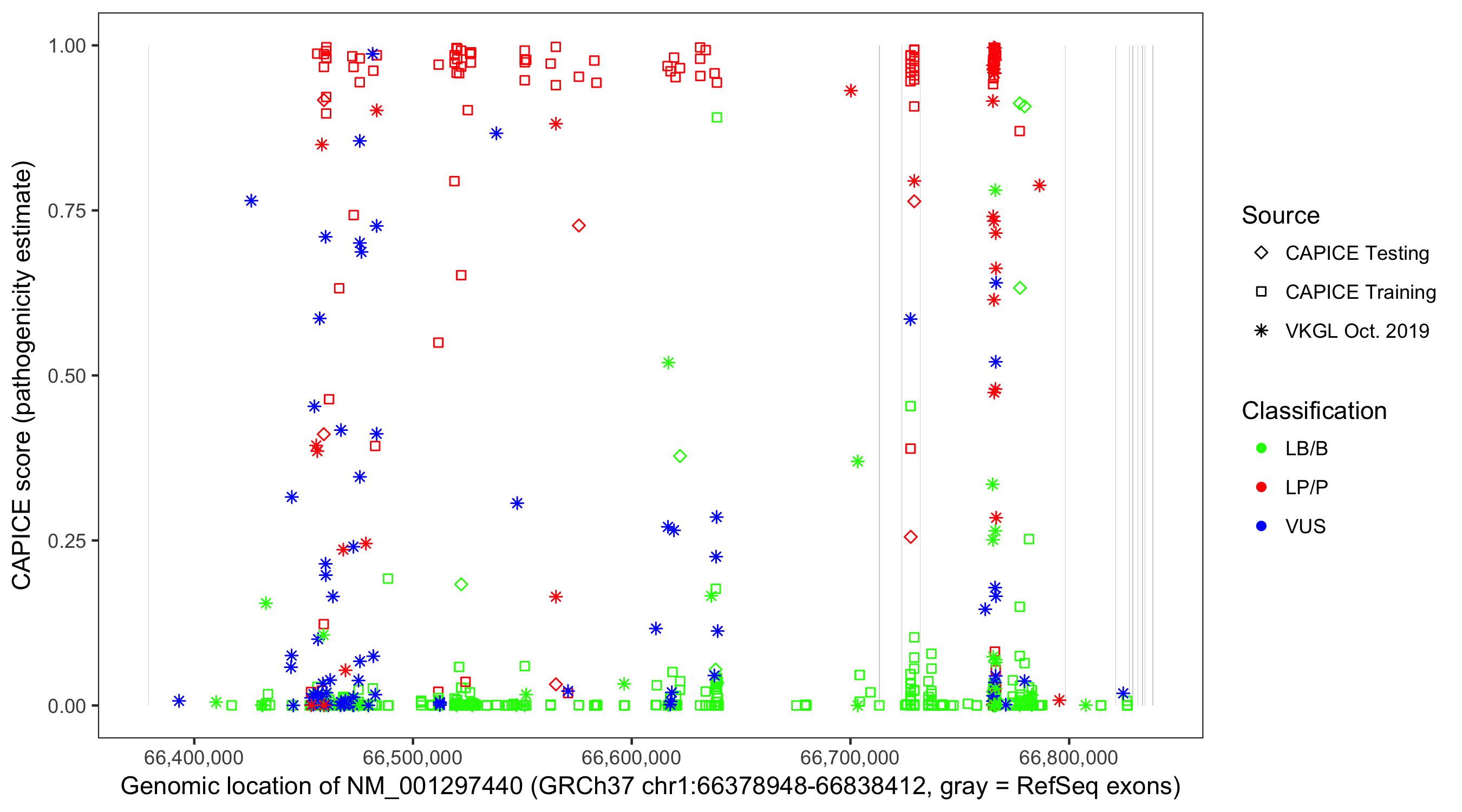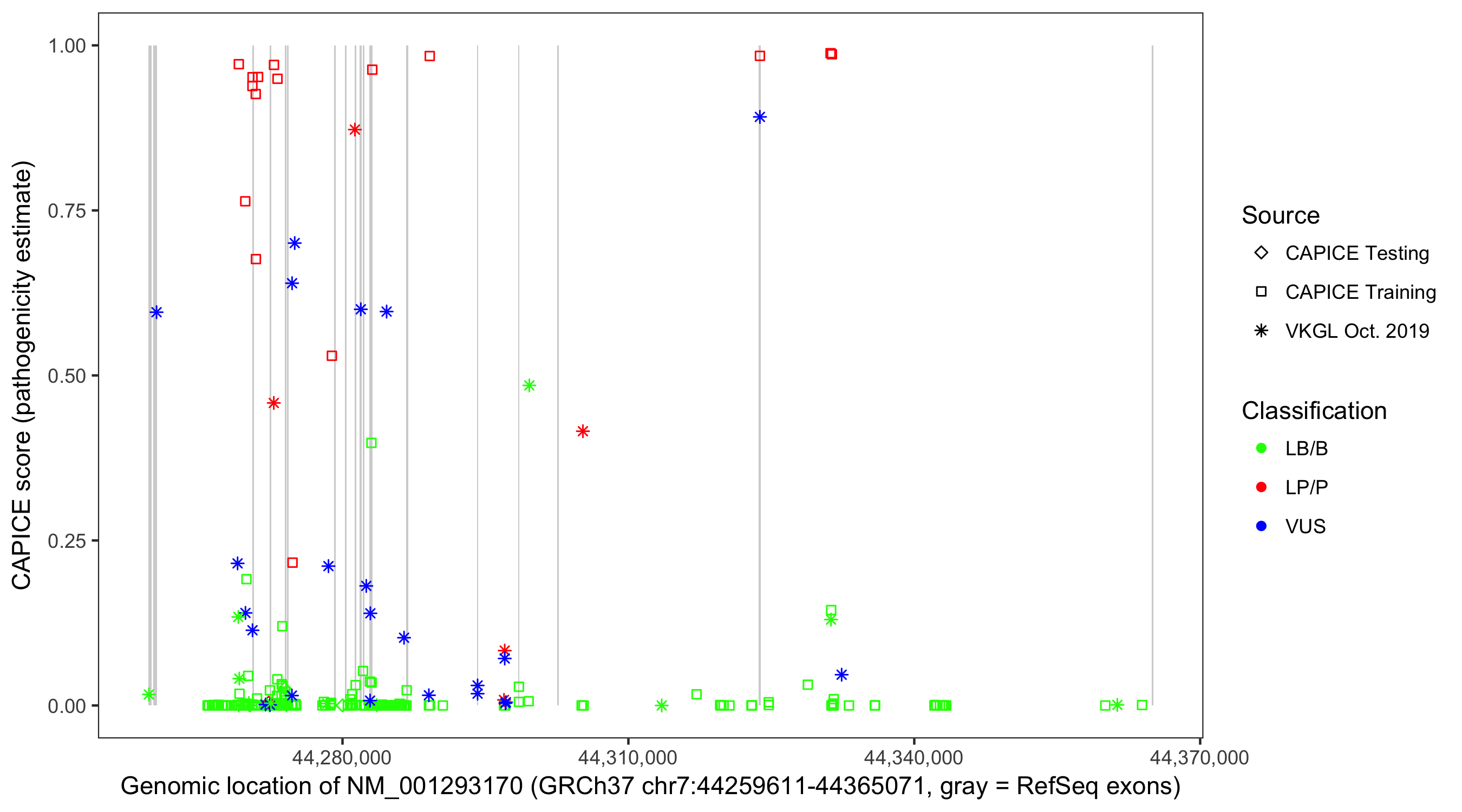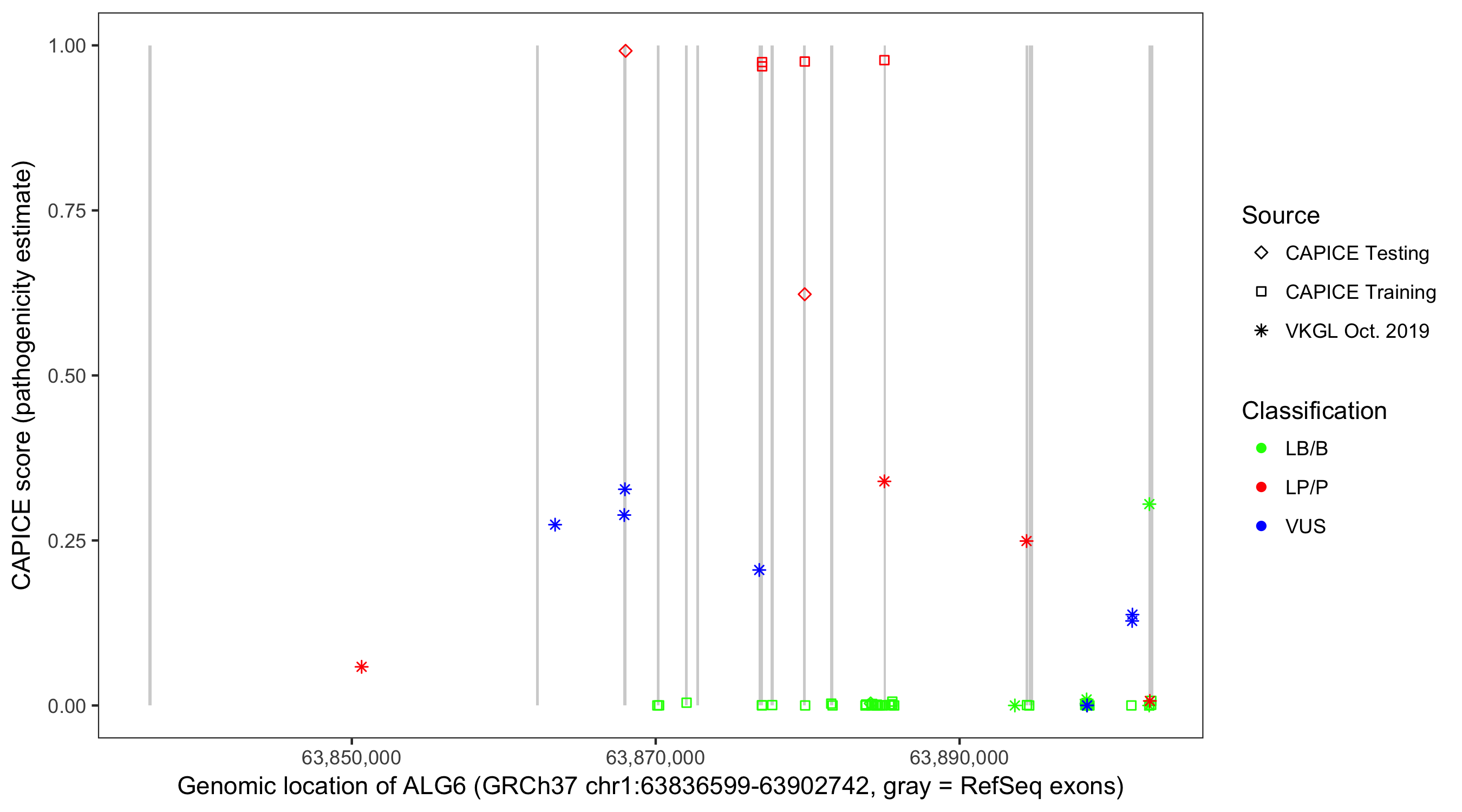 Shown are CAPICE train/test variants plus VKGL Oct 2019.