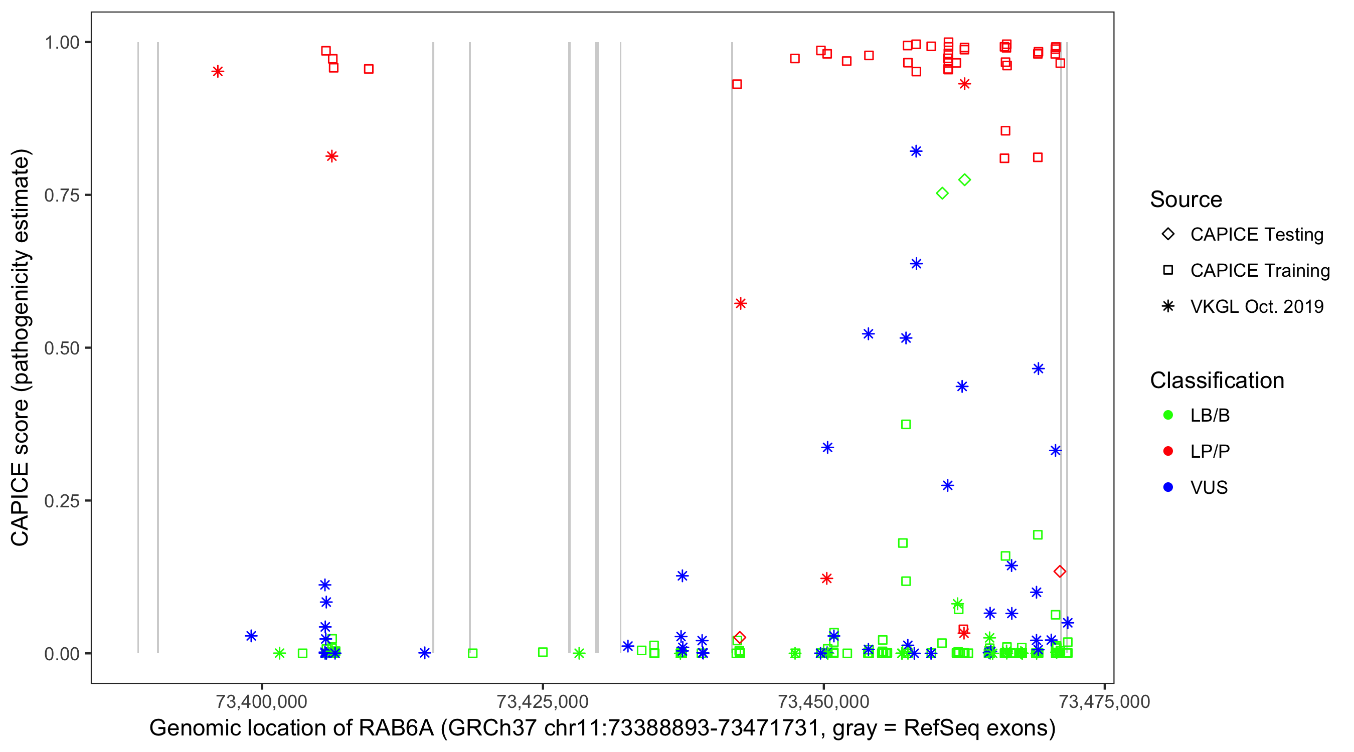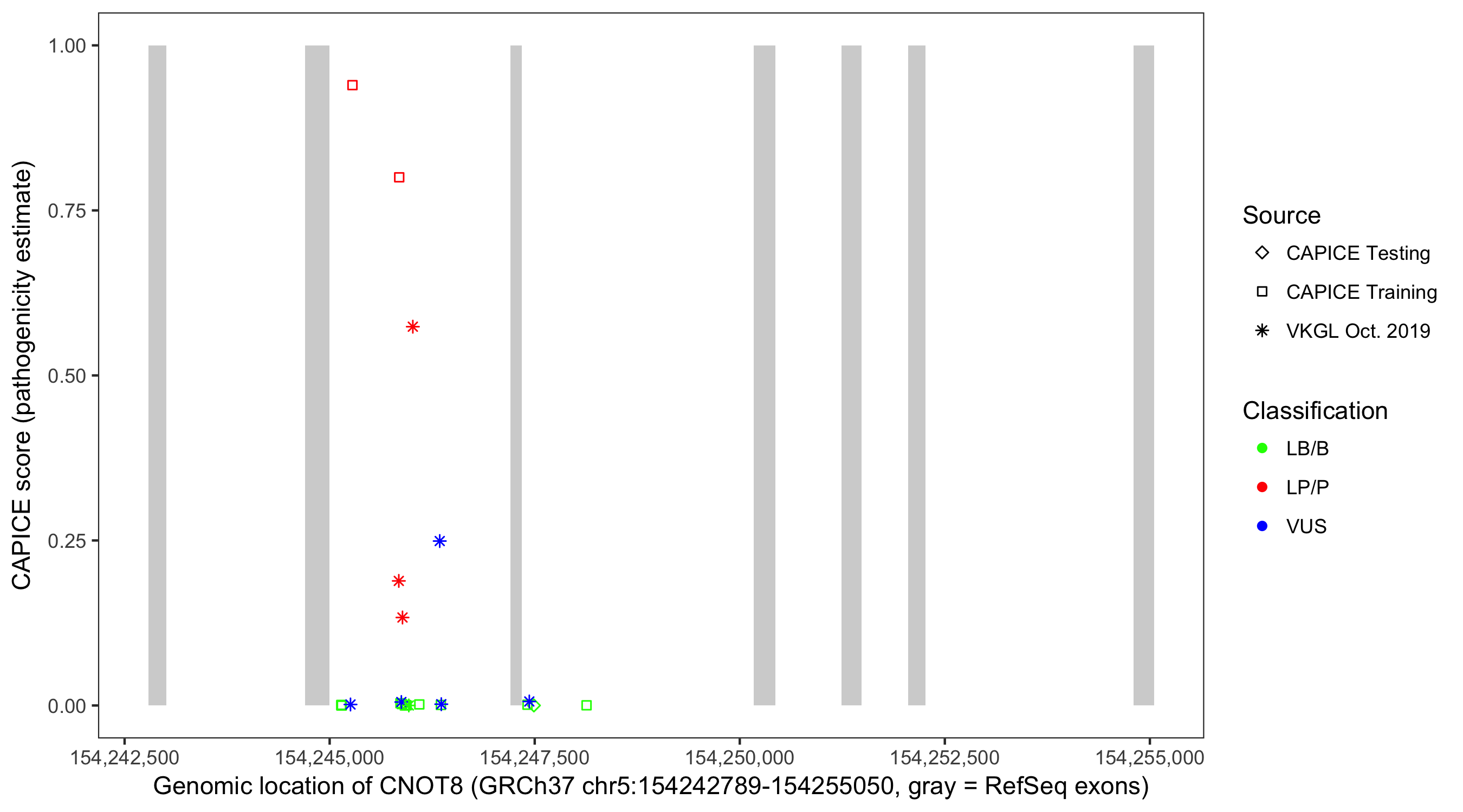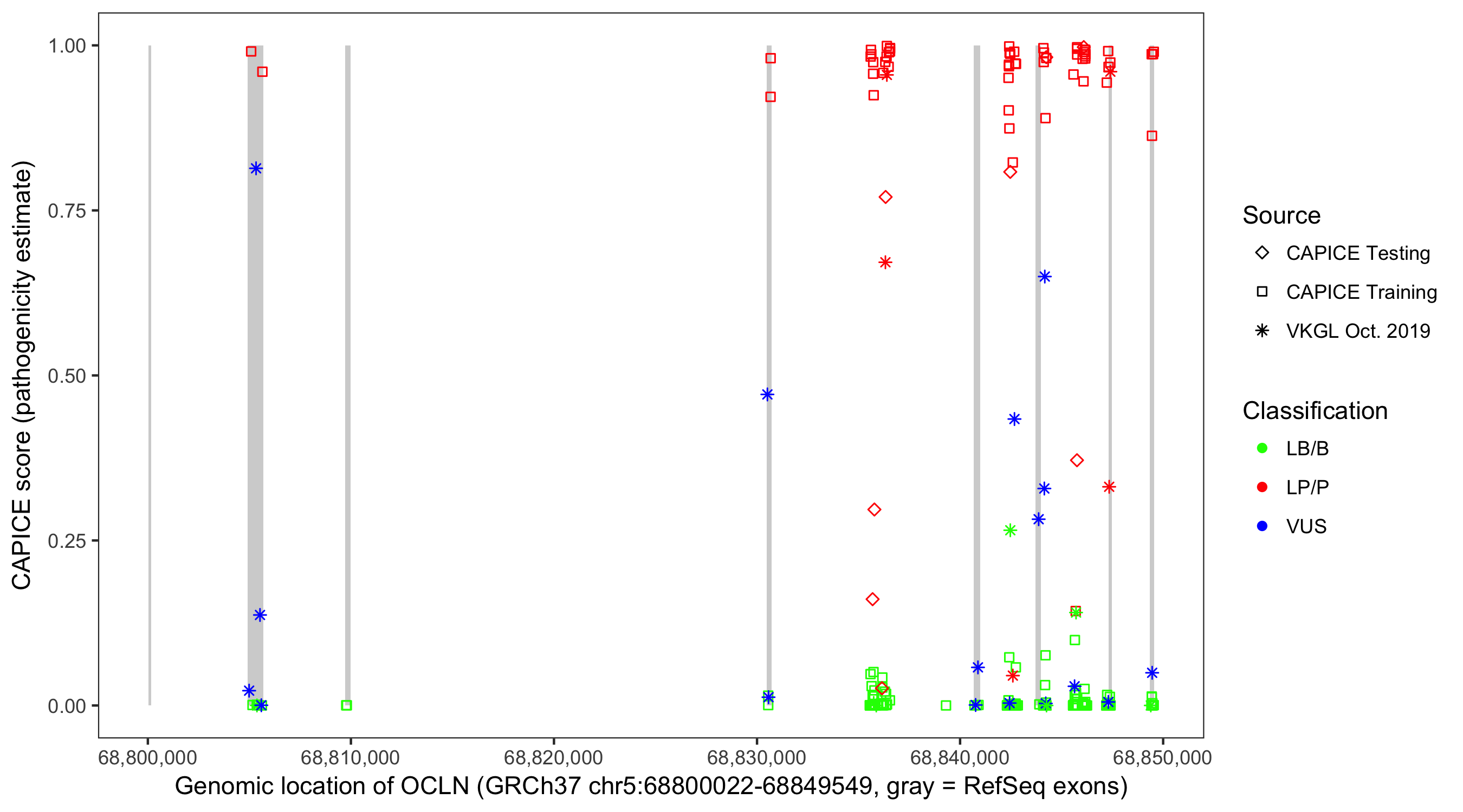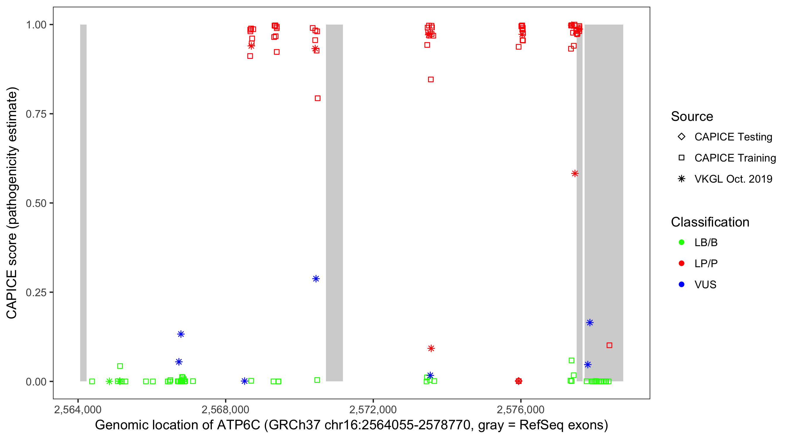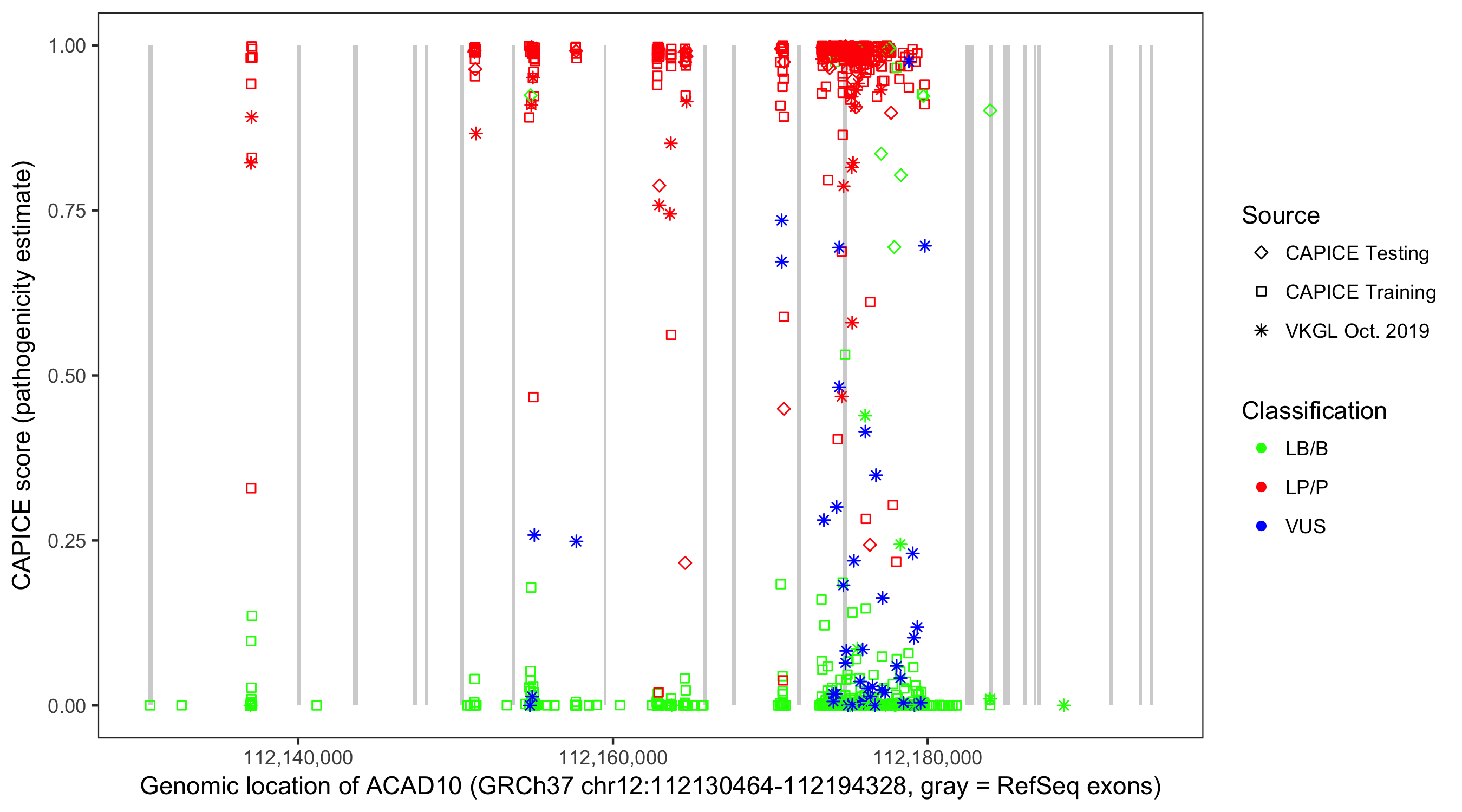 Shown are CAPICE train/test variants plus VKGL Oct 2019.