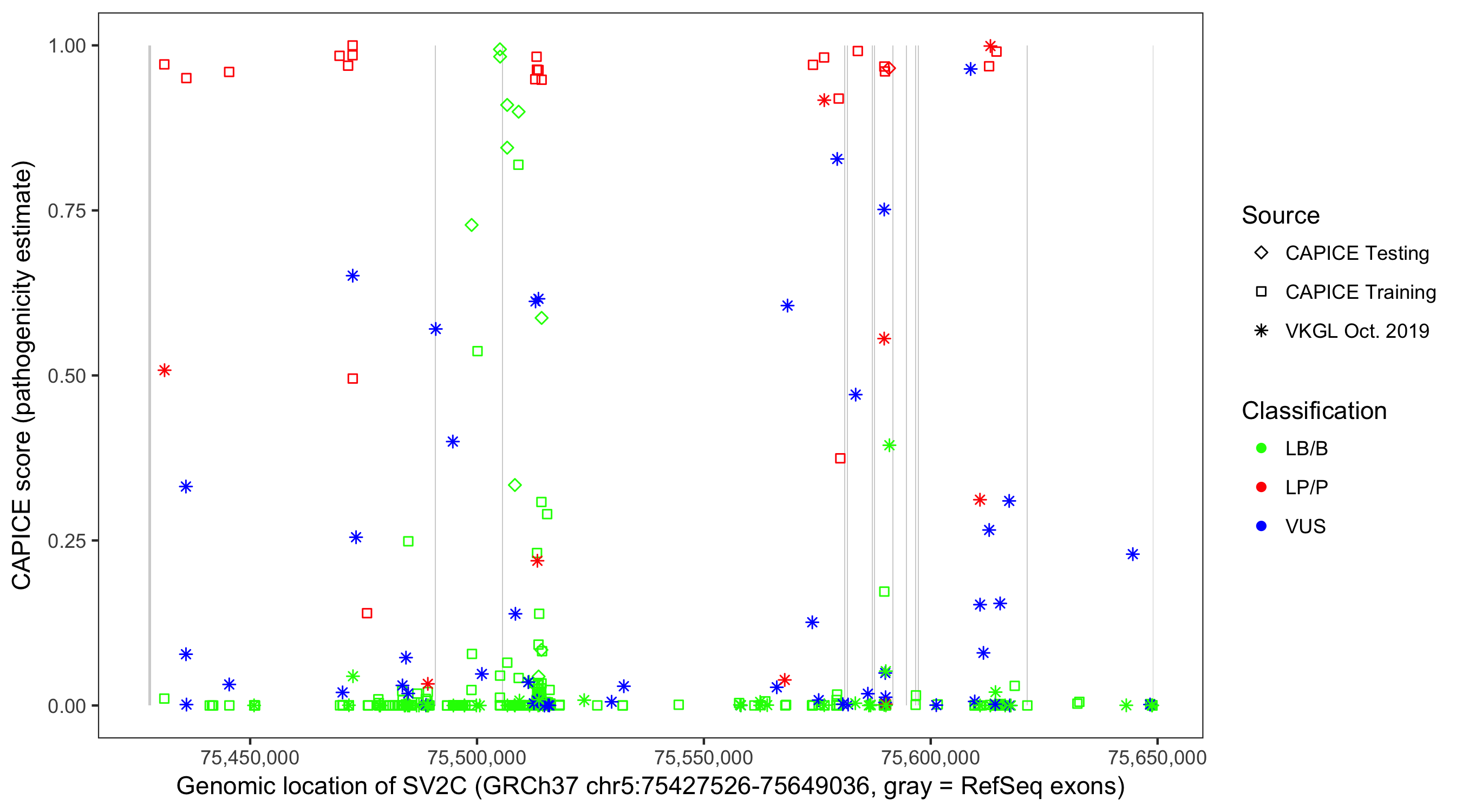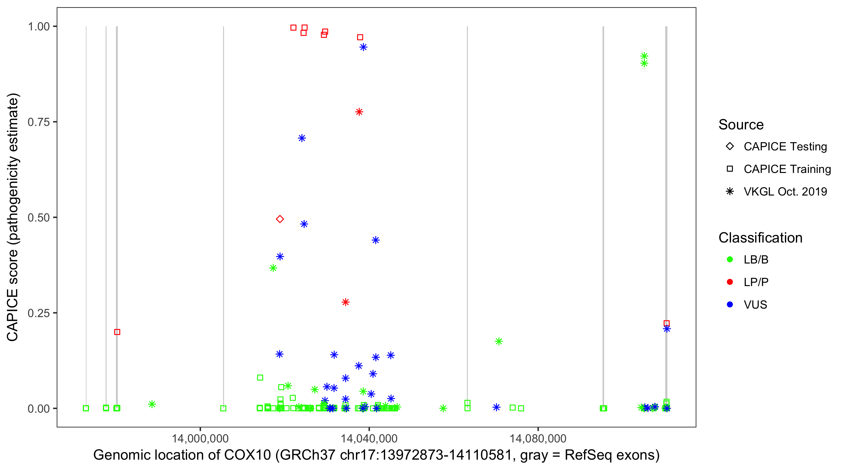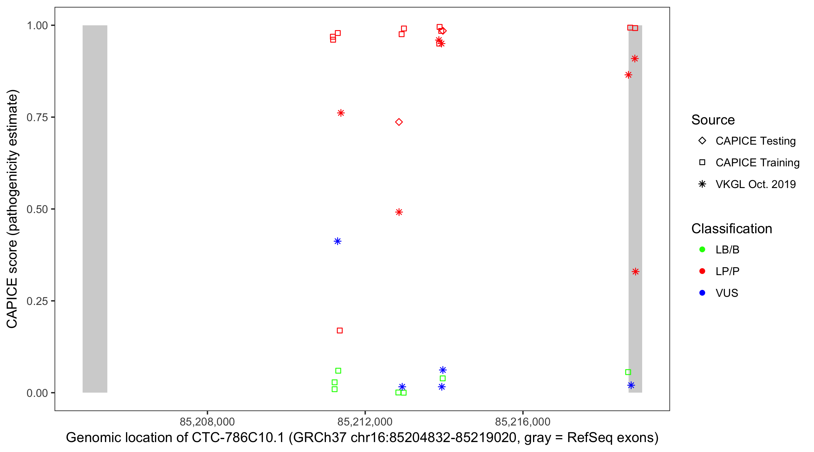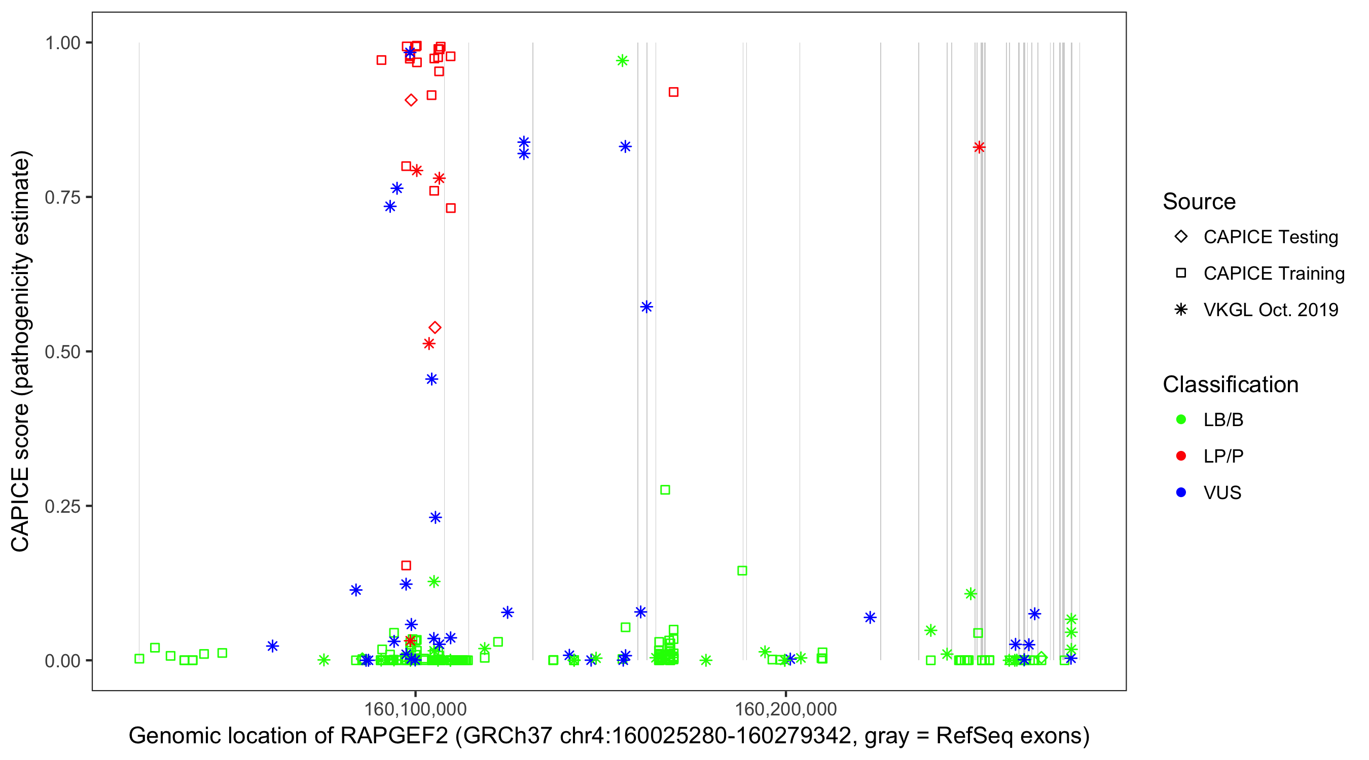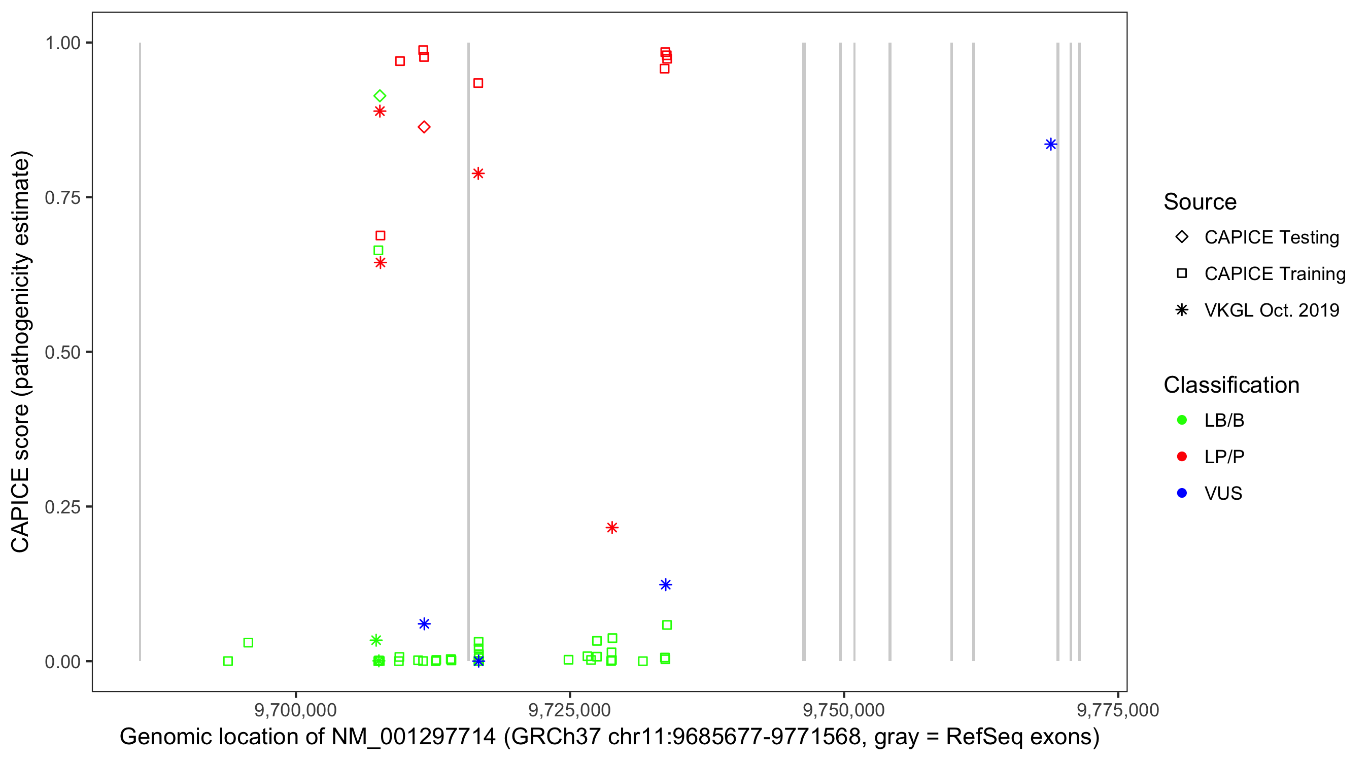 Shown are CAPICE train/test variants plus VKGL Oct 2019.