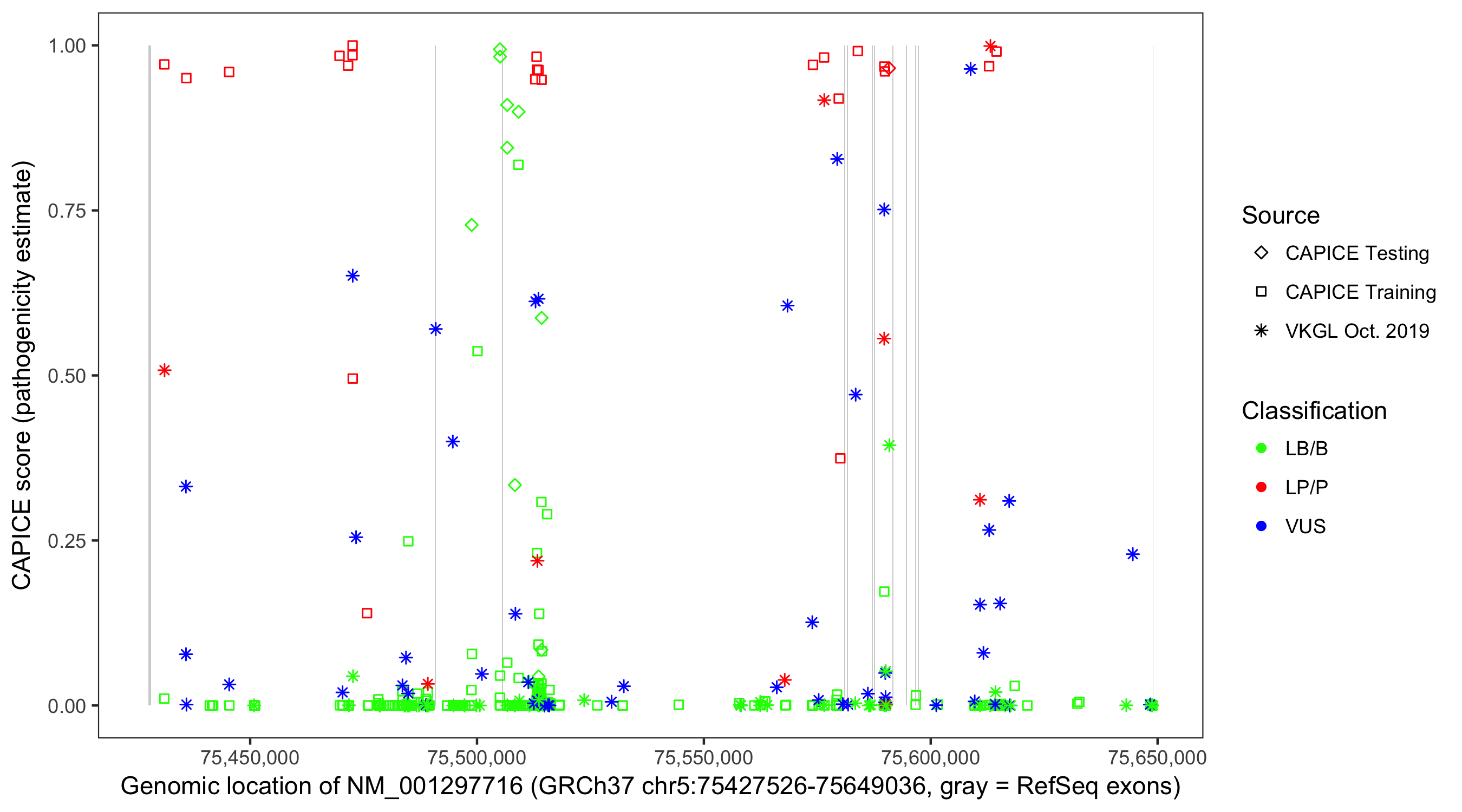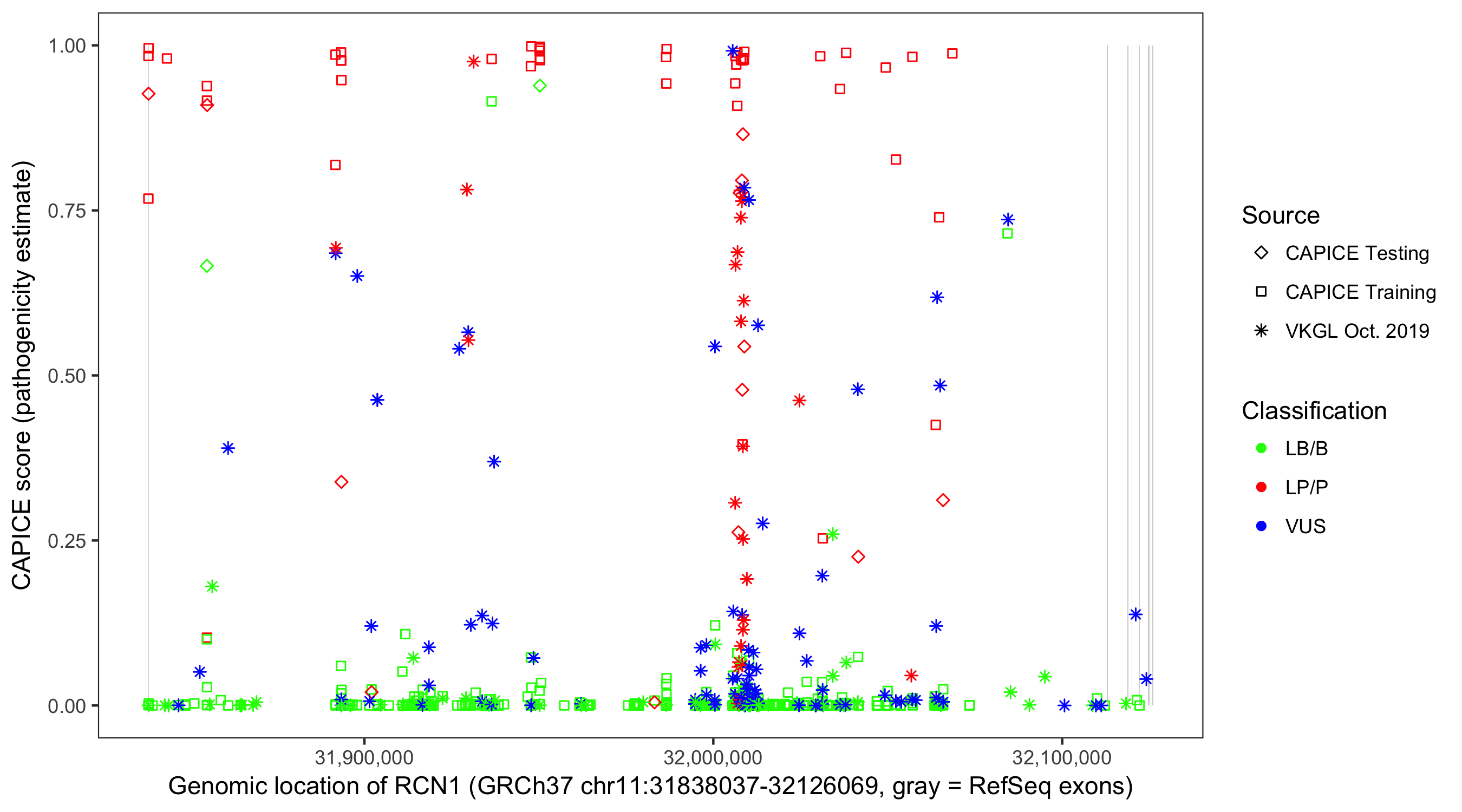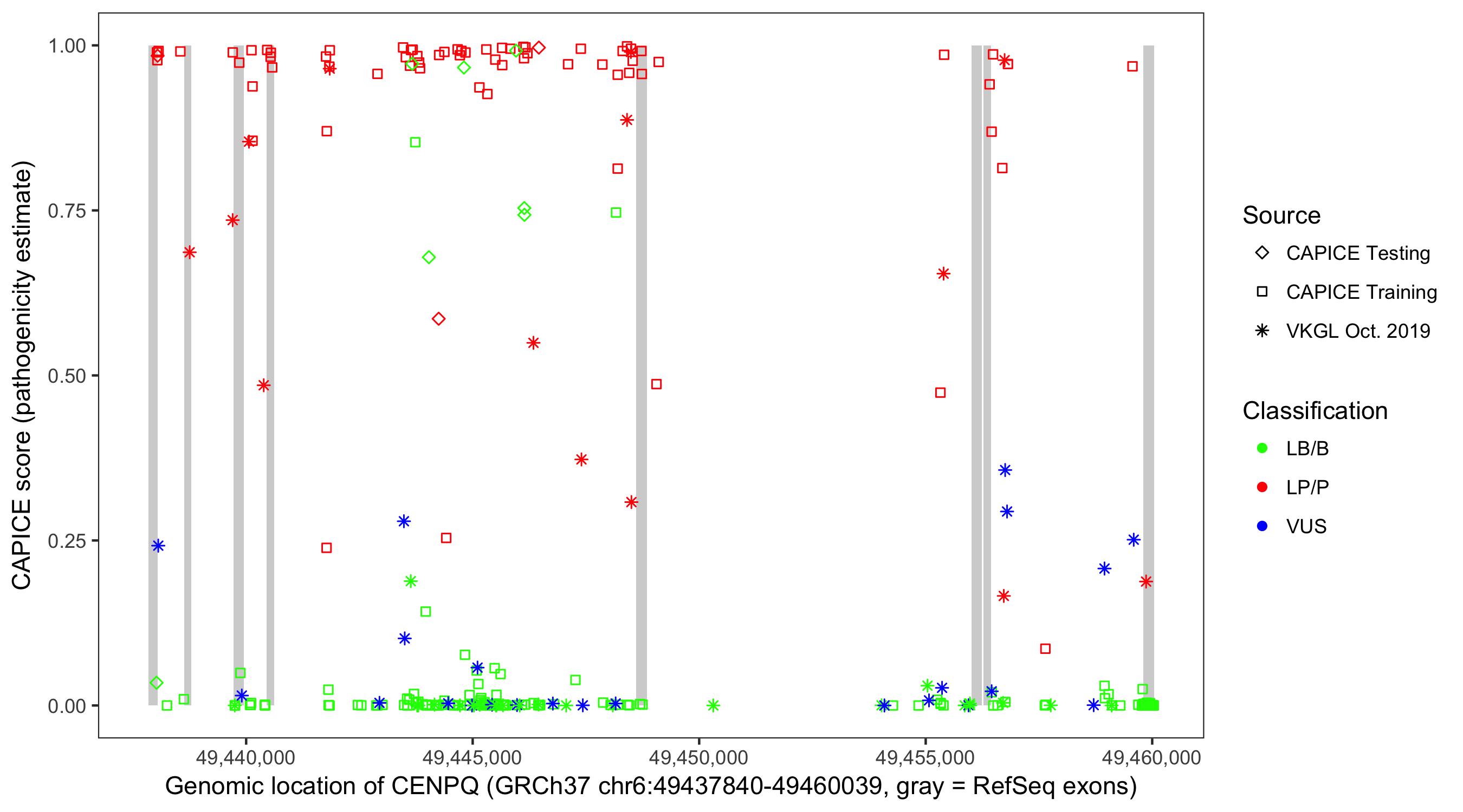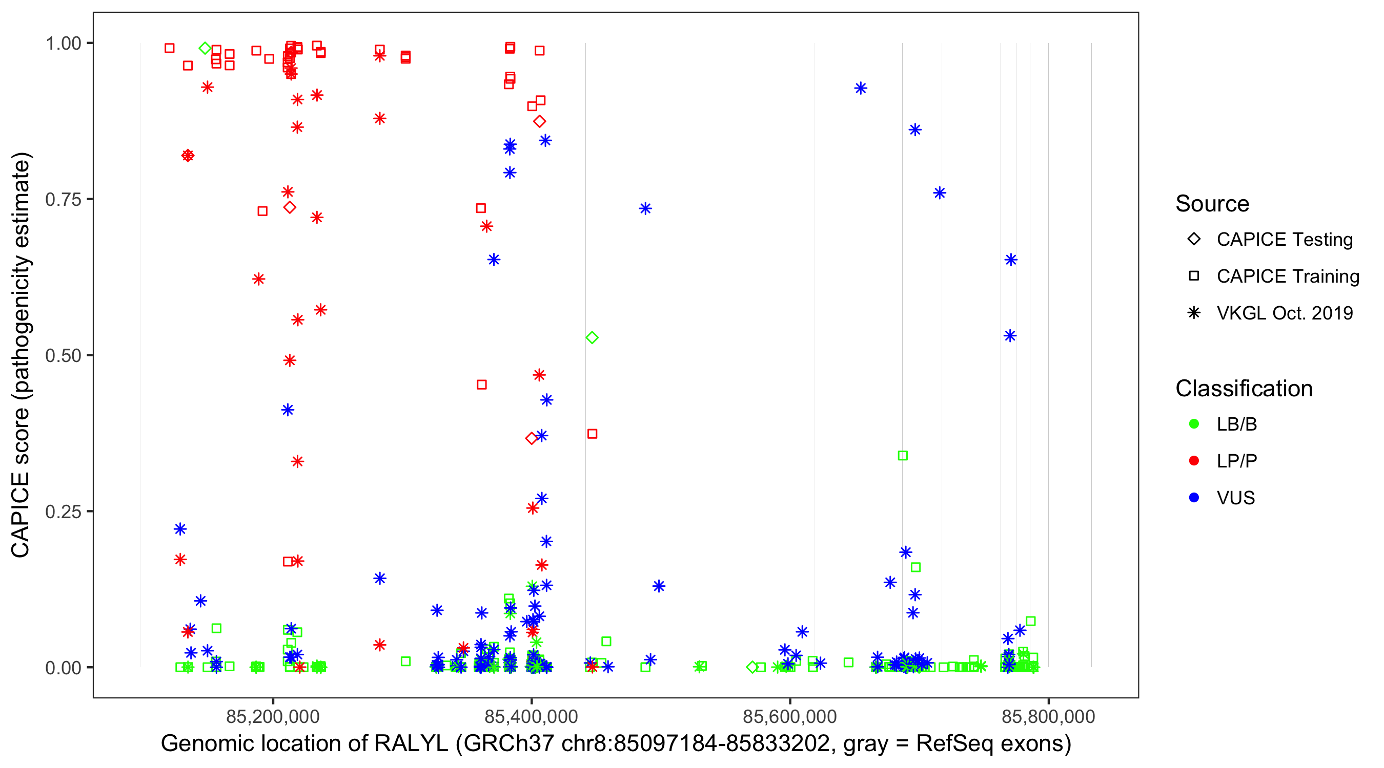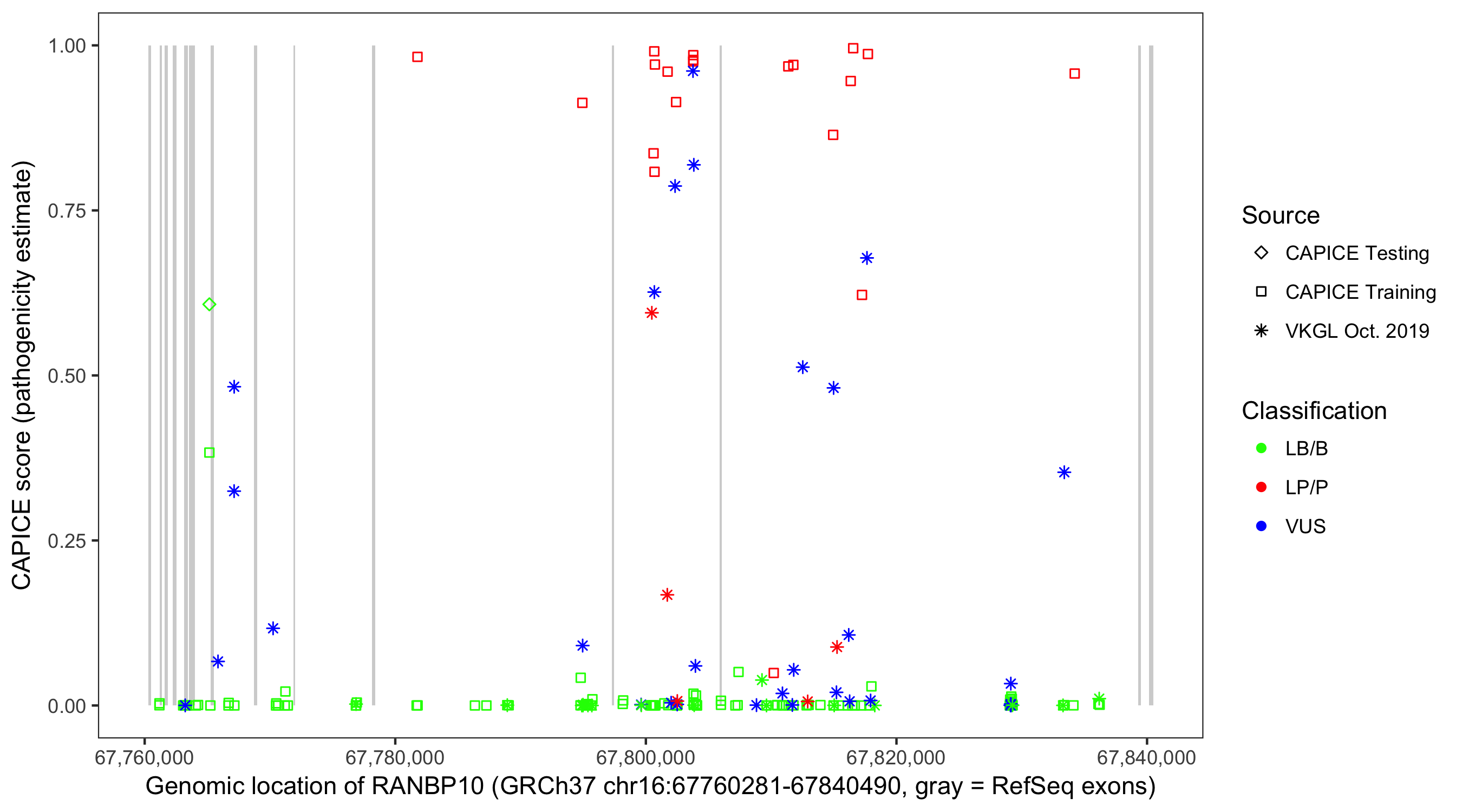 Shown are CAPICE train/test variants plus VKGL Oct 2019.