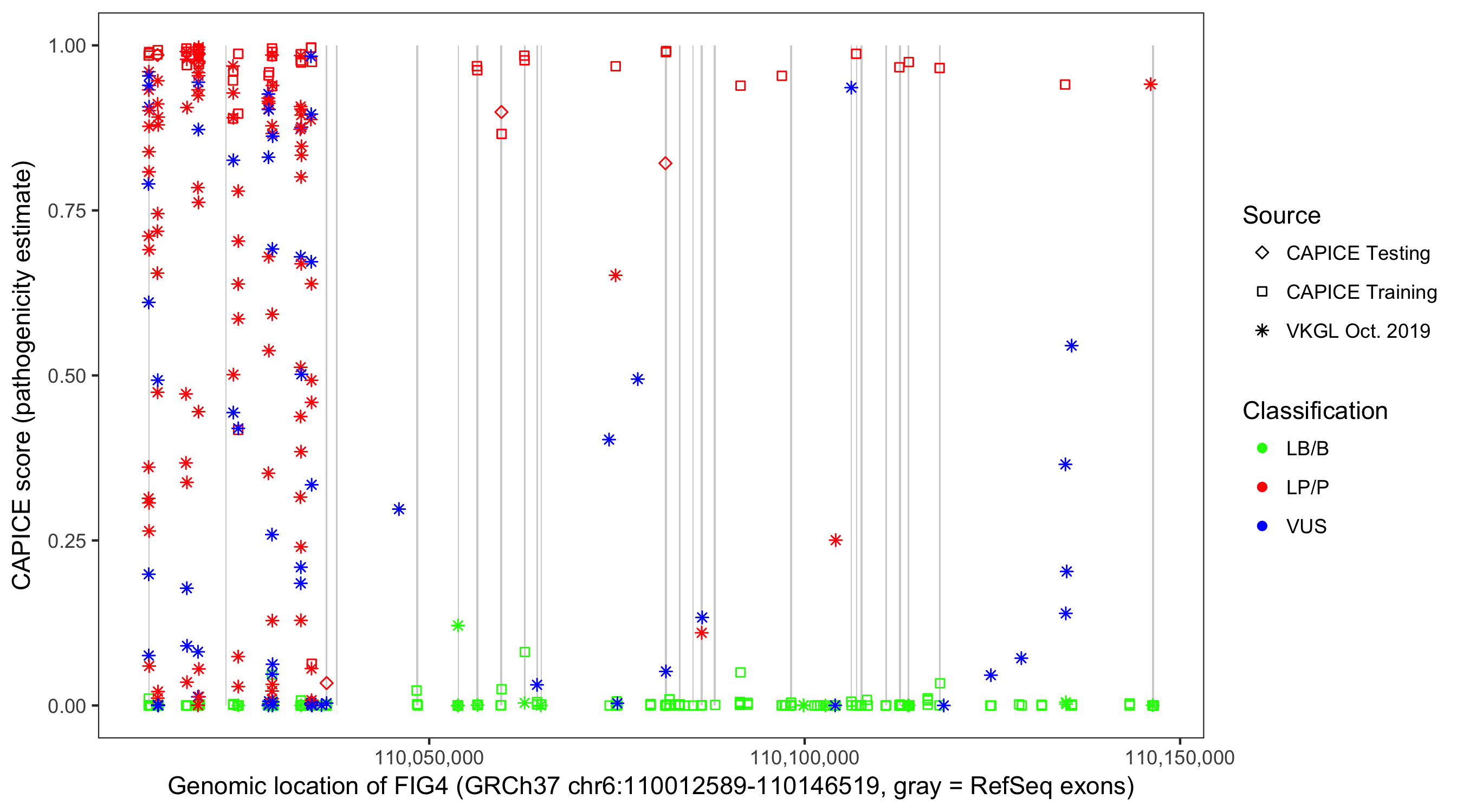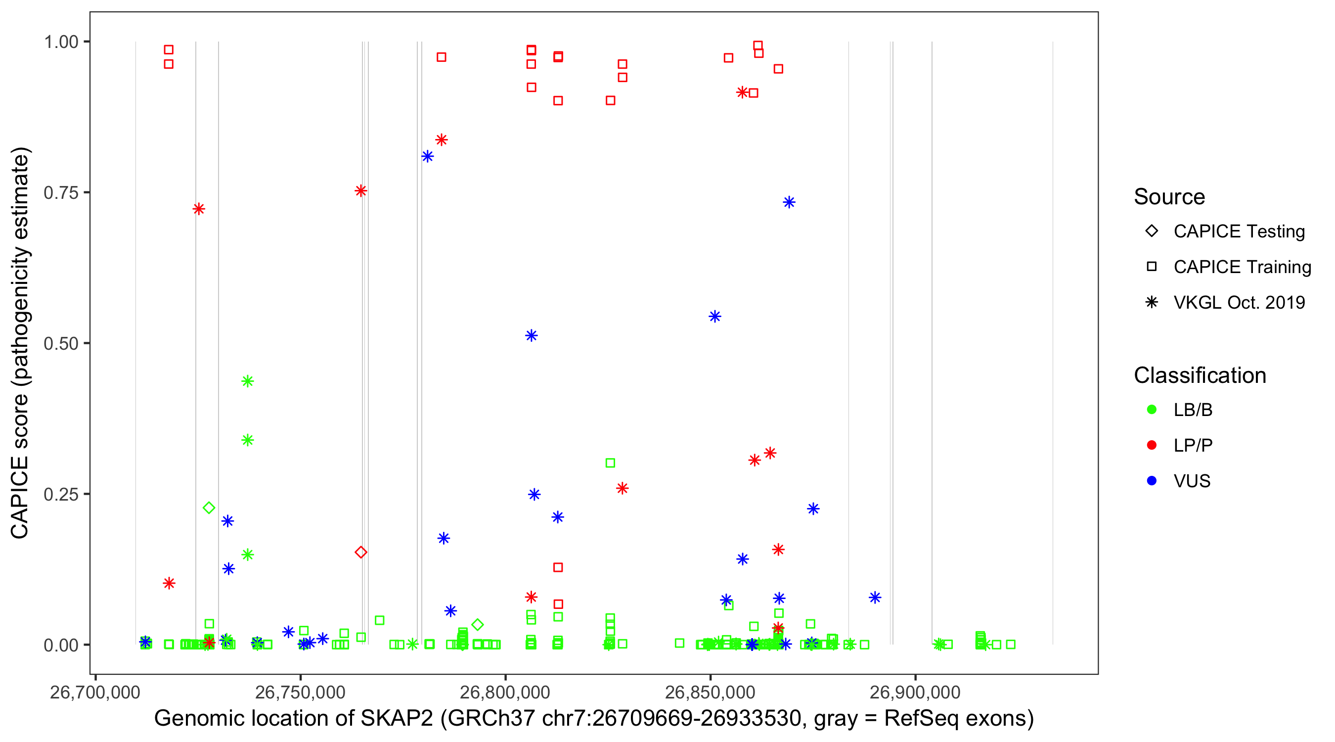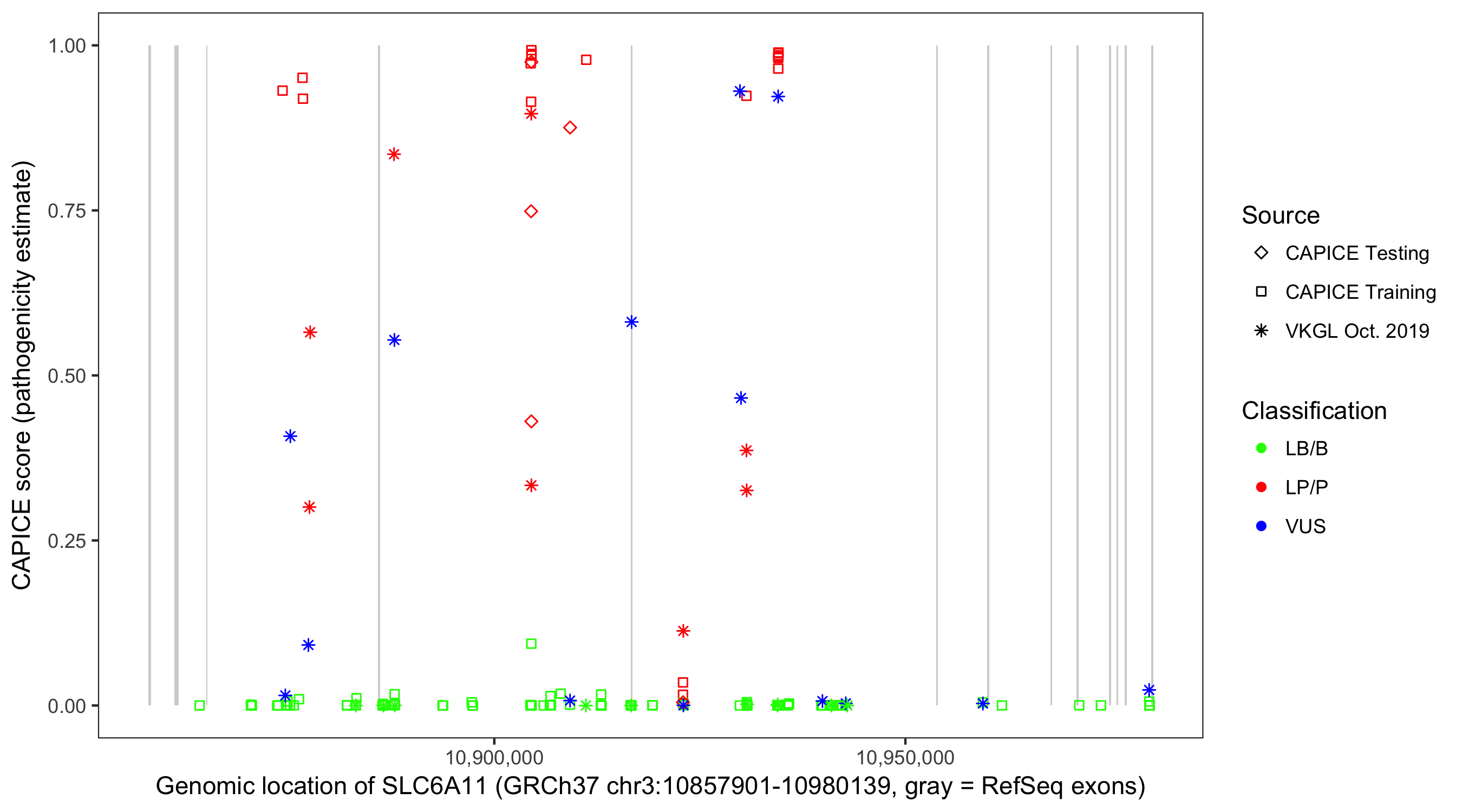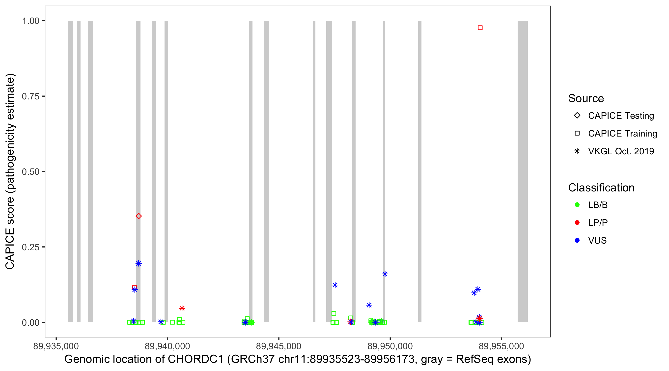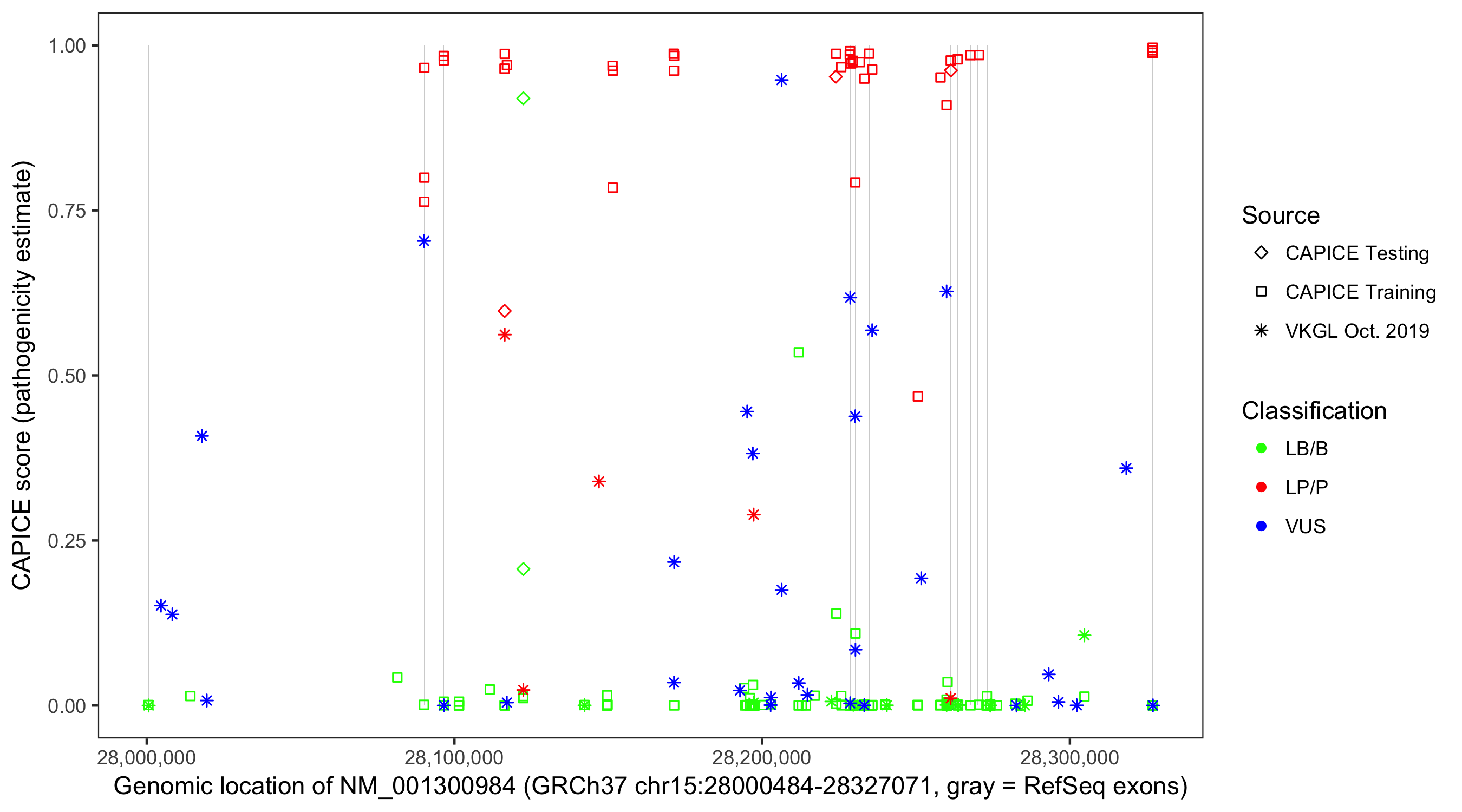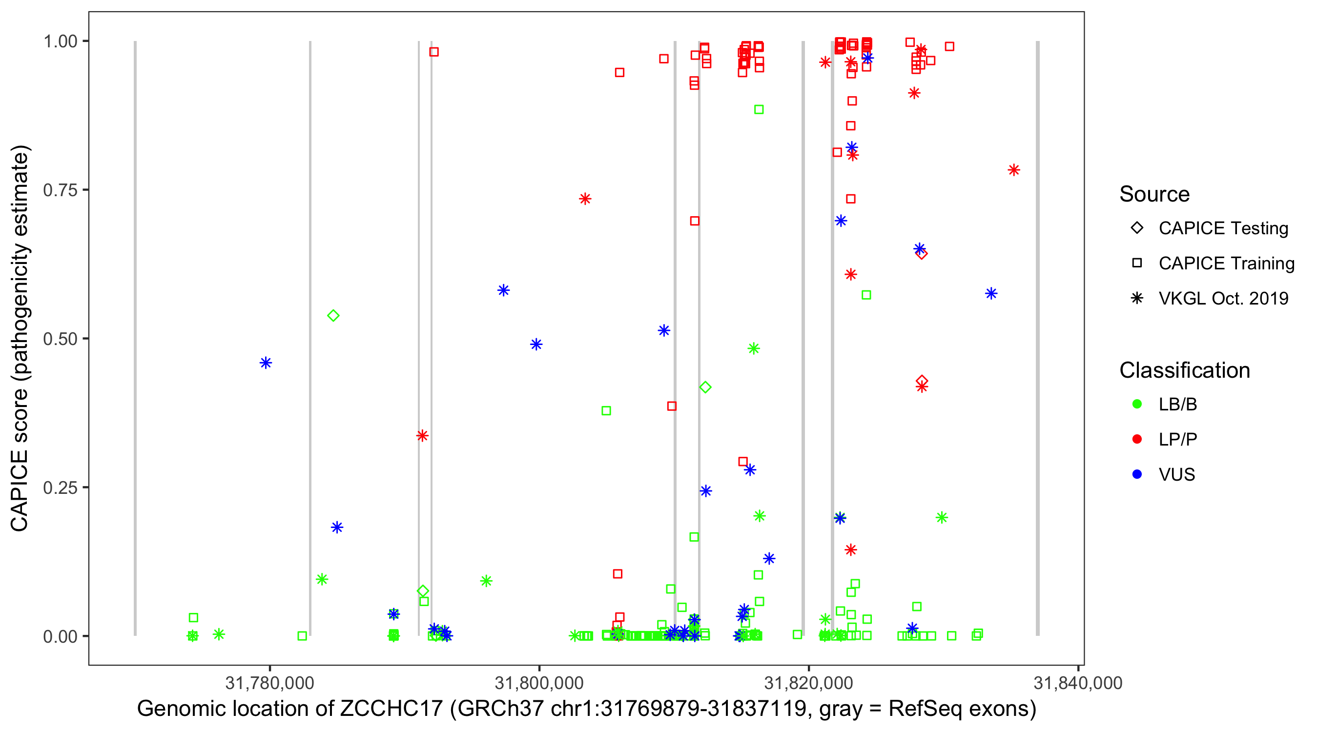 Shown are CAPICE train/test variants plus VKGL Oct 2019.