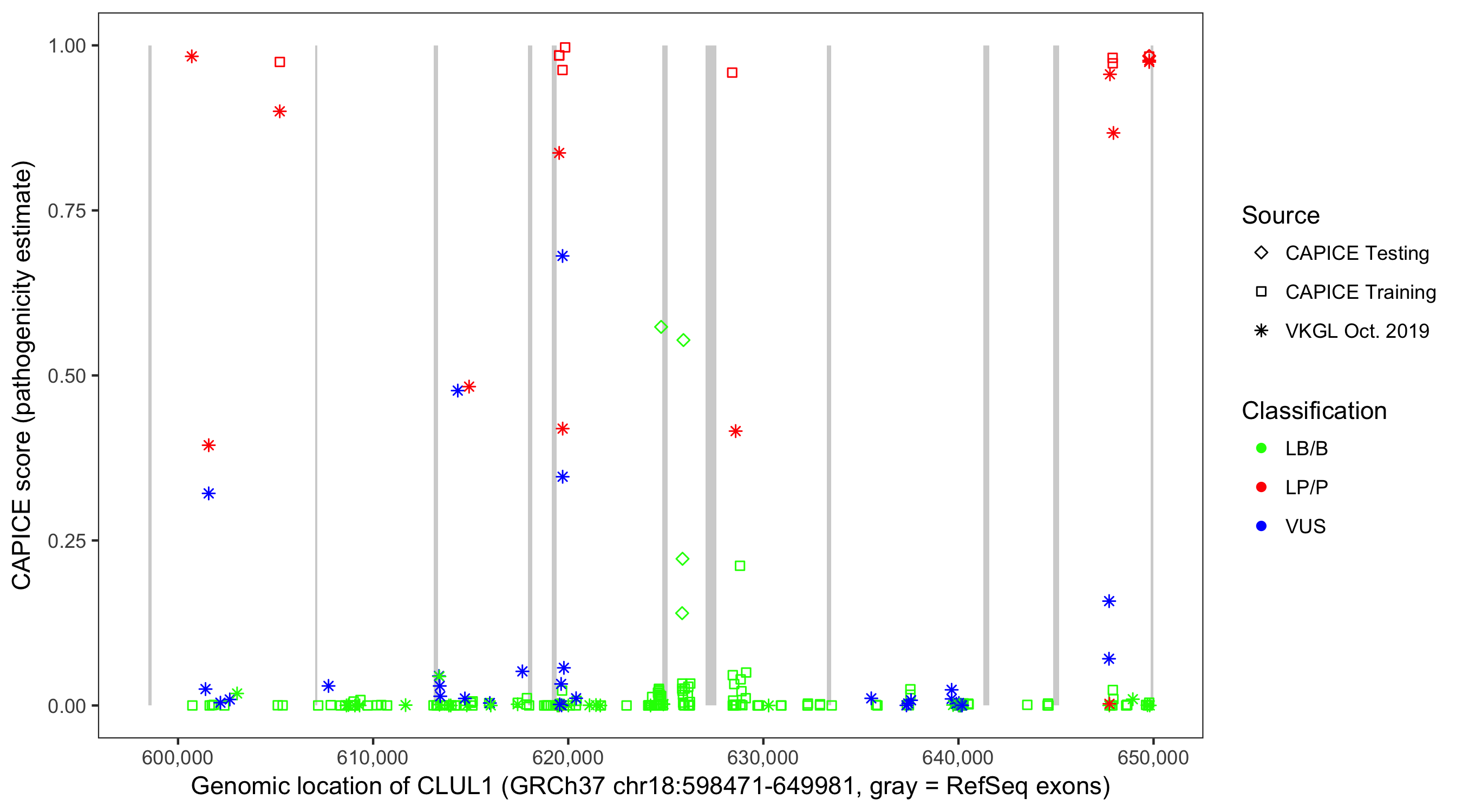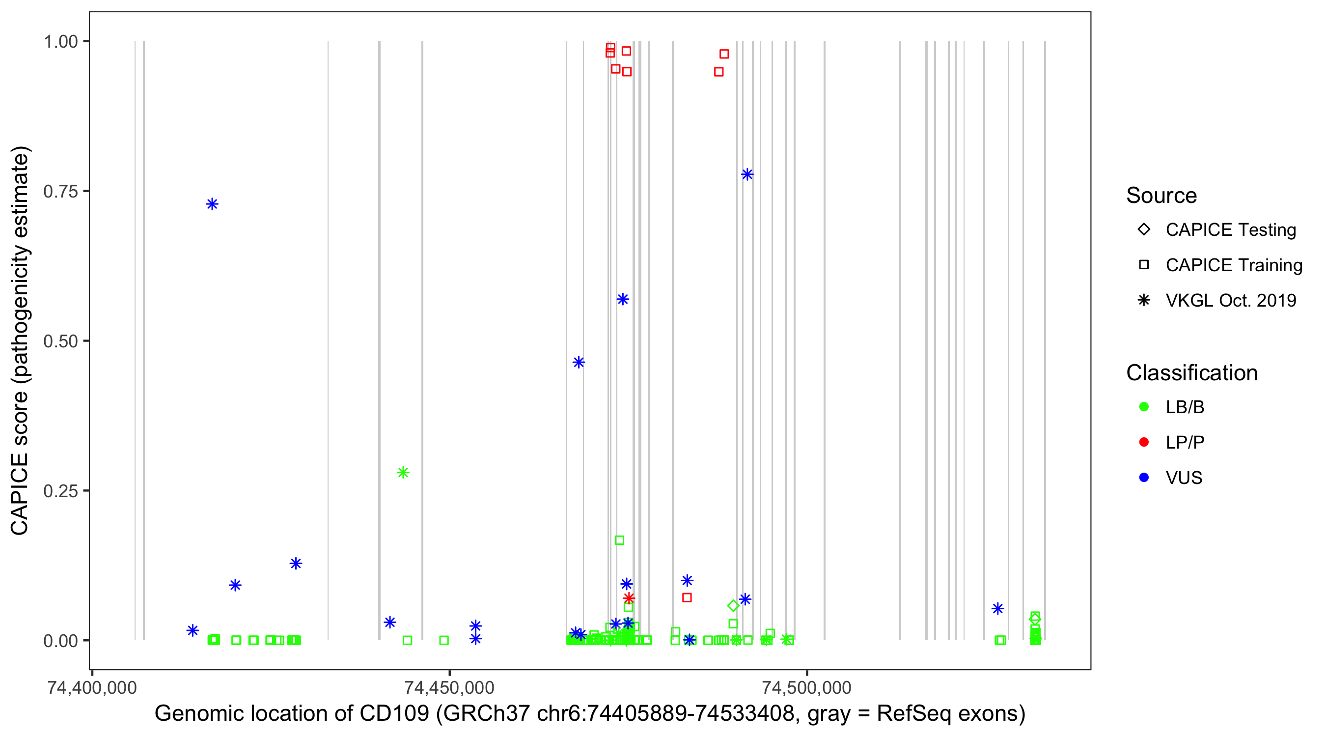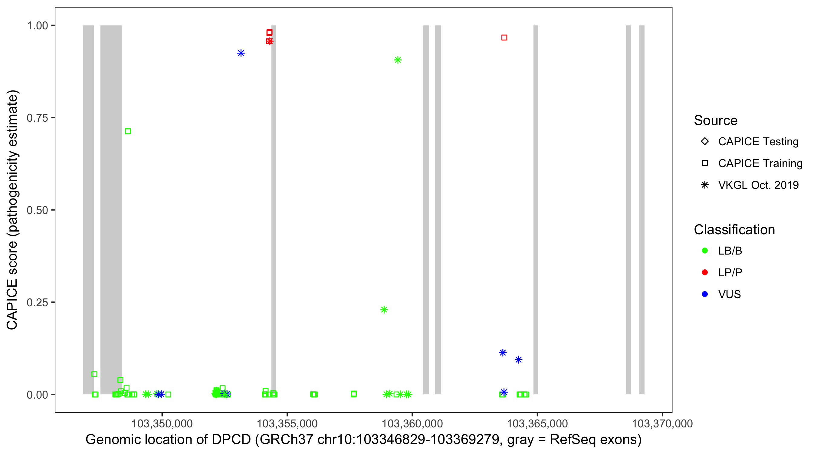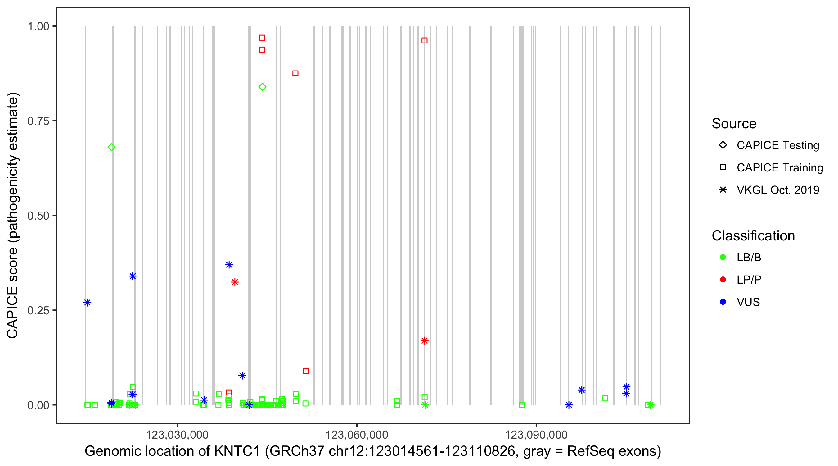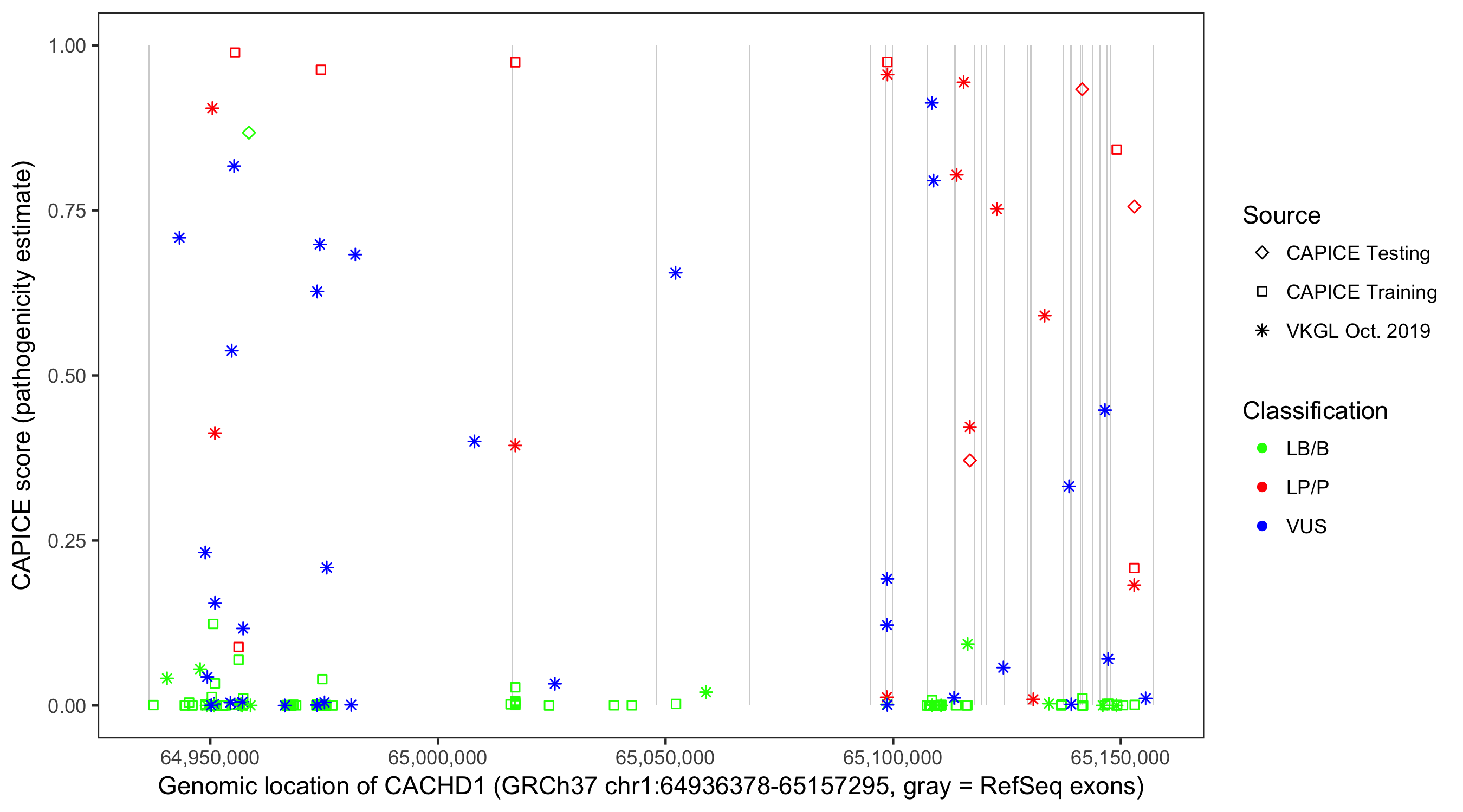 Shown are CAPICE train/test variants plus VKGL Oct 2019.