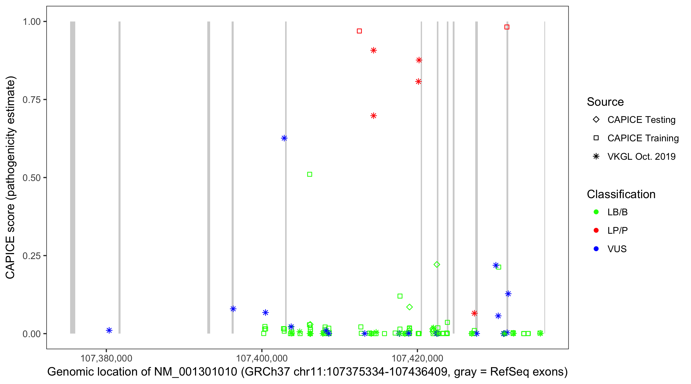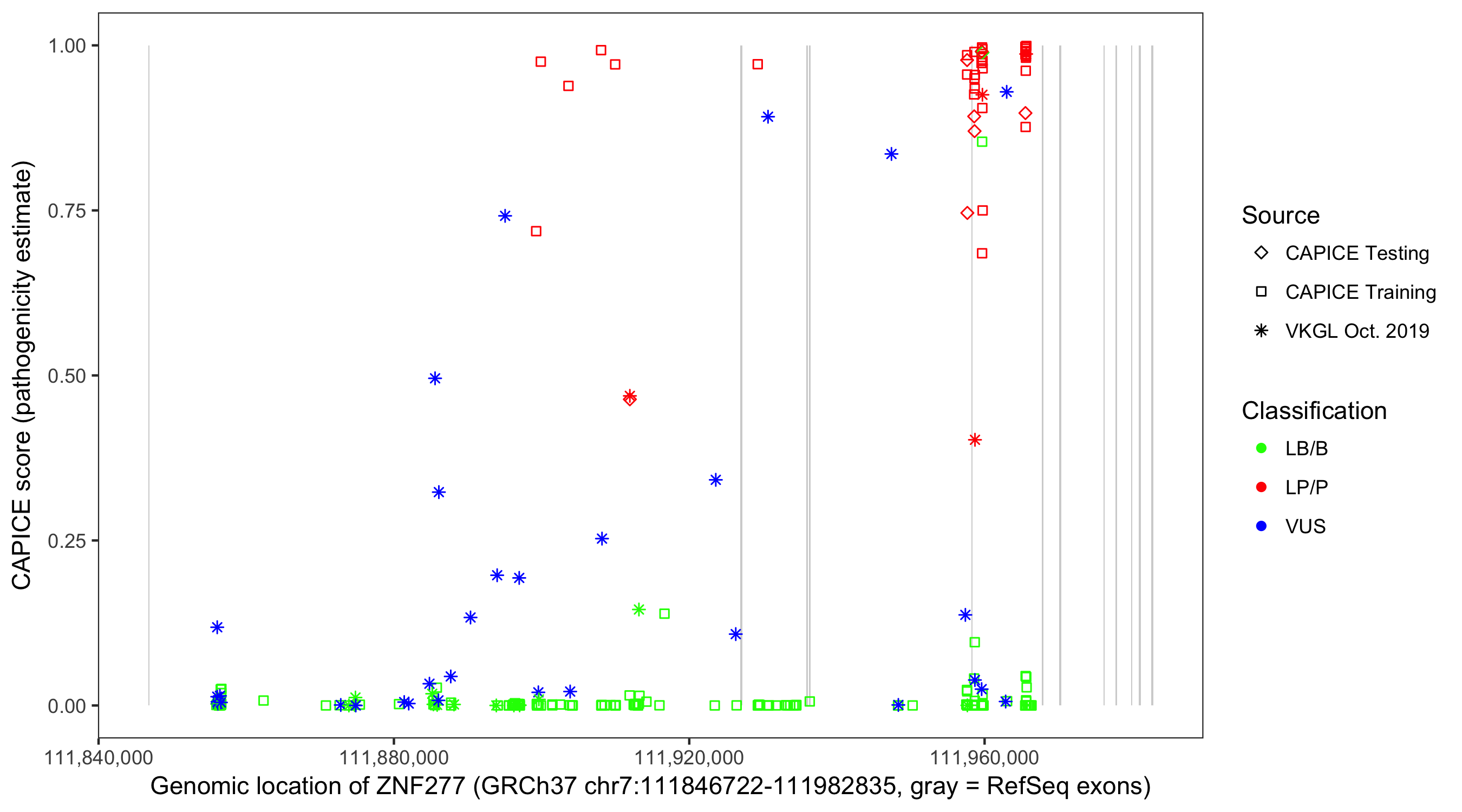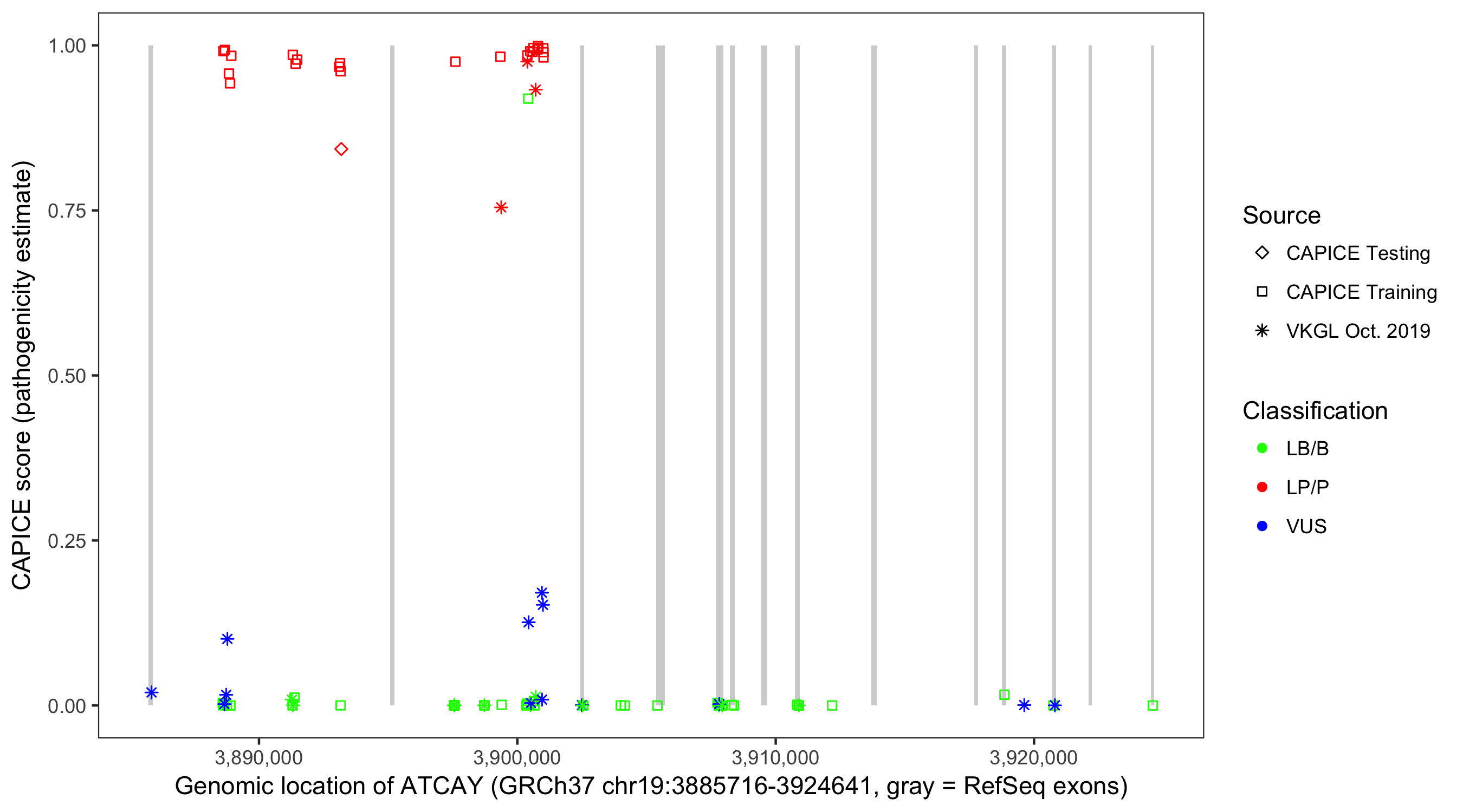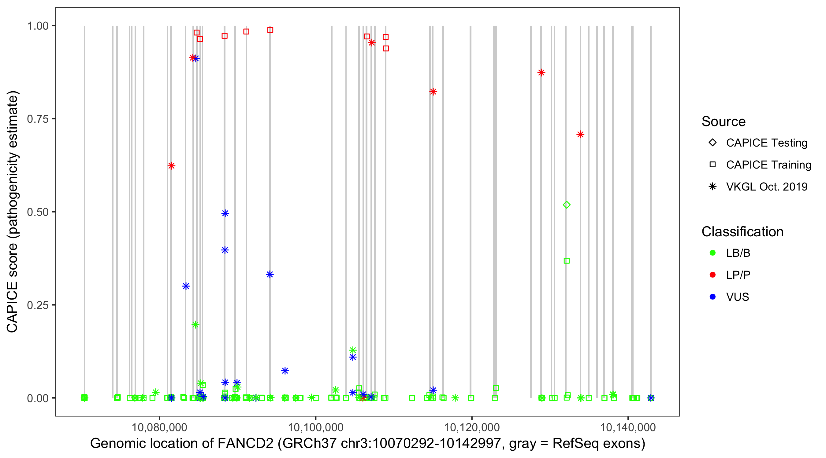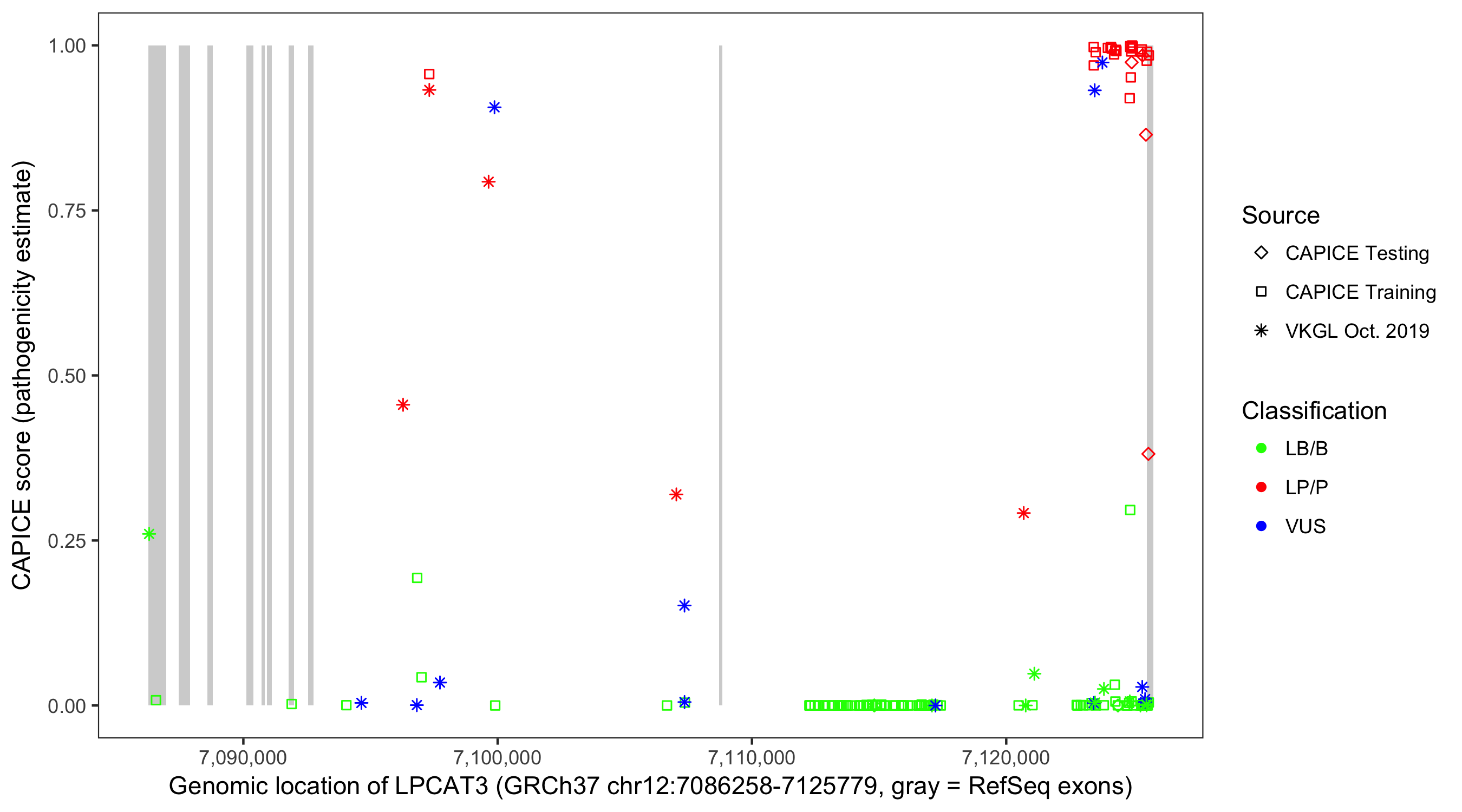 Shown are CAPICE train/test variants plus VKGL Oct 2019.