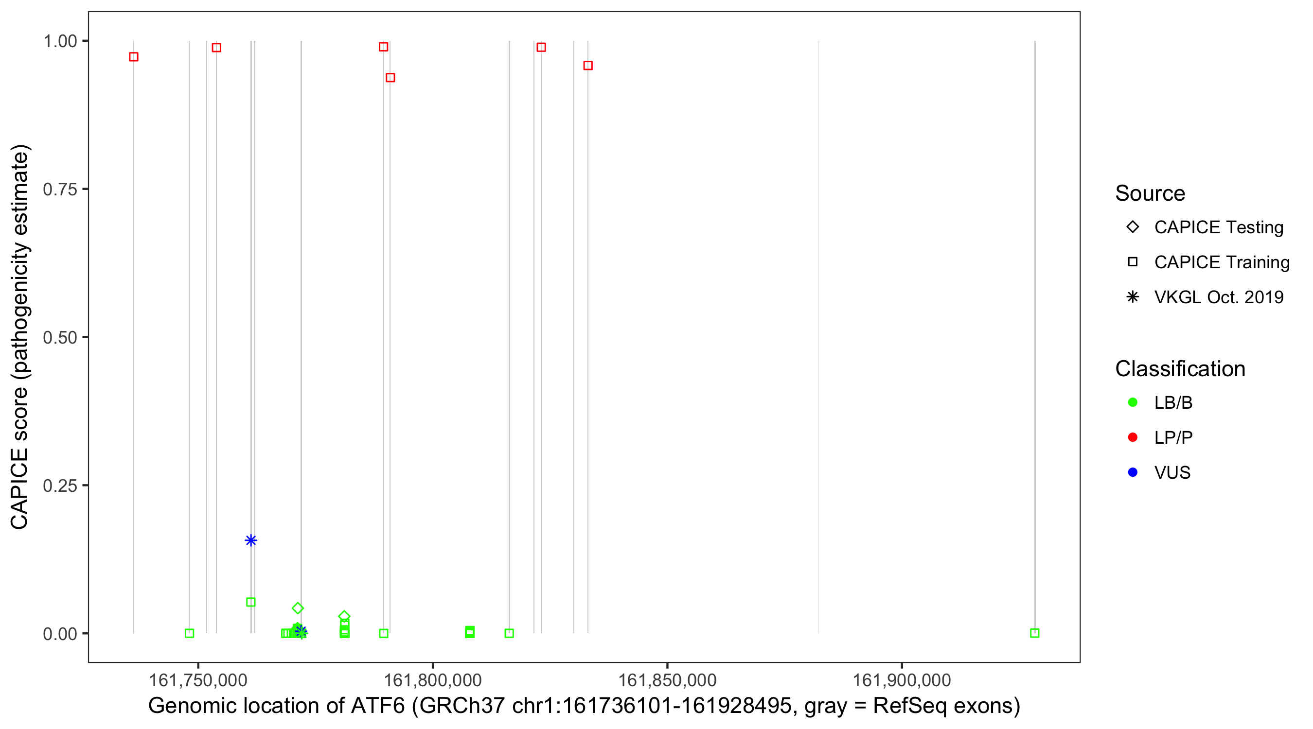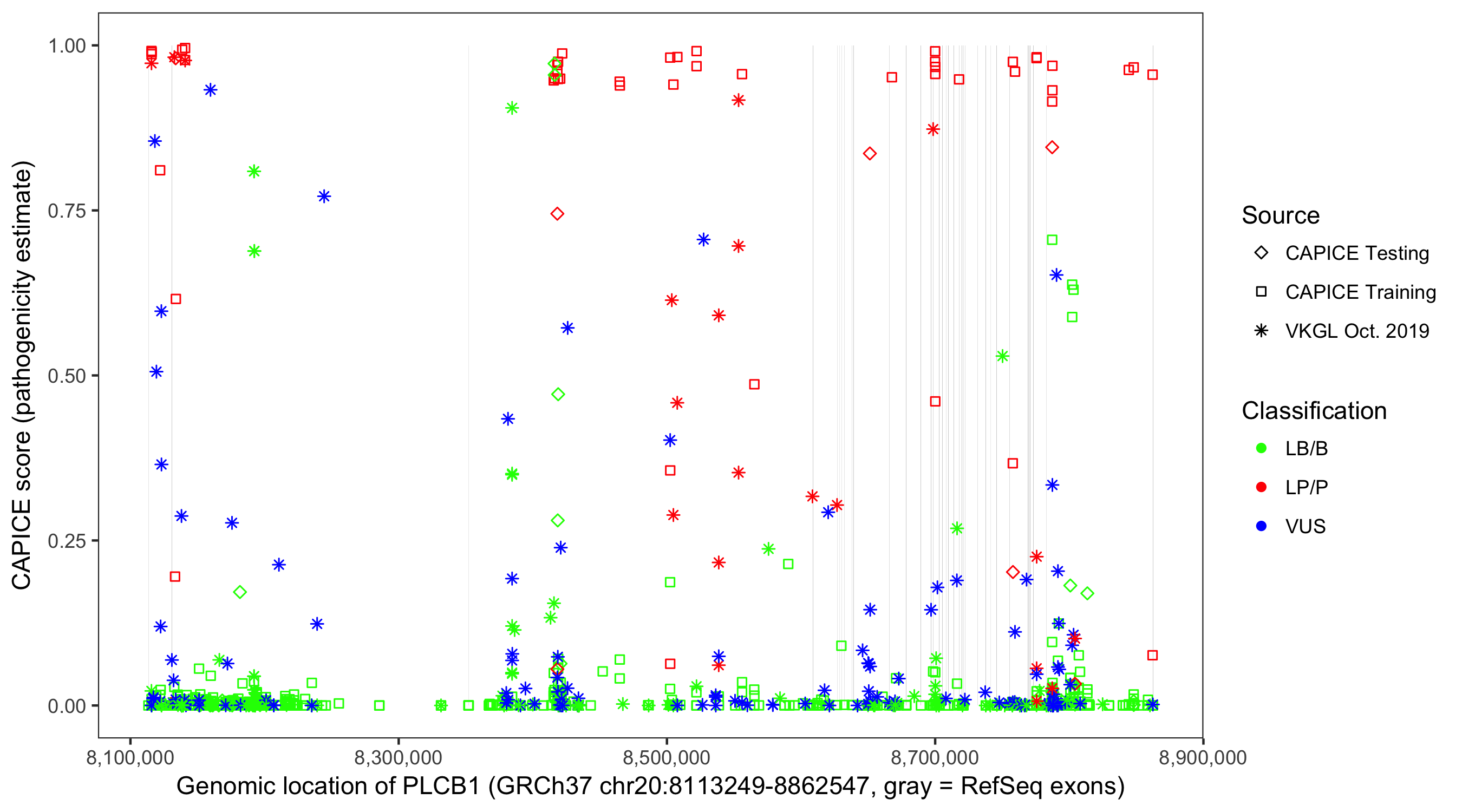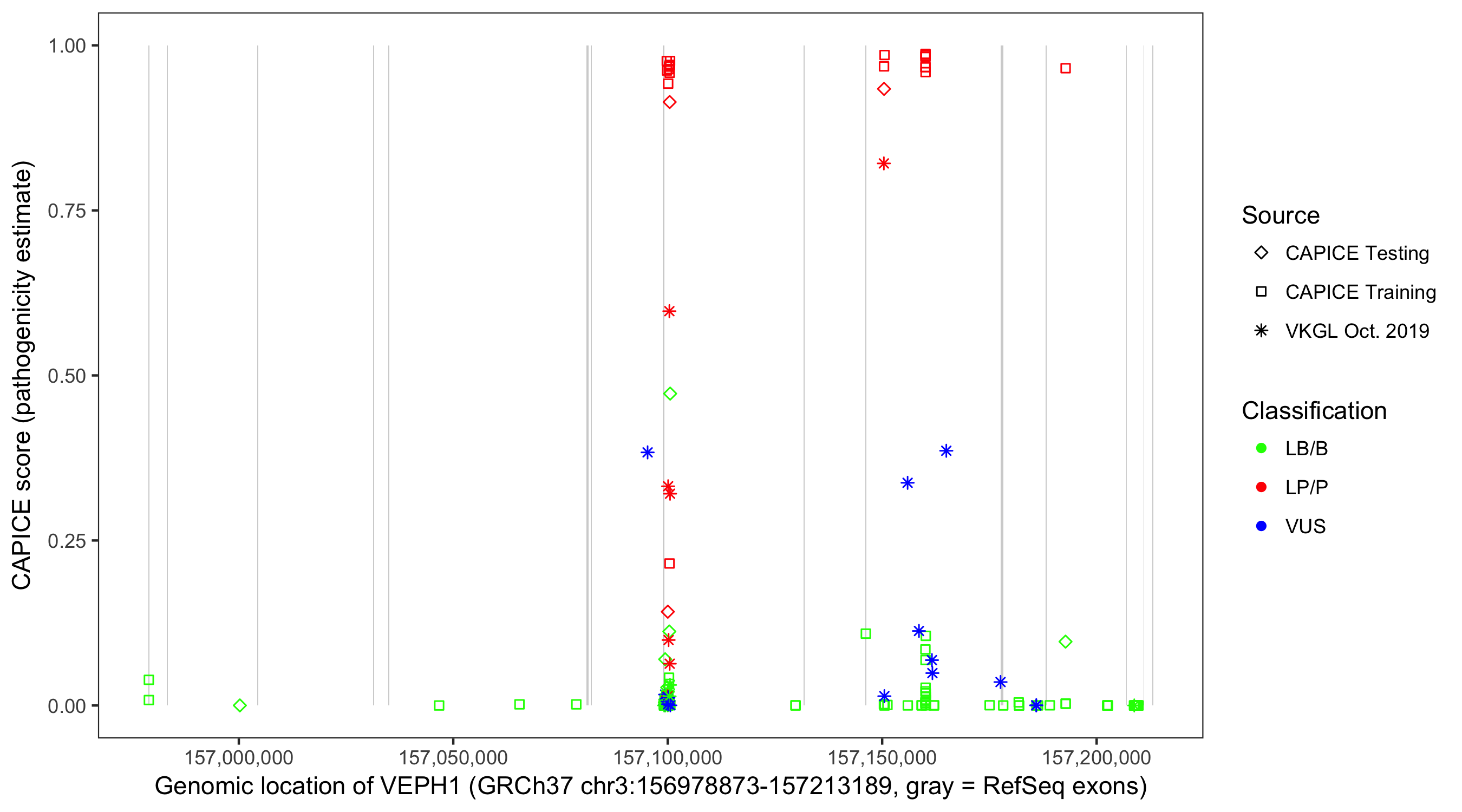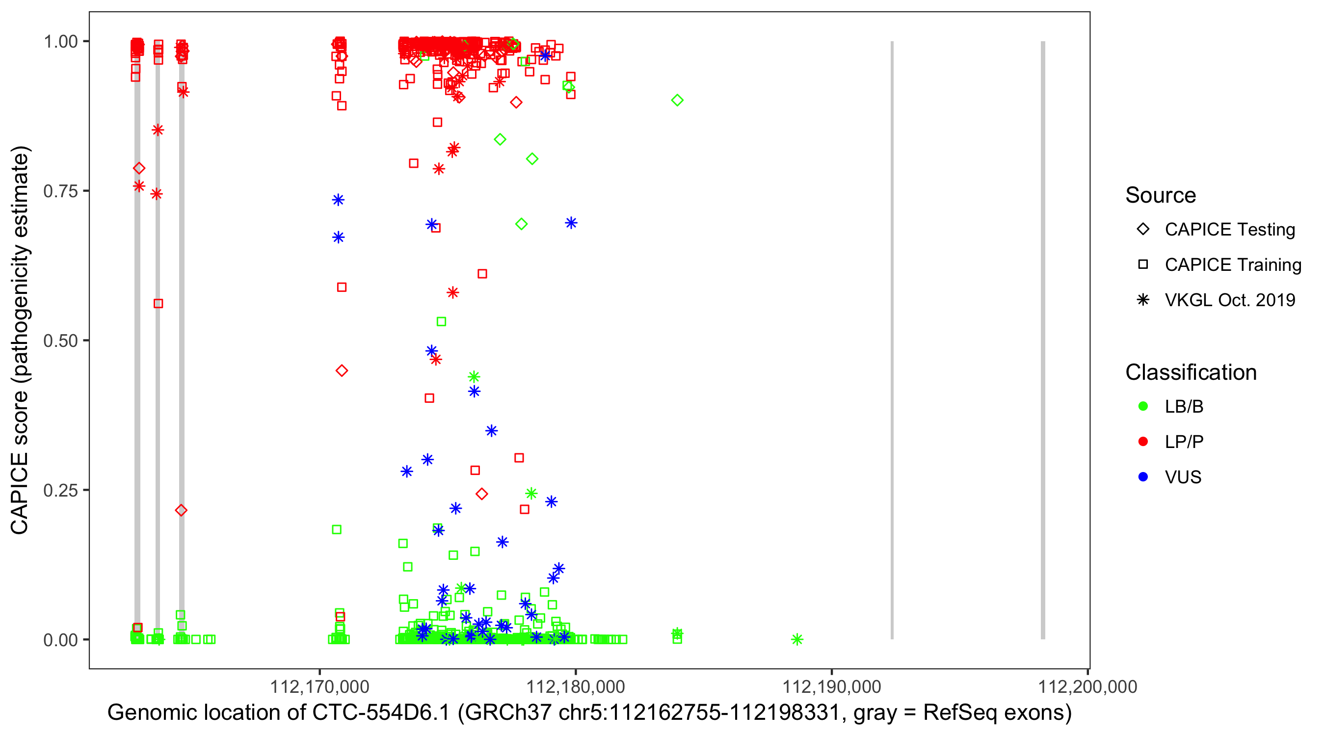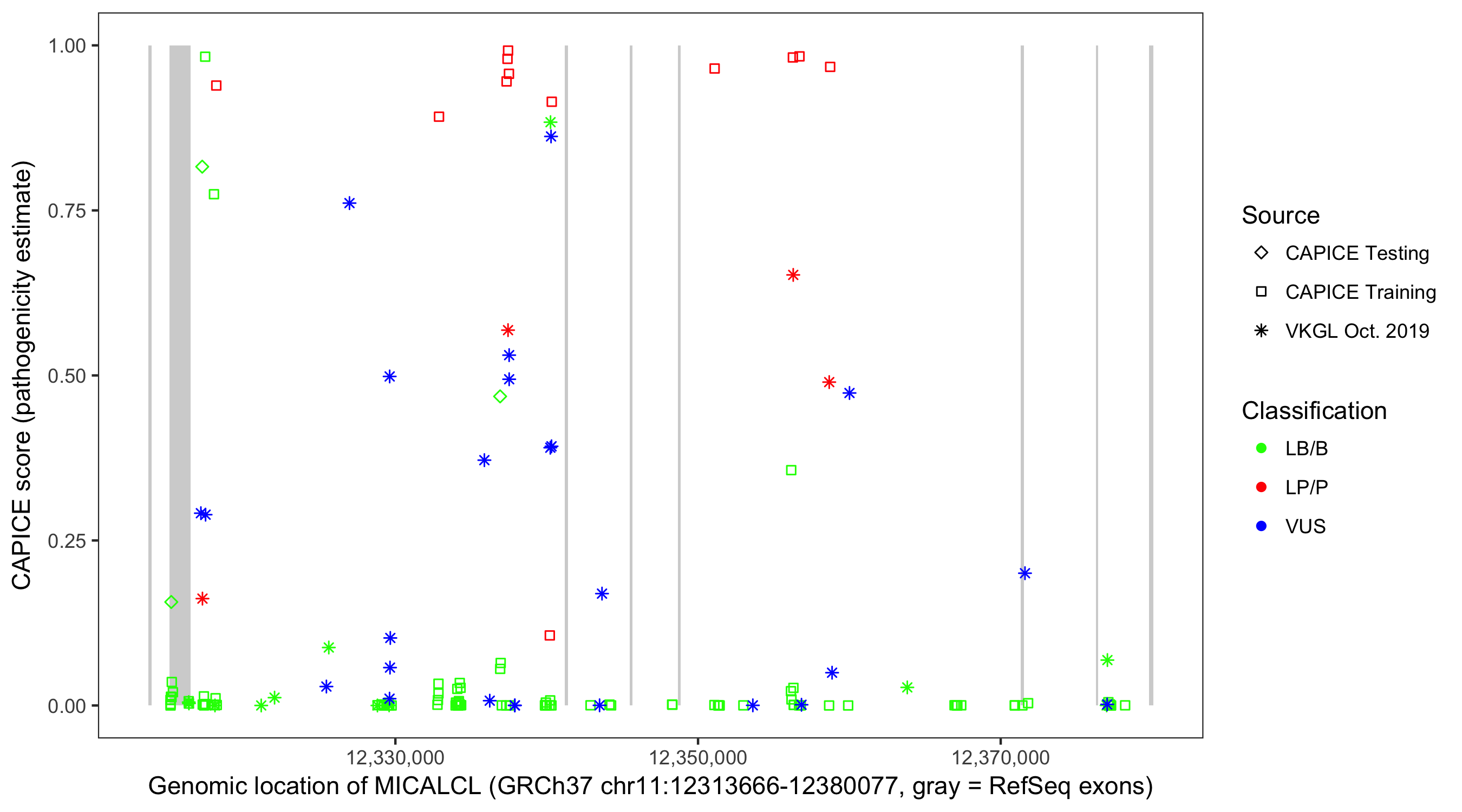 Shown are CAPICE train/test variants plus VKGL Oct 2019.