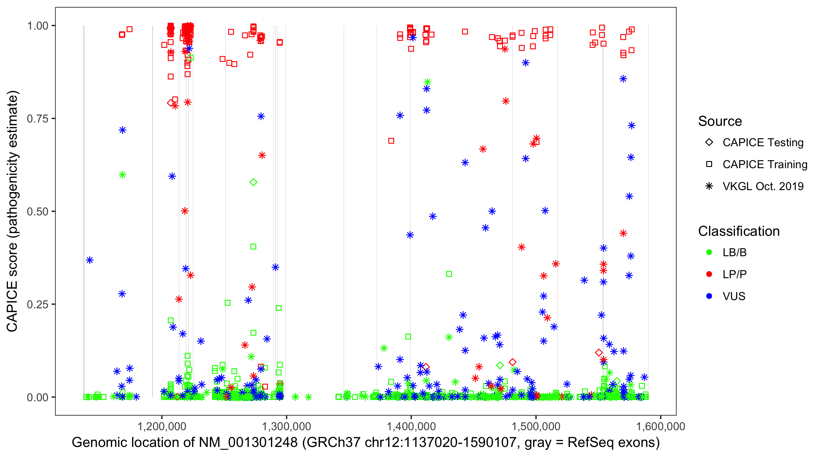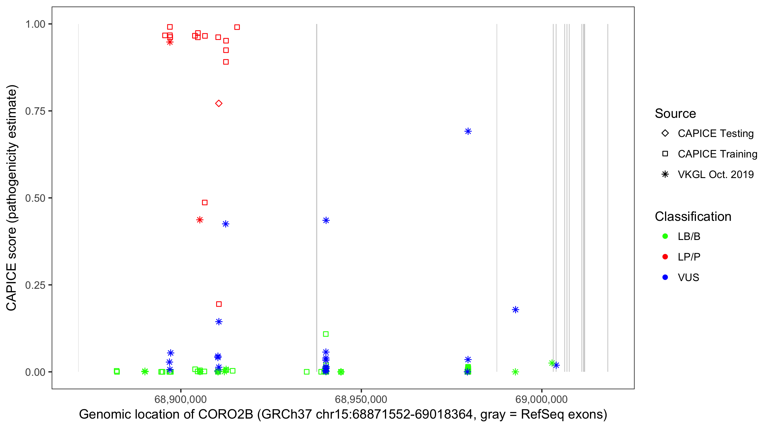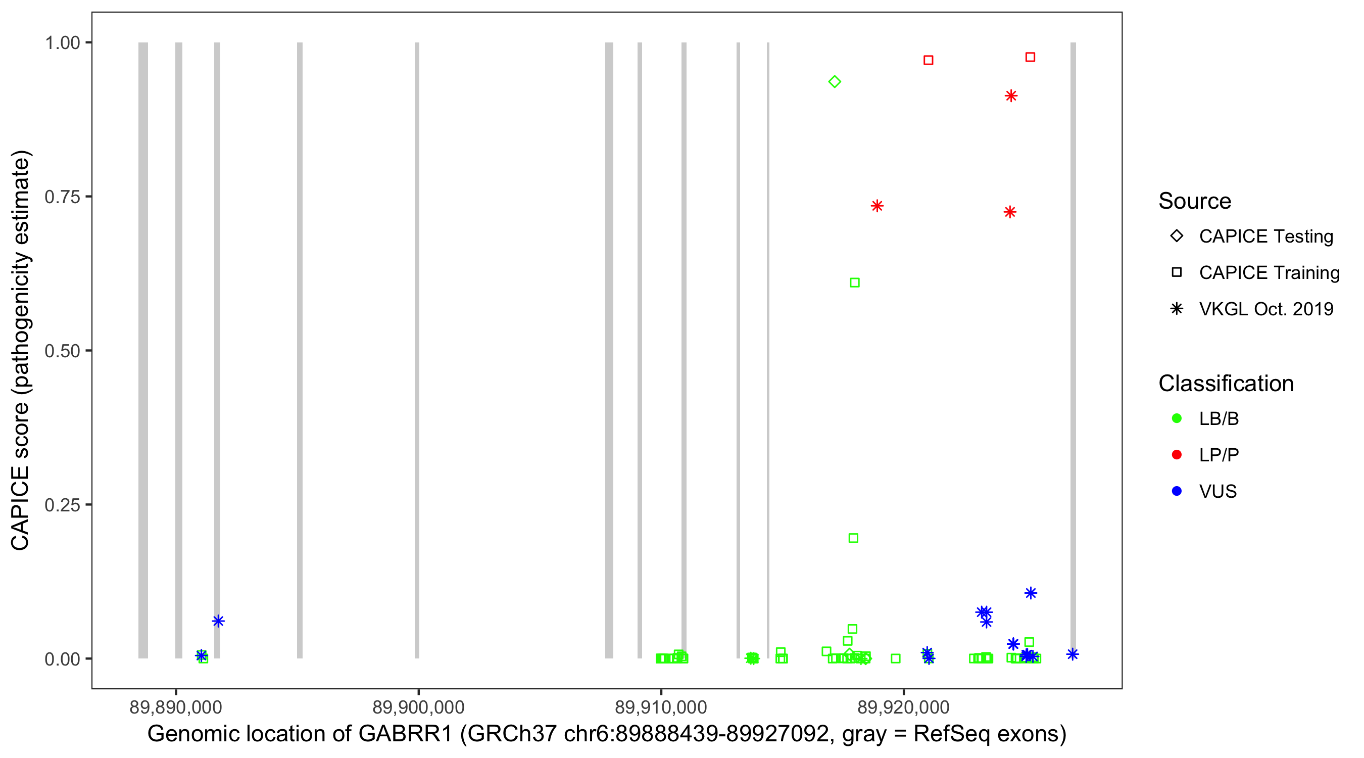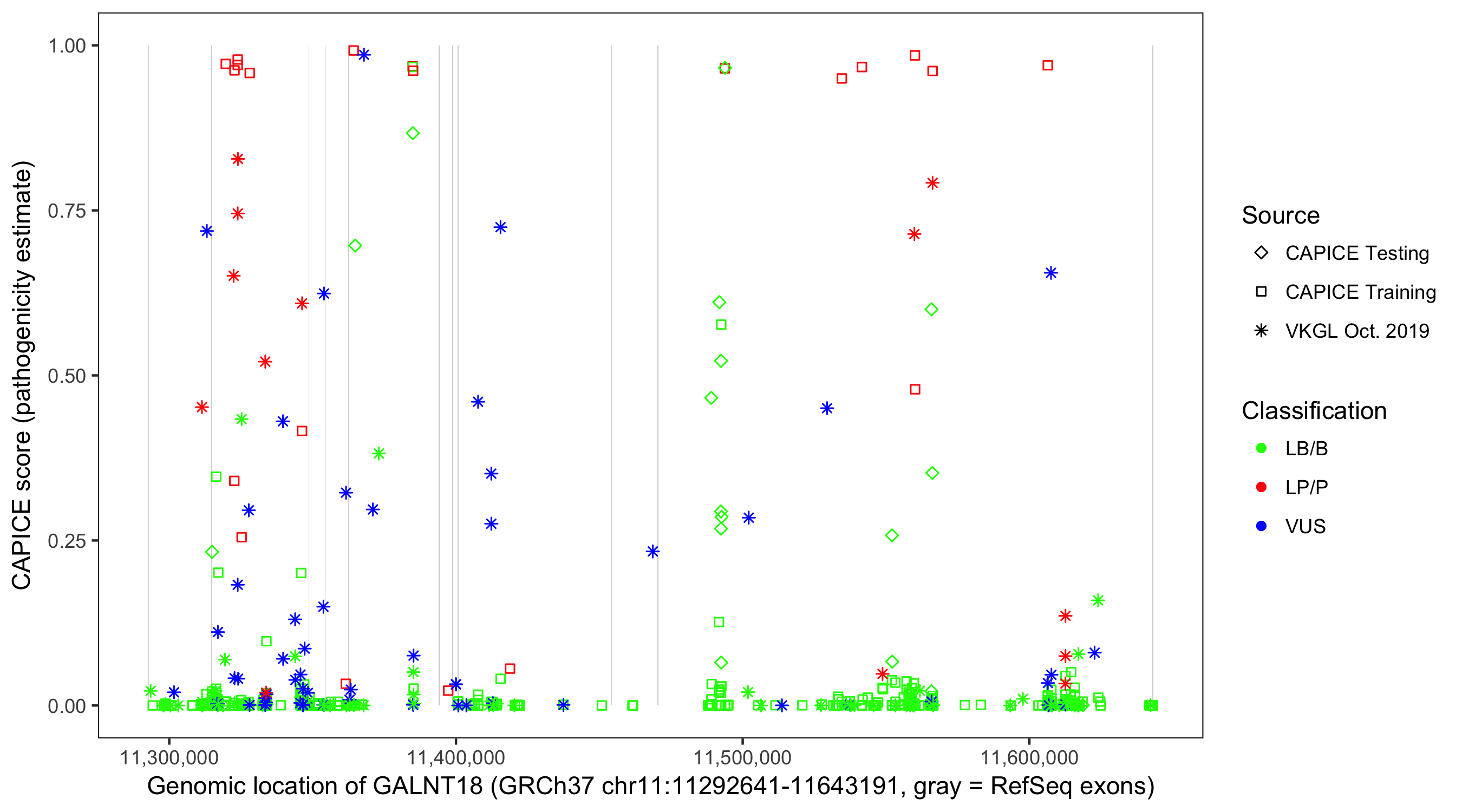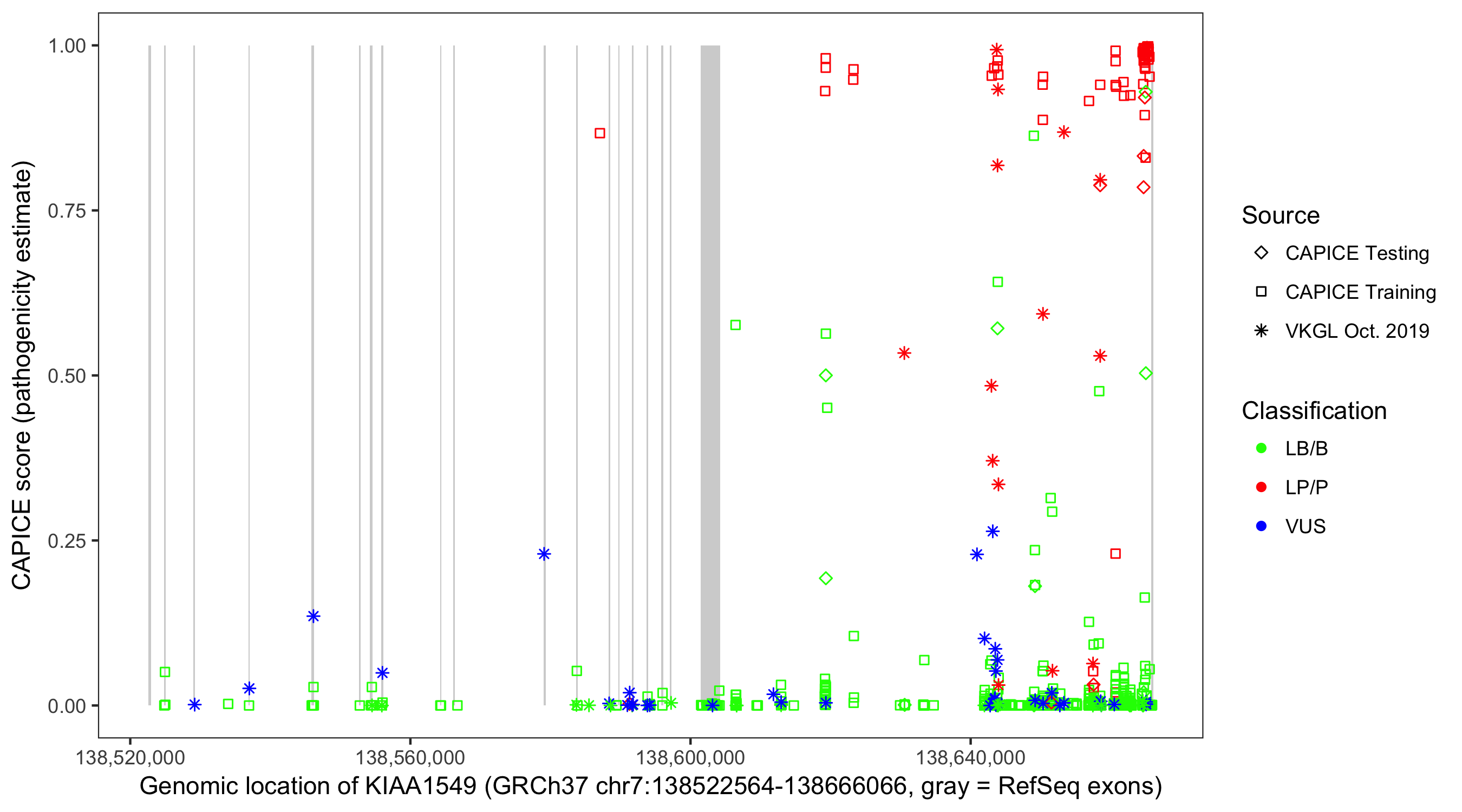 Shown are CAPICE train/test variants plus VKGL Oct 2019.