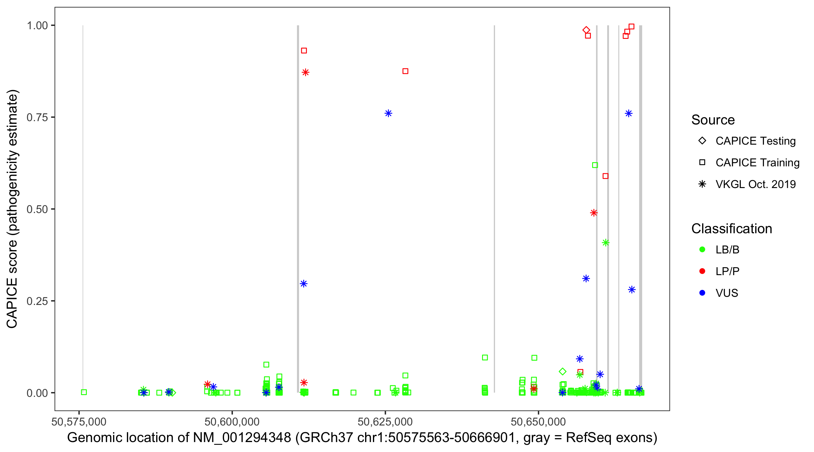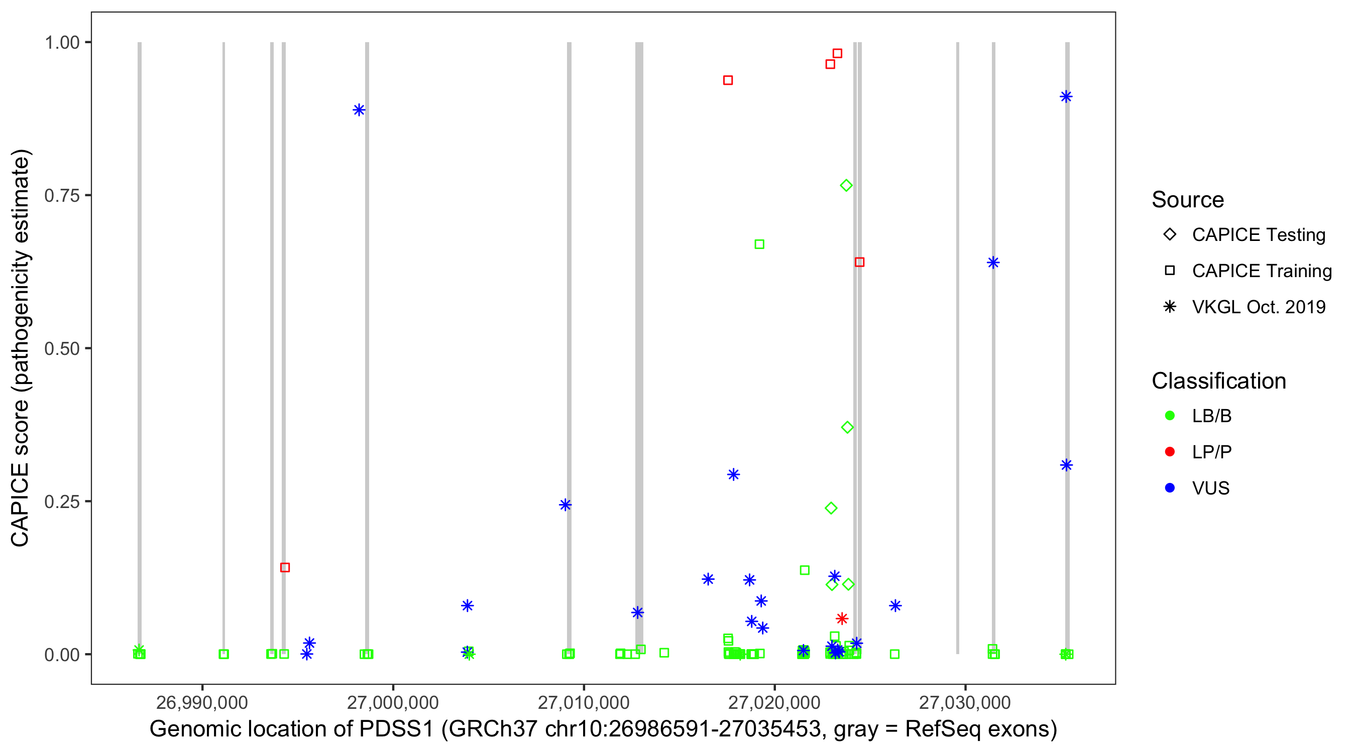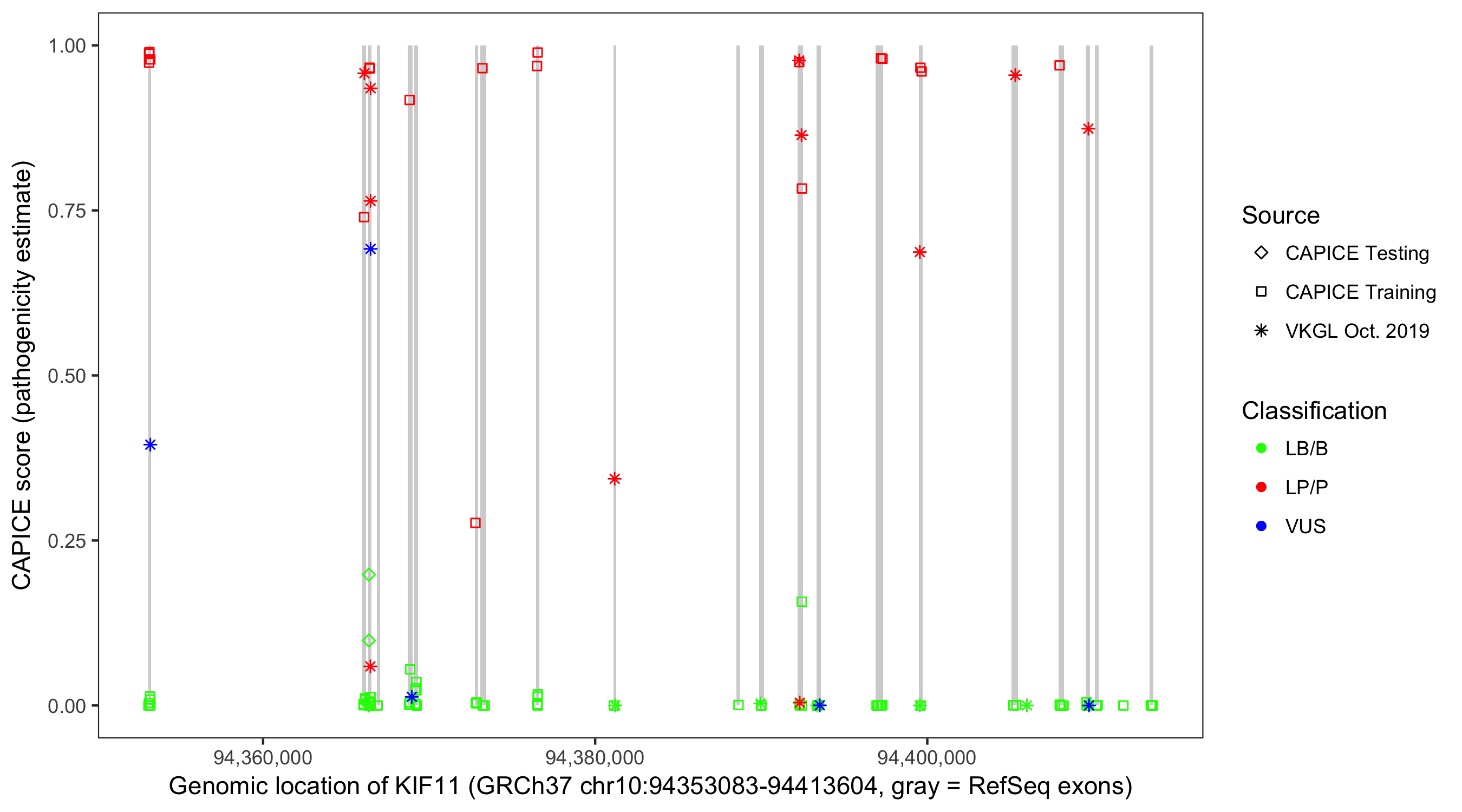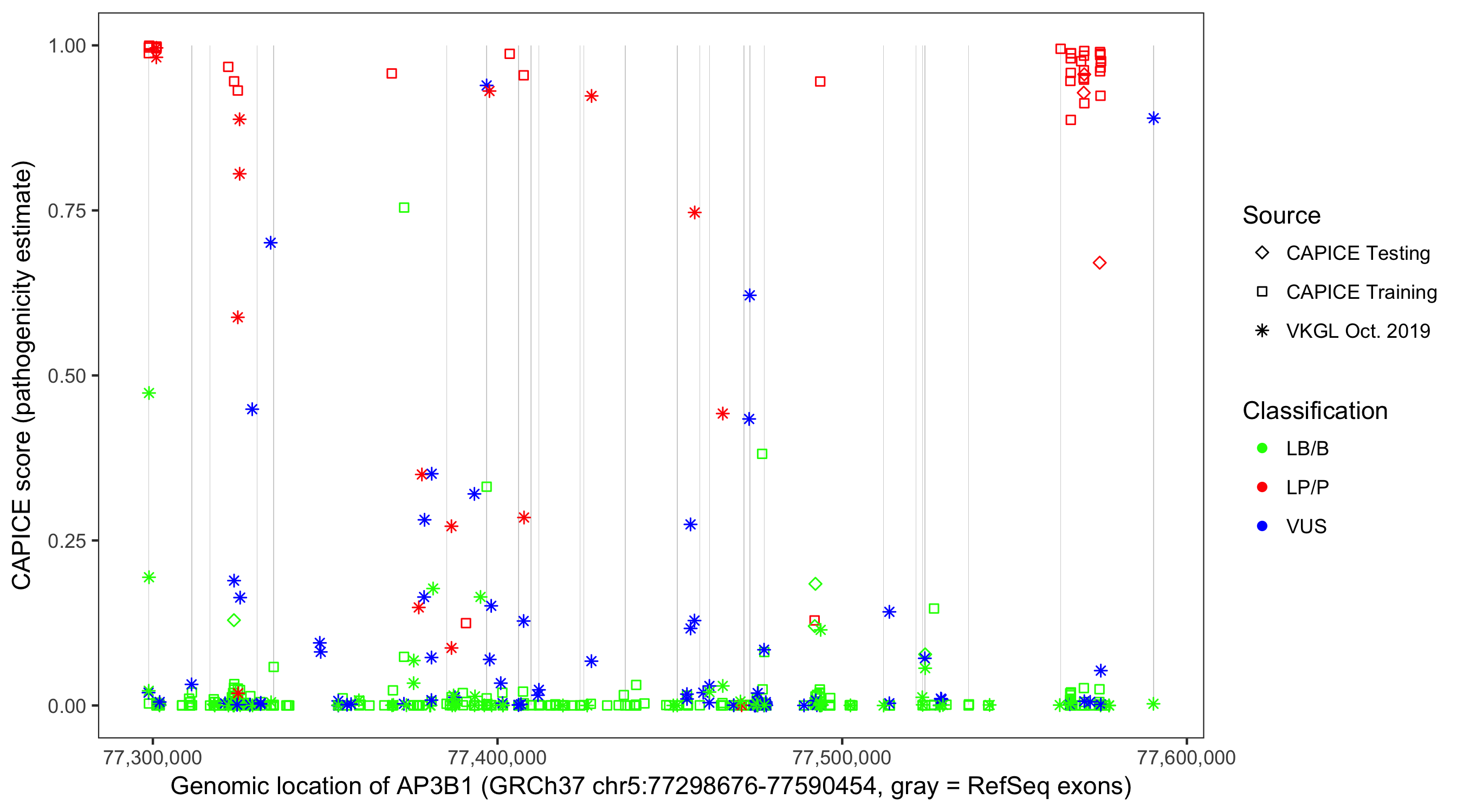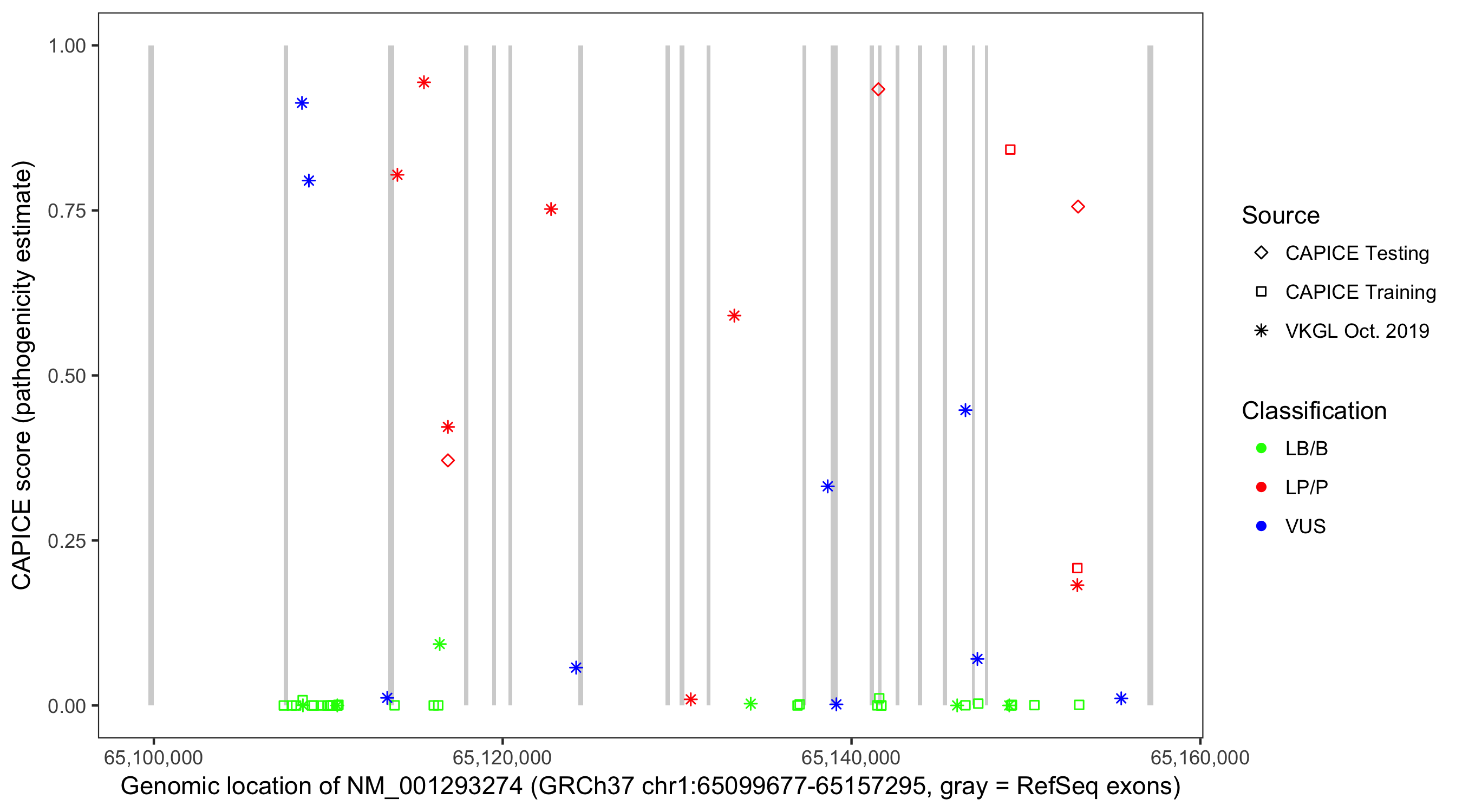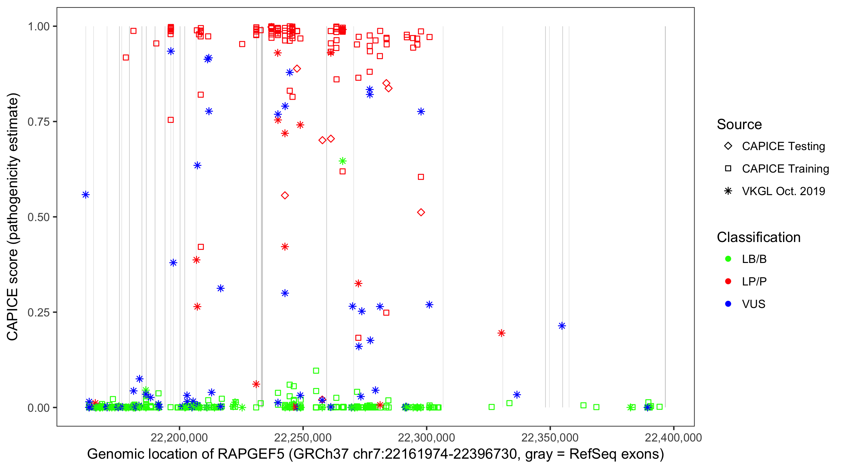 Shown are CAPICE train/test variants plus VKGL Oct 2019.