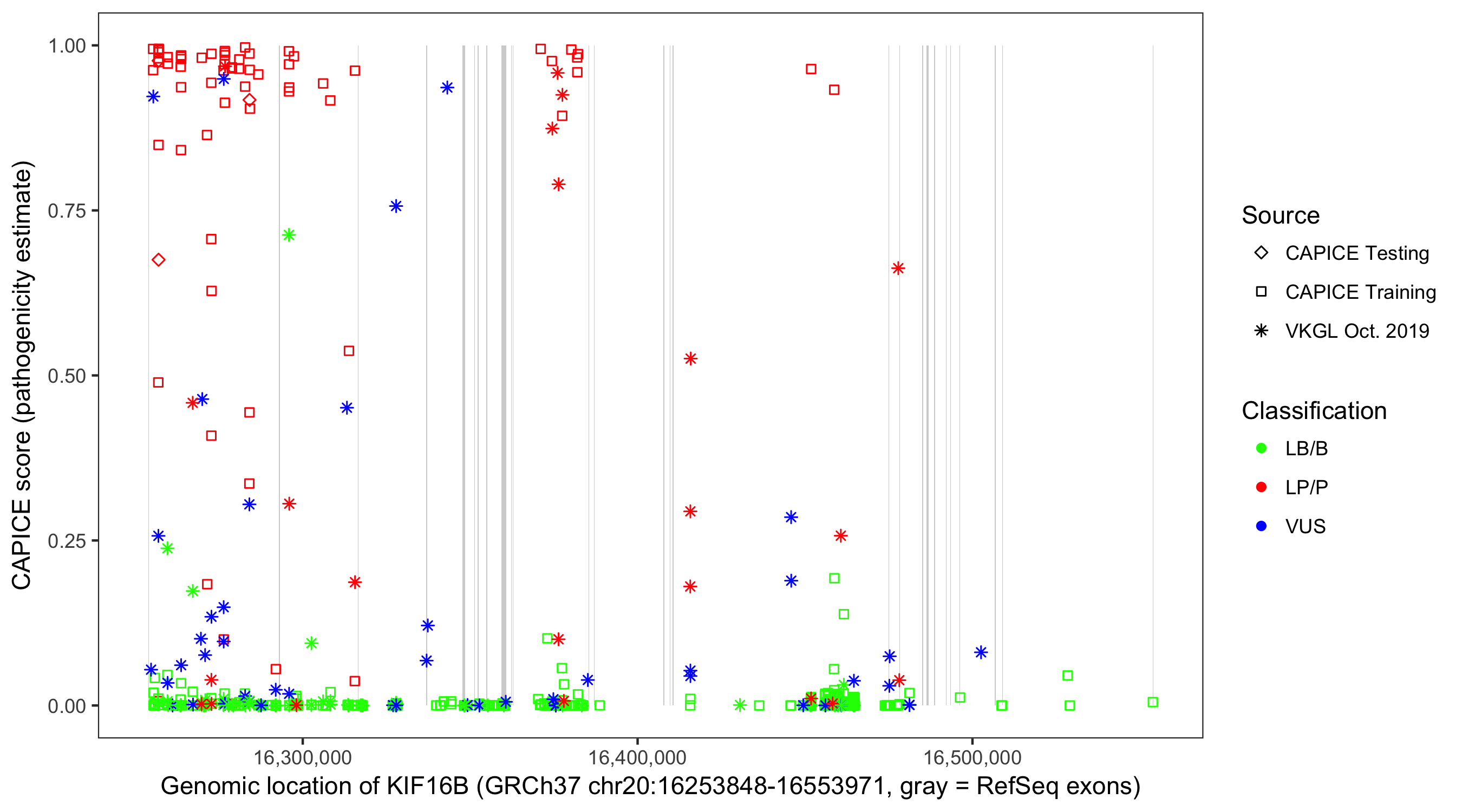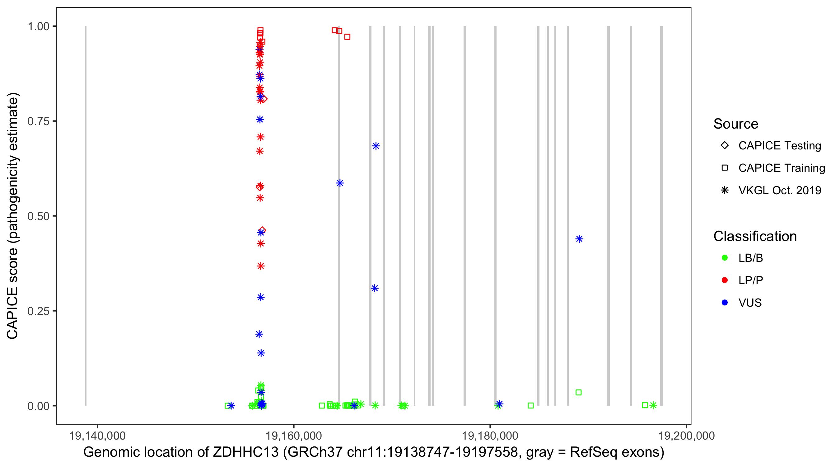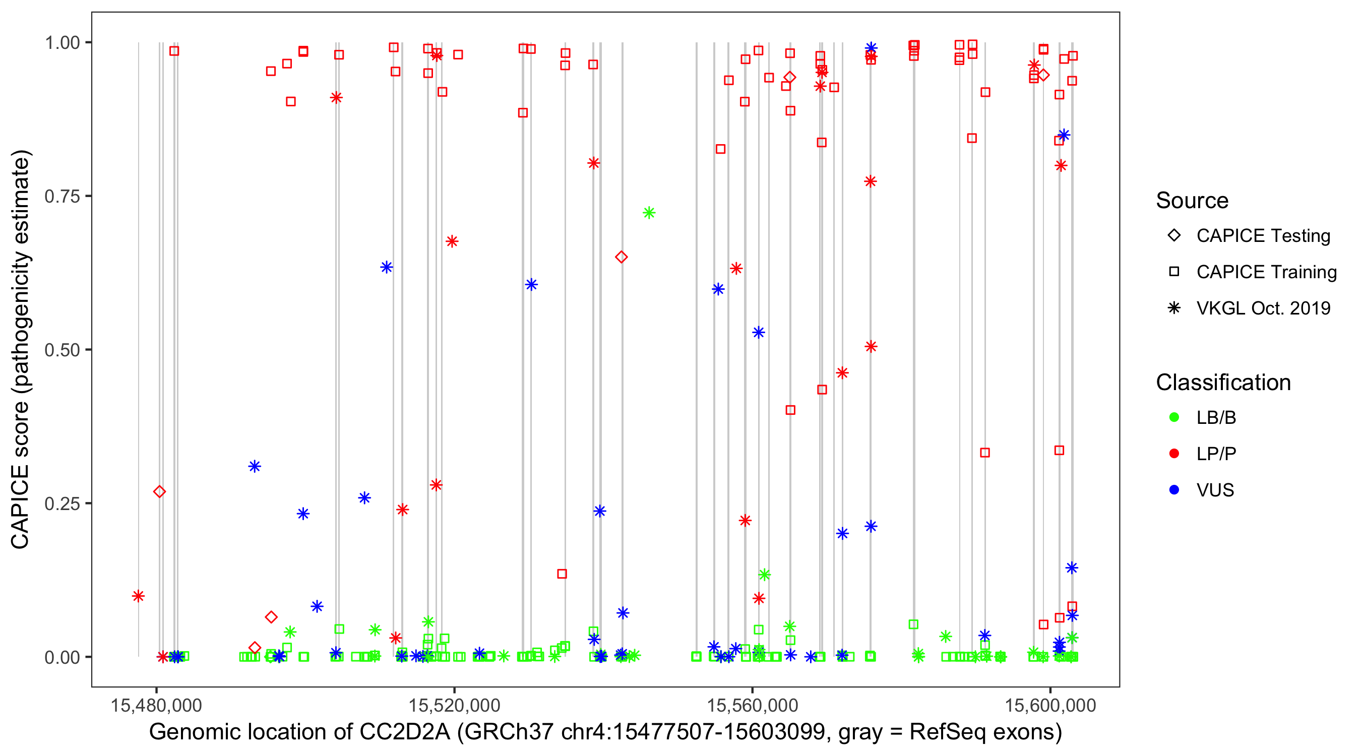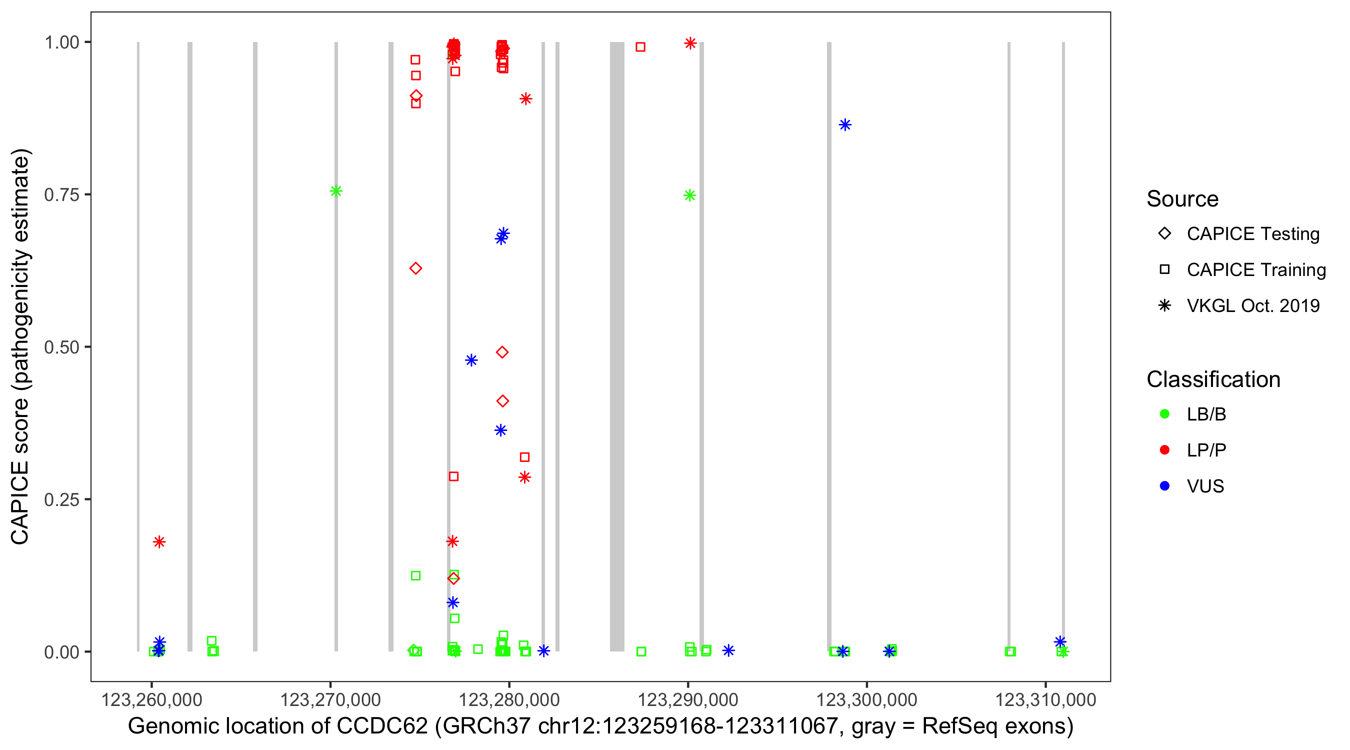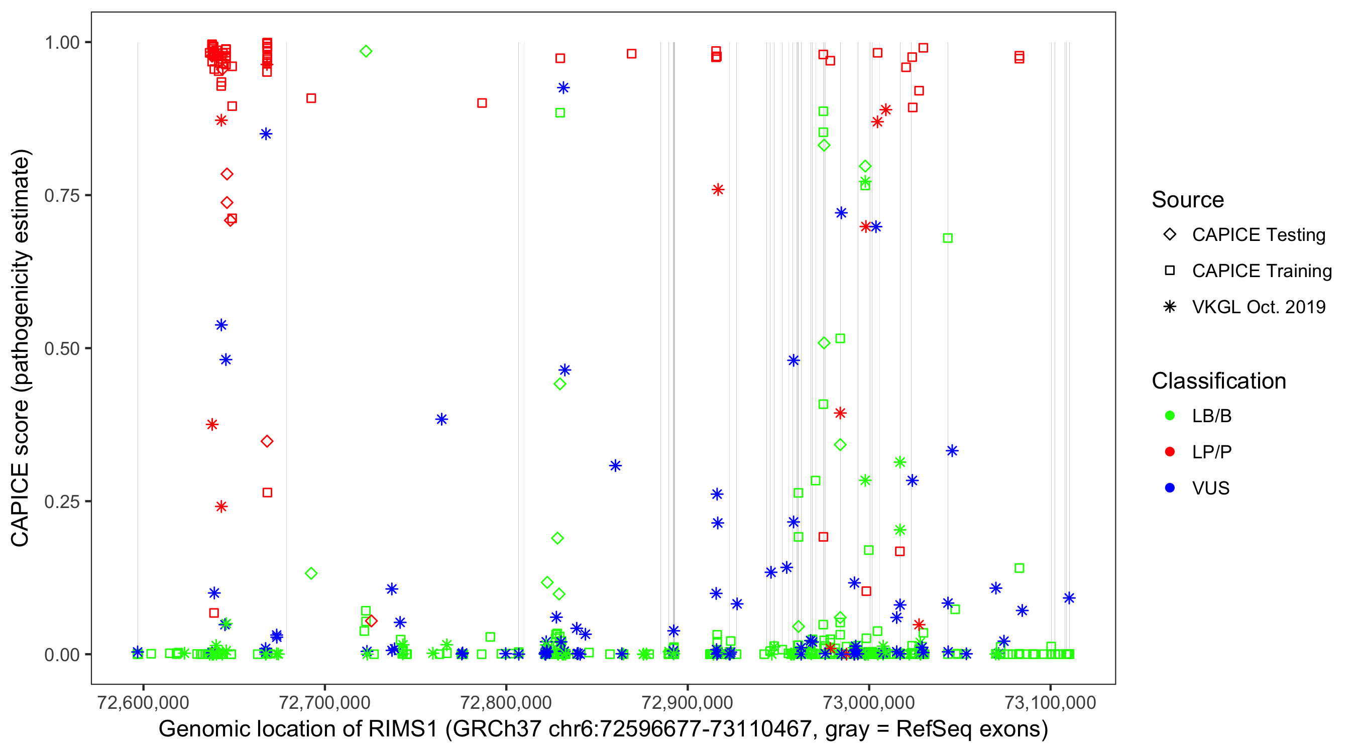 Shown are CAPICE train/test variants plus VKGL Oct 2019.