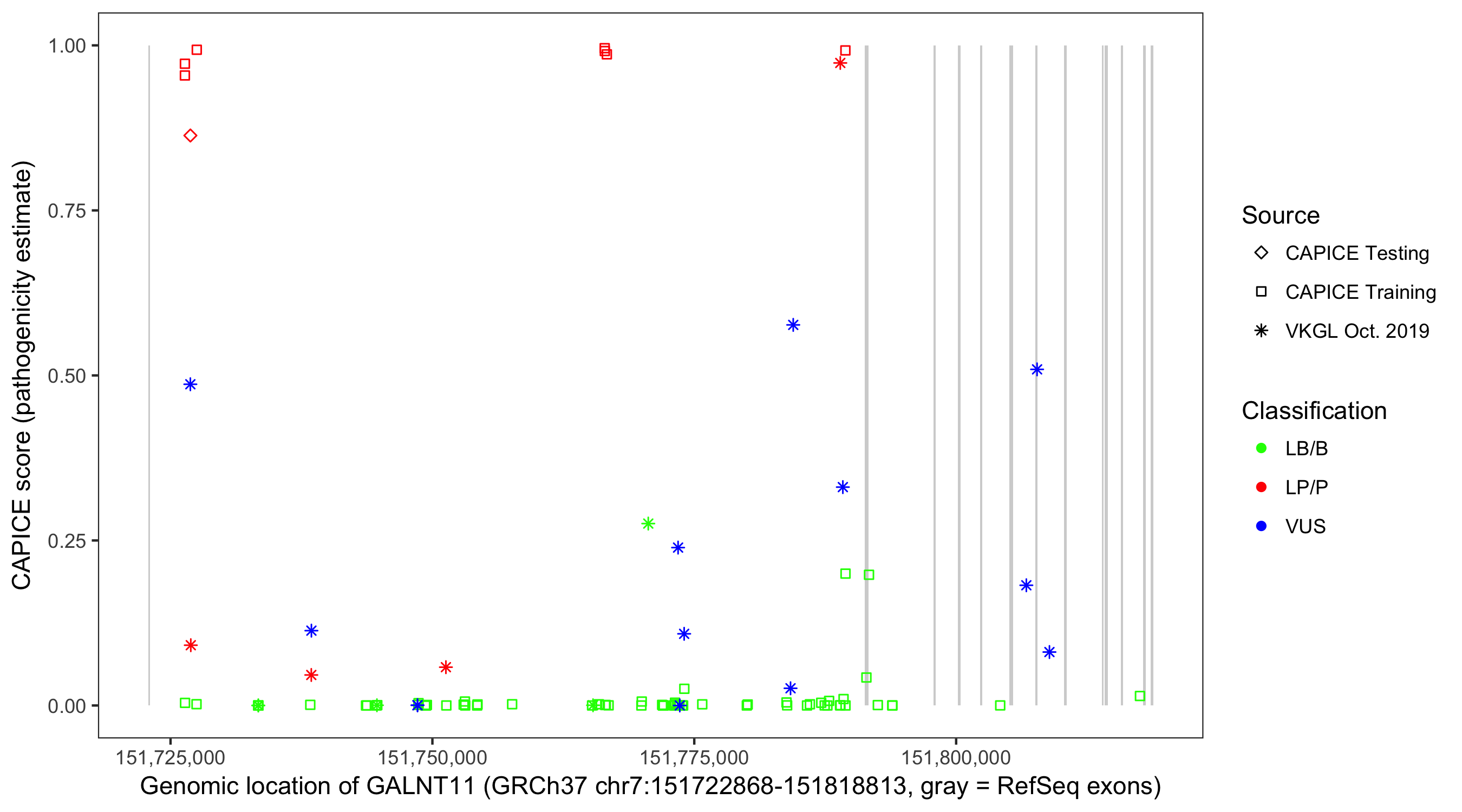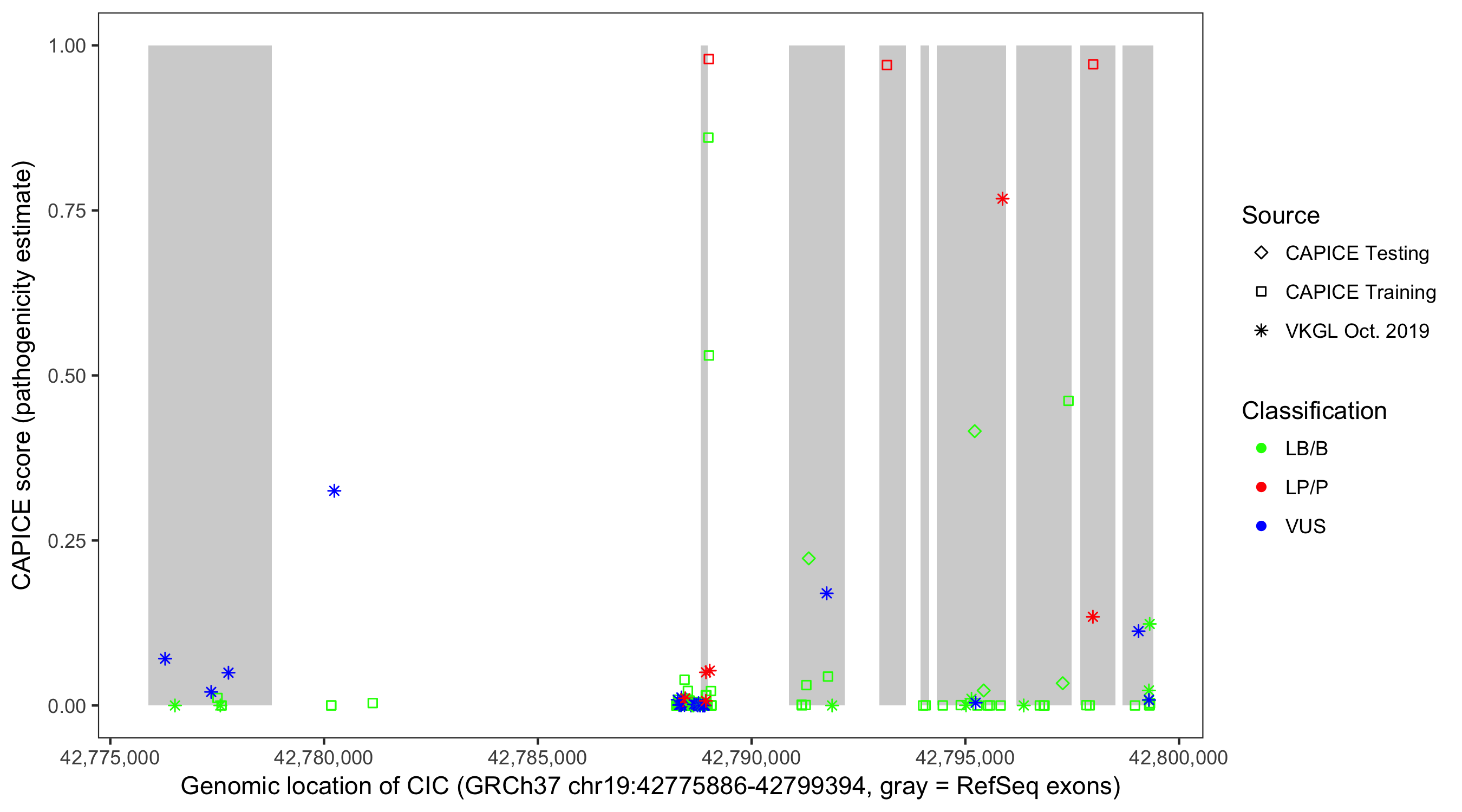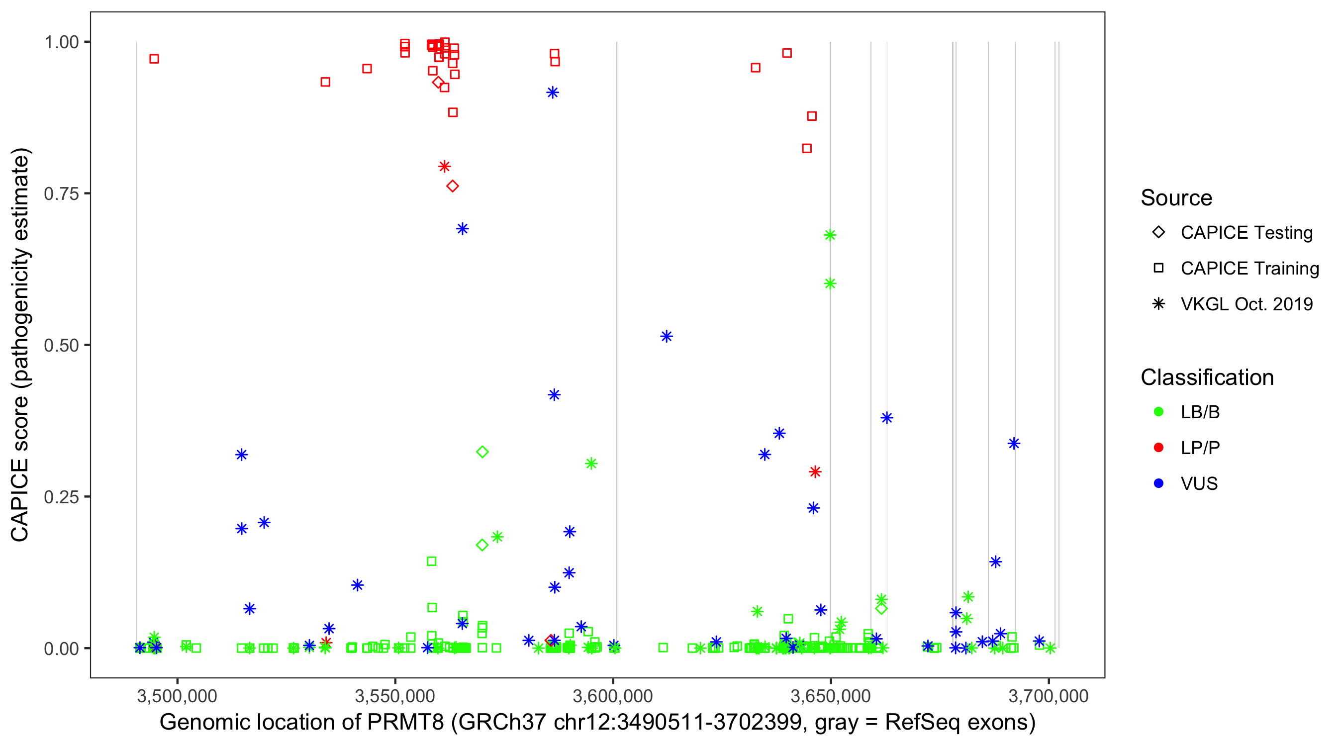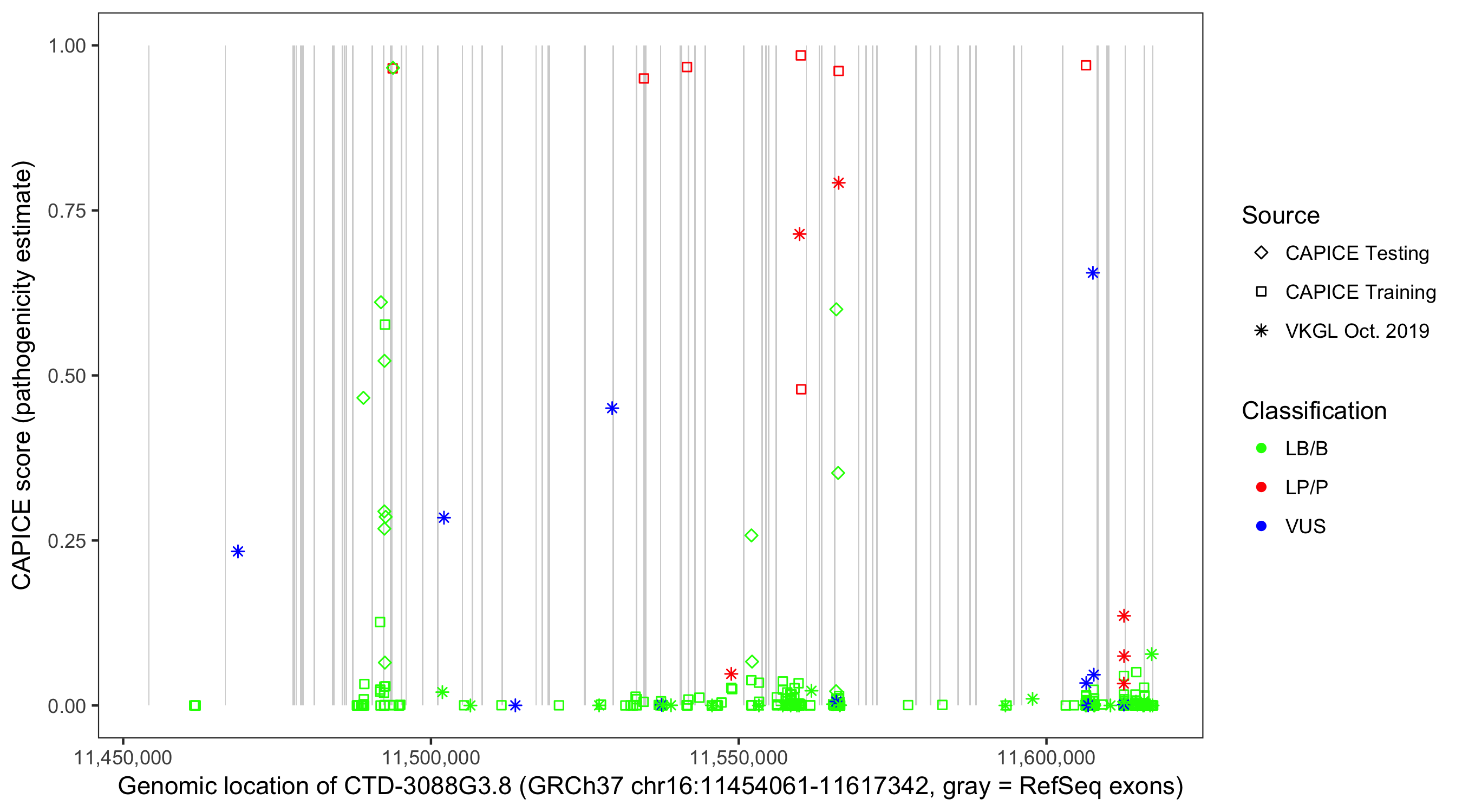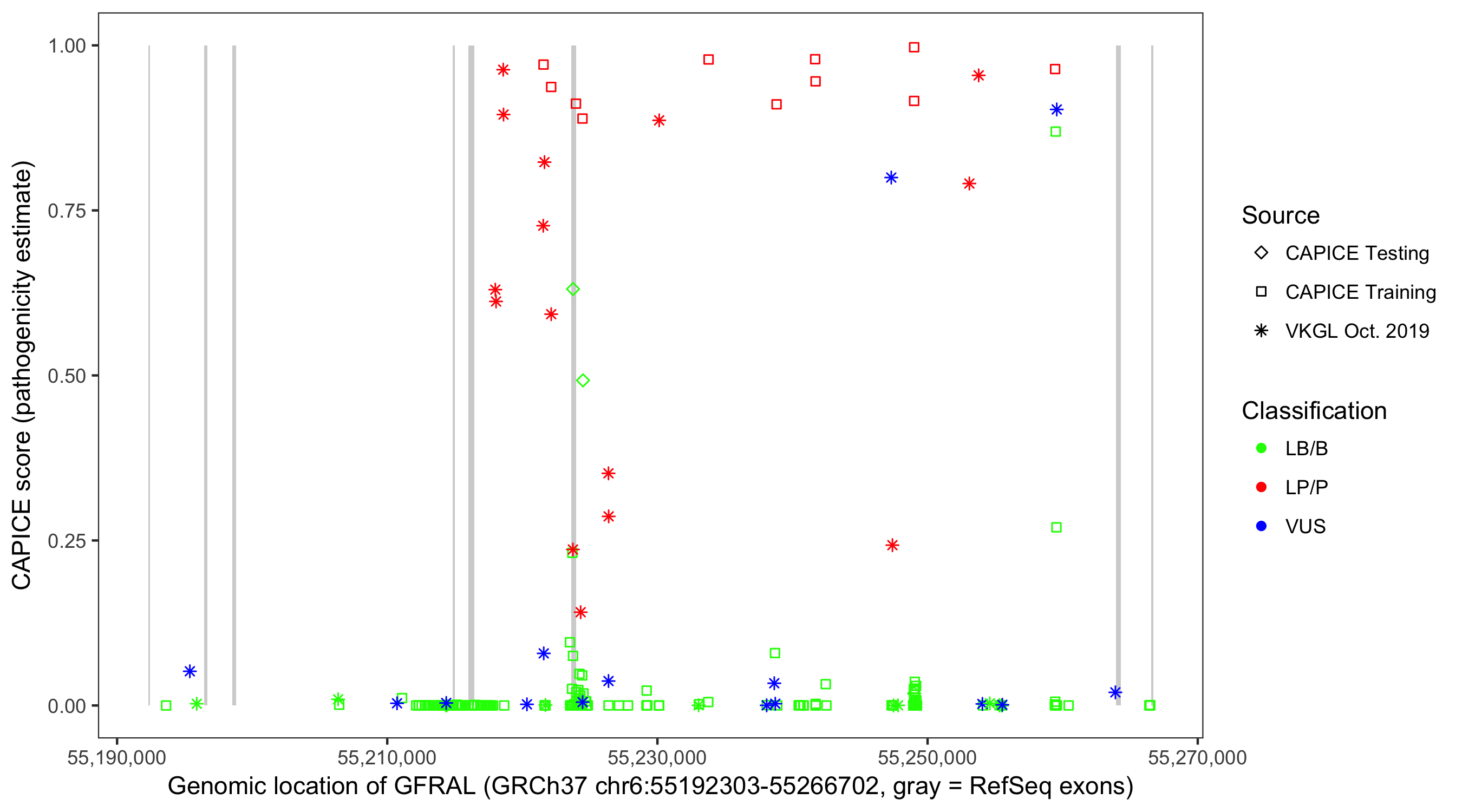 Shown are CAPICE train/test variants plus VKGL Oct 2019.