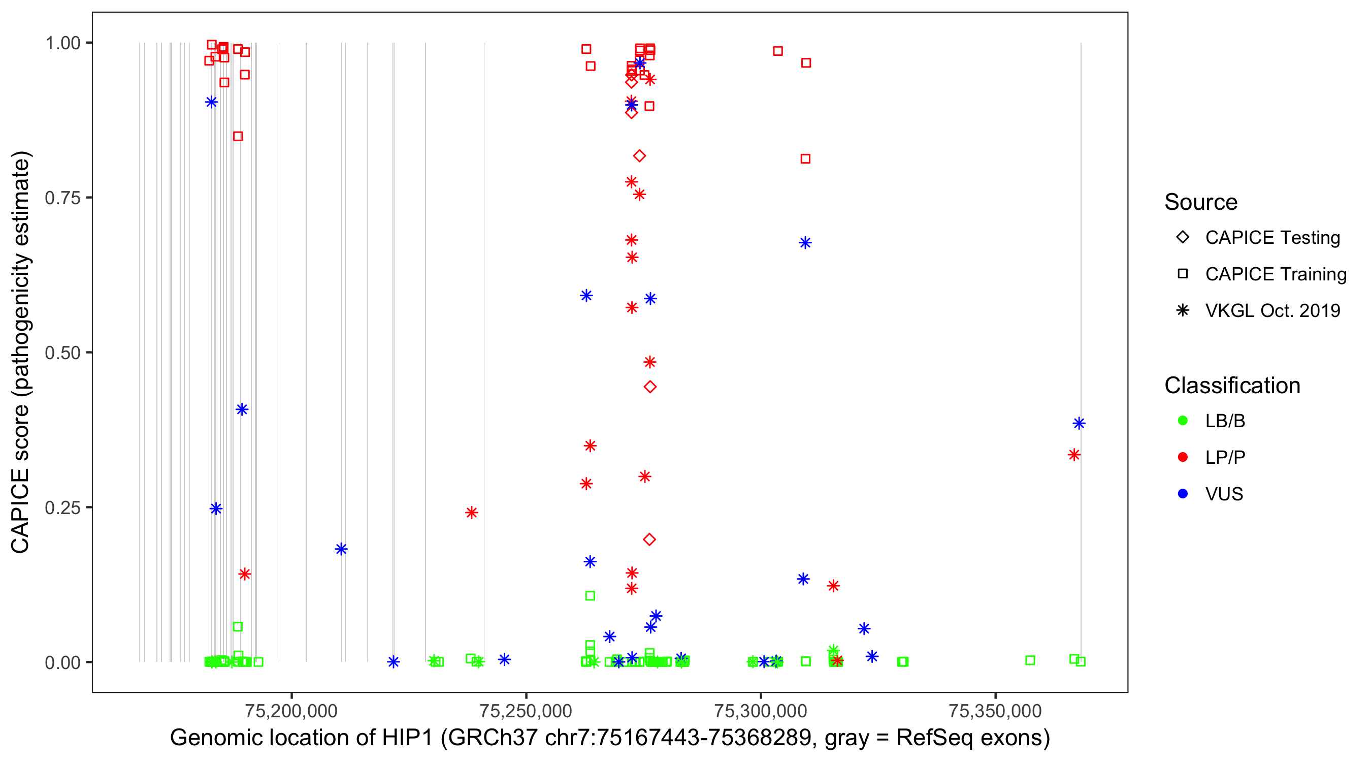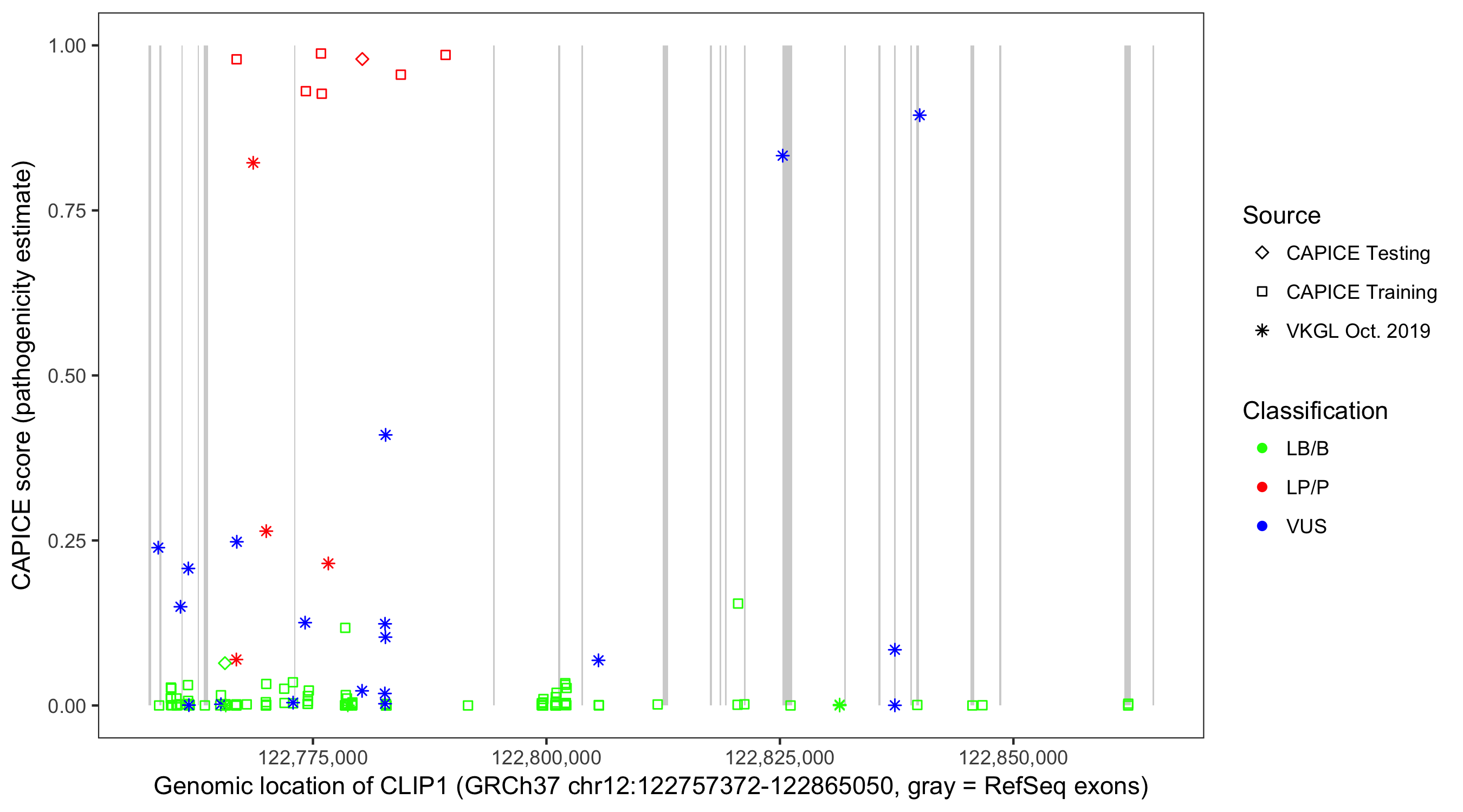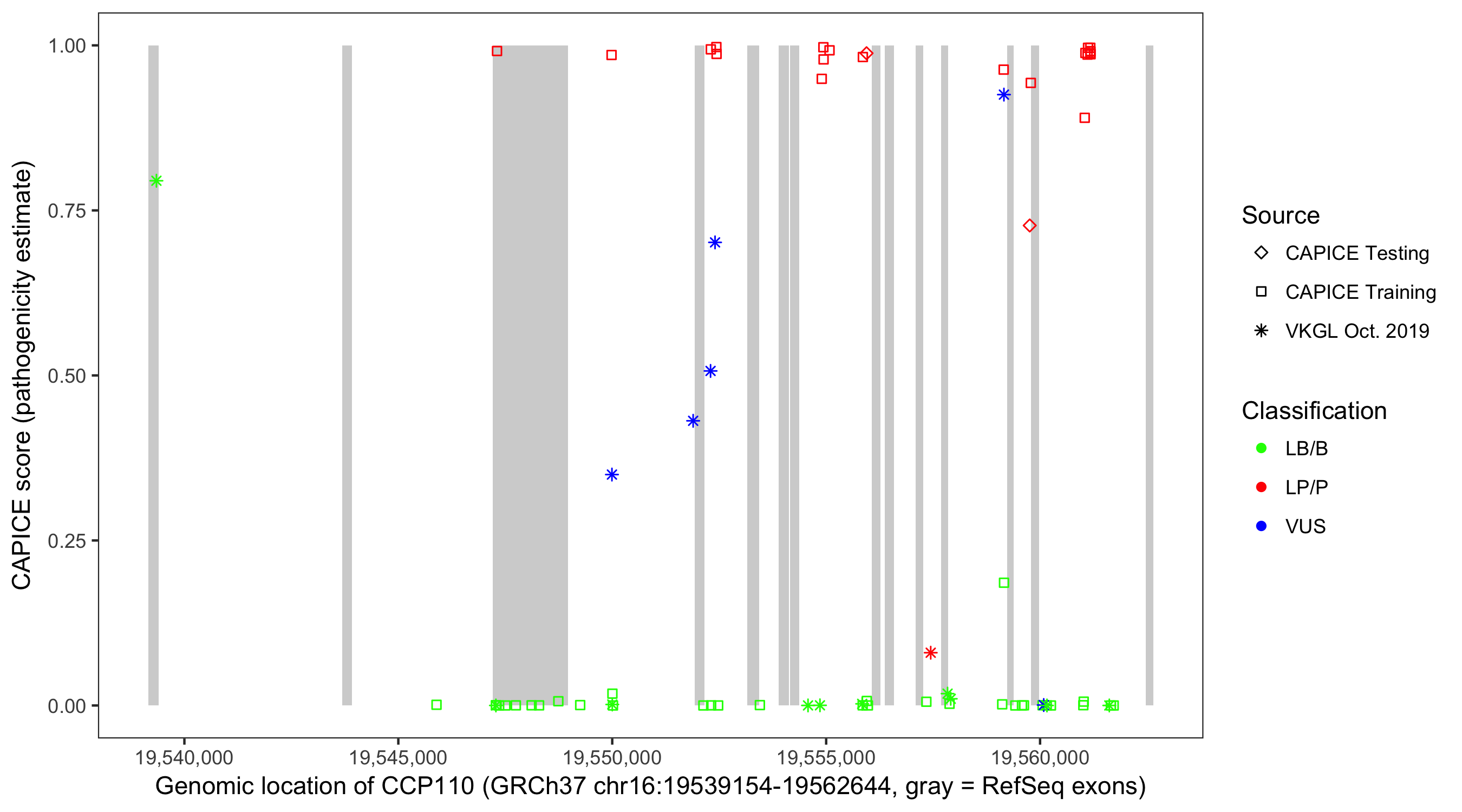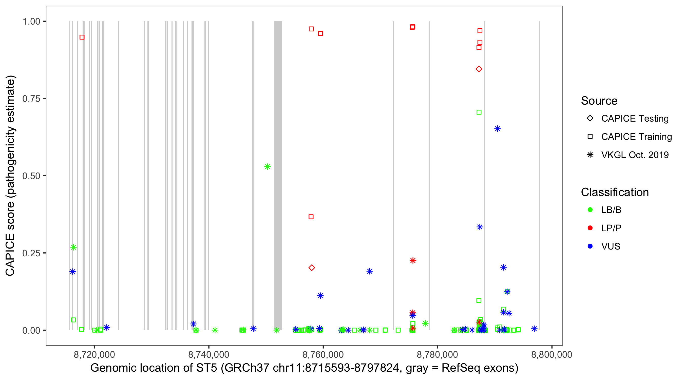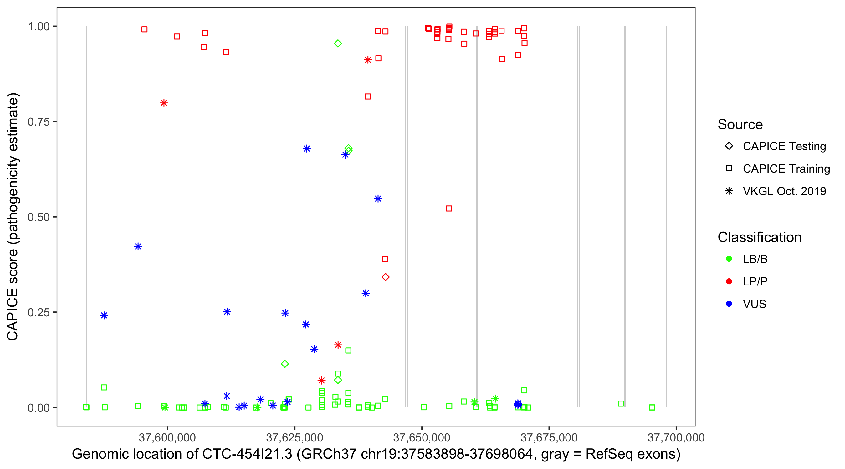 Shown are CAPICE train/test variants plus VKGL Oct 2019.