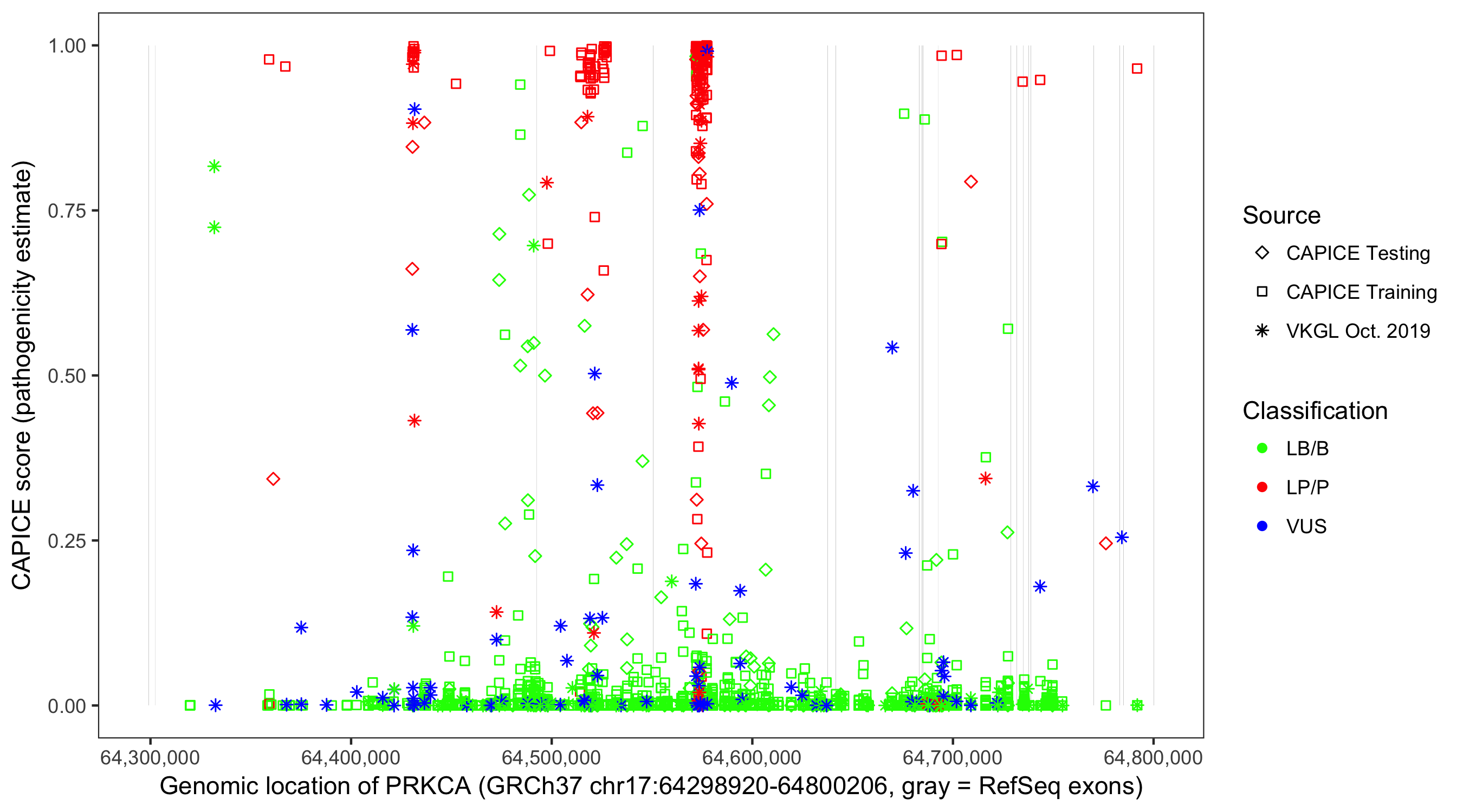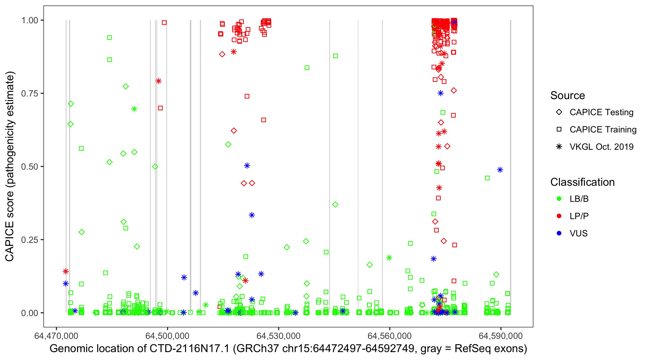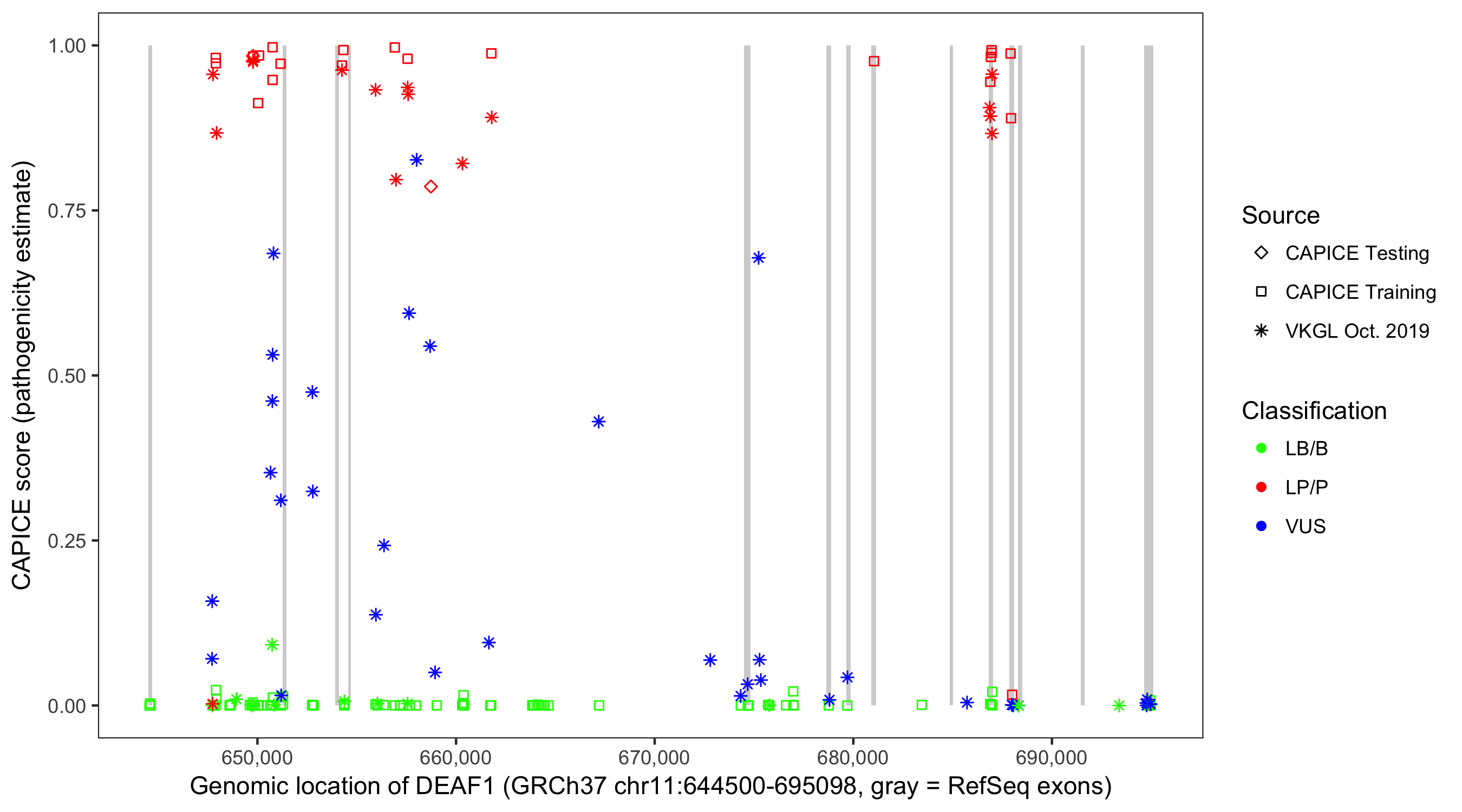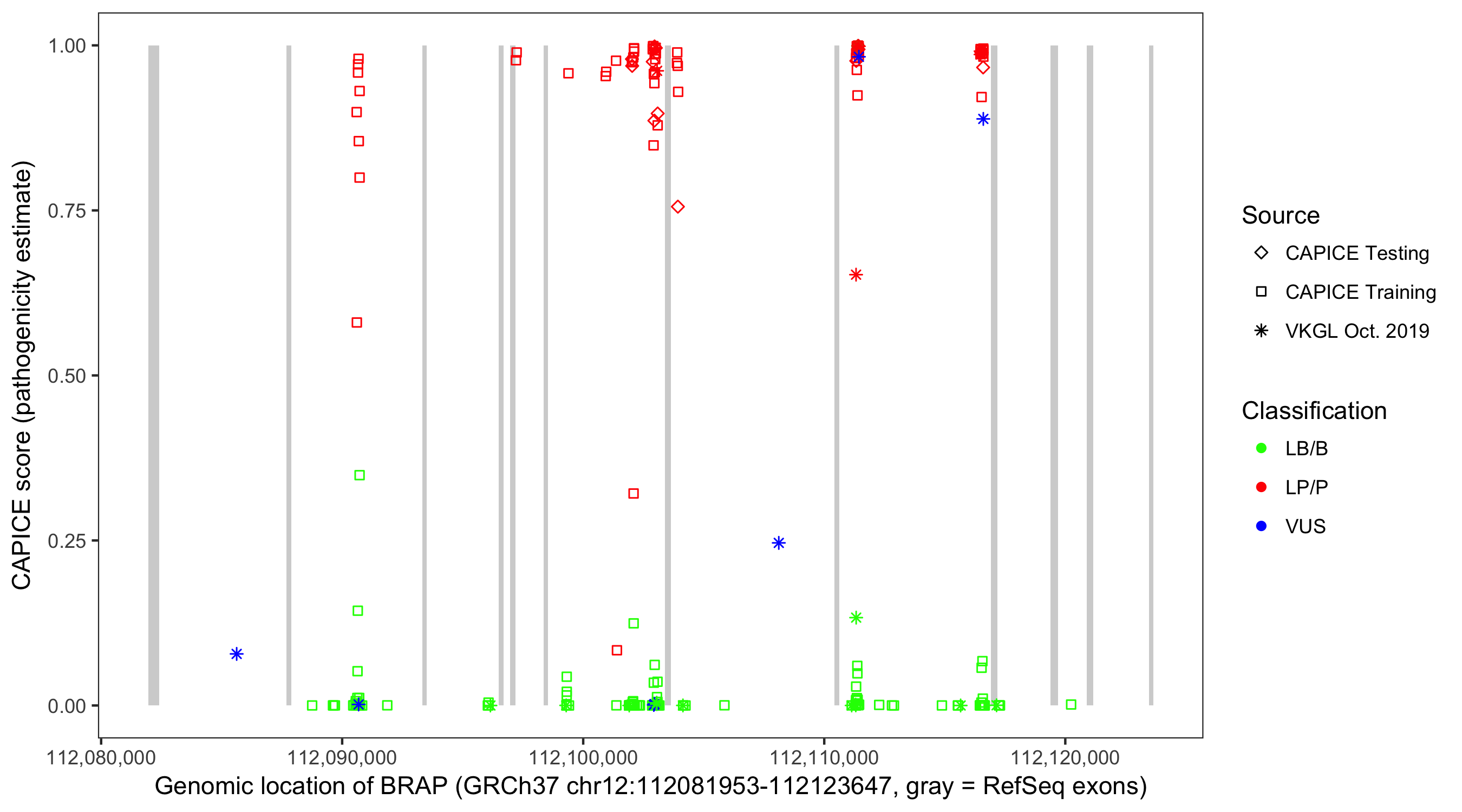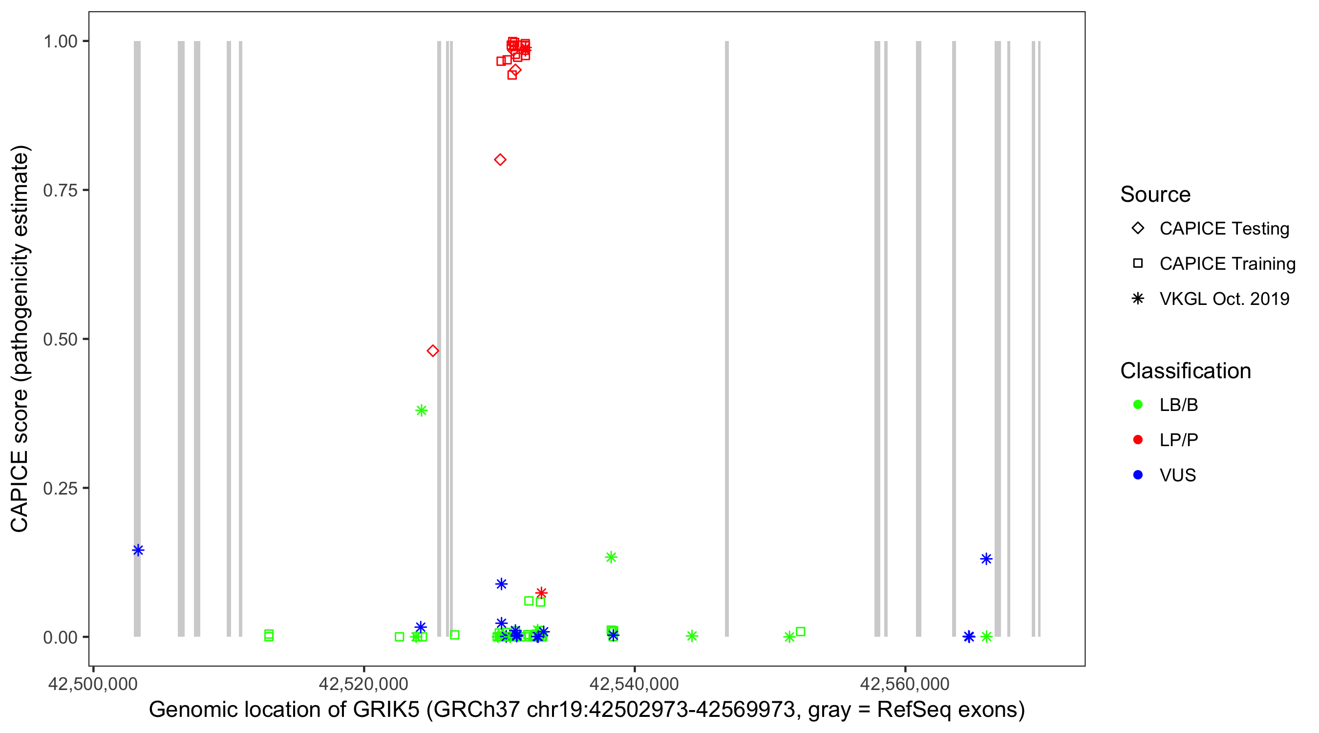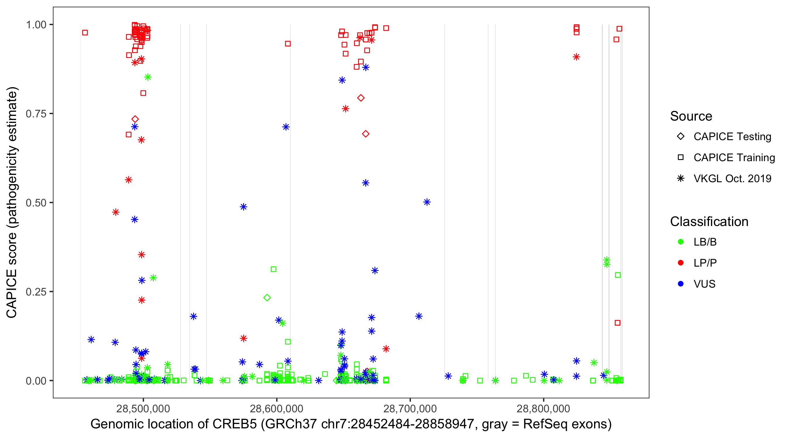 Shown are CAPICE train/test variants plus VKGL Oct 2019.