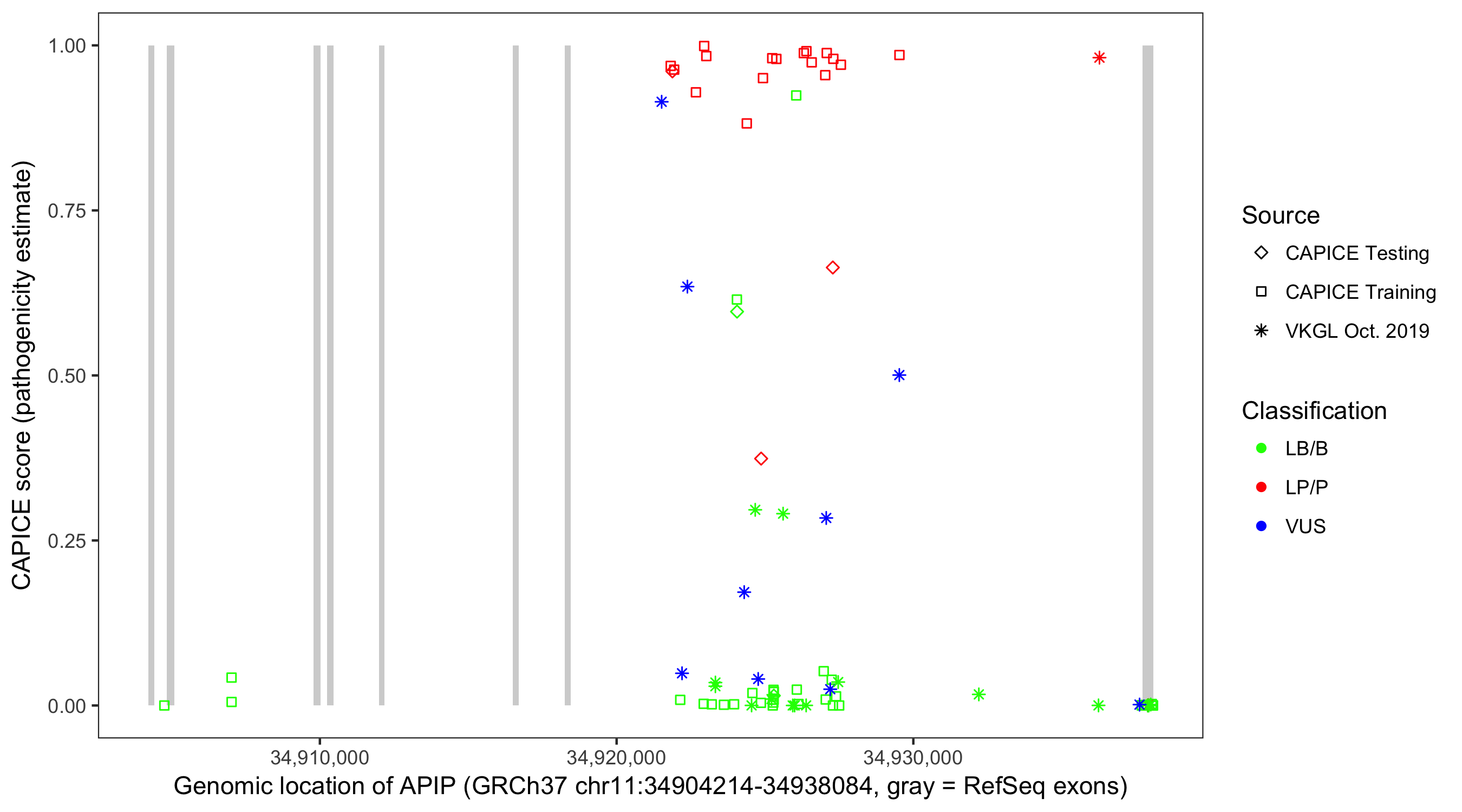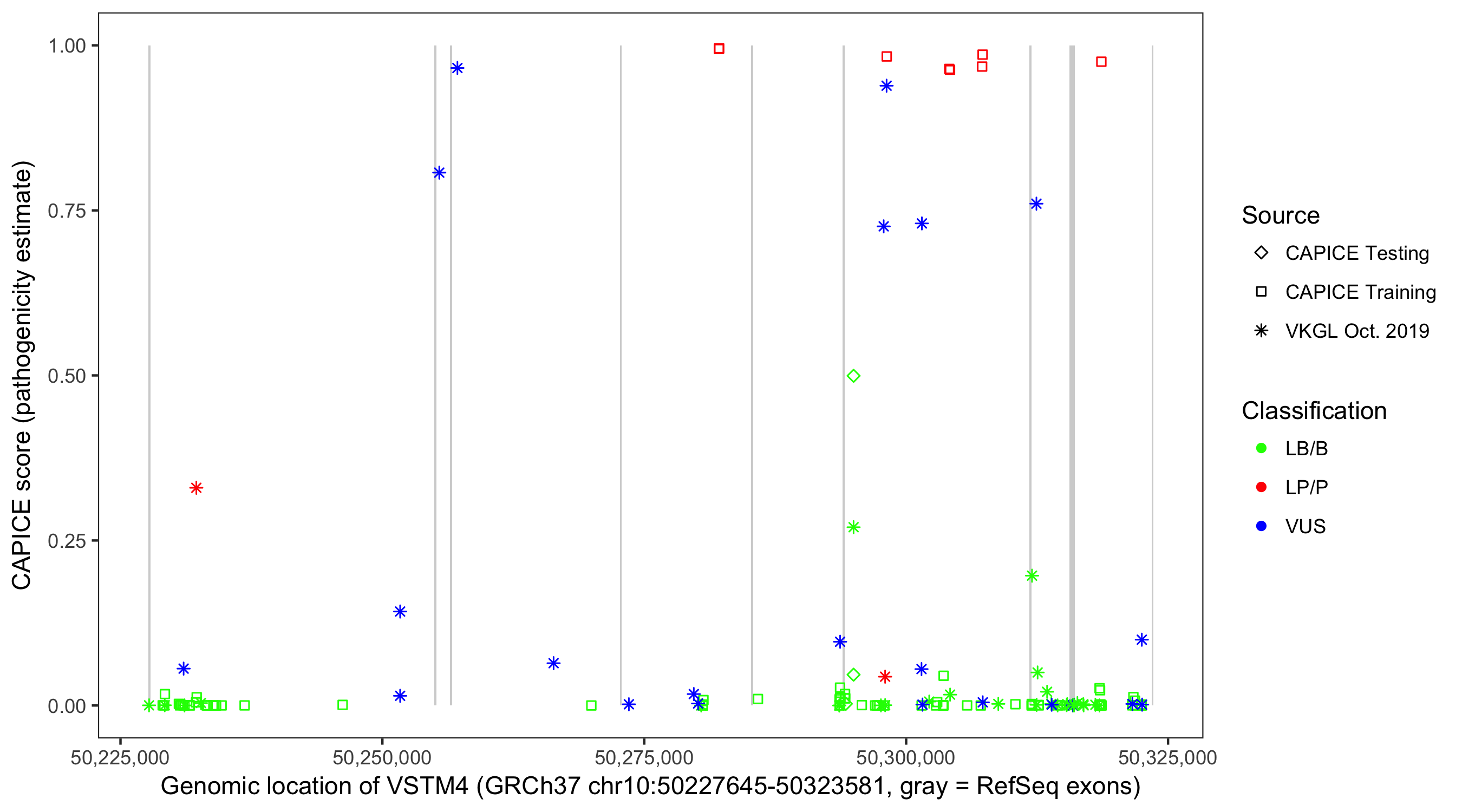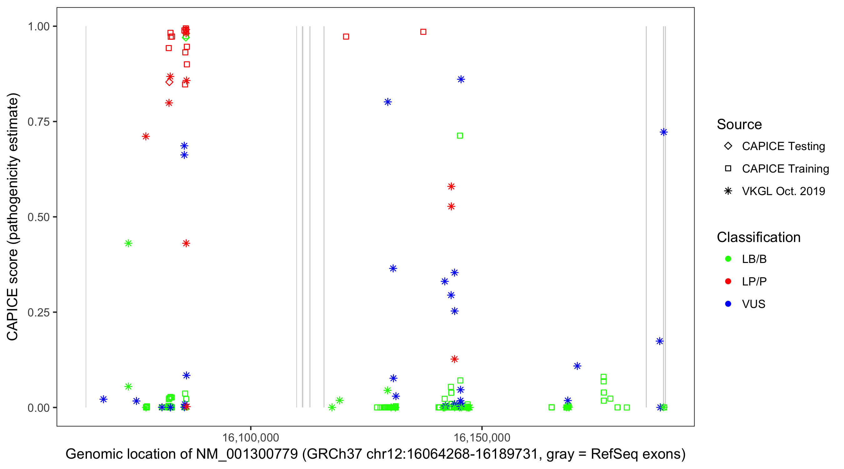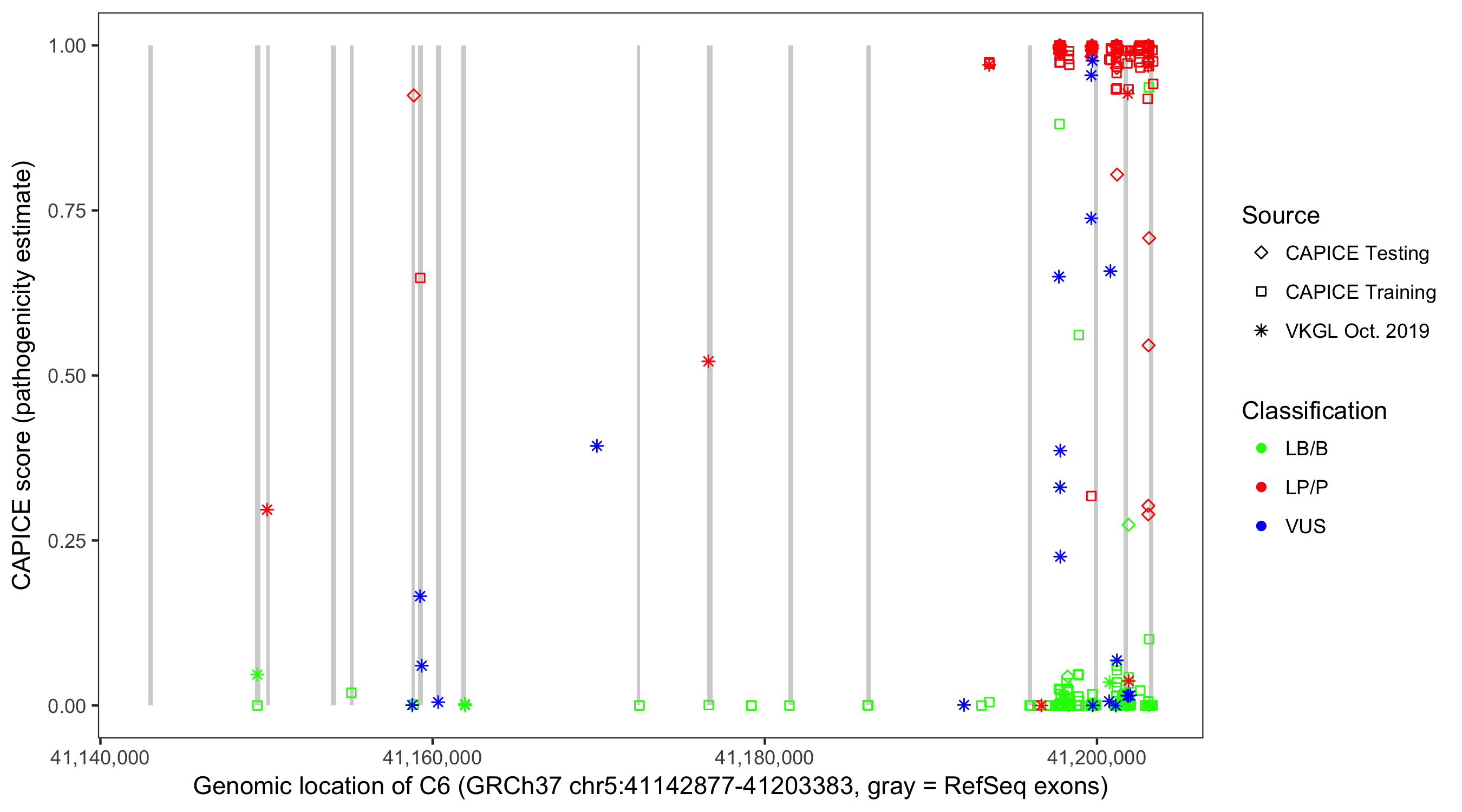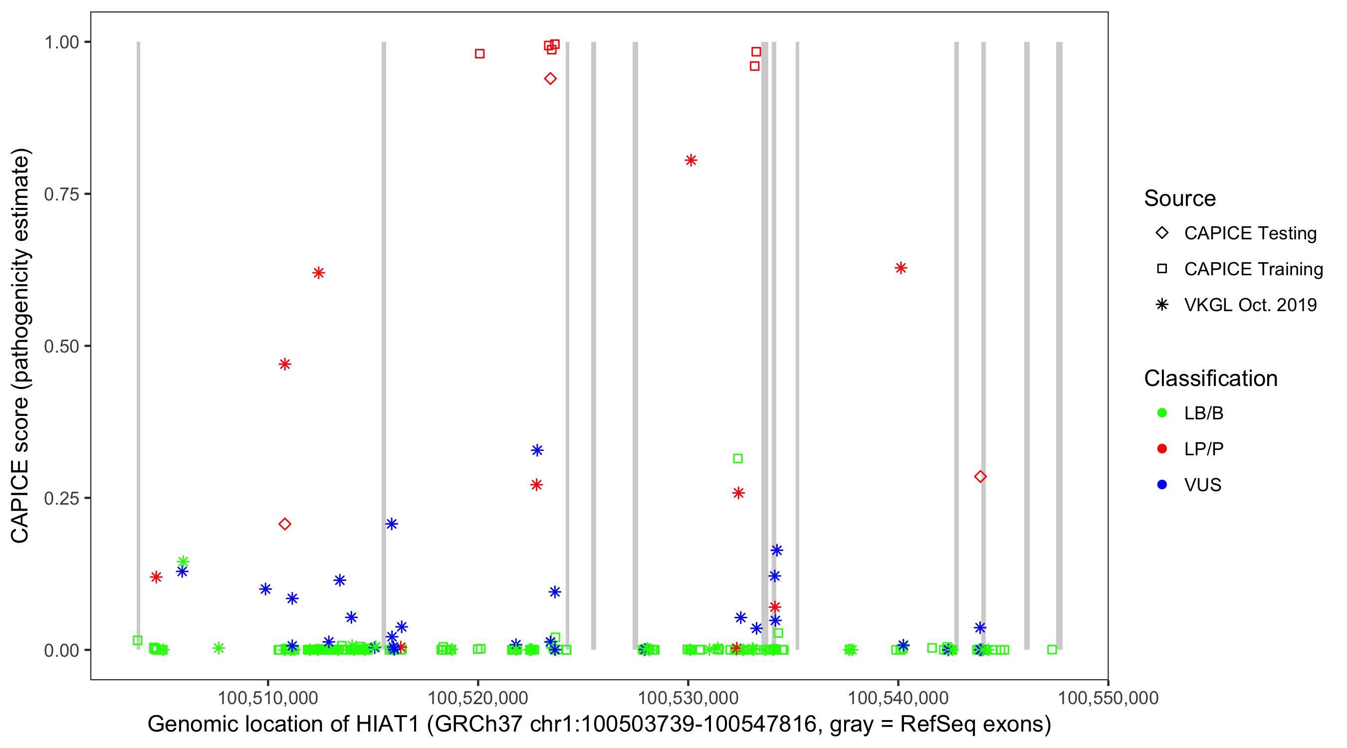 Shown are CAPICE train/test variants plus VKGL Oct 2019.
